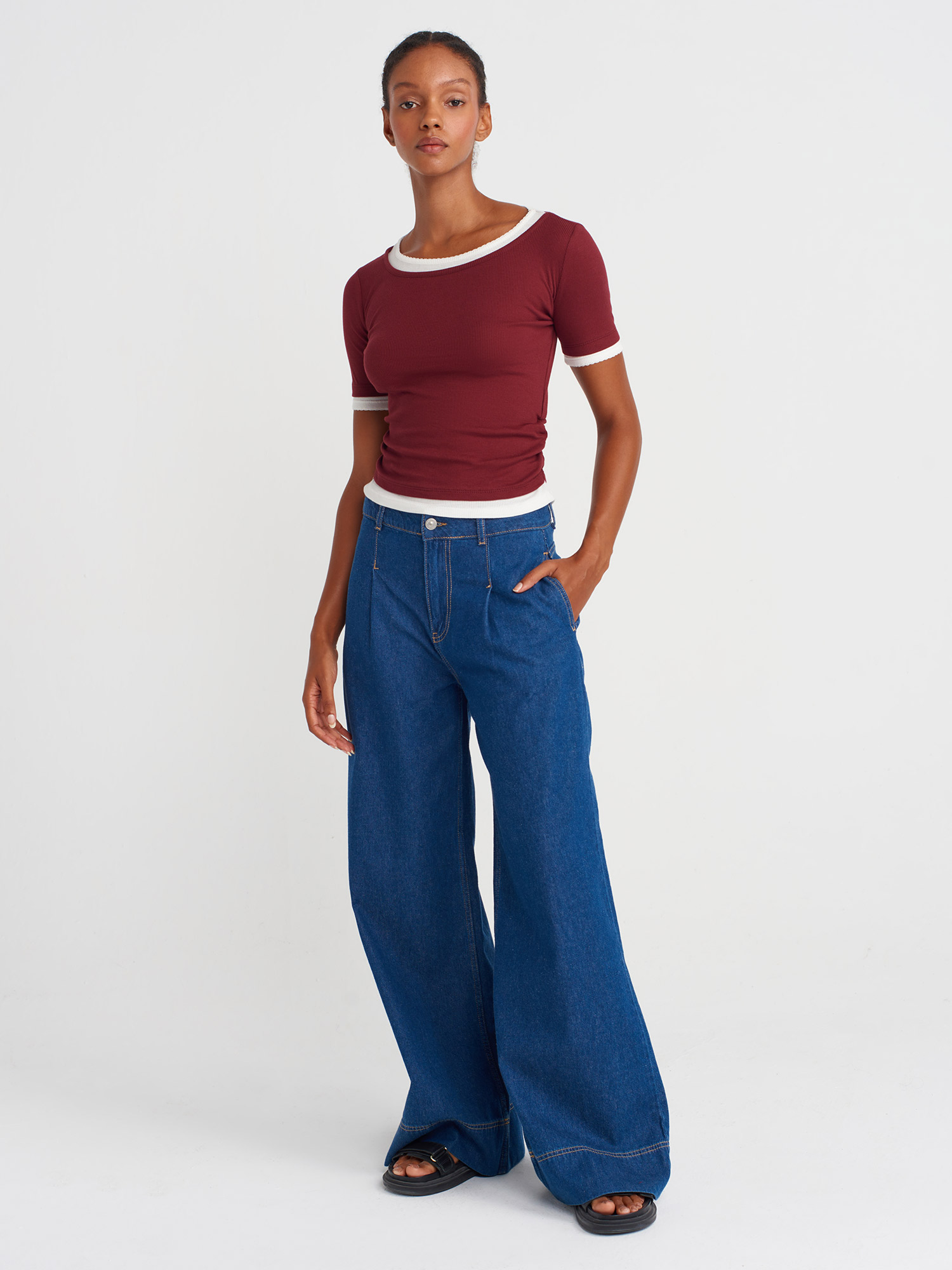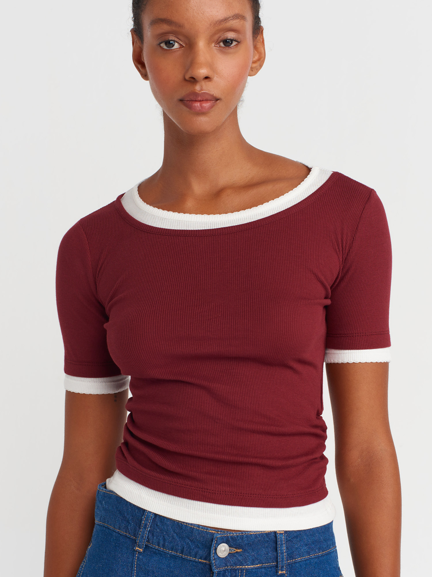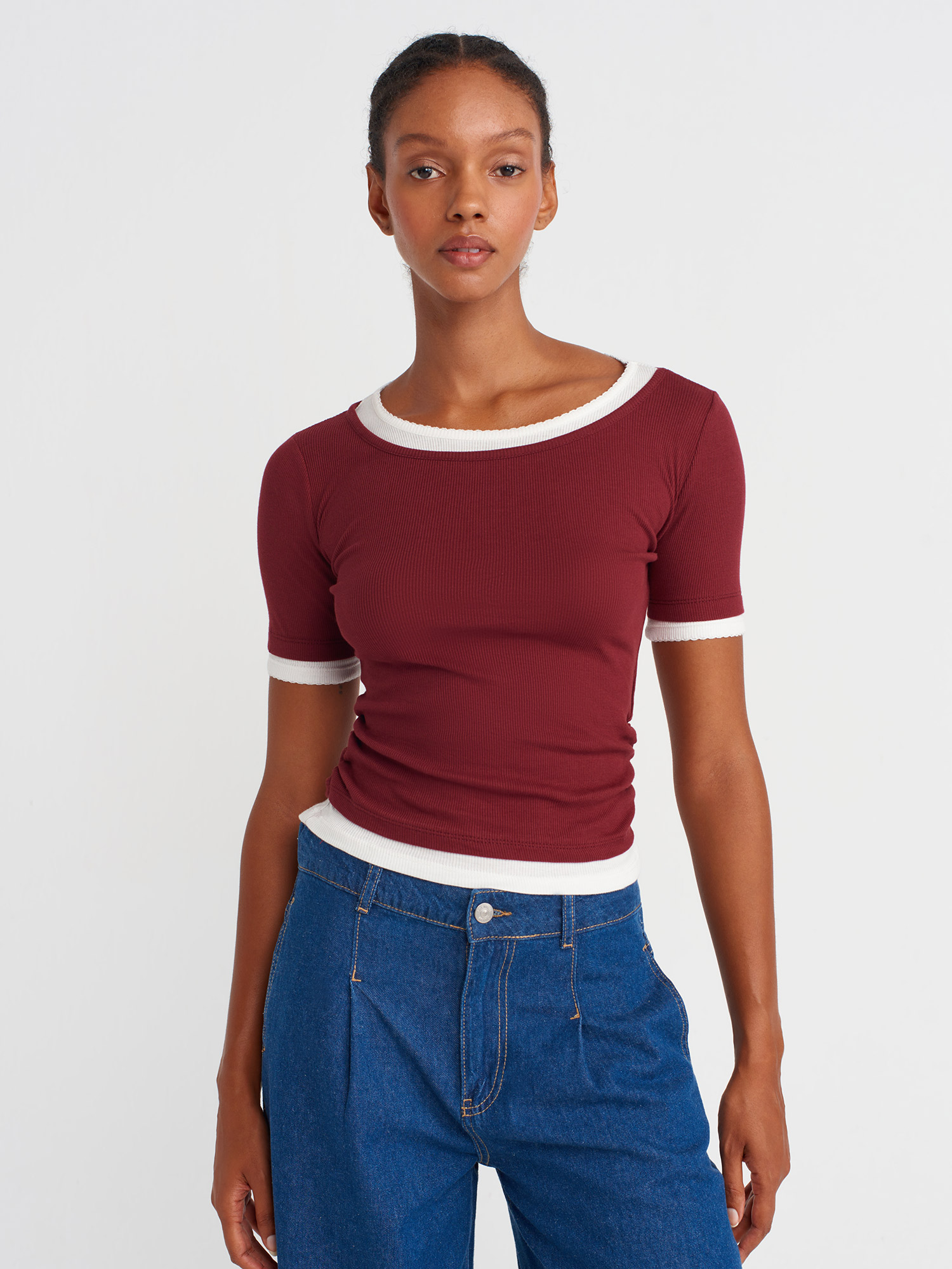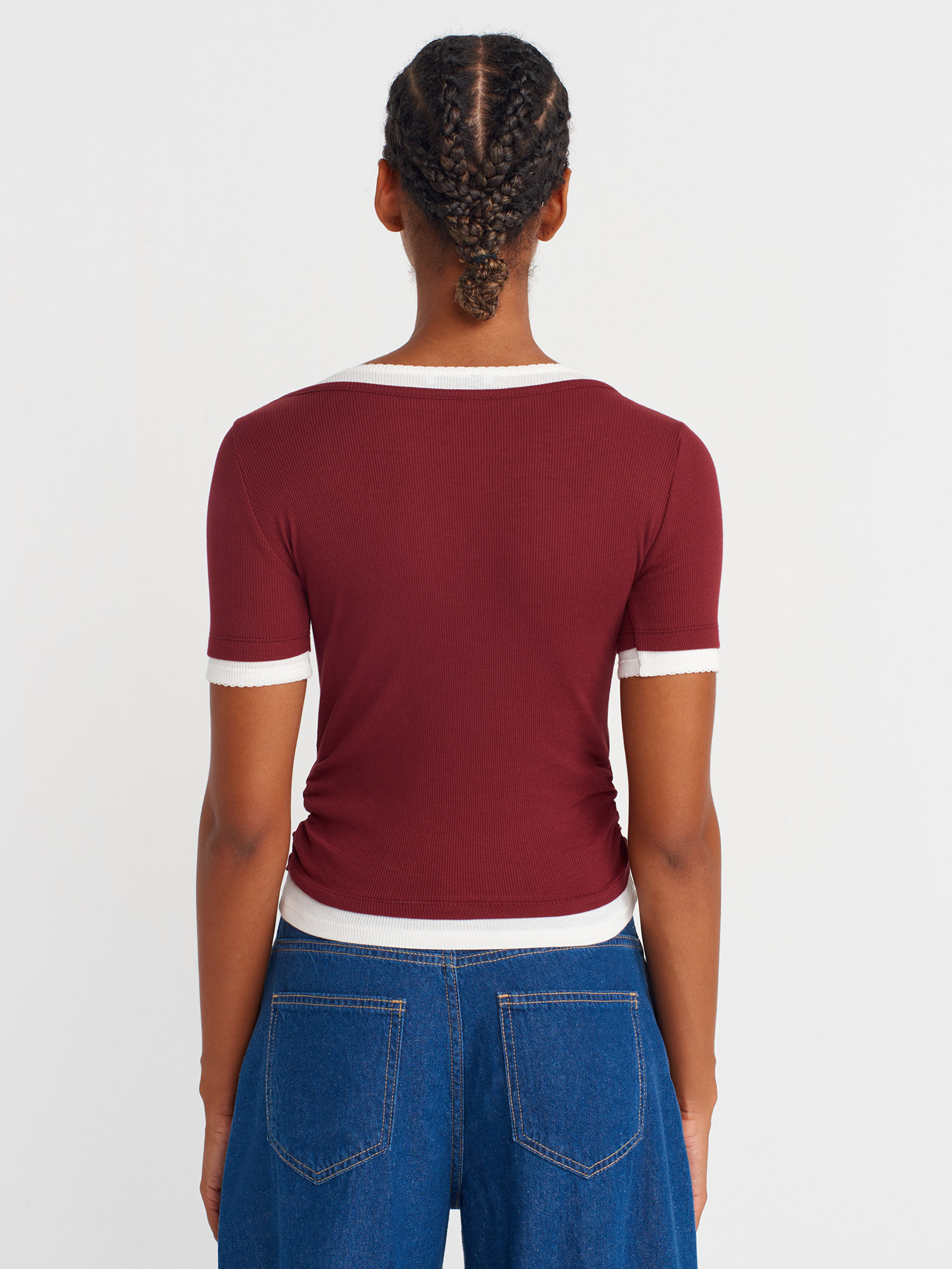 31942 %100 Pamuk Çift Katlı Büzgülü T-shirt-Açık Bordo
