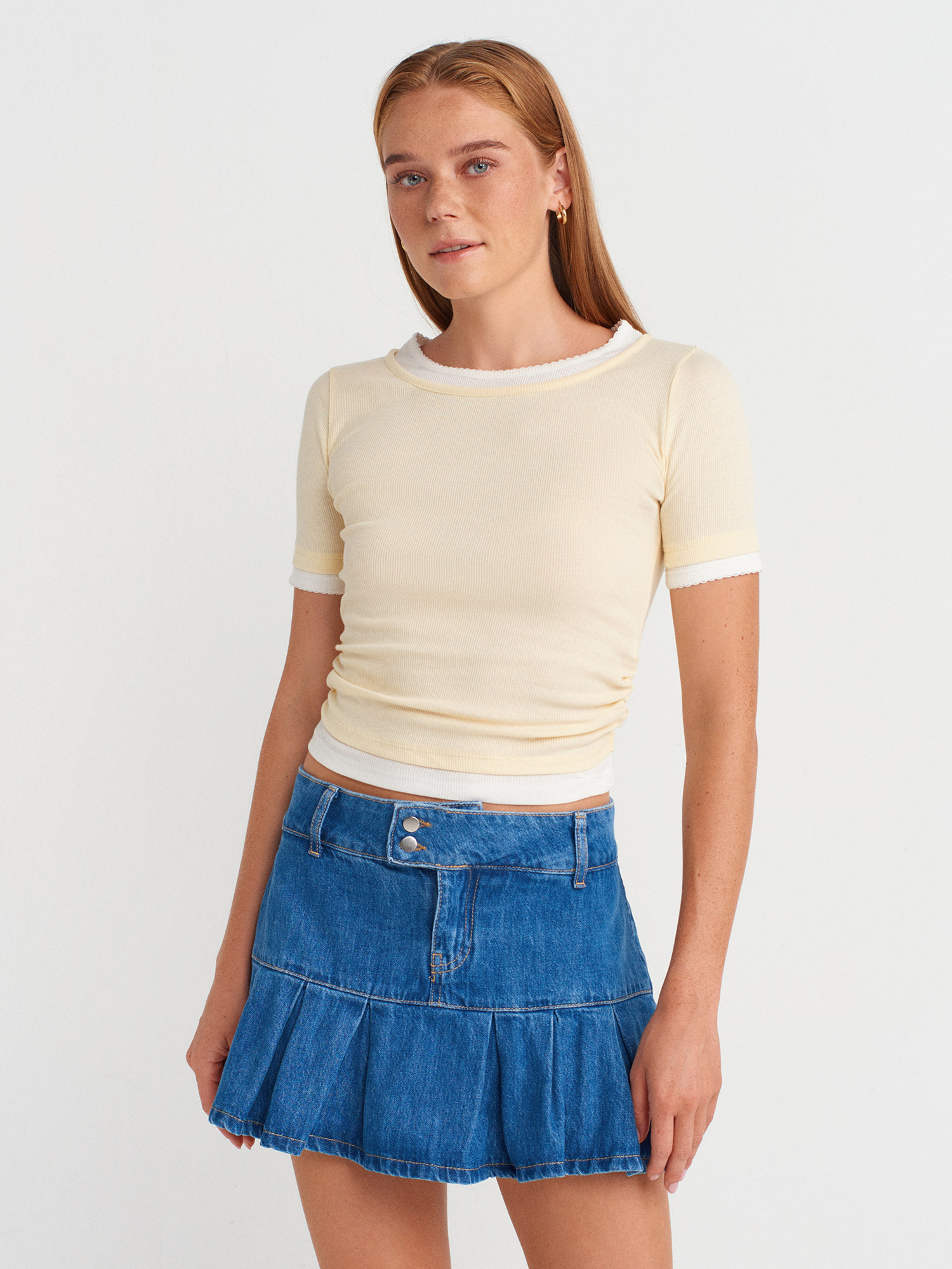 31942 %100 Pamuk Çift Katlı Büzgülü T-shirt-Açık Sarı