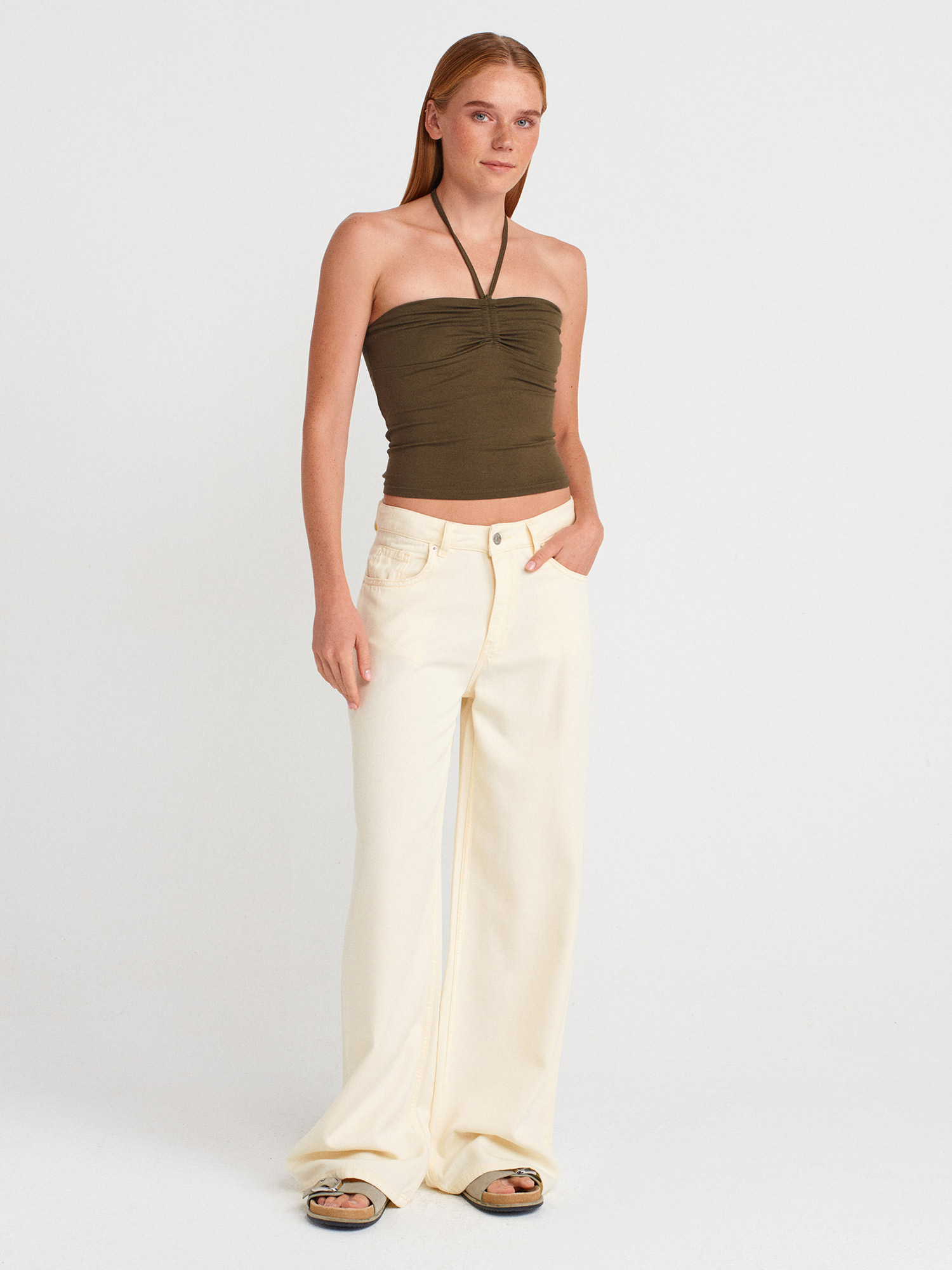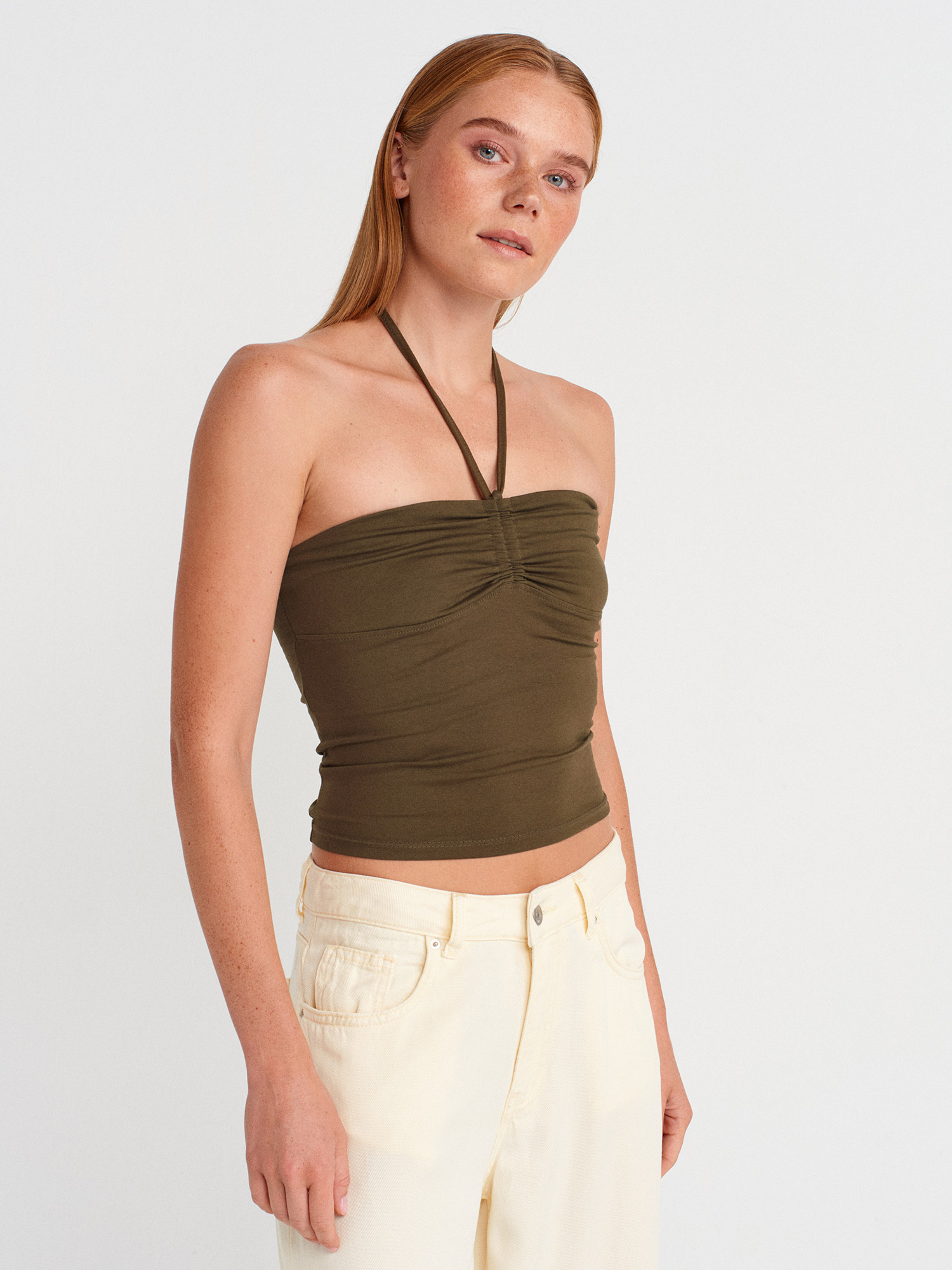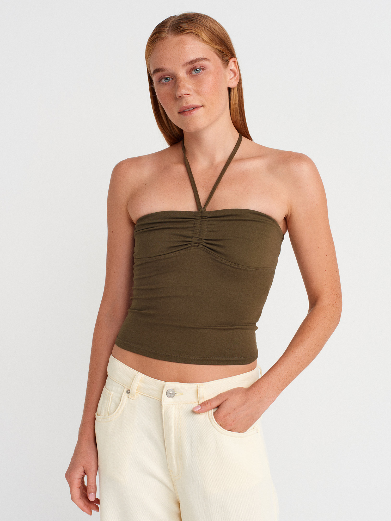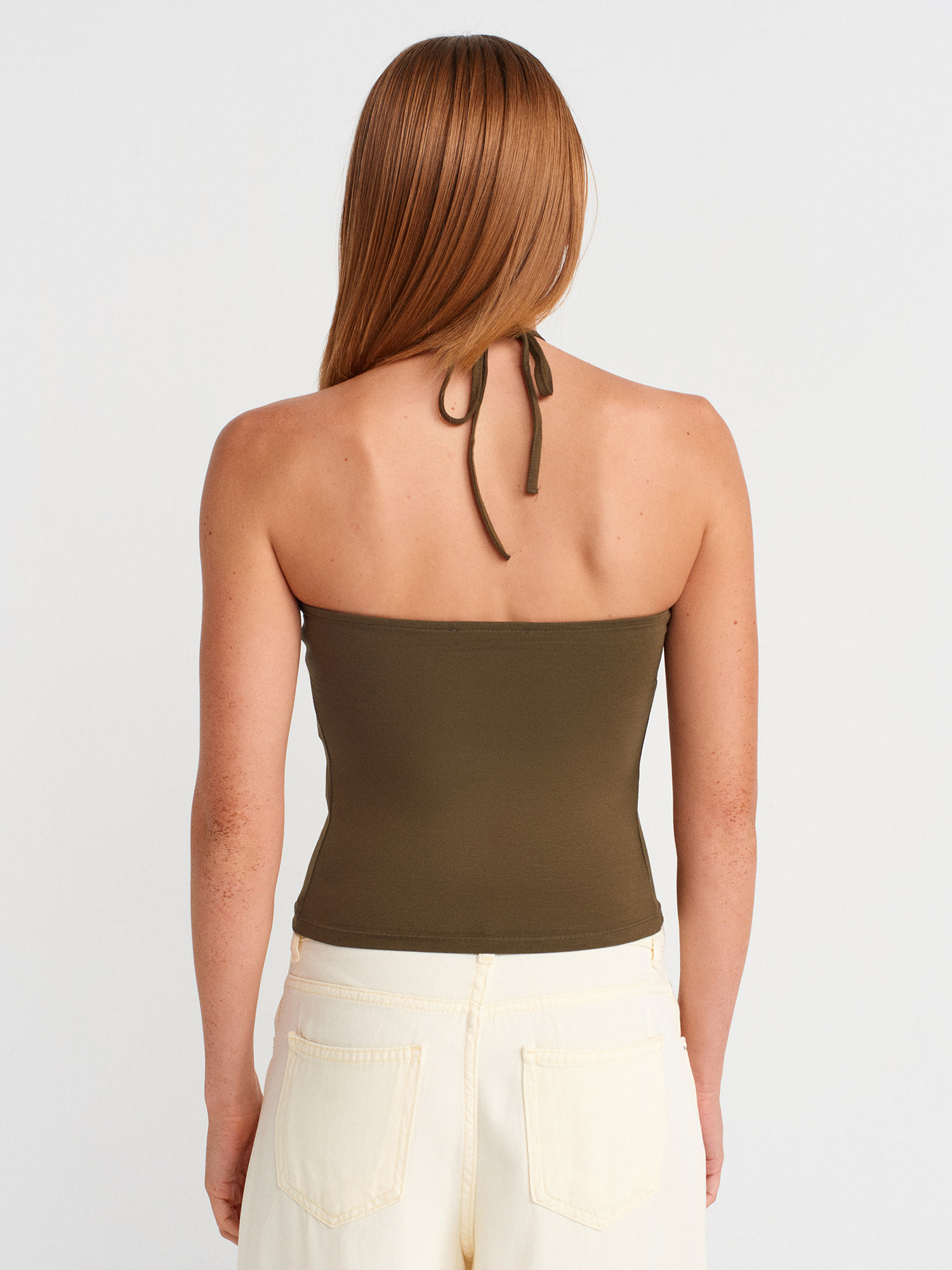 31959 Boyundan Bağlamalı Straplez Top-Haki