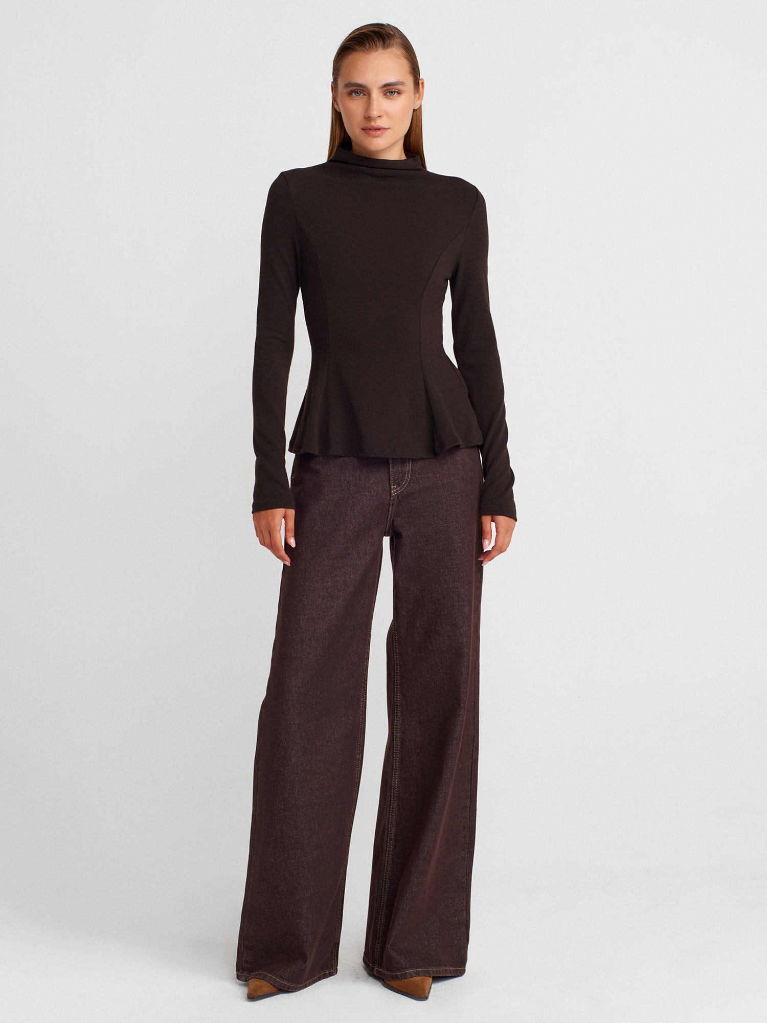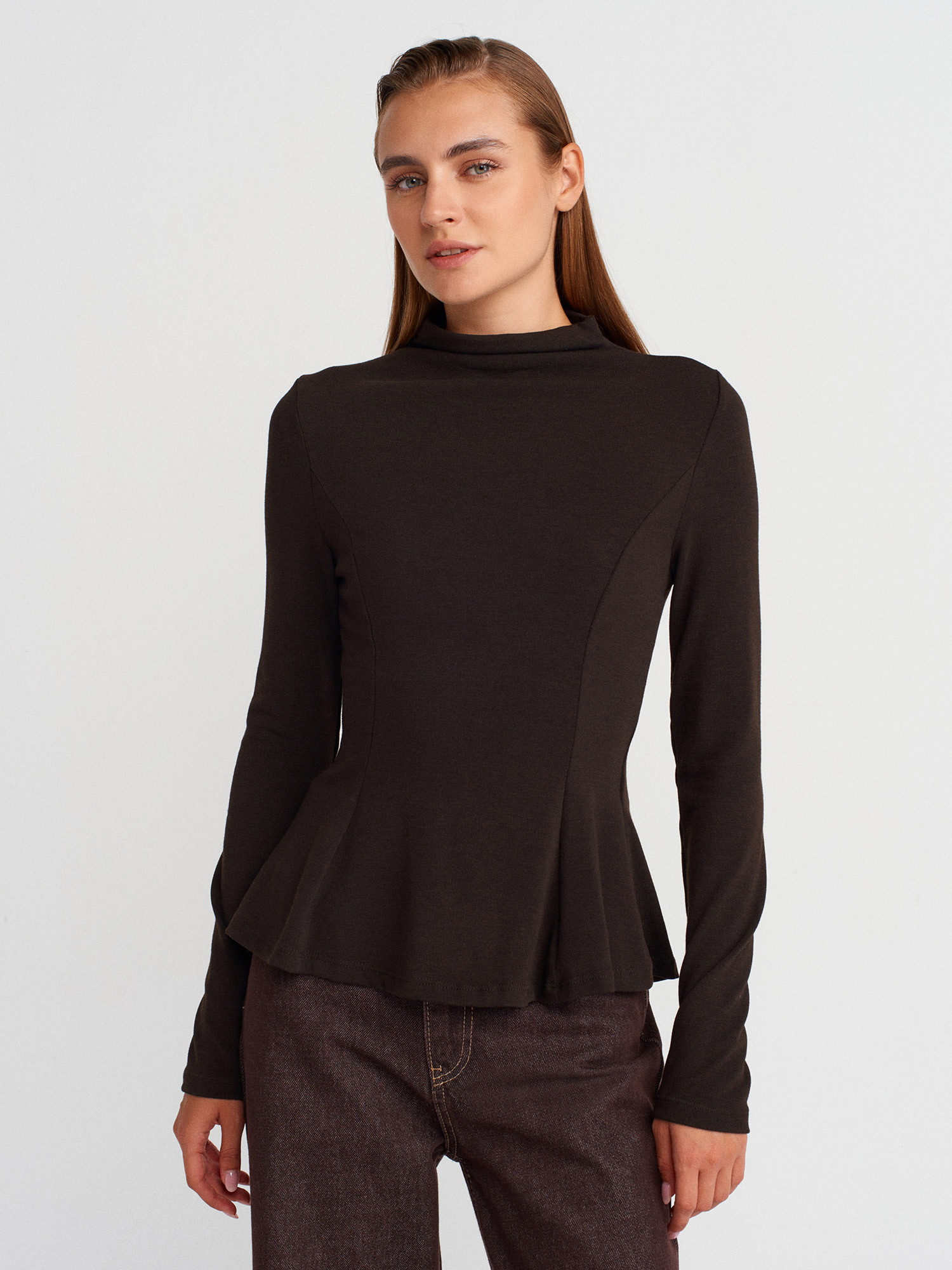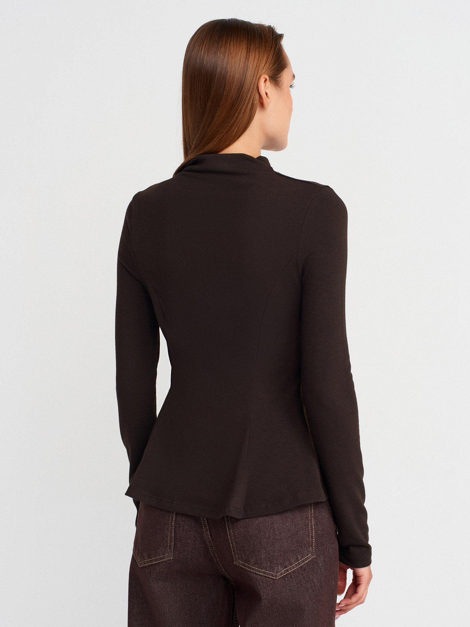32038 Uzun Kollu Peplum Top-Koyu Kahve