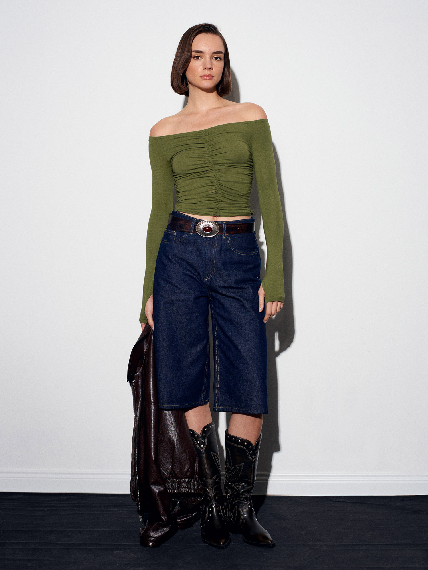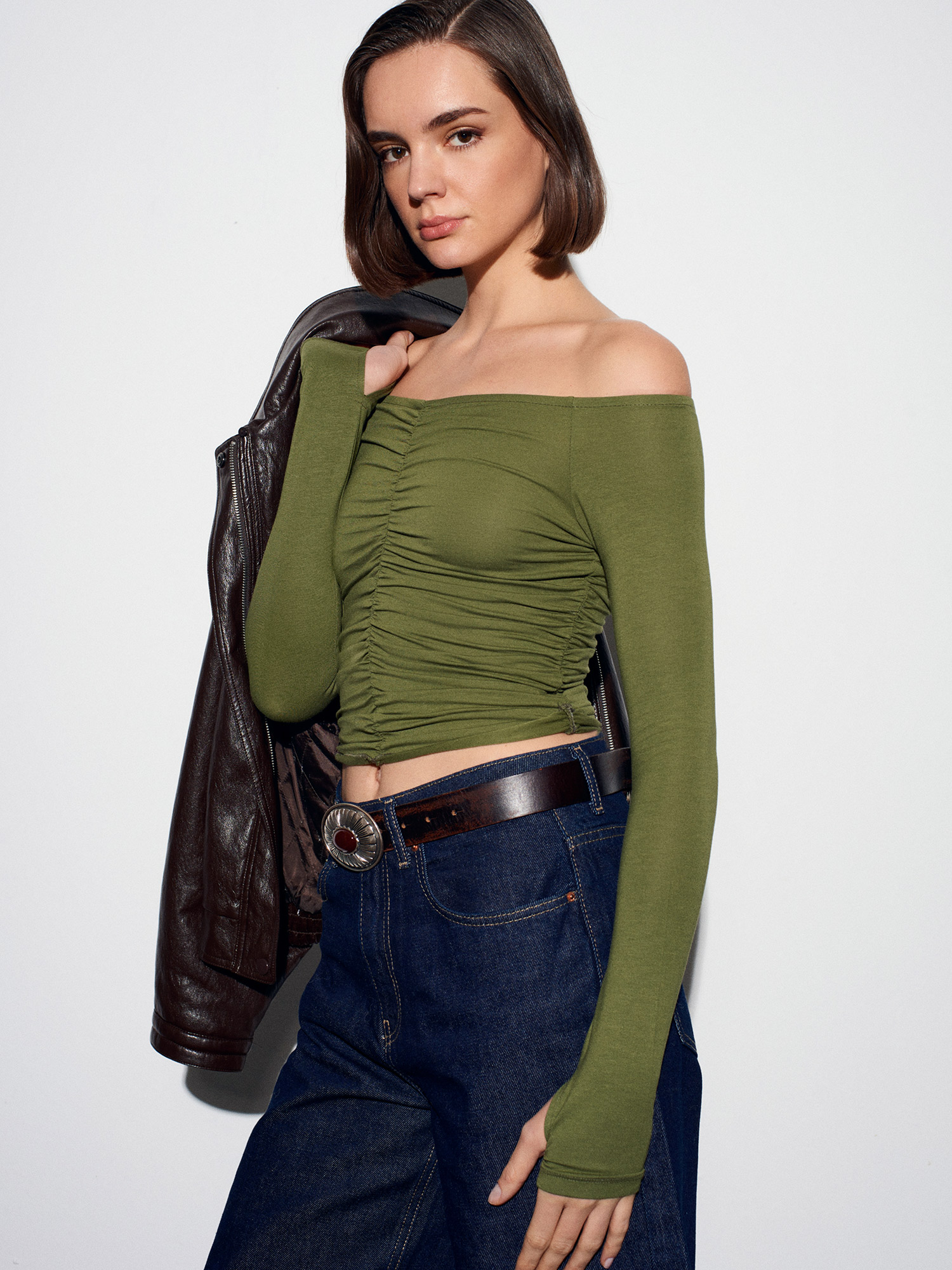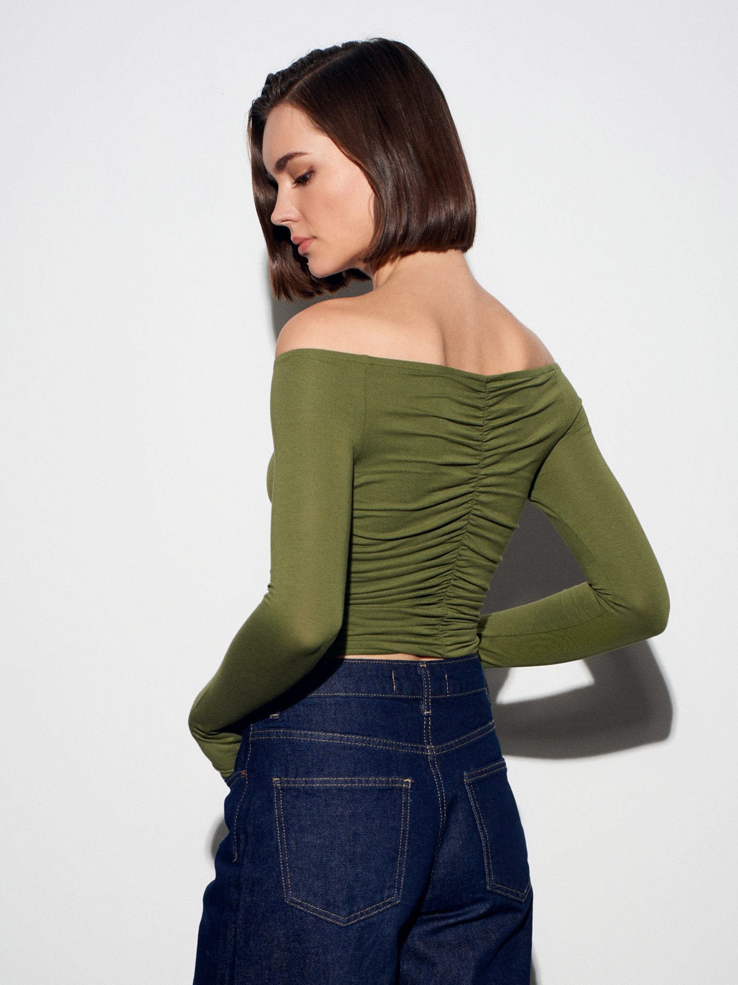 32089 Omuzları Açık Büzgülü Top-Açık Haki