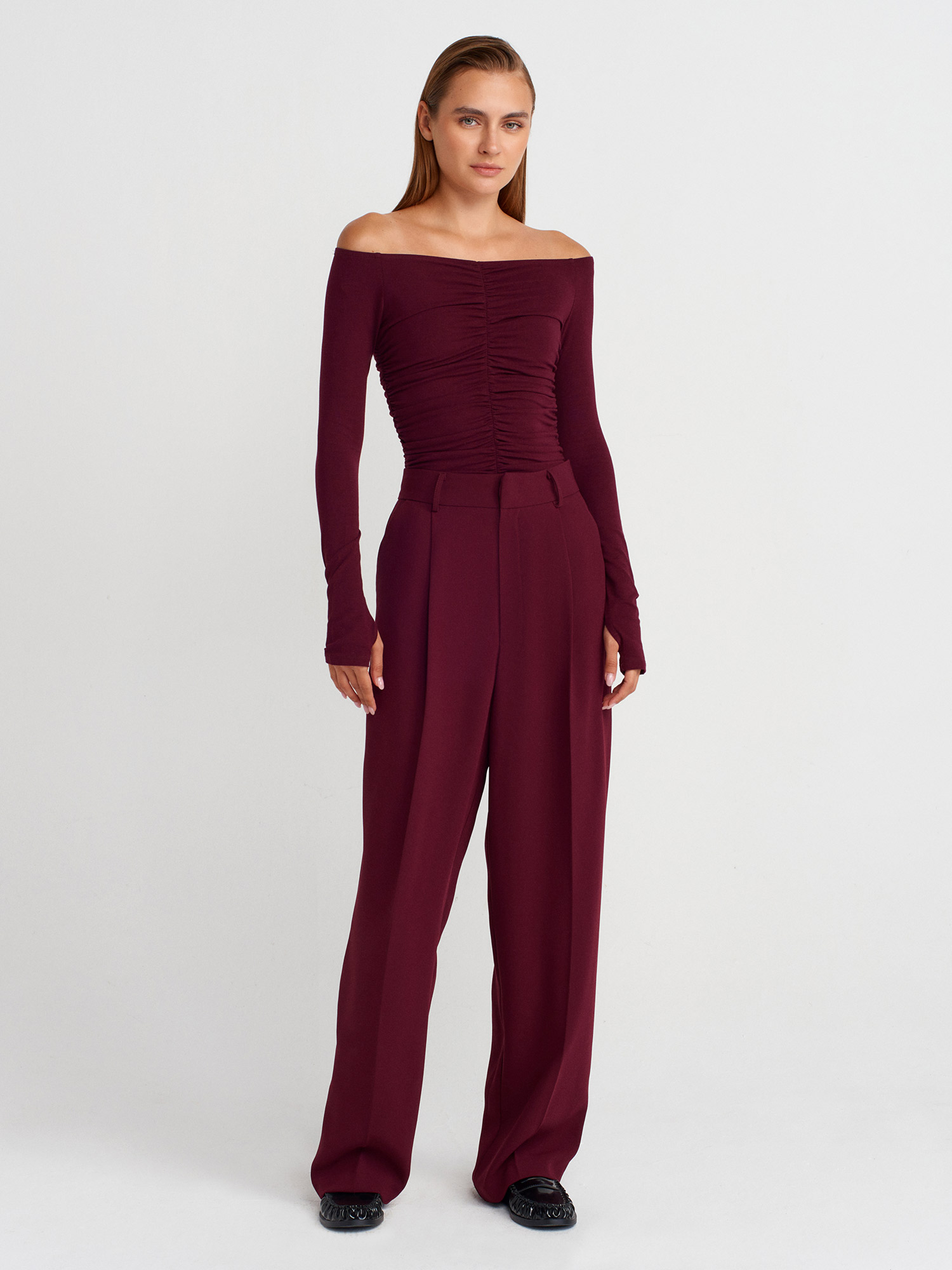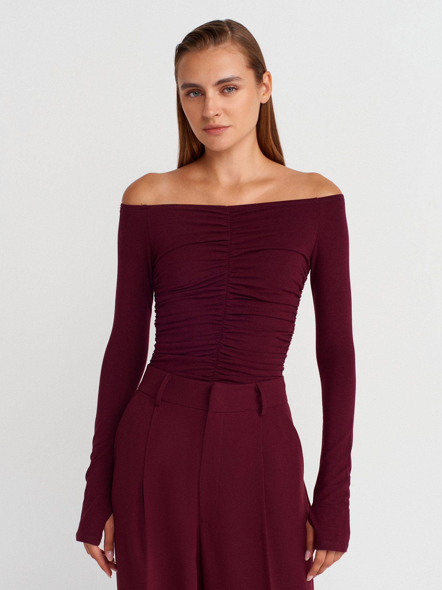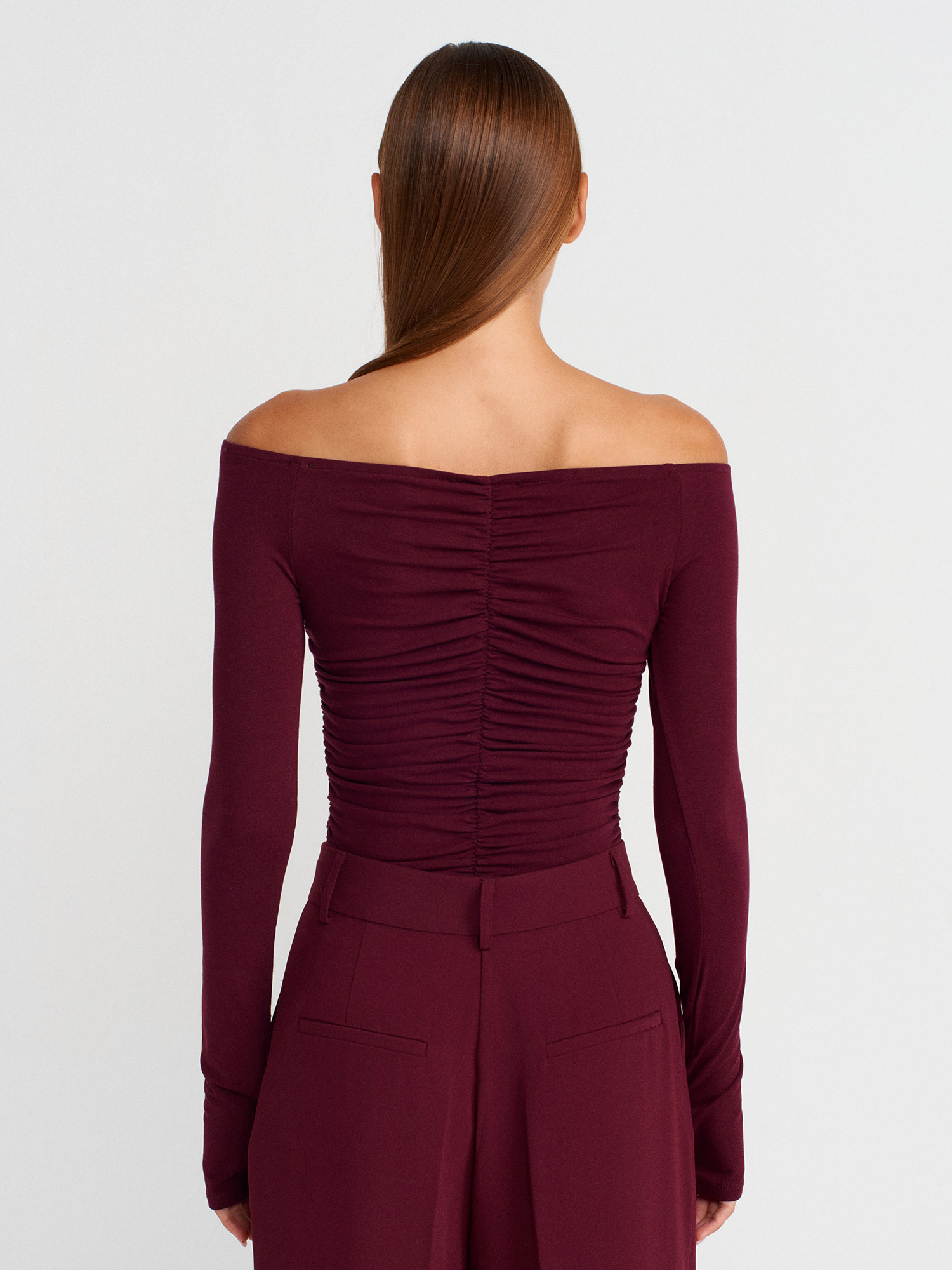 32089 Omuzları Açık Büzgülü Top-Bordo