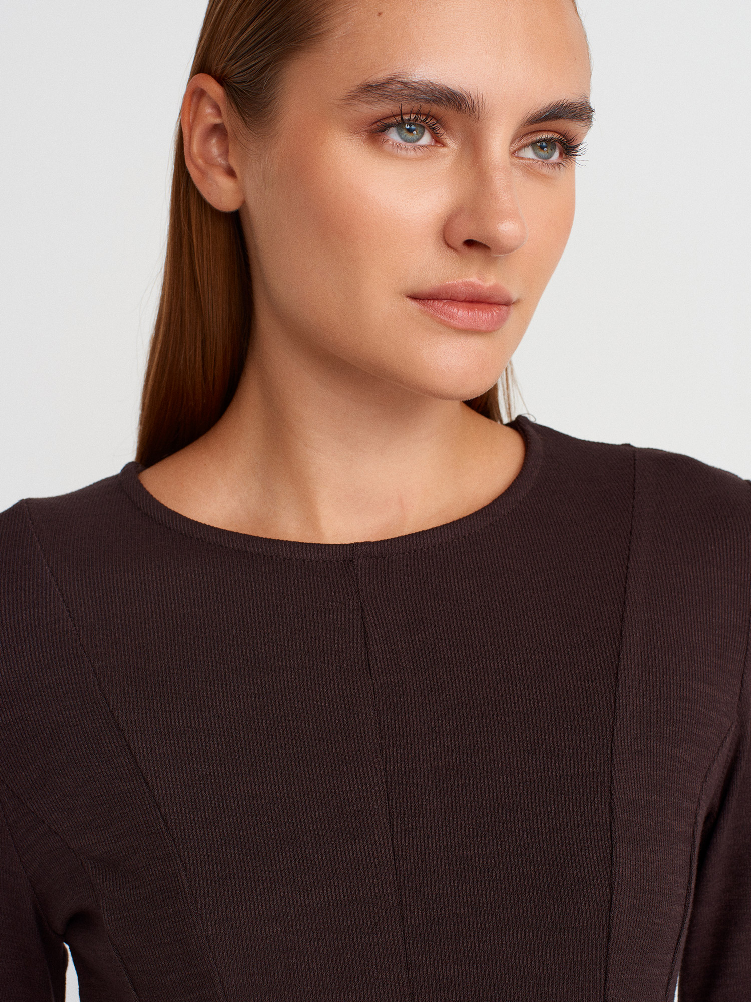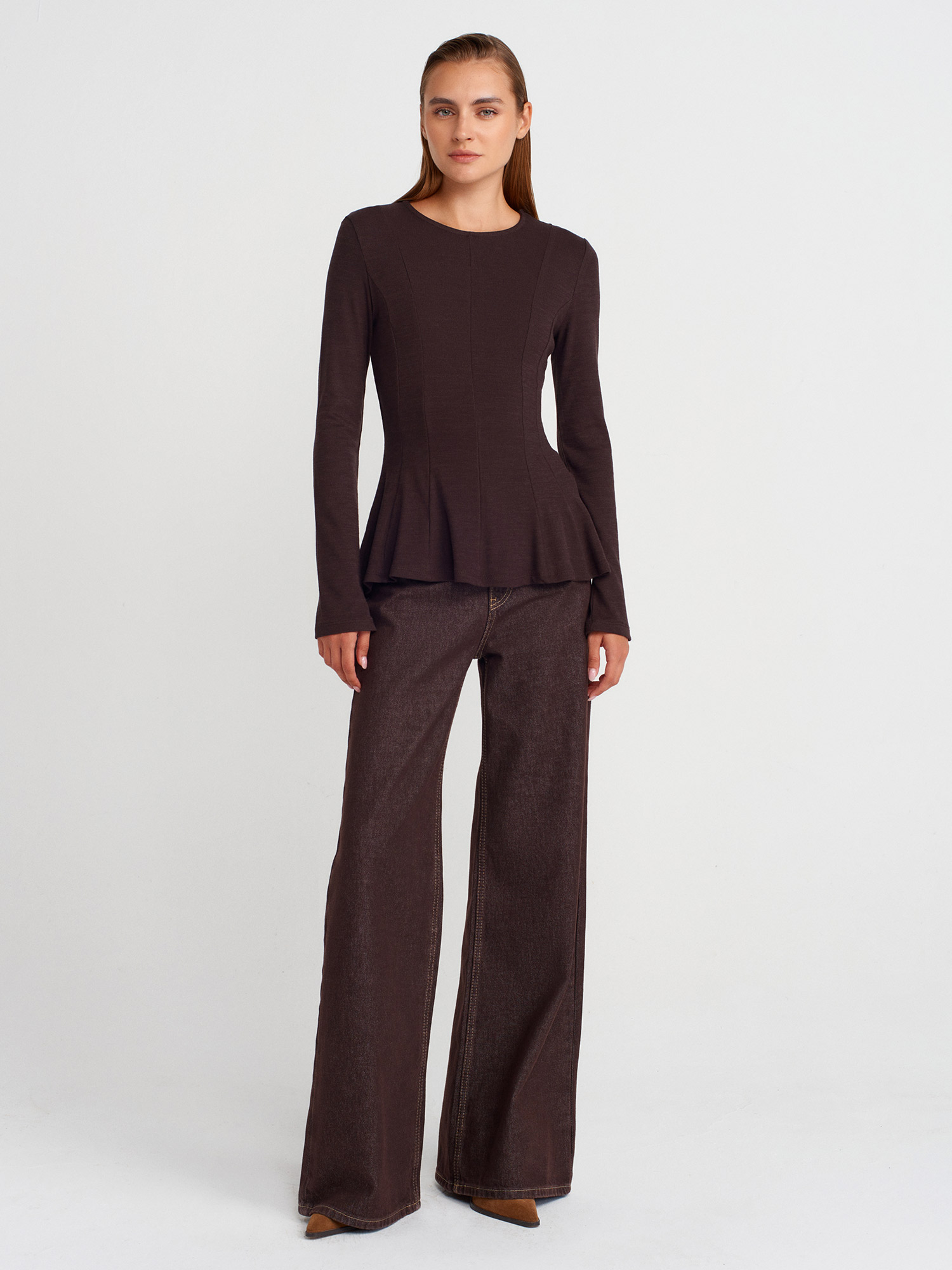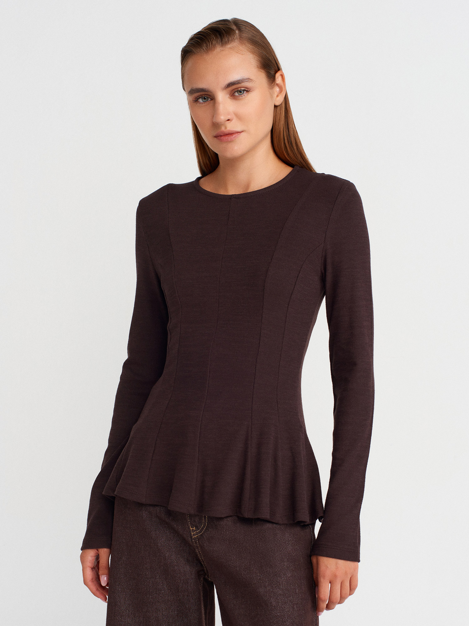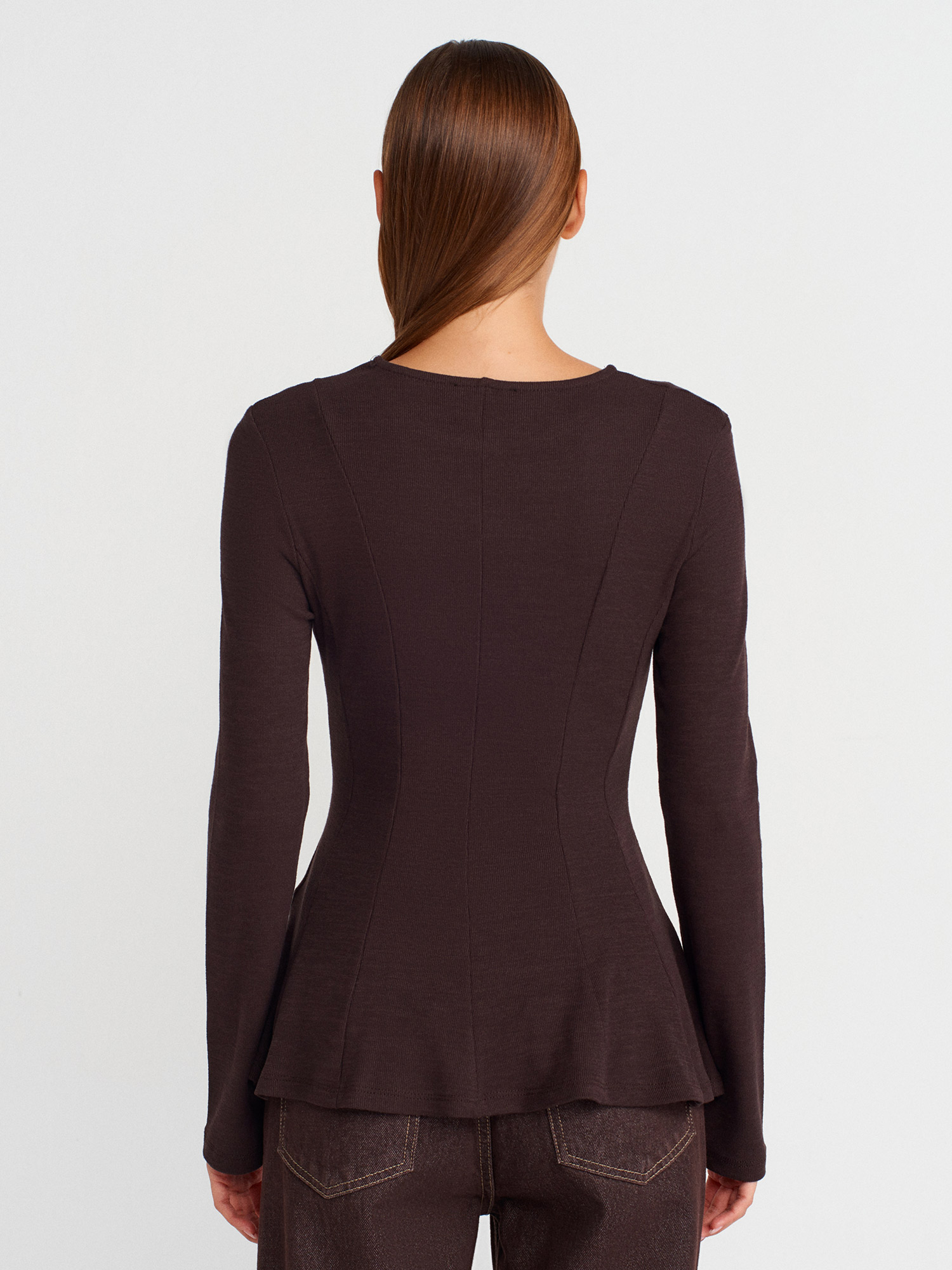 32090 Uzun Kollu Peplum Top-Koyu Kahve