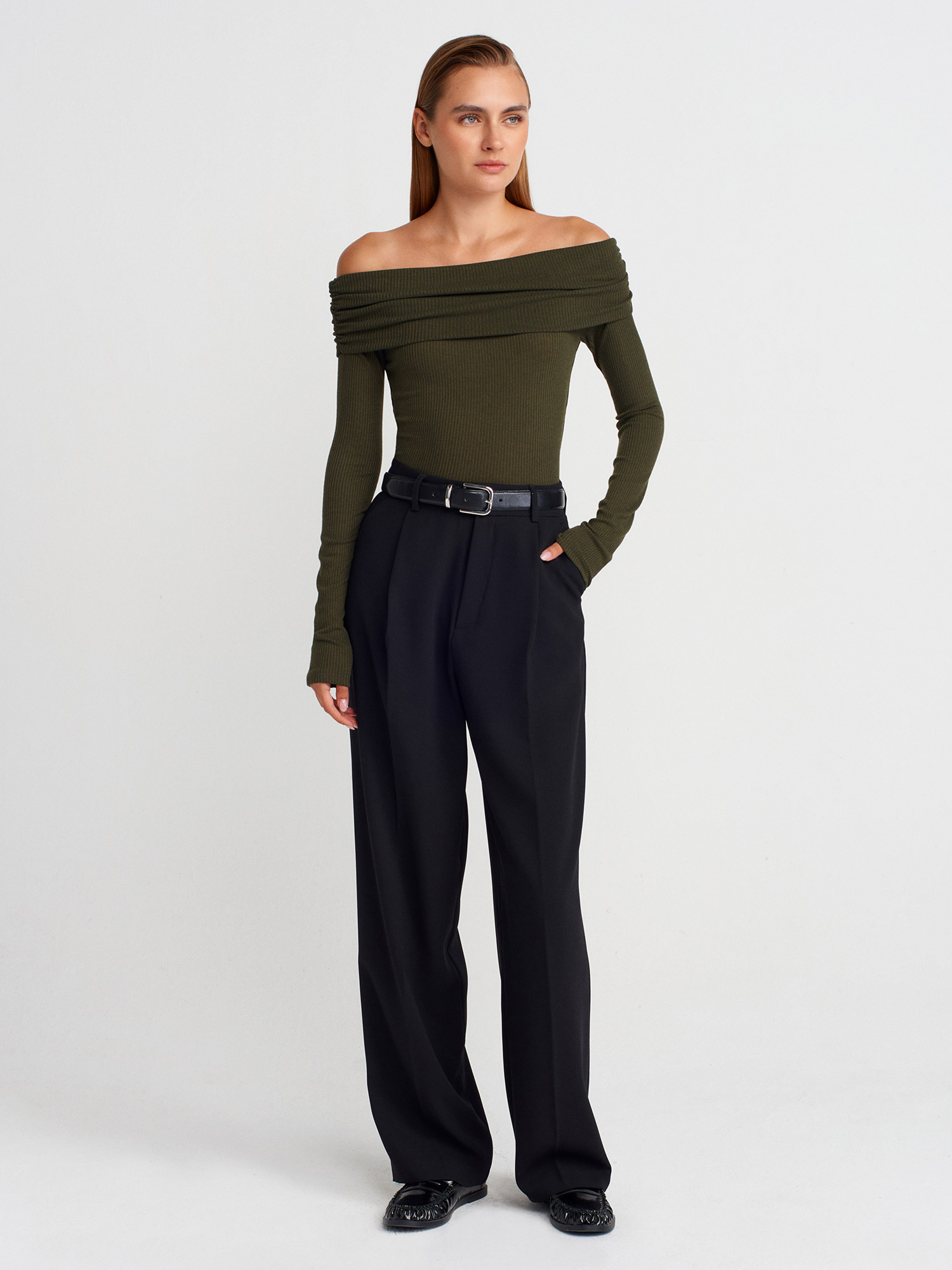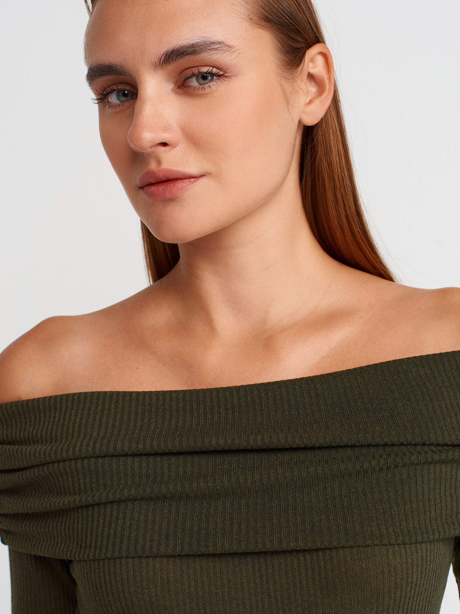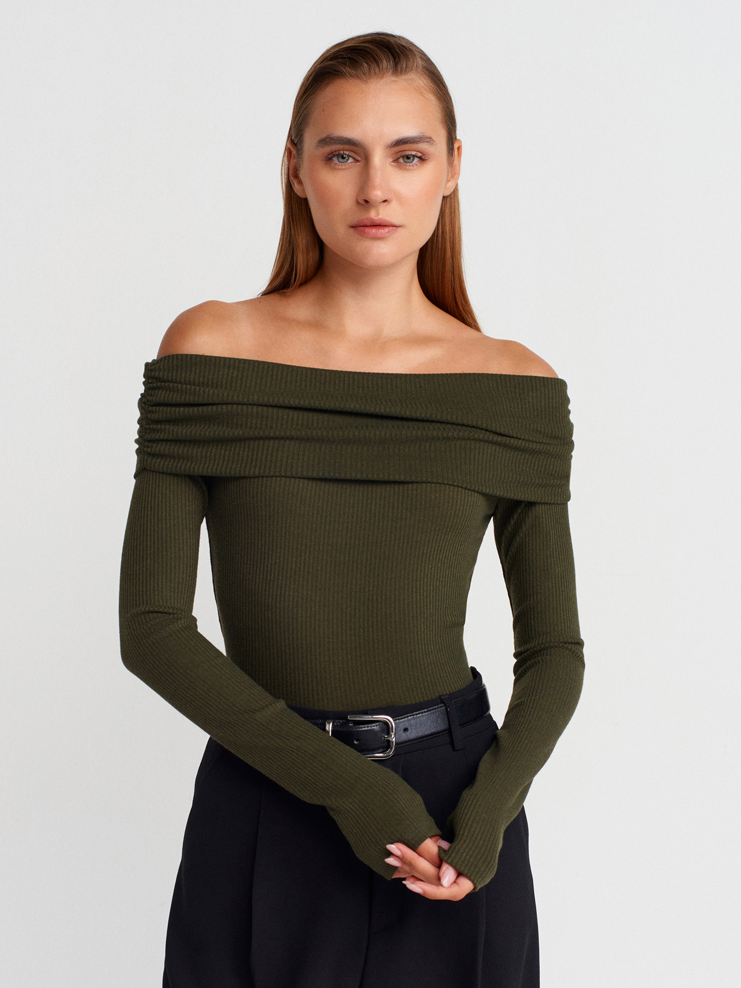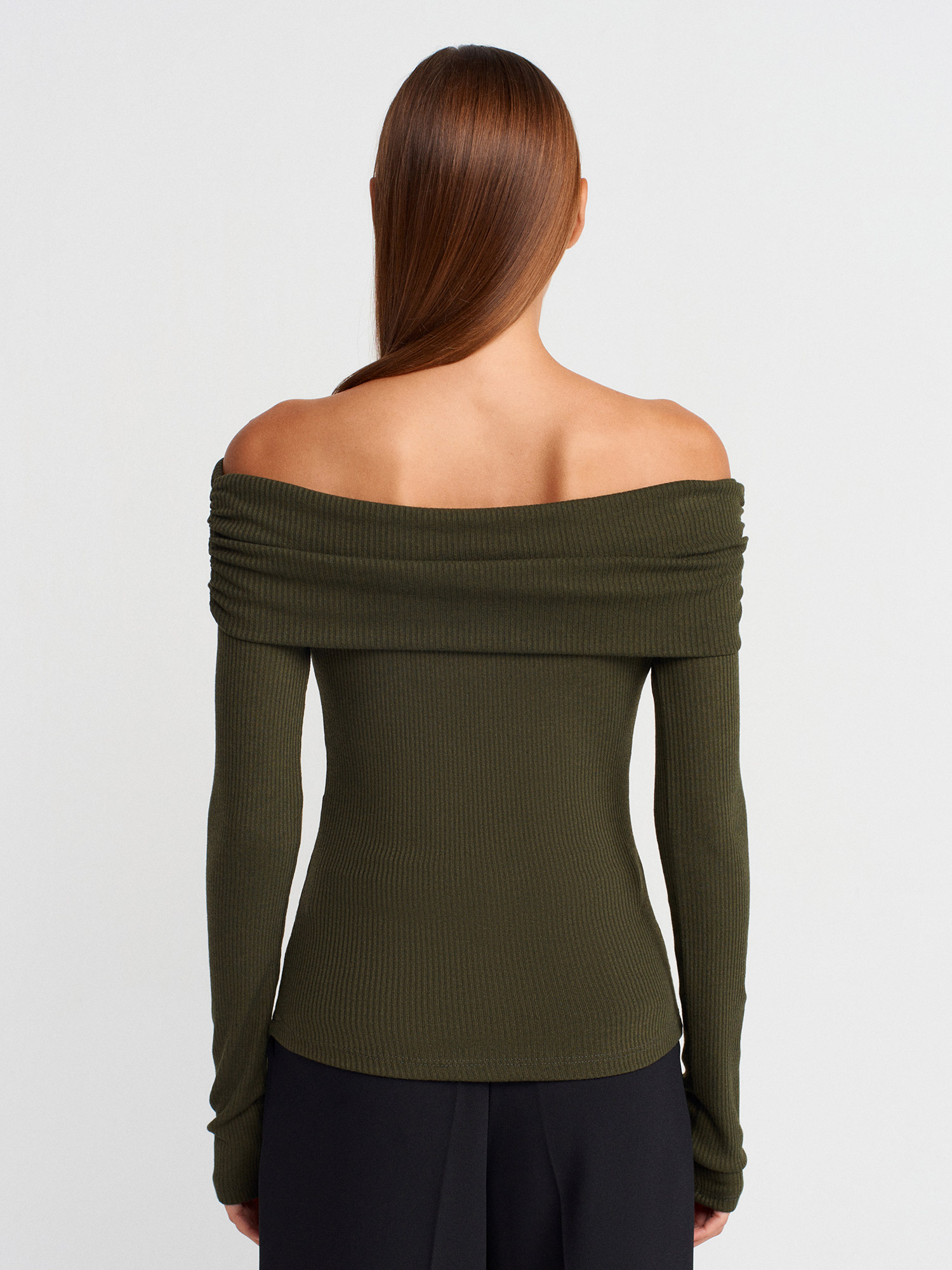 32128 Omuzları Açık Uzun Kollu Top-Açık Haki