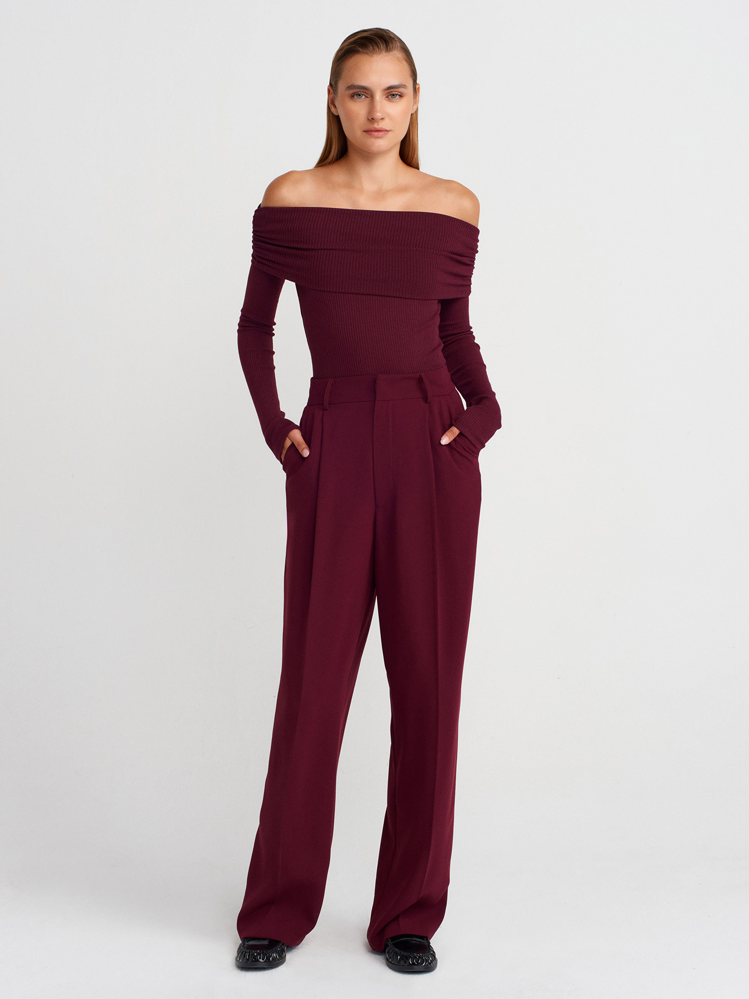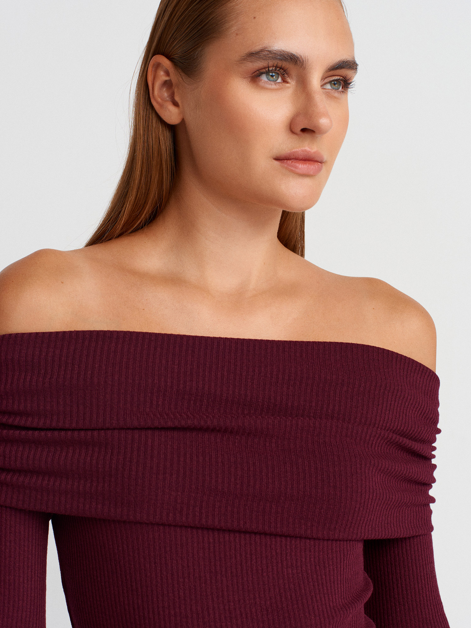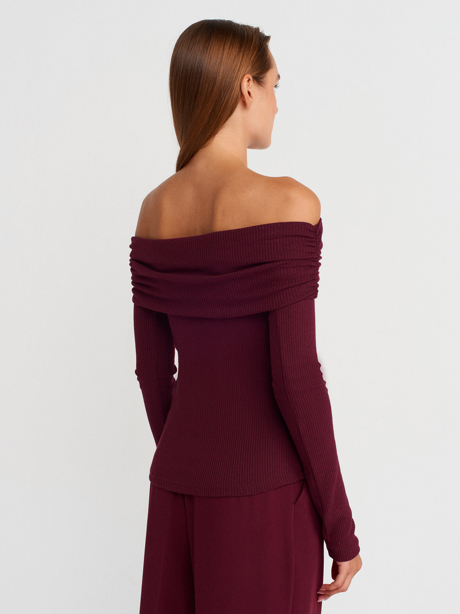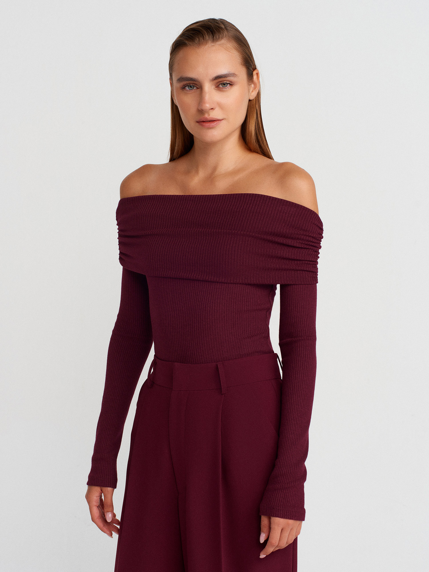 32128 Omuzları Açık Uzun Kollu Top-Bordo
