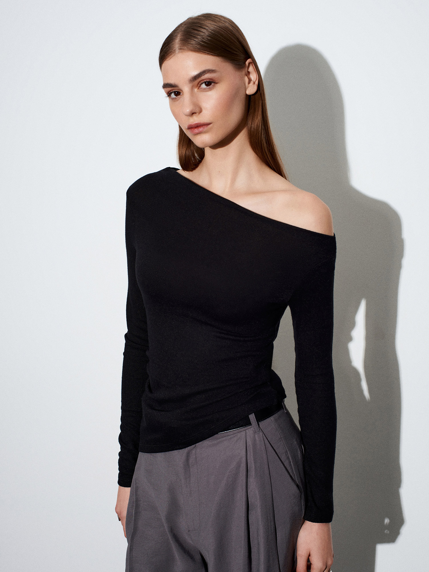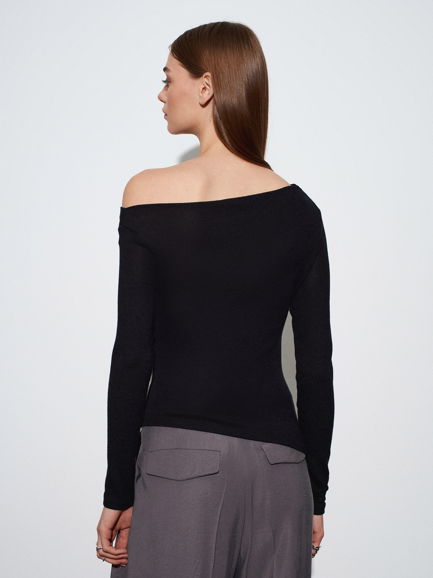 32197 Düşük Omuz Asimetrik Kesim Top-Siyah