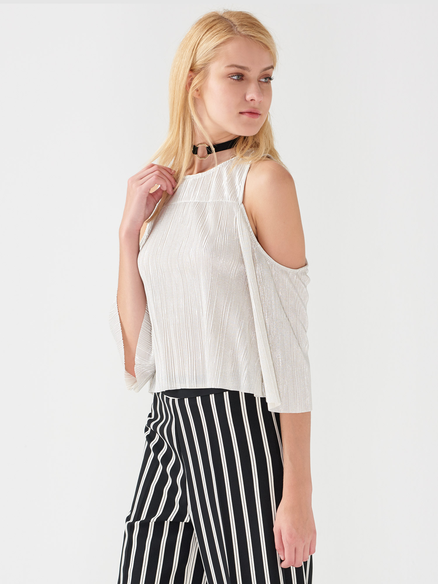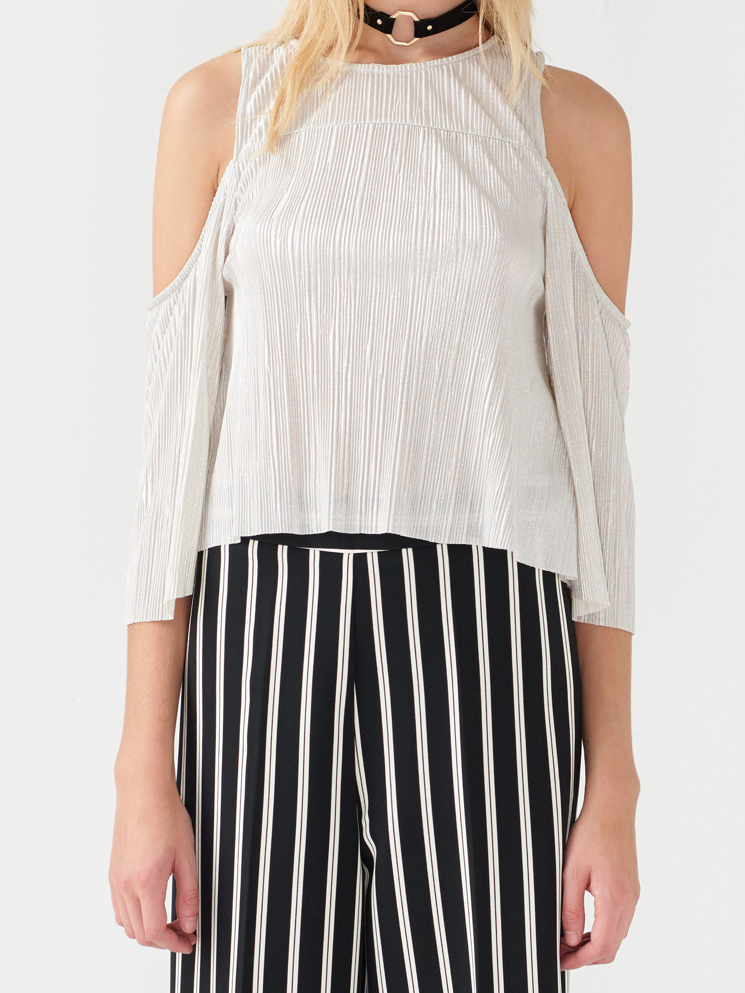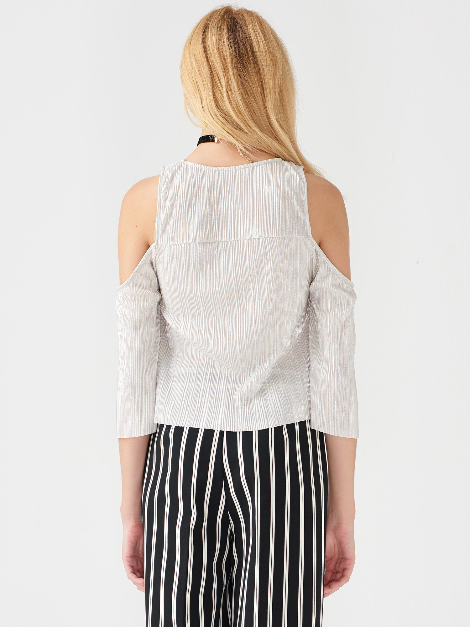 3313 Omuzları Açık Parlak Kumaş Bluz-Ekru