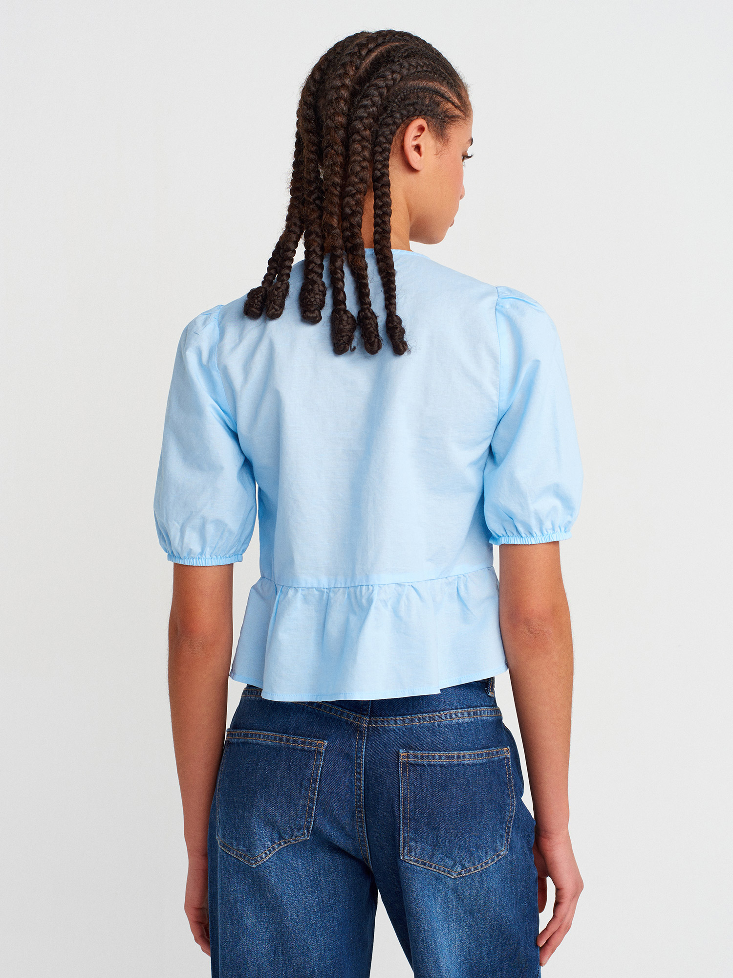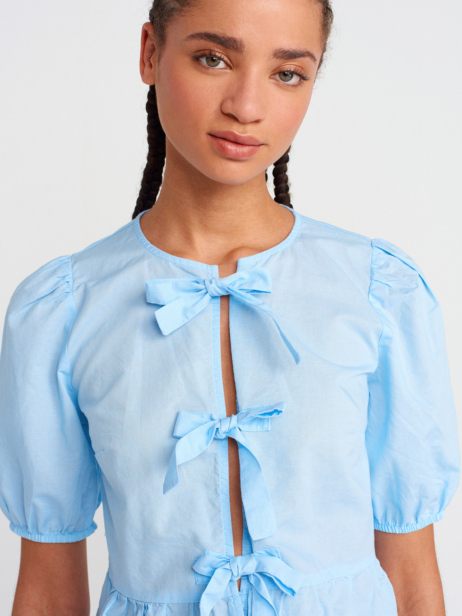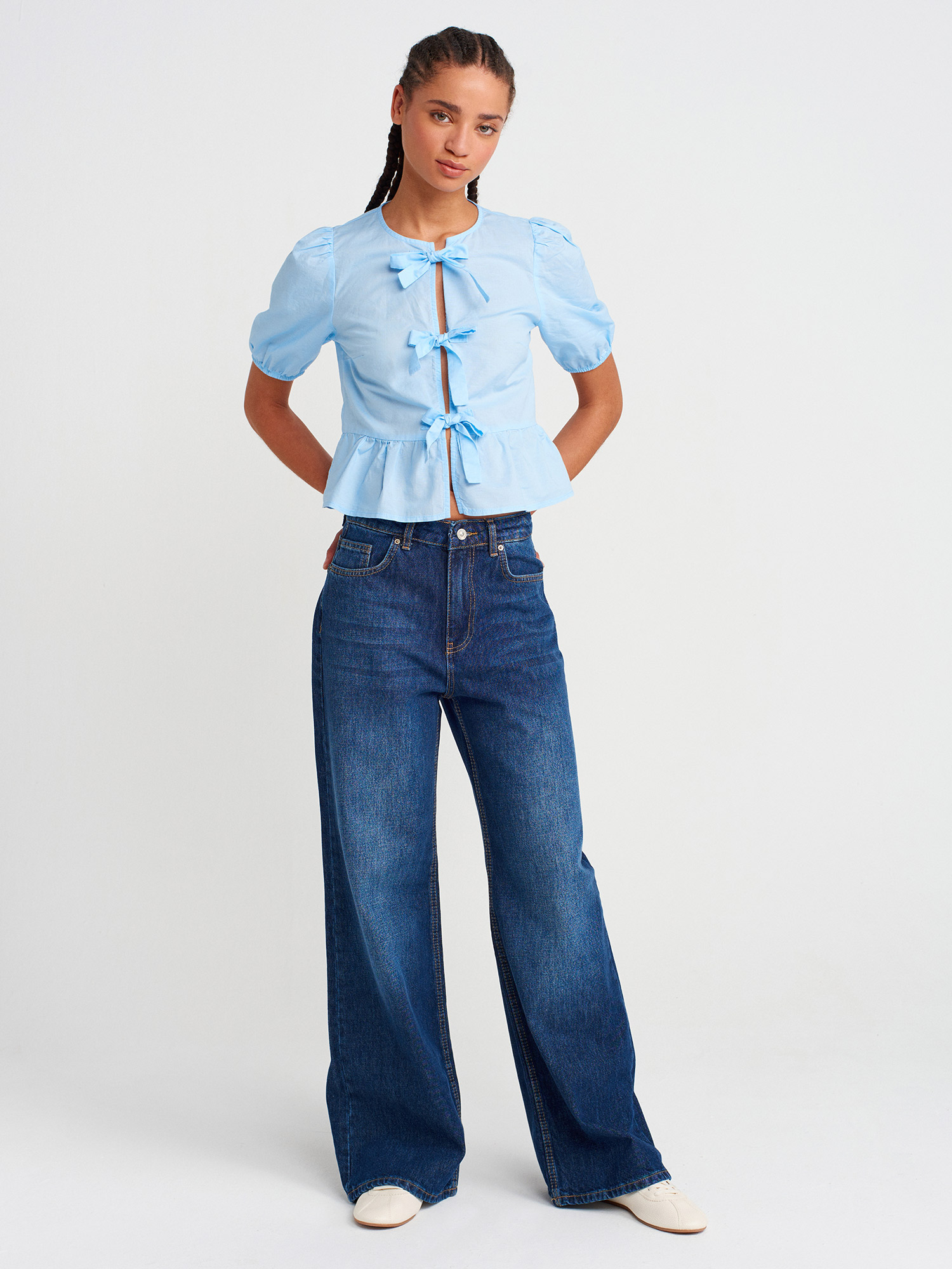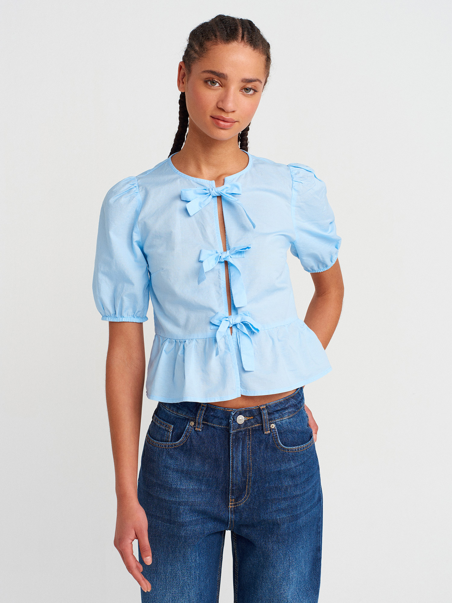 50502 Kurdele Bağlamalı Kısa Kol Bluz-Koyu Mavi
