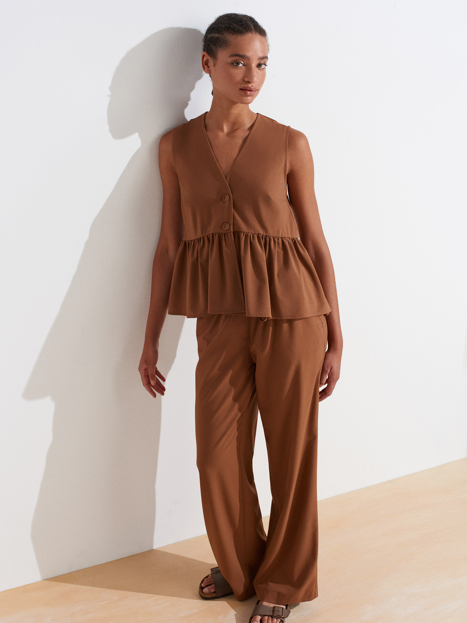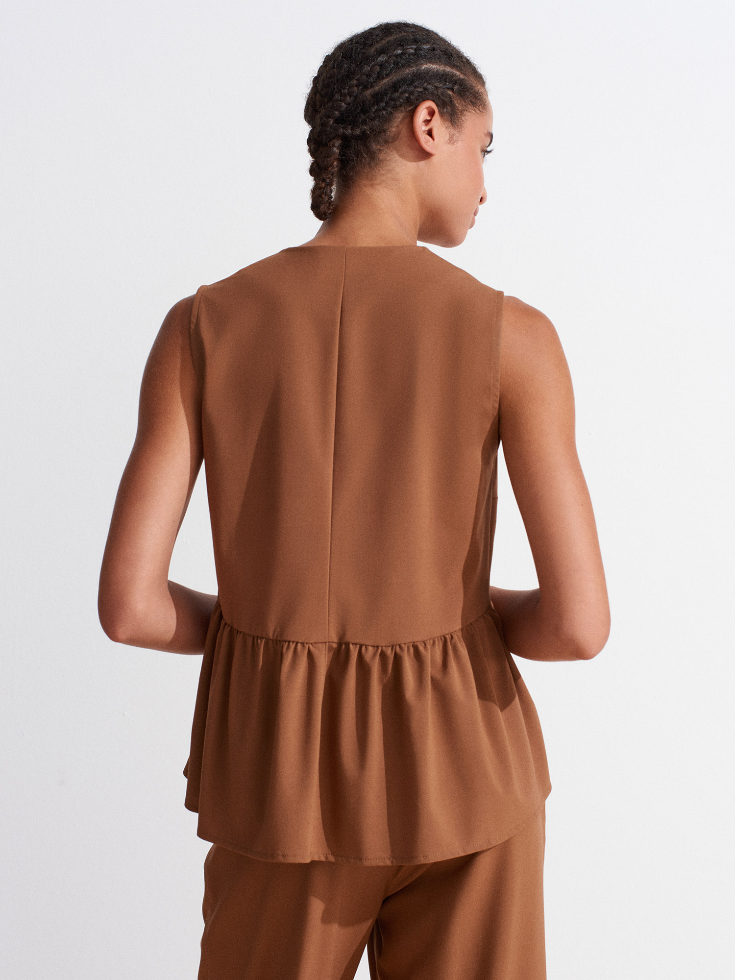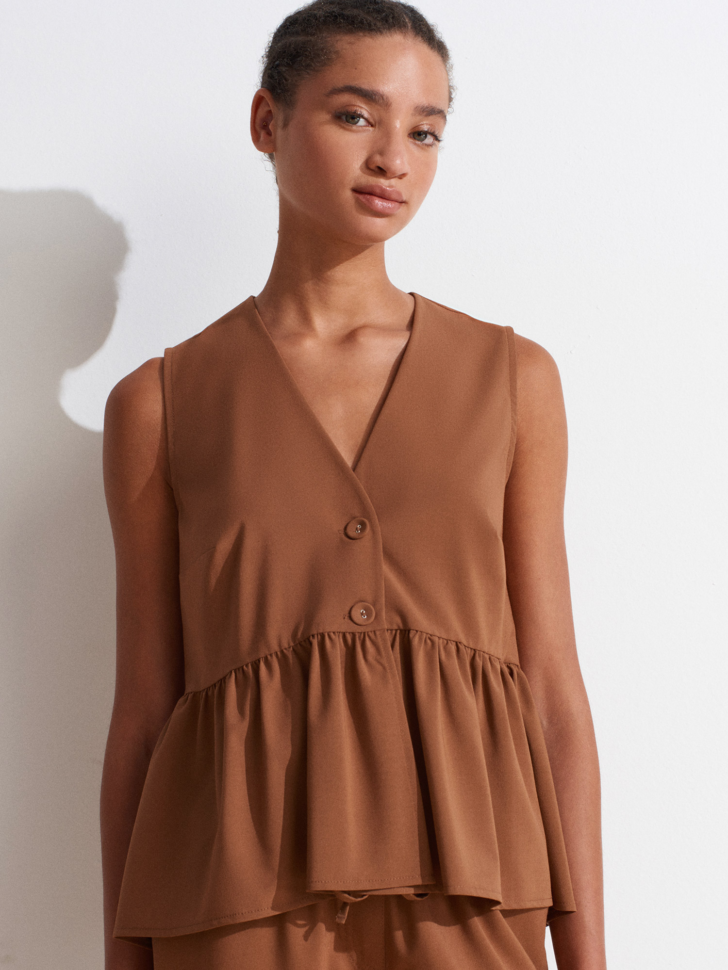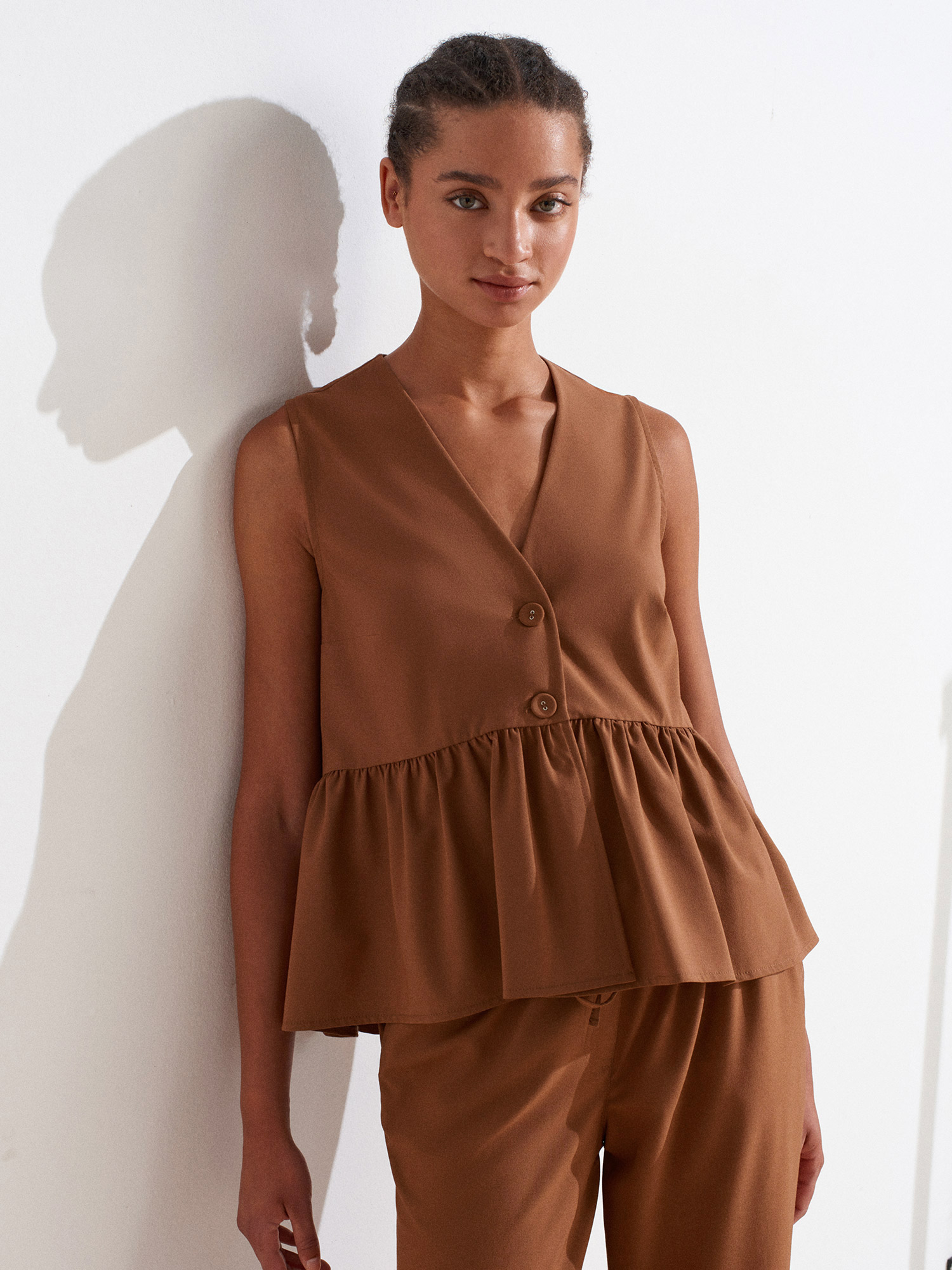 50508 Düğmeli Kolsuz V Yaka Bluz-Taba