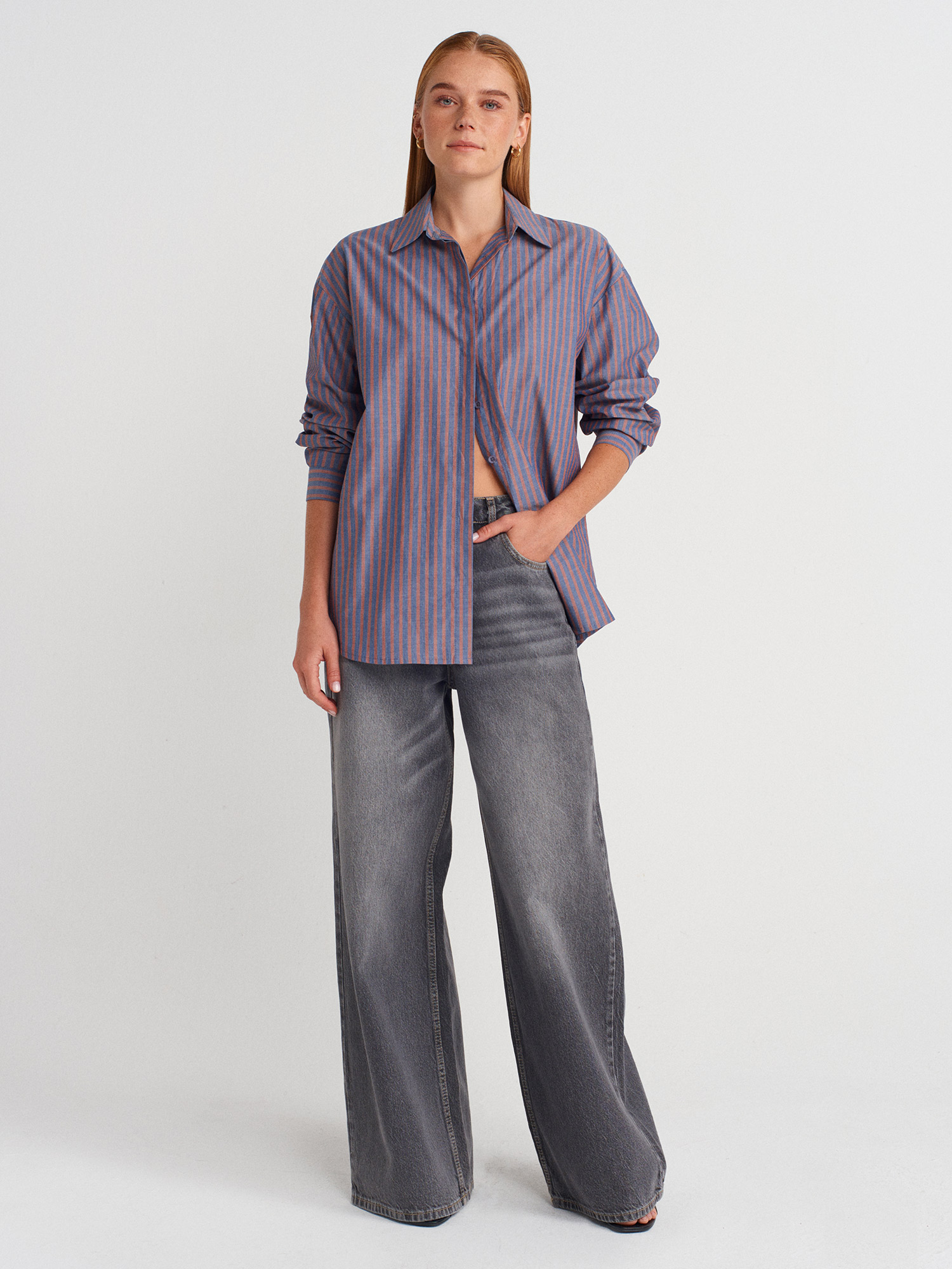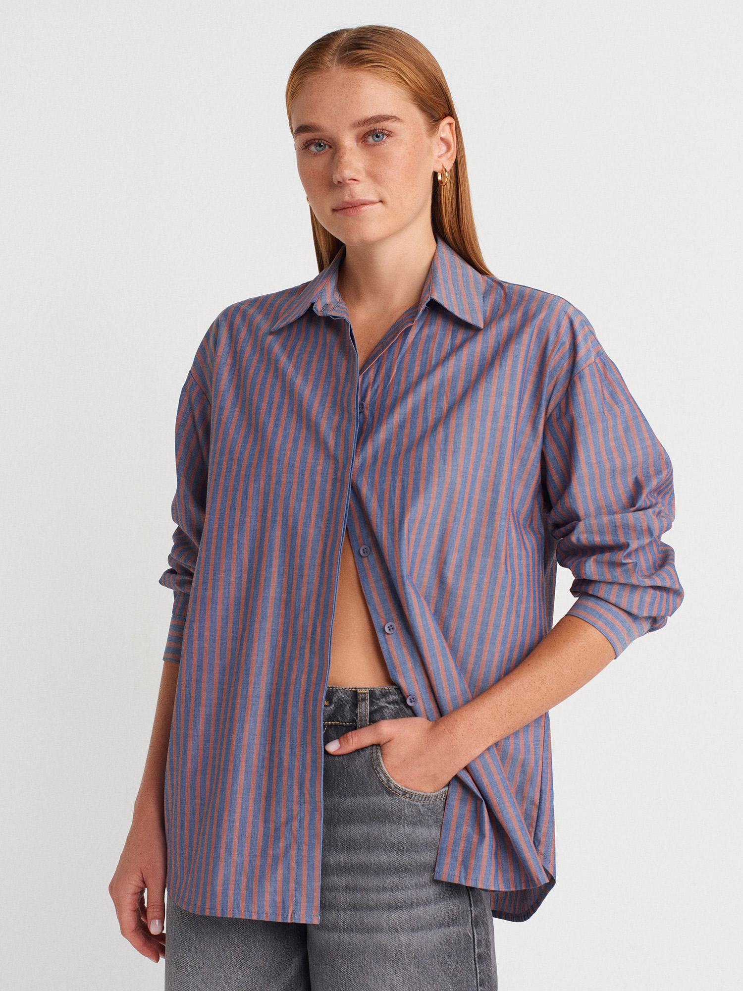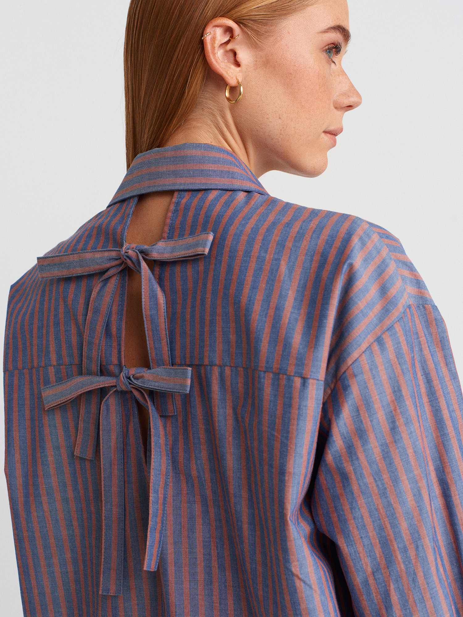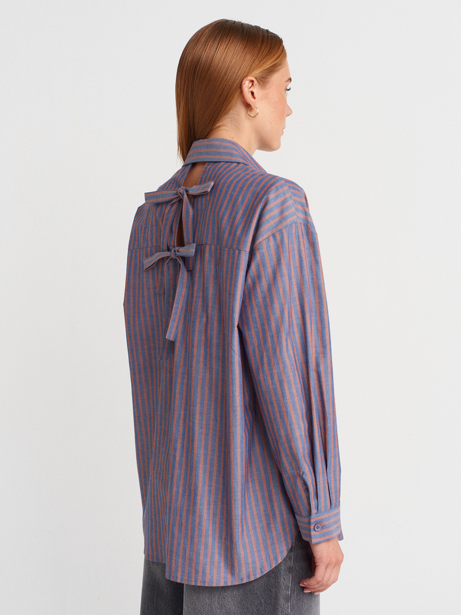 50510 Pamuklu Arkadan Pencere Detaylı Fiyonklu Uzun Kollu Gömlek-Kiremit