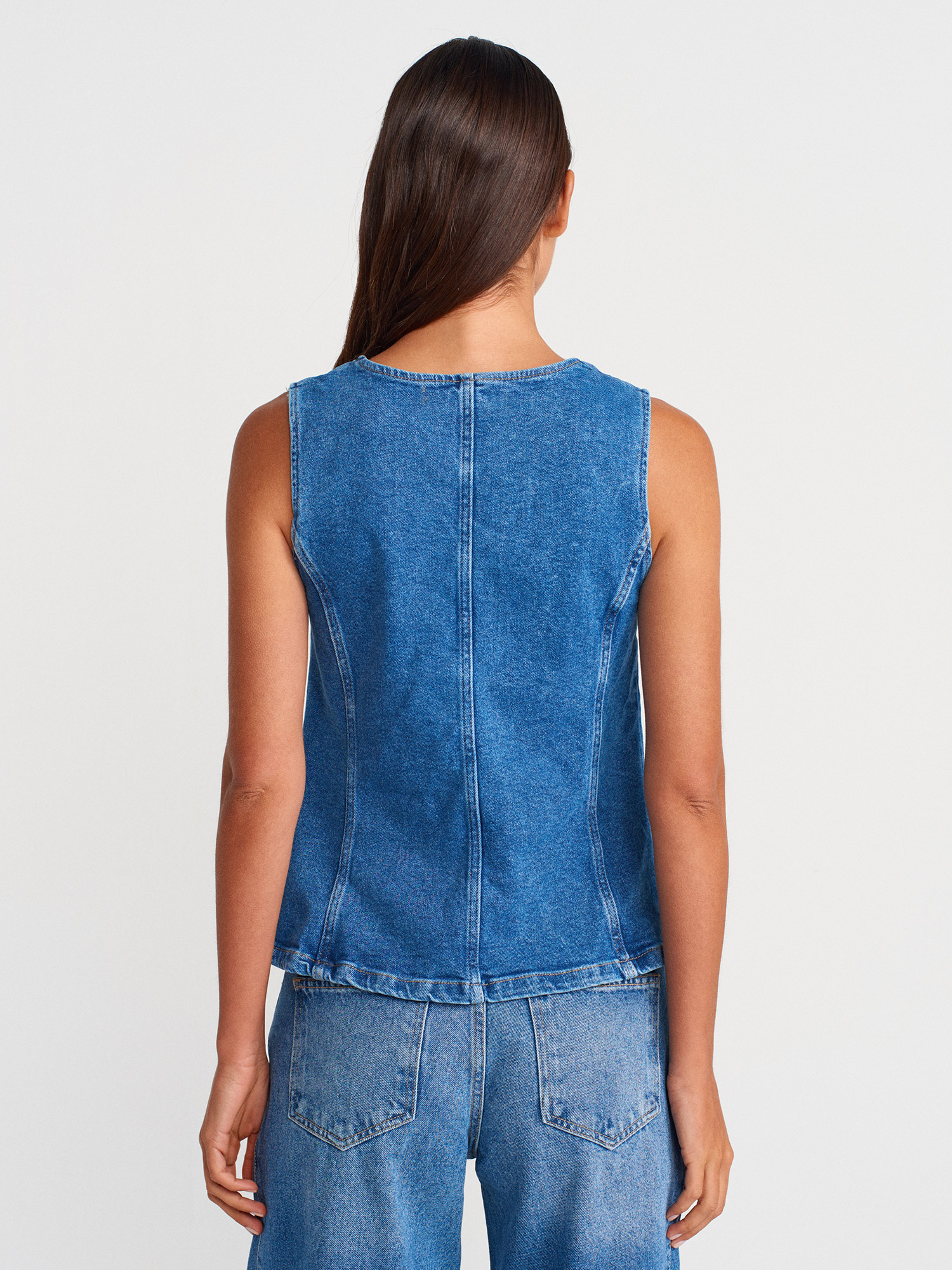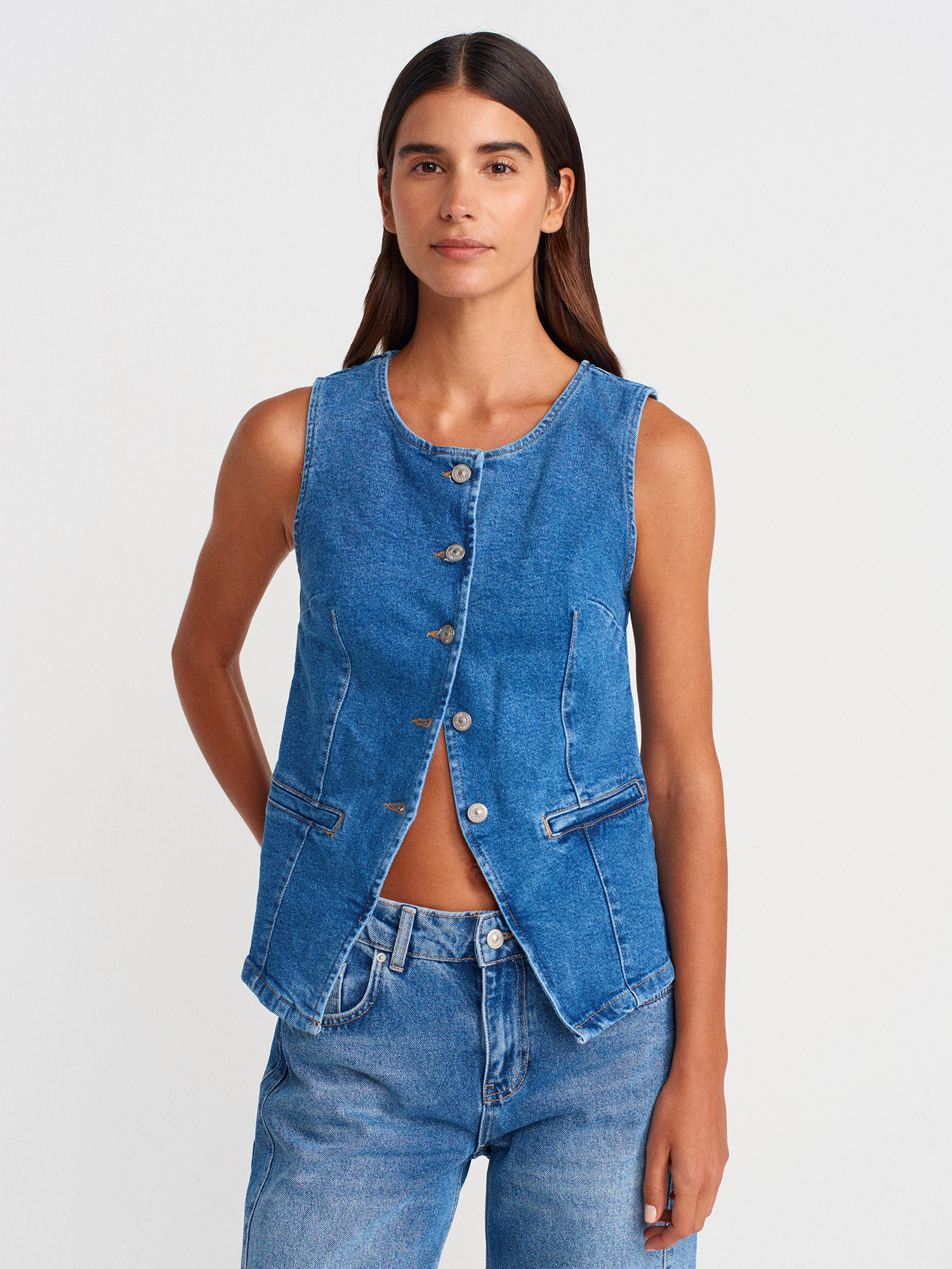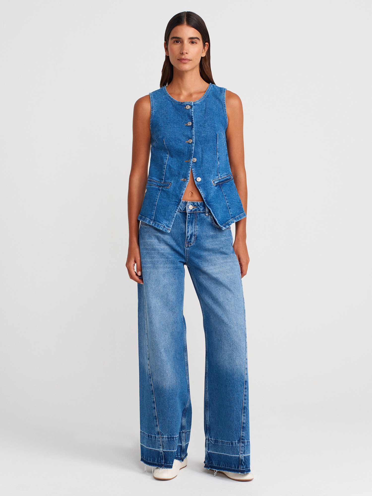 50753 Sıfır Yaka Fletolu Denim Yelek-Mavi