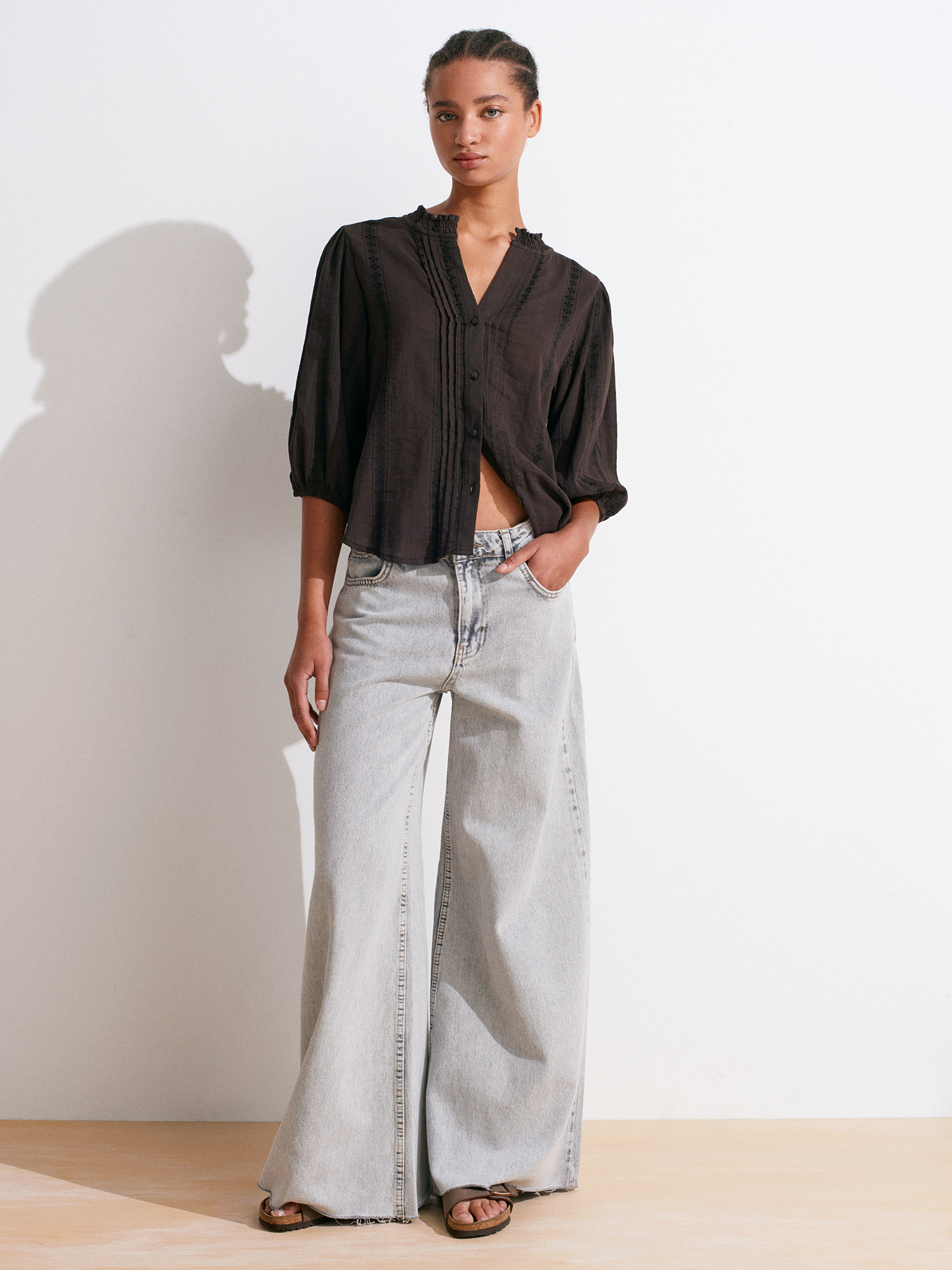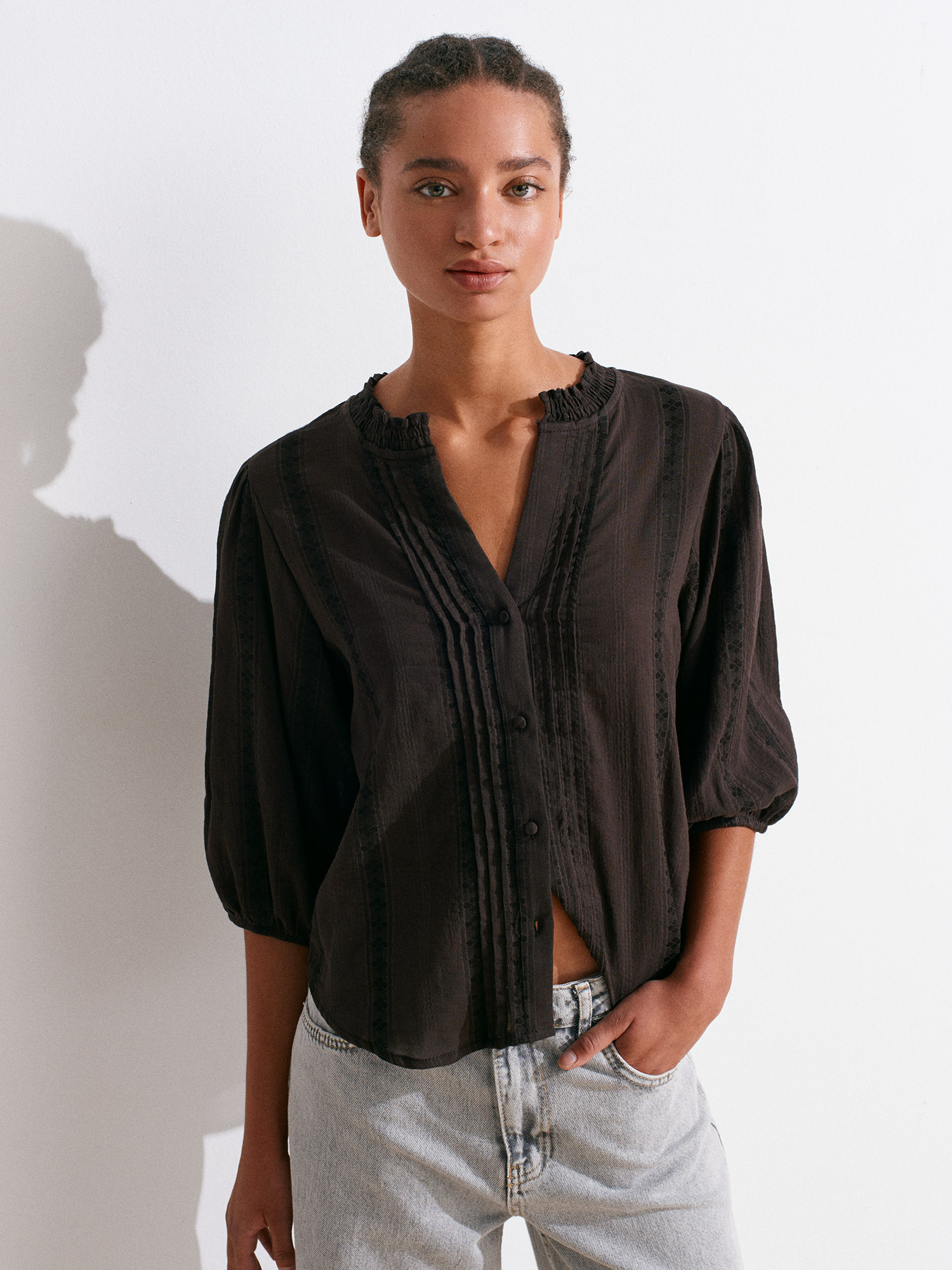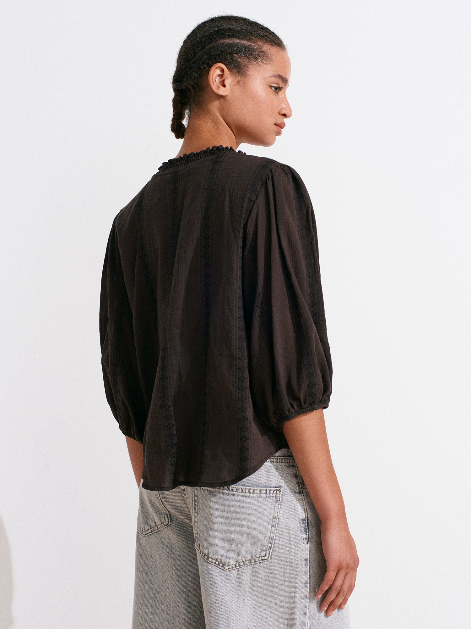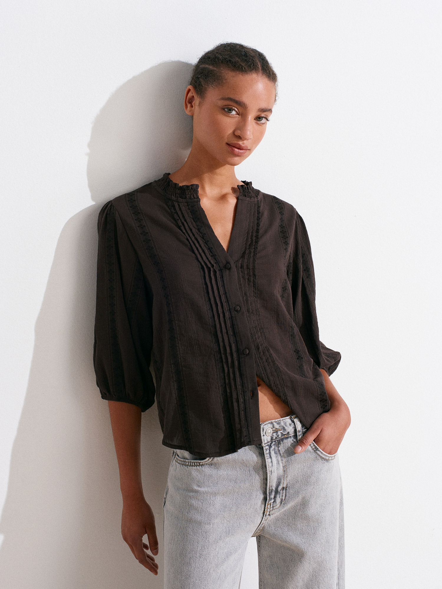 5807 Nervür Detaylı Balon Kol Gömlek-Koyu Kahve