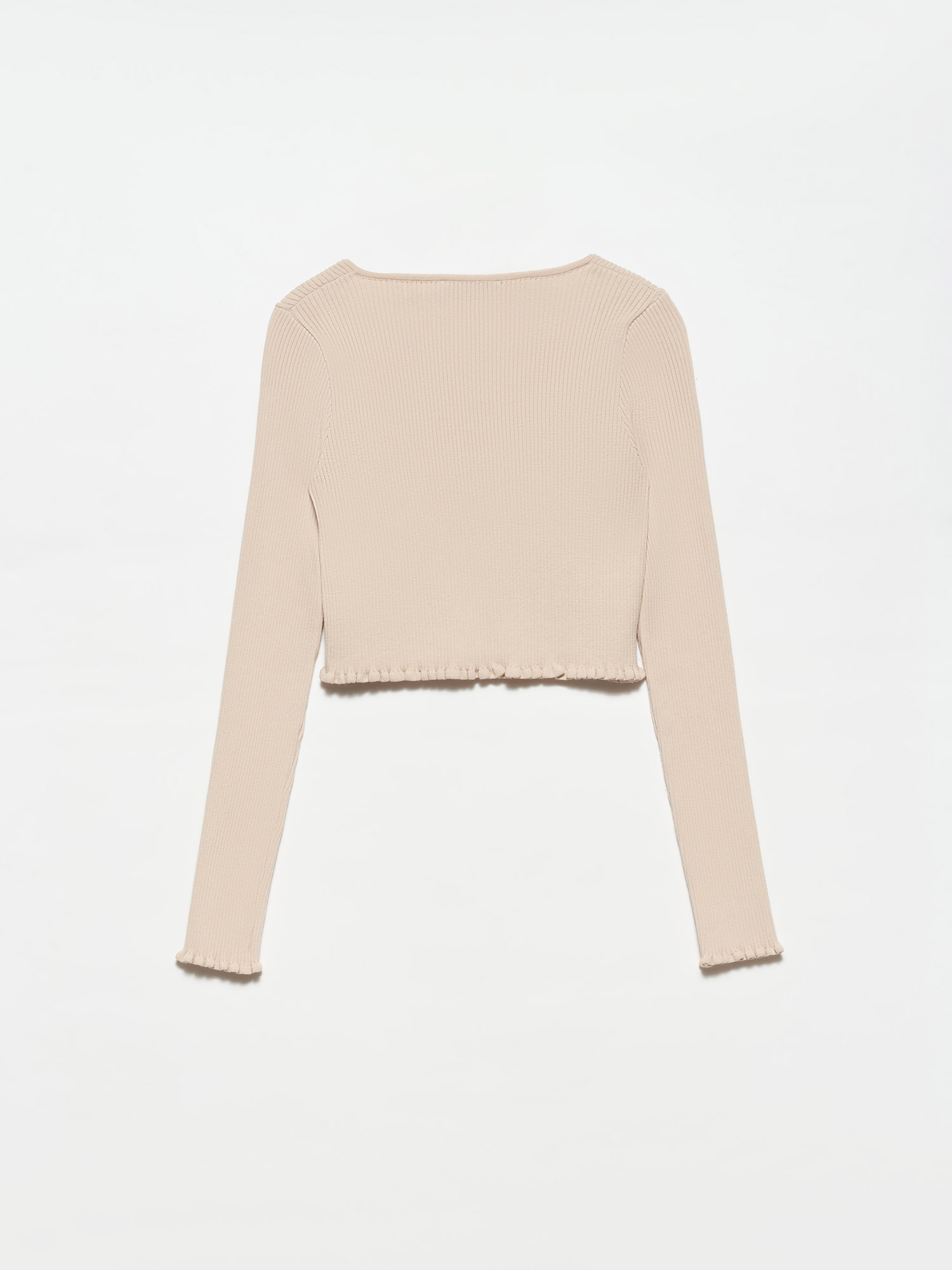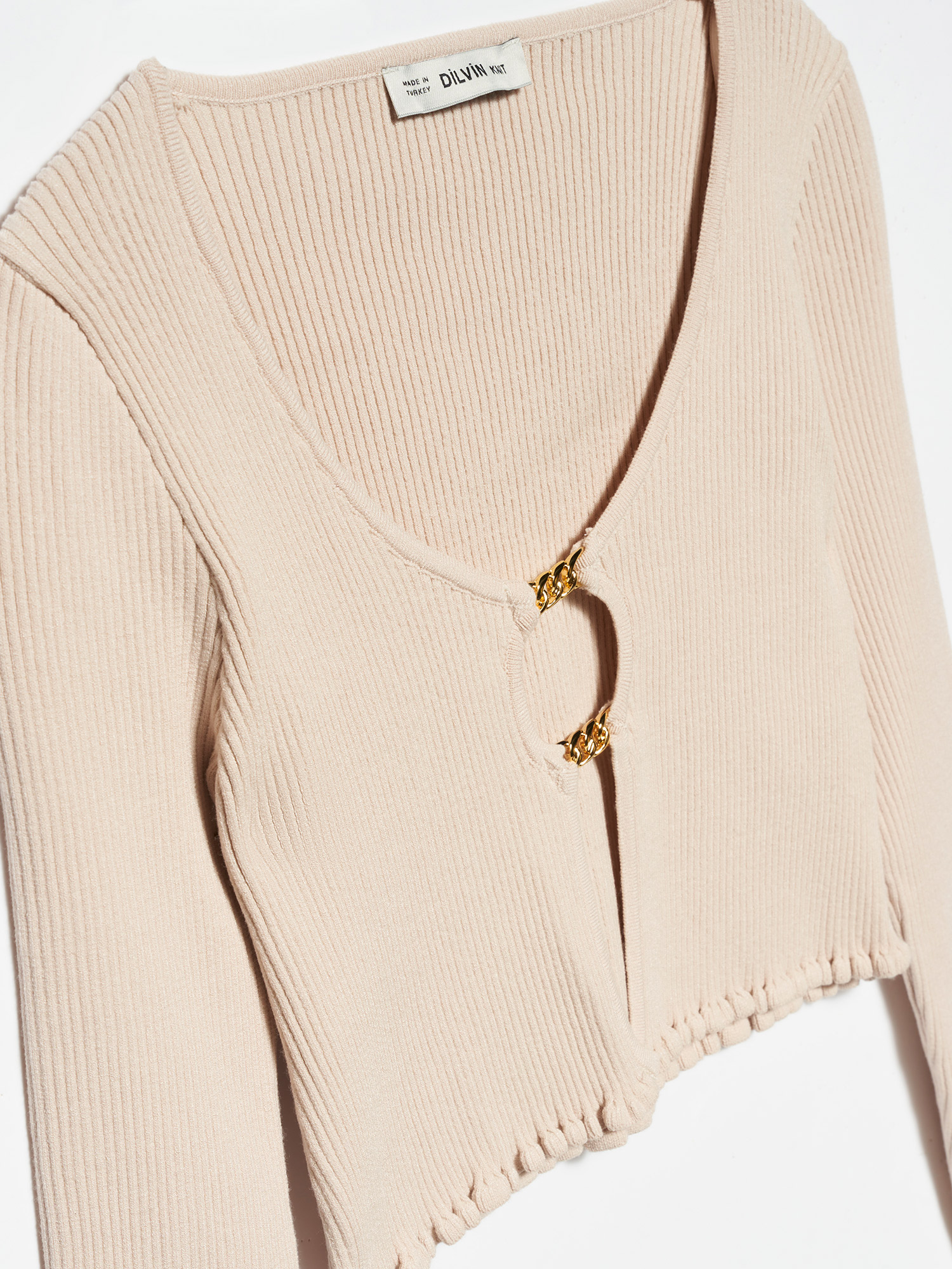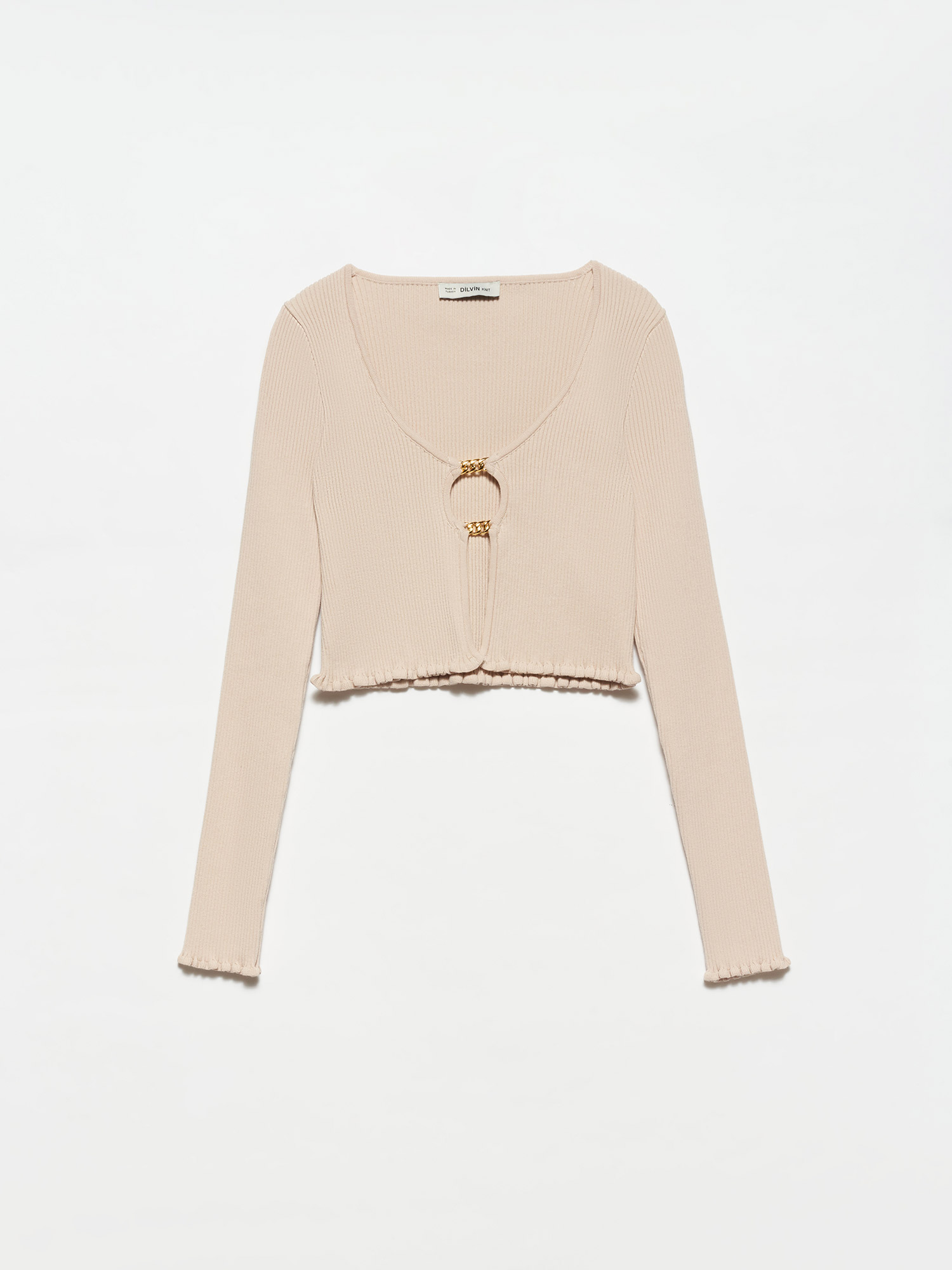 60134 U Yaka Önü Aksesuarlı Triko Hırka-Açık Bej