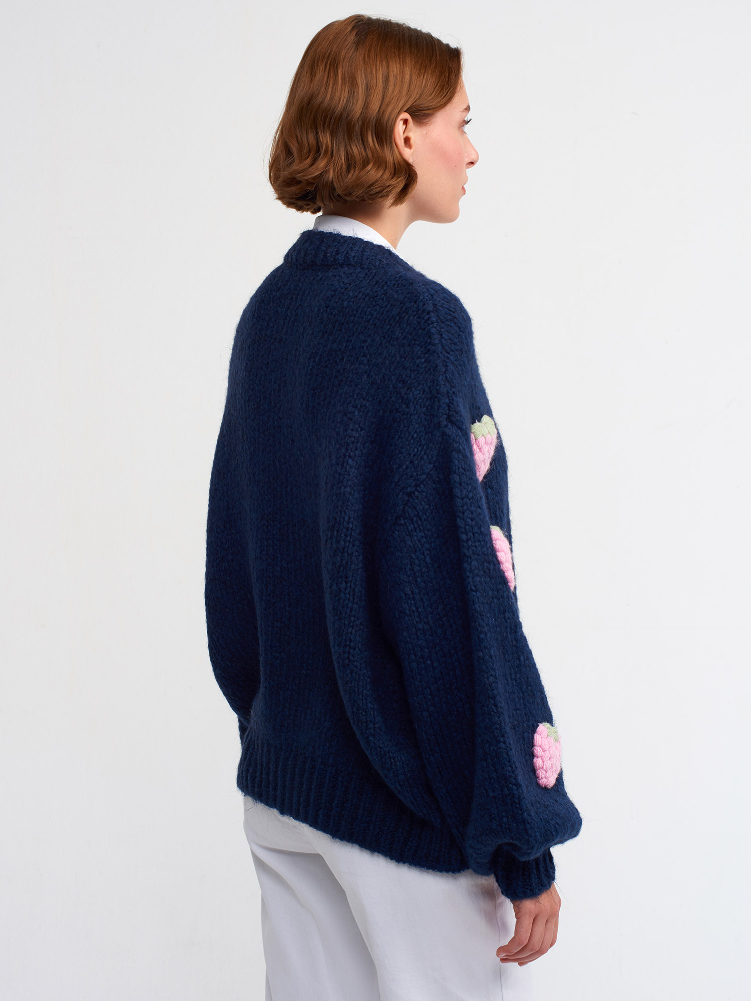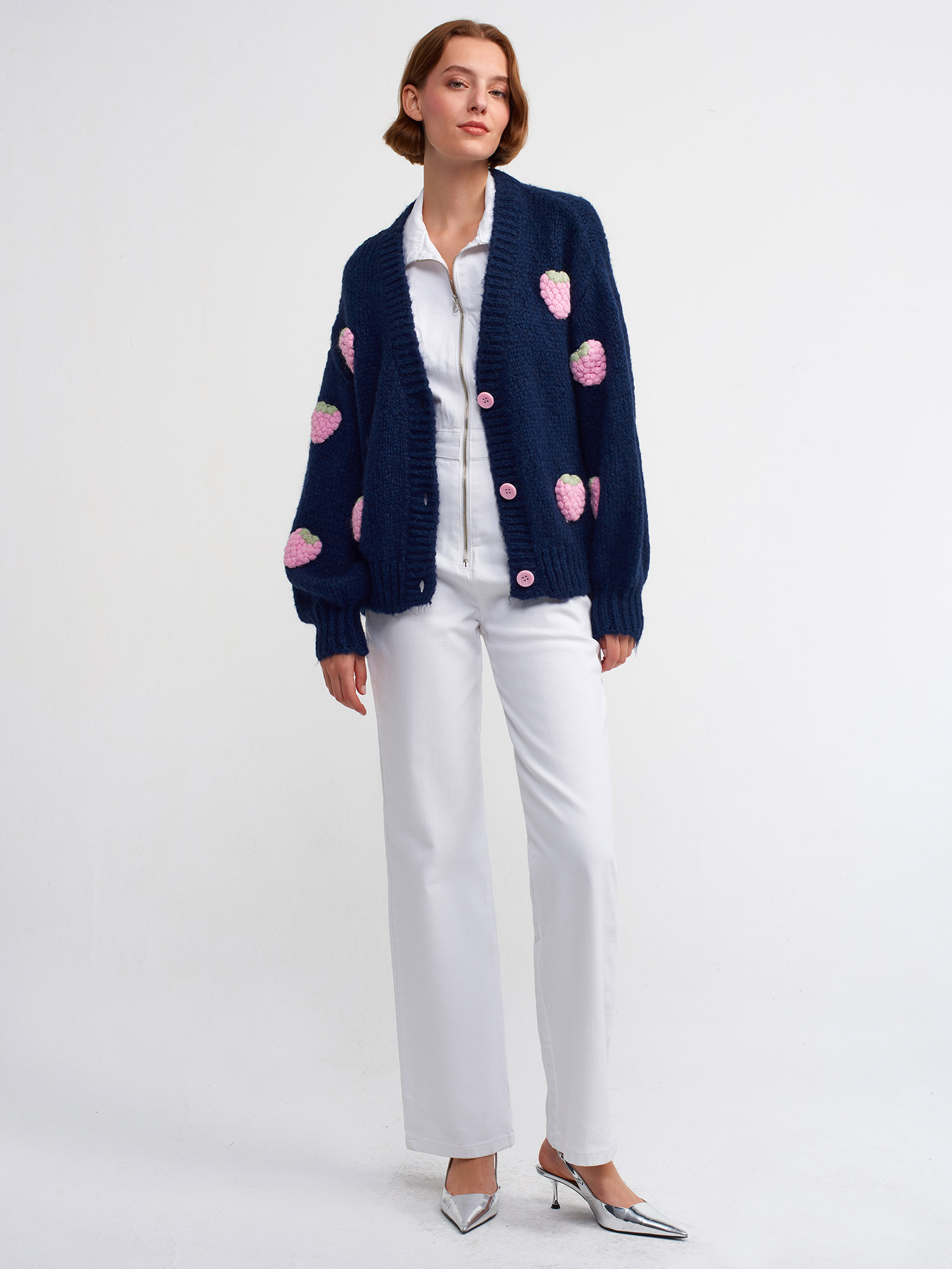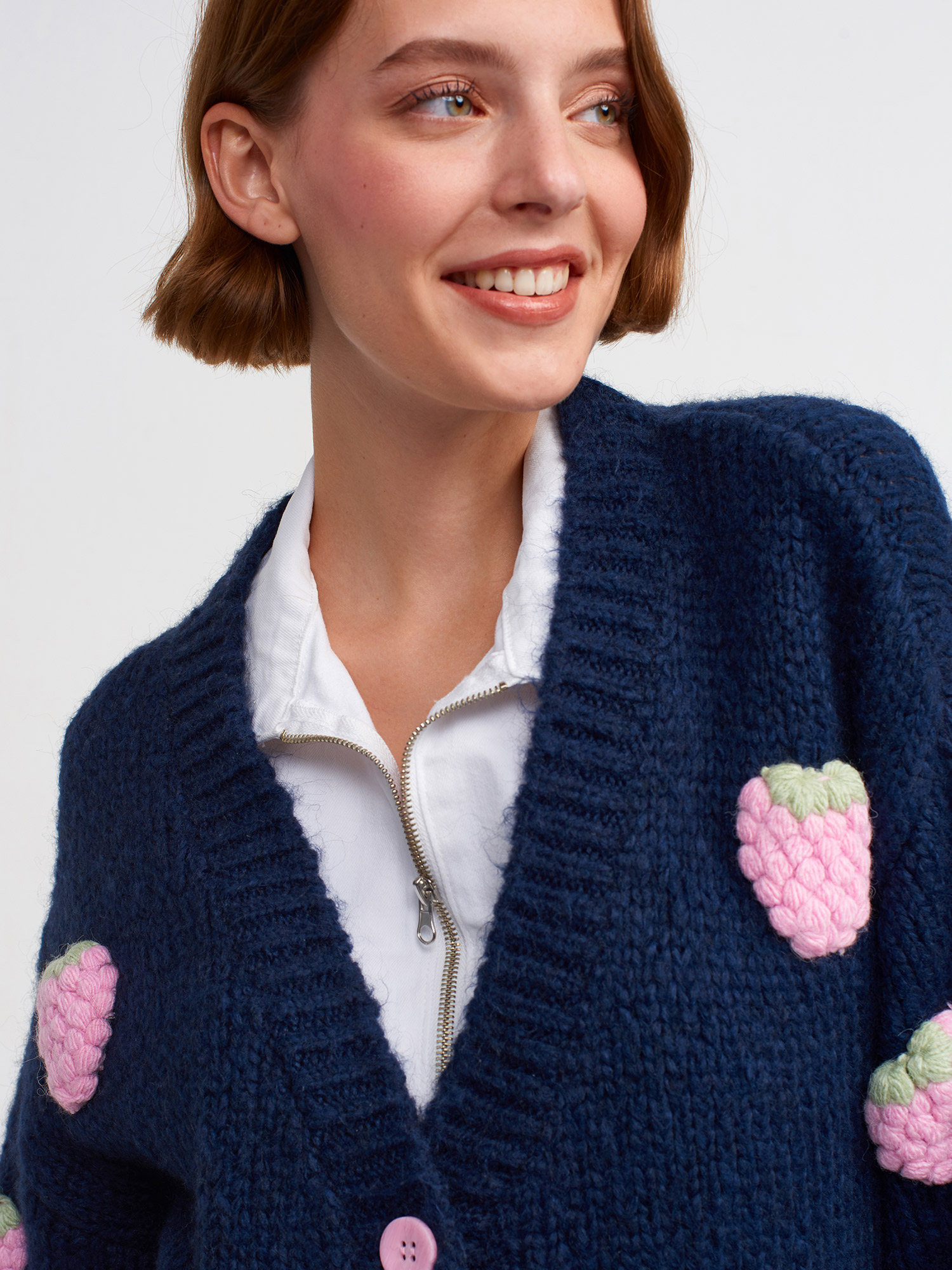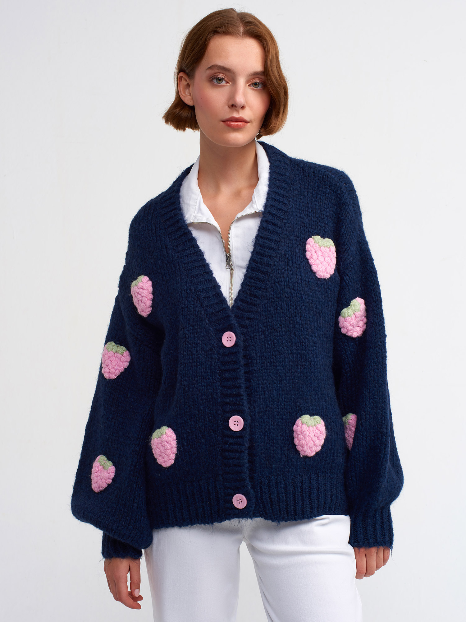 60185 Yün Karışımlı Çilek Nakışlı Hırka-Lacivert