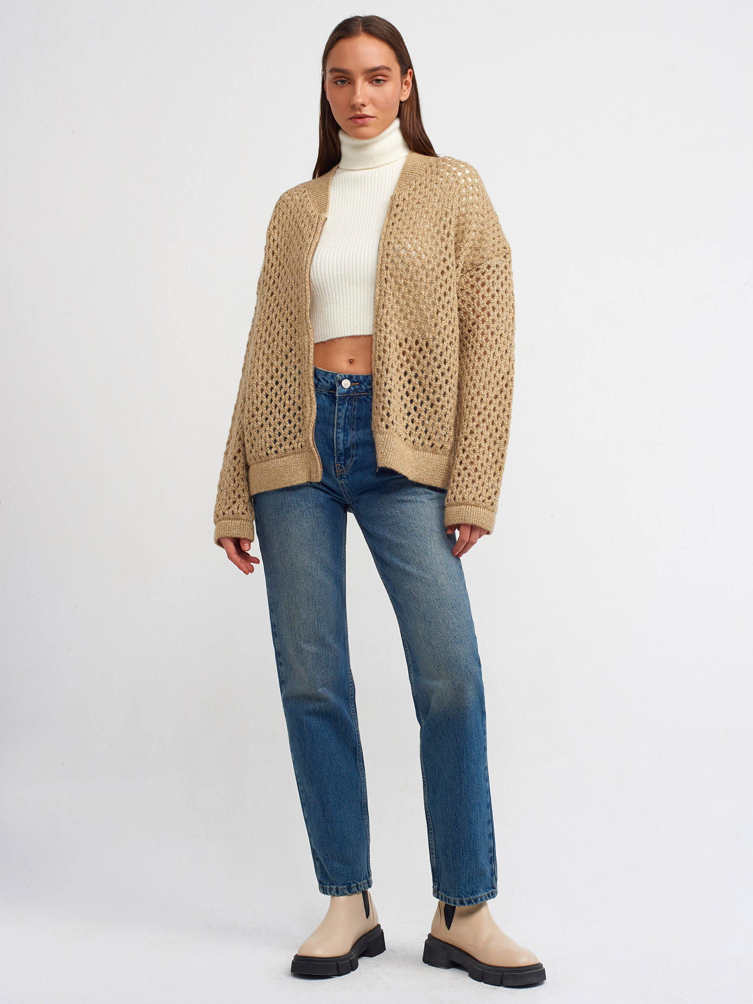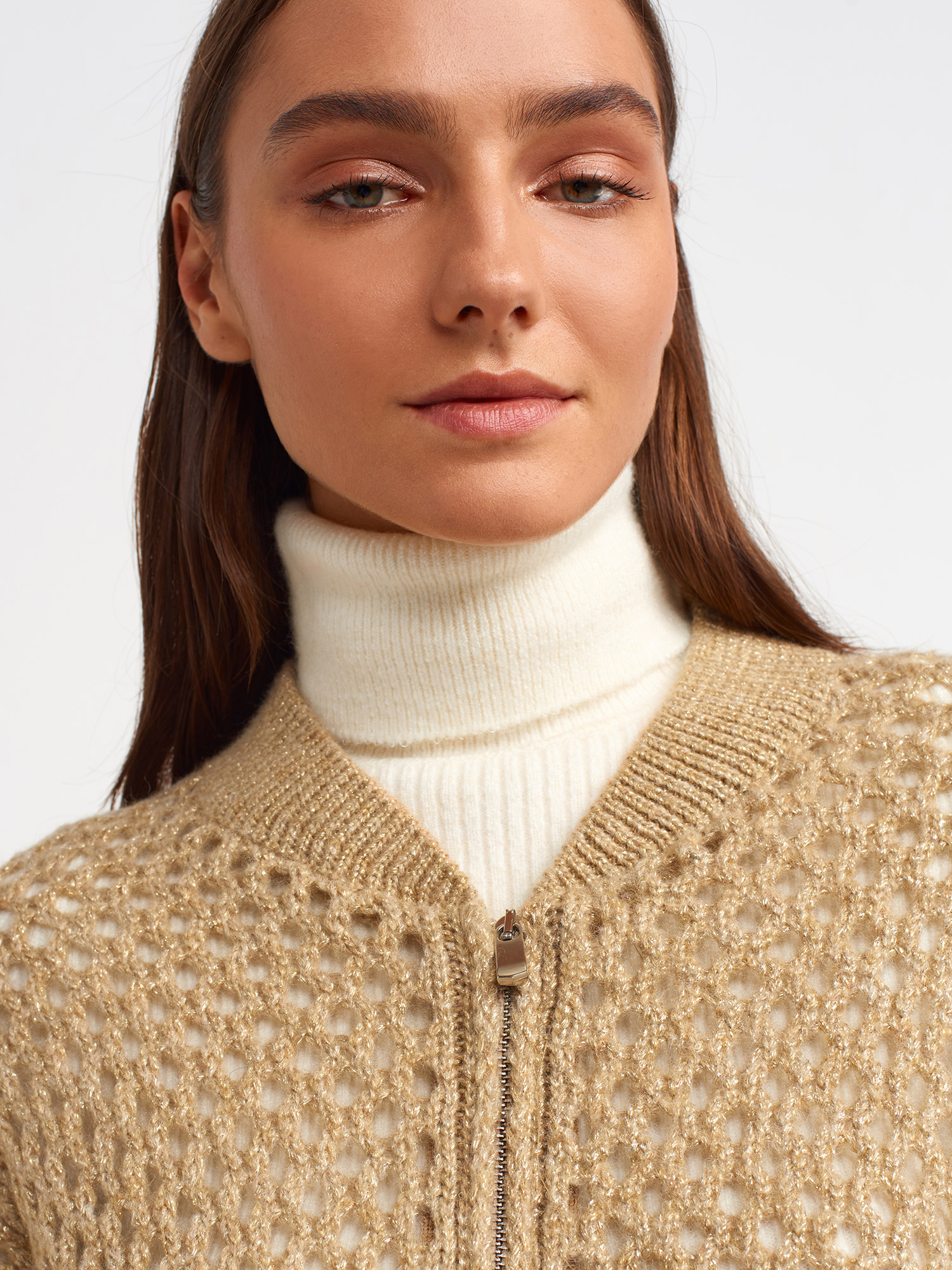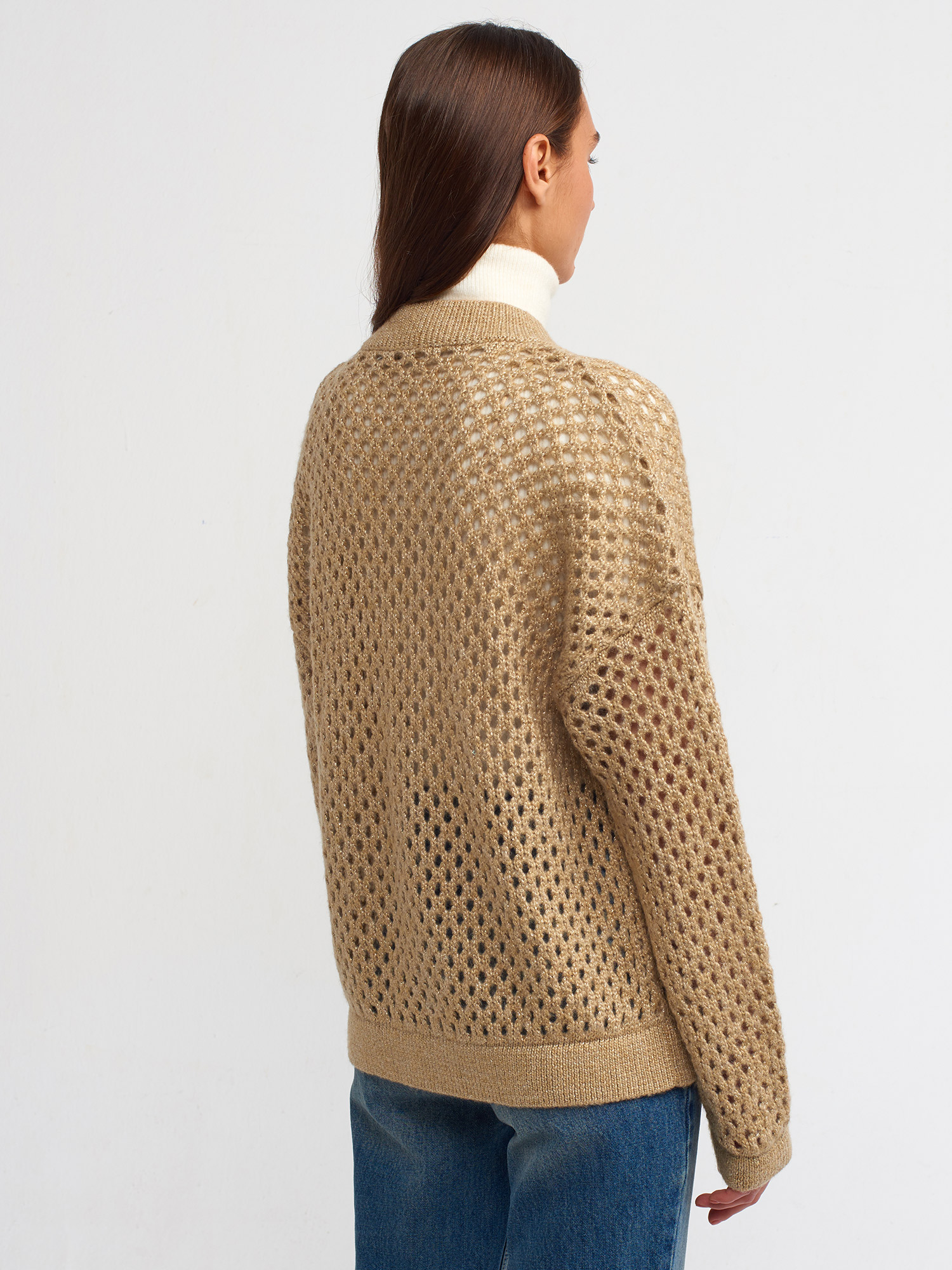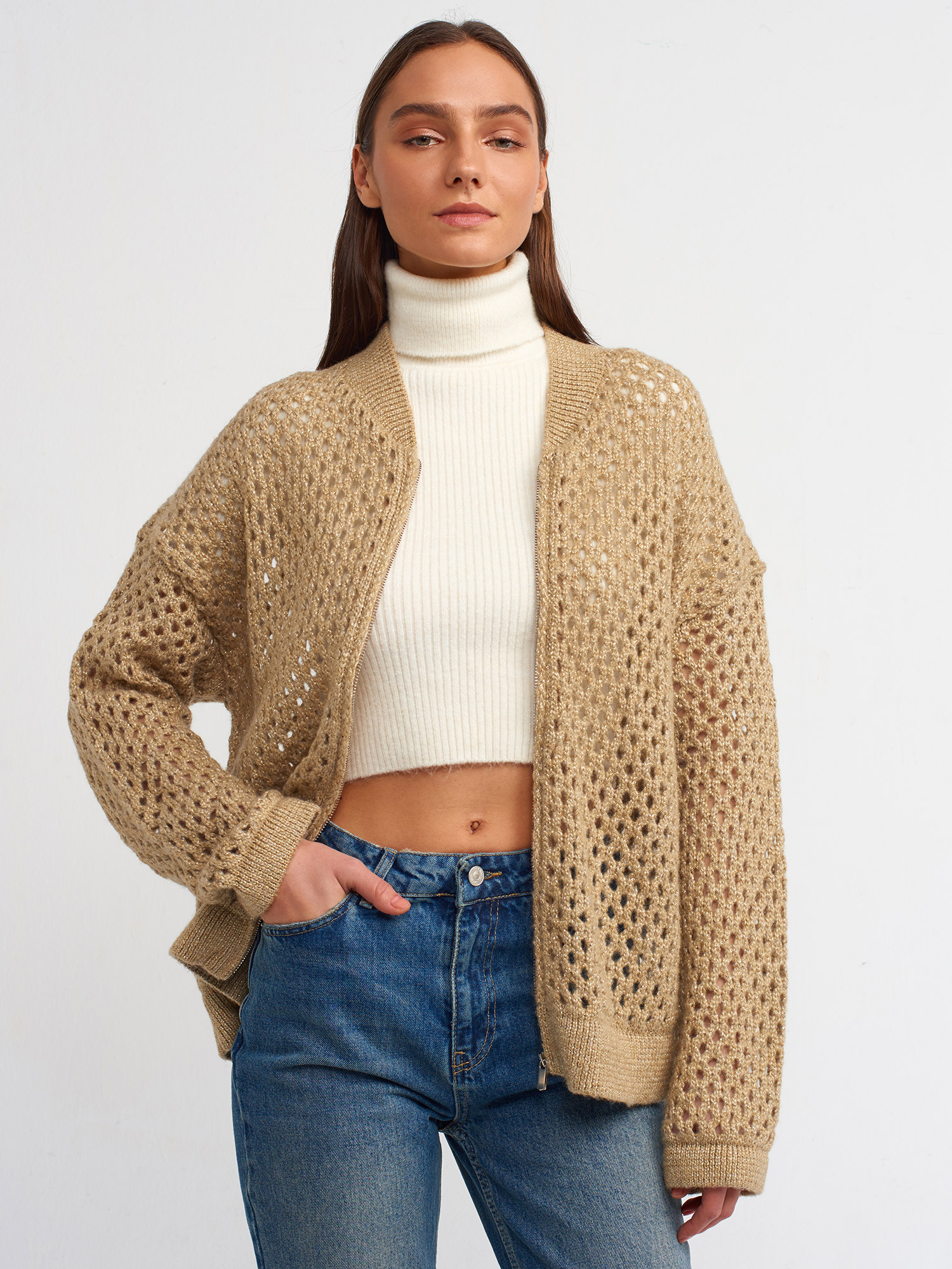 60193 Ajurlu Fermuarlı Triko Hırka-Bej-Altın