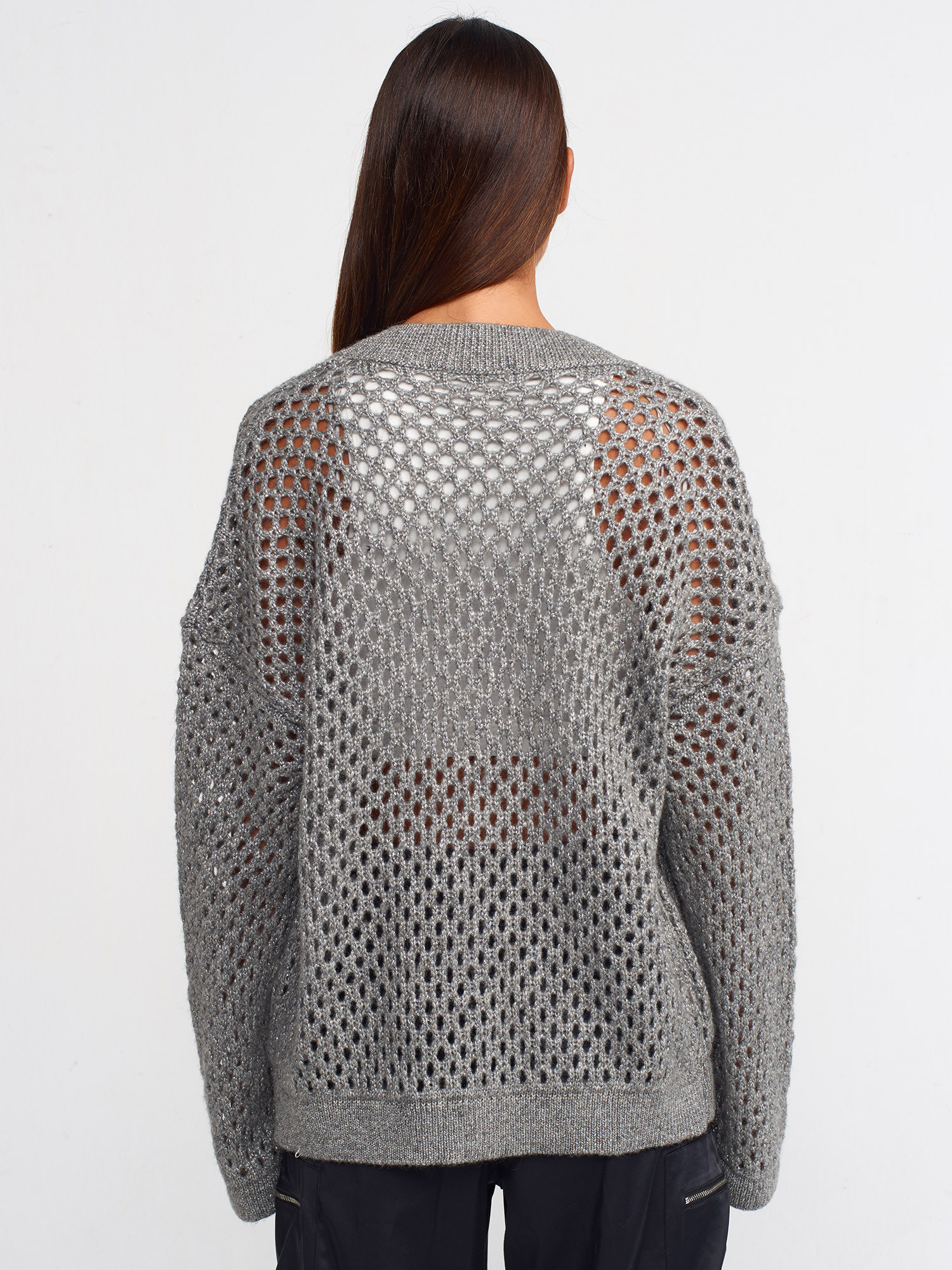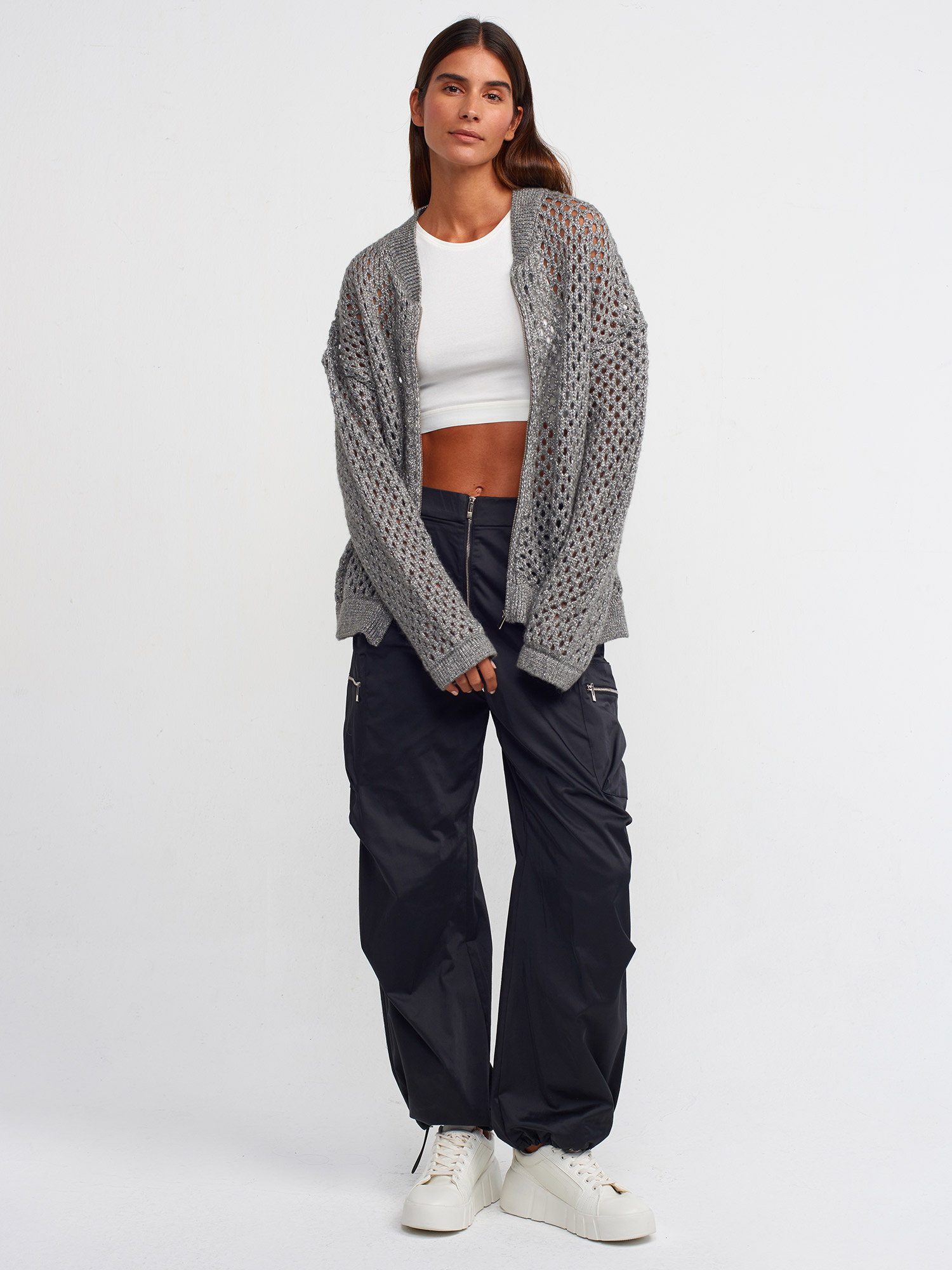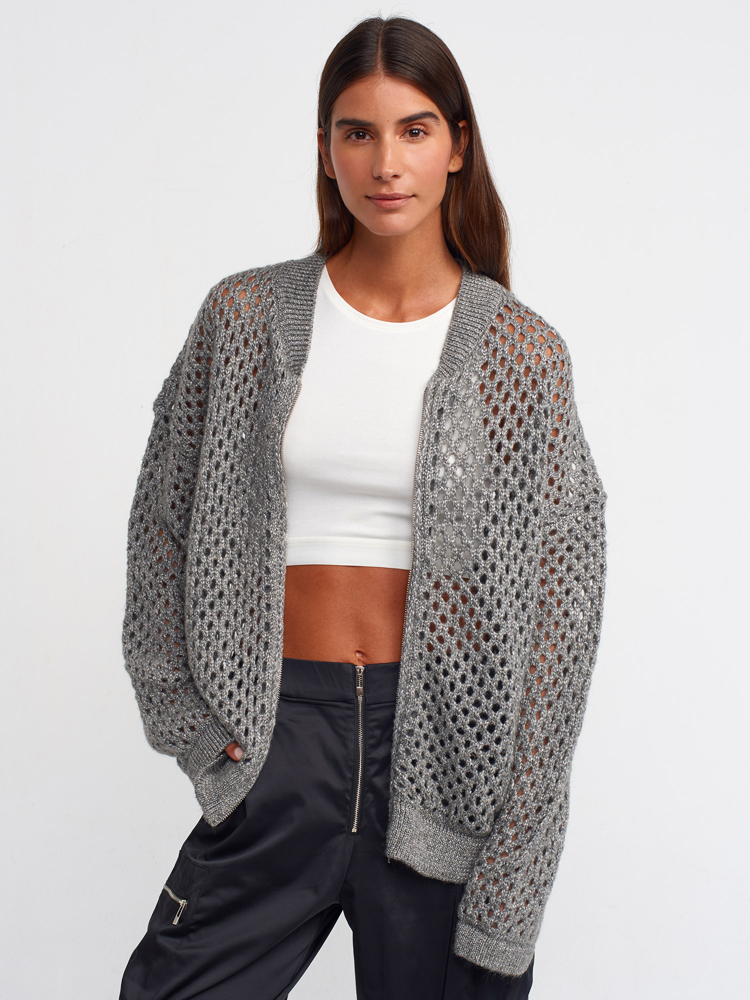 60193 Ajurlu Fermuarlı Triko Hırka-Gri-Gümüş