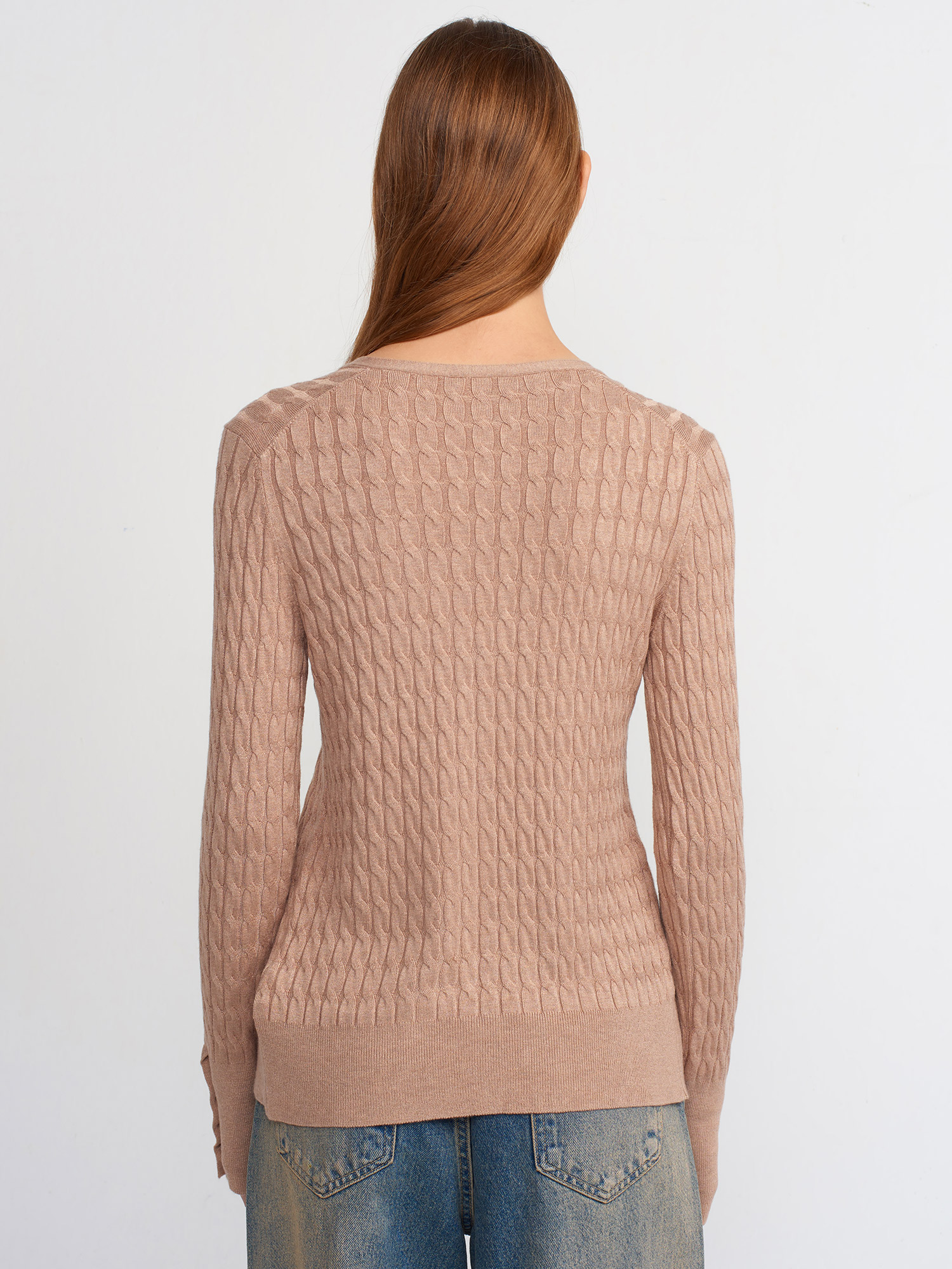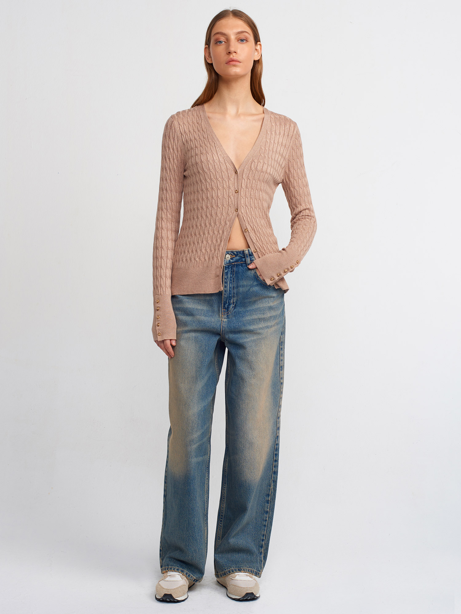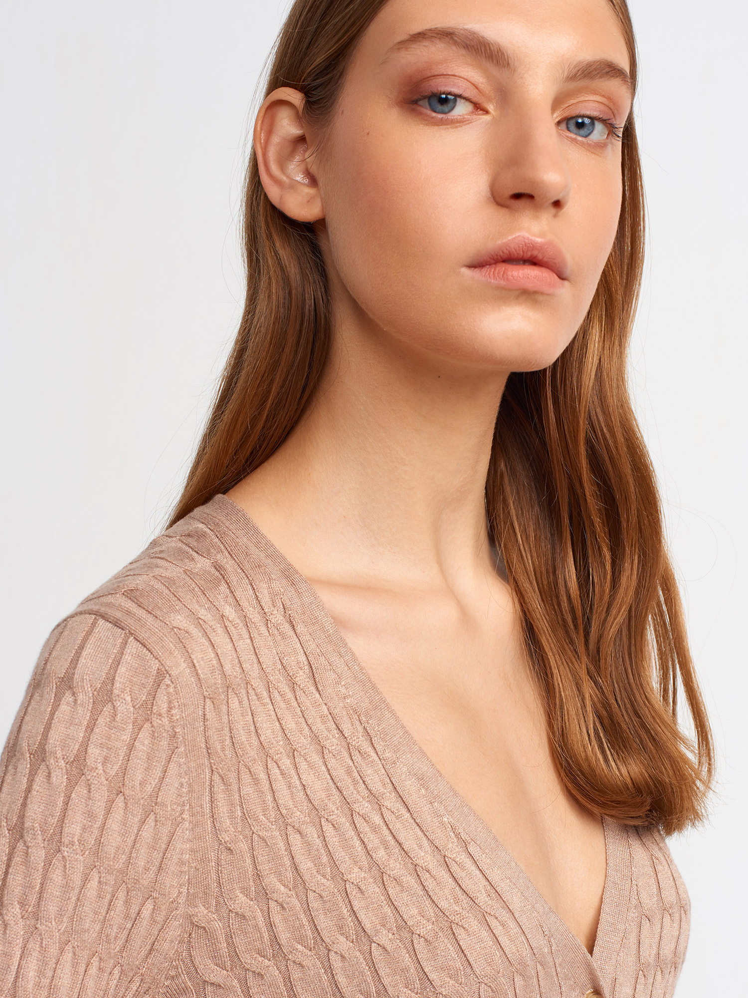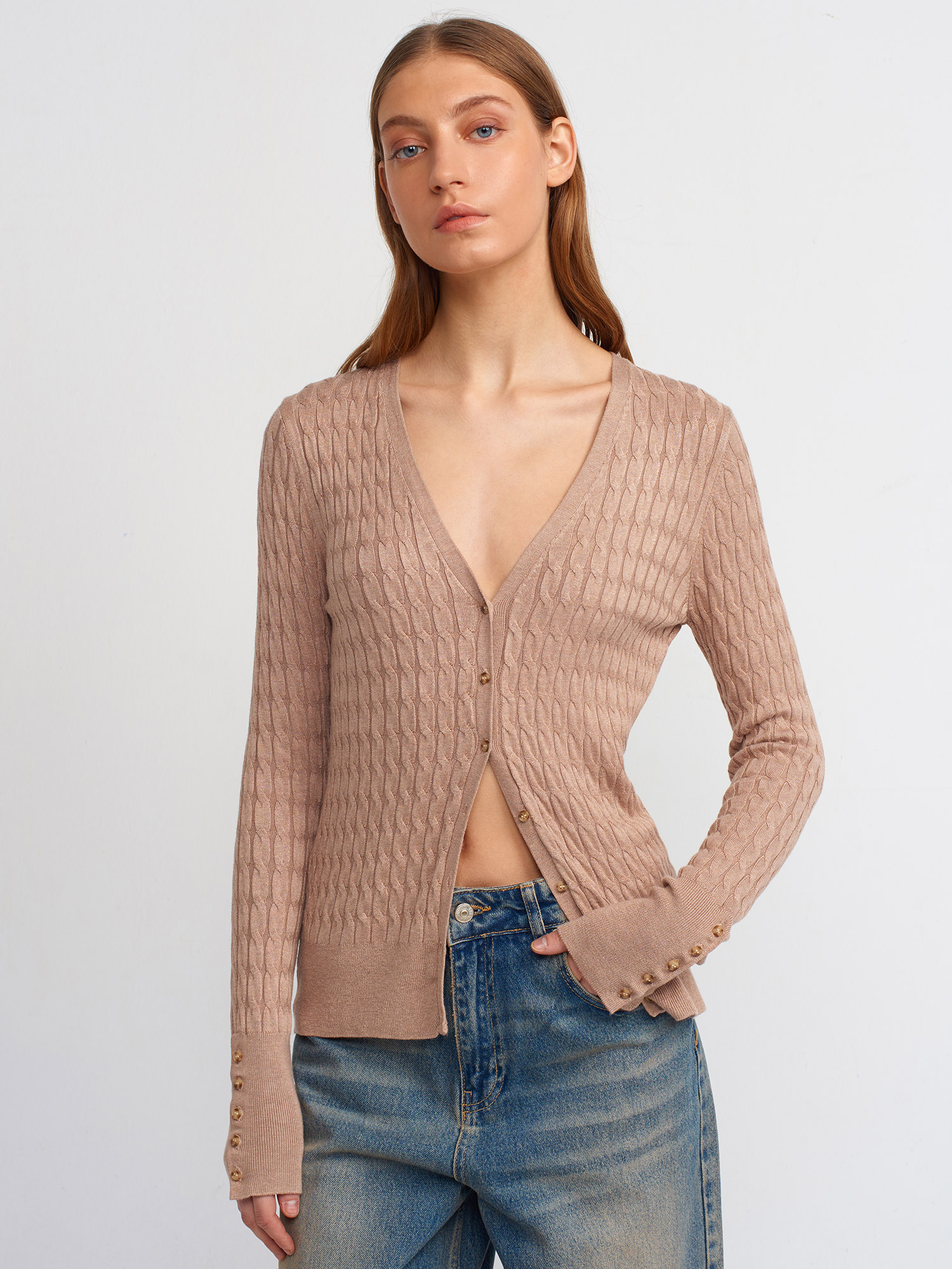 60199 Saç Örgülü Düğmeli Triko Hırka-Vizon M.