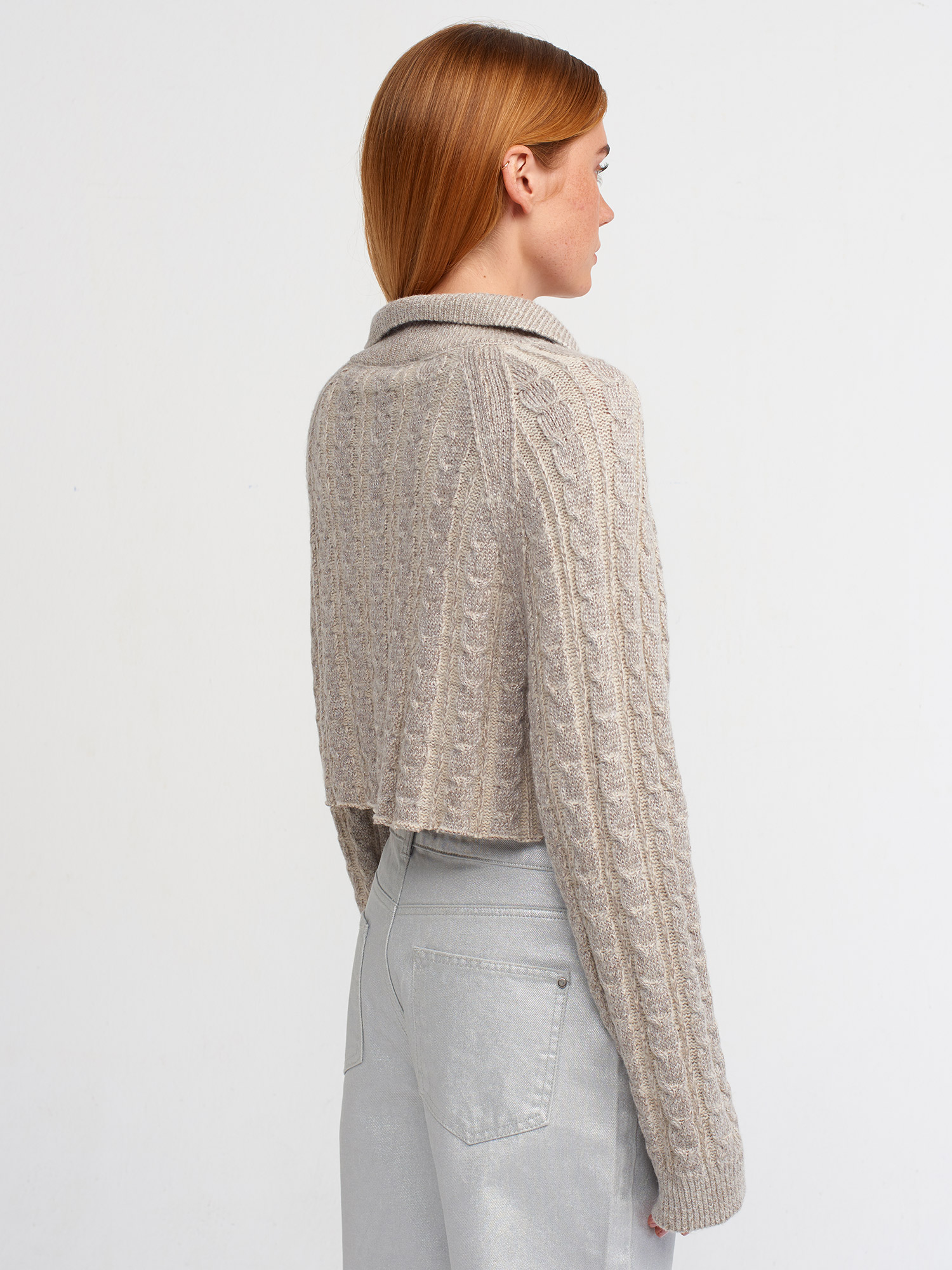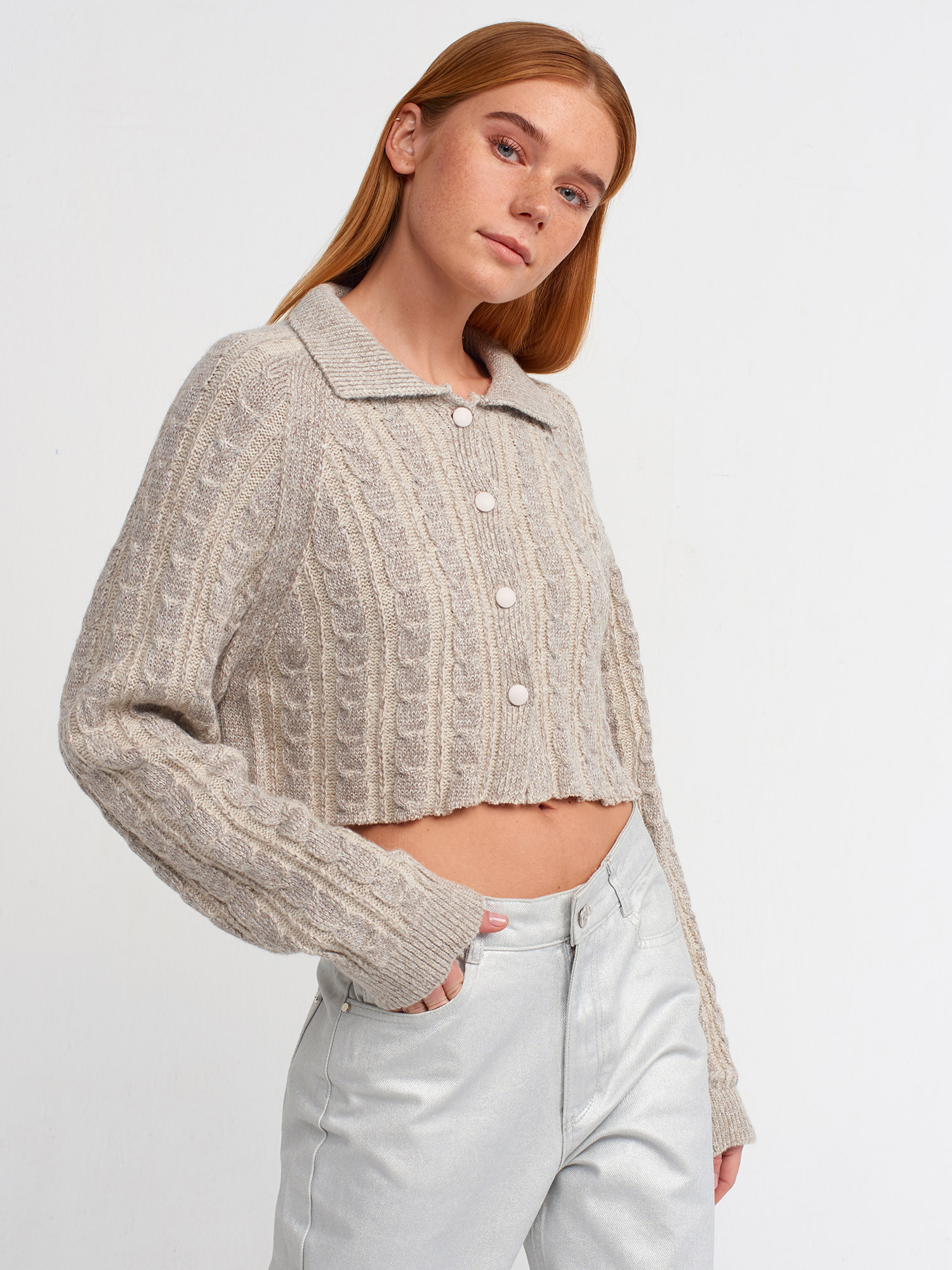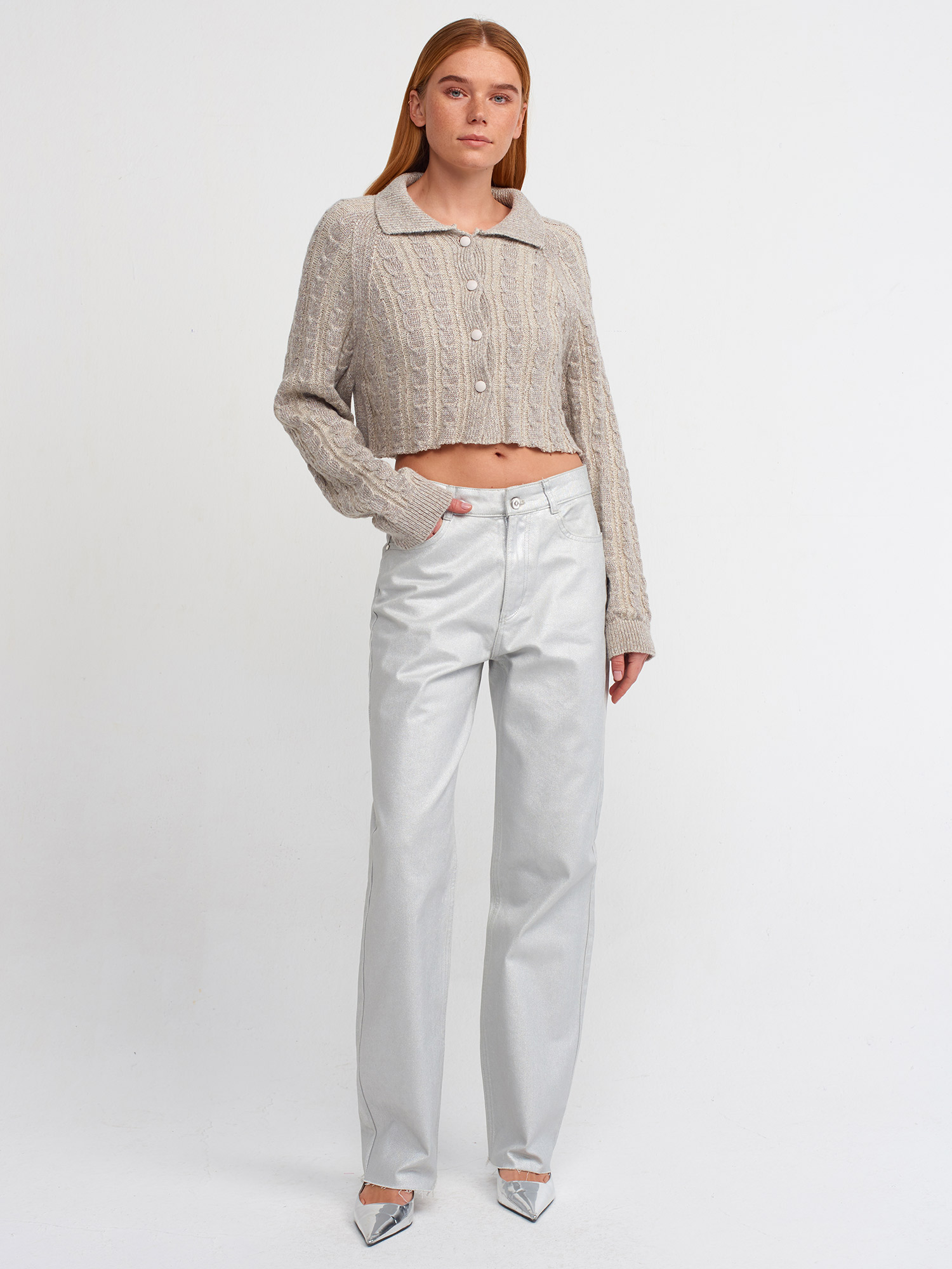60203 Polo Yaka Düğmeli Simli Crop Triko Hırka-Bej-Gümüş