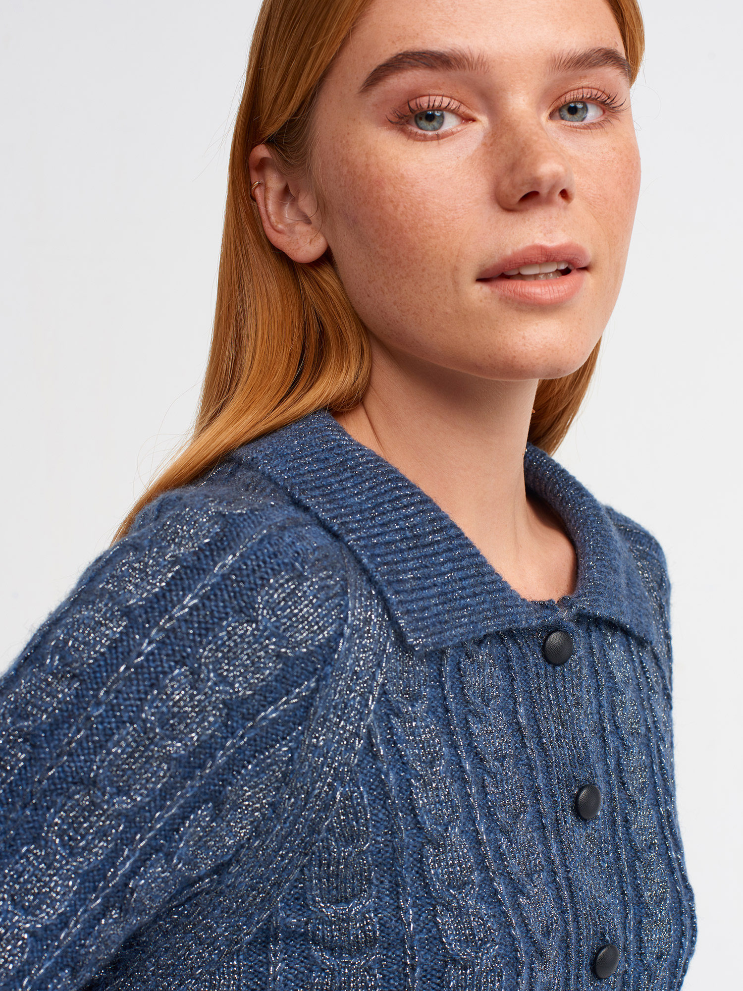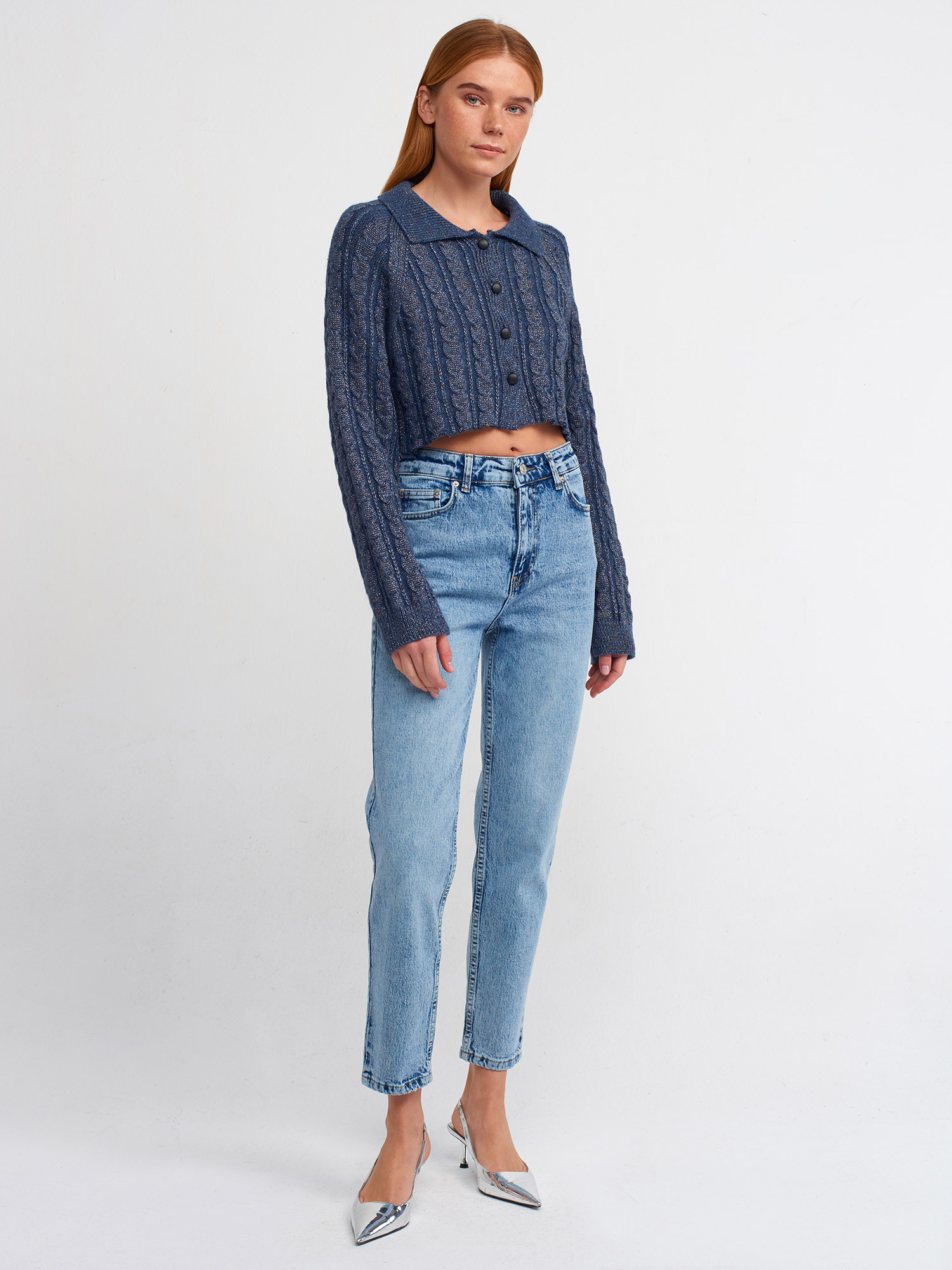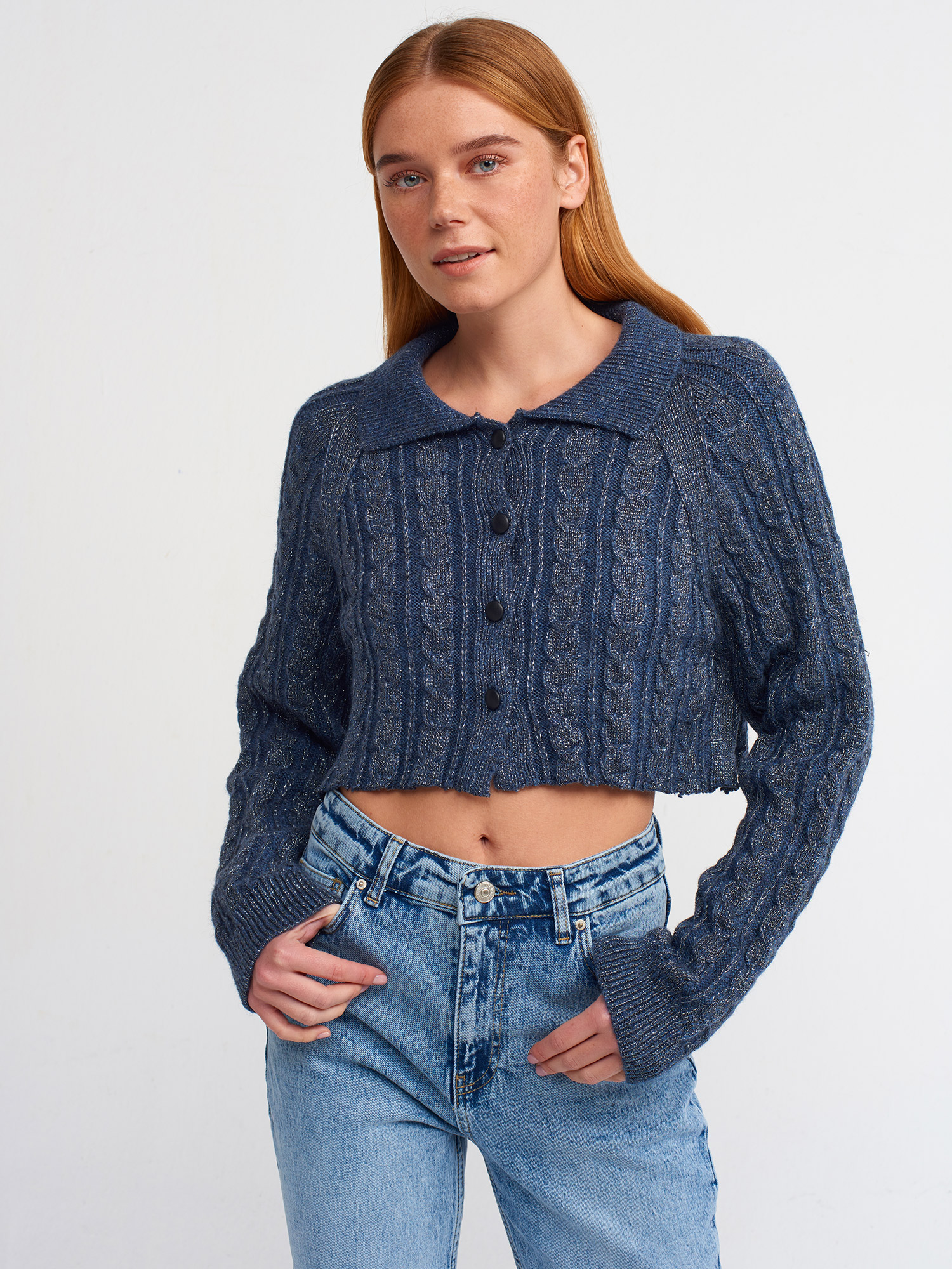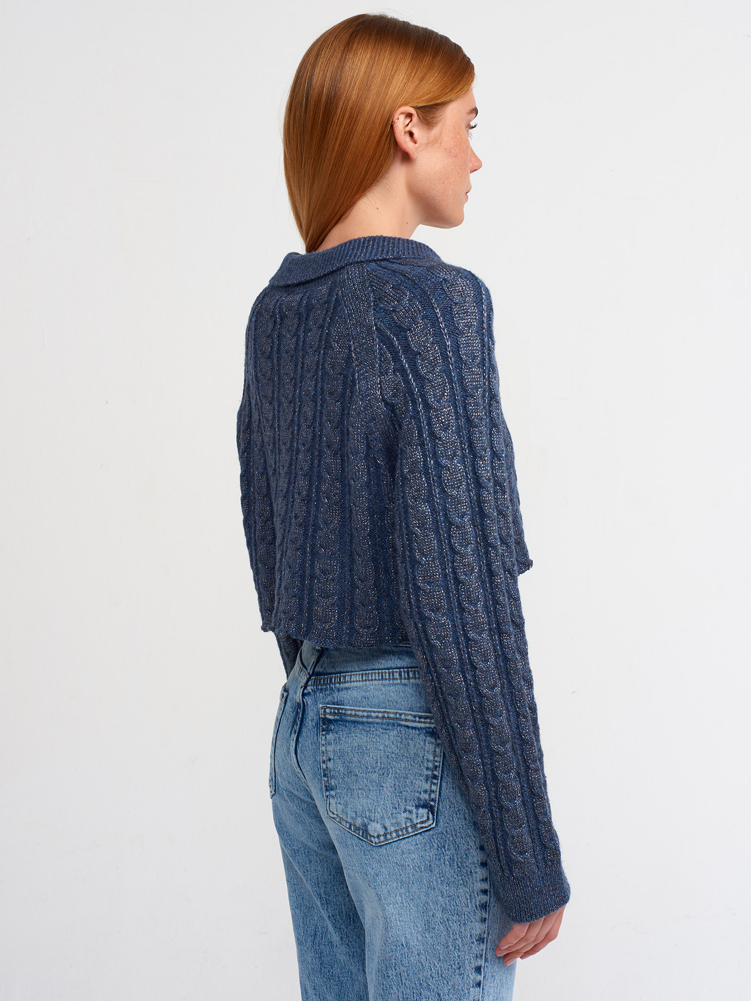 60203 Polo Yaka Düğmeli Simli Crop Triko Hırka-İndigo-S.