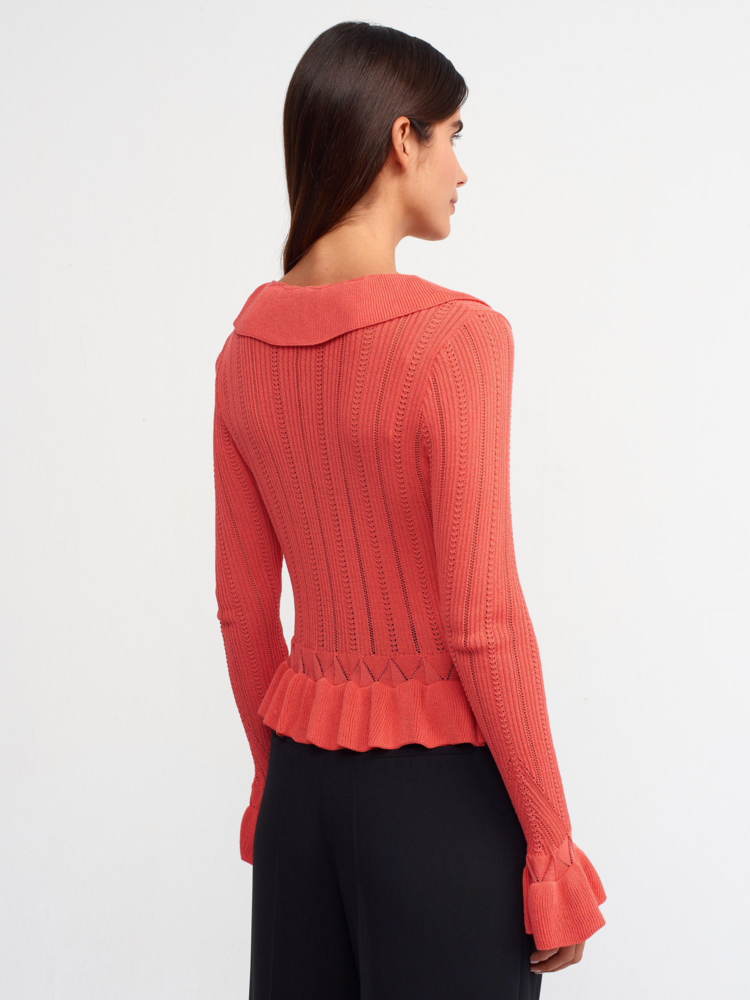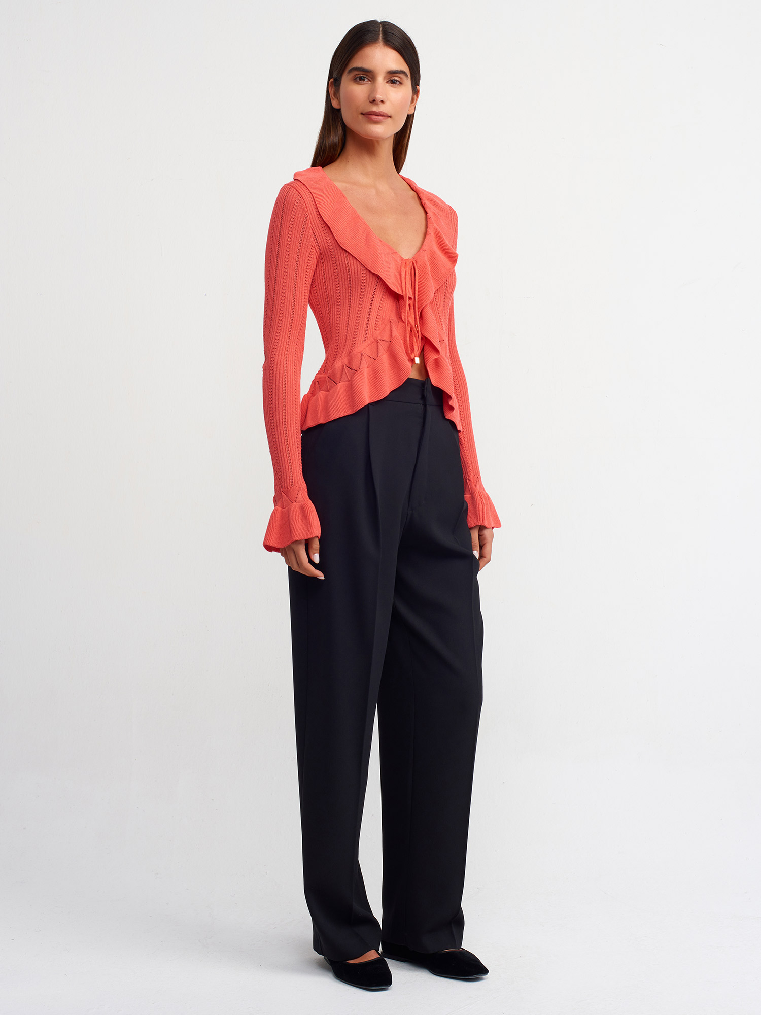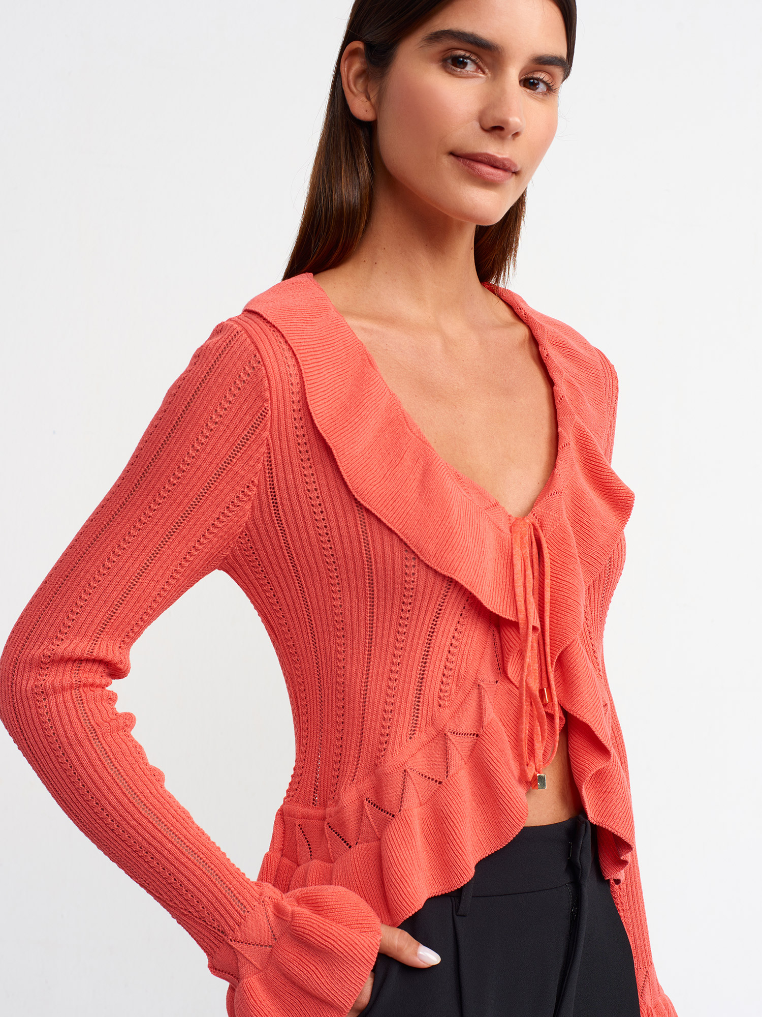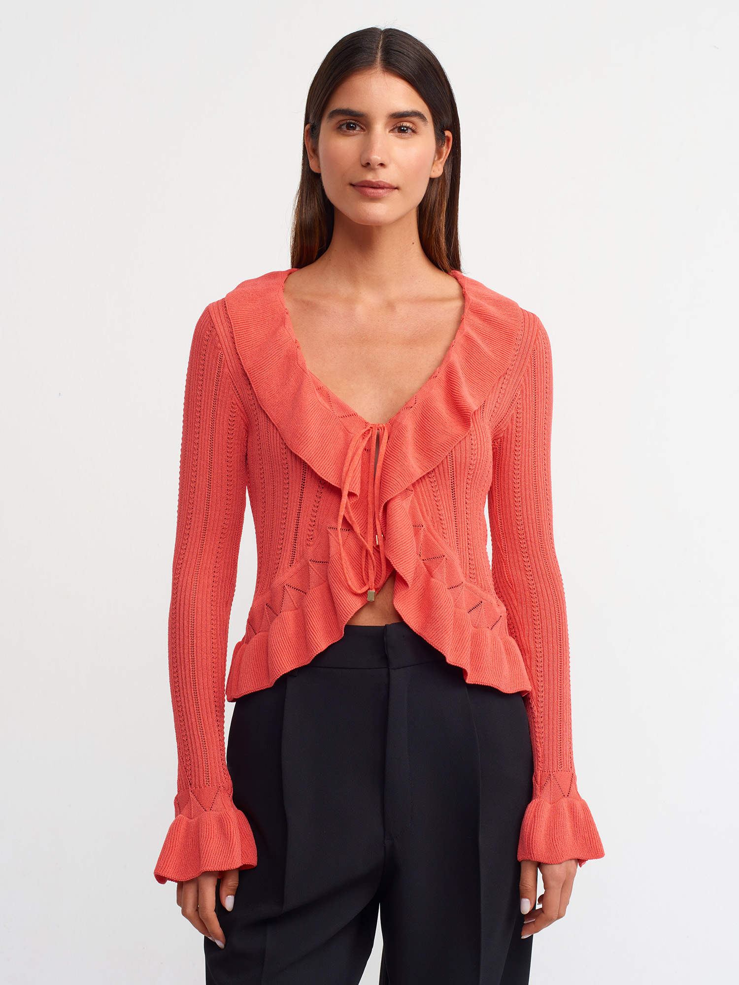 60220 Fırfırlı Bağcıklı Triko Hırka-Kırmızı