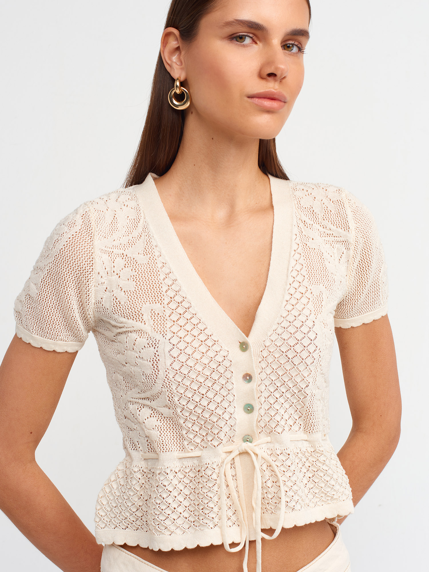 60221 V Yaka Ajurlu Düğmeli Triko Hırka-Ekru