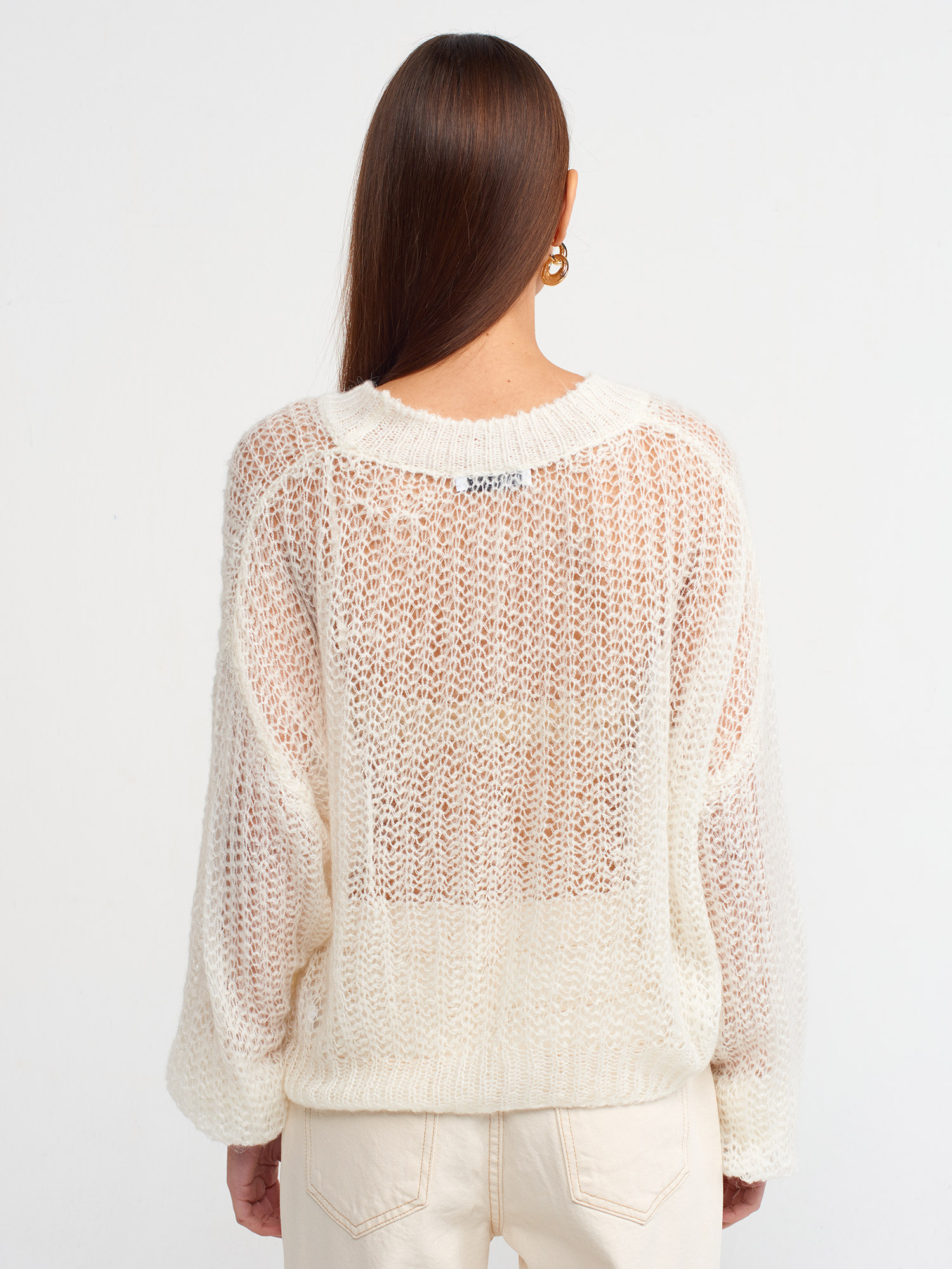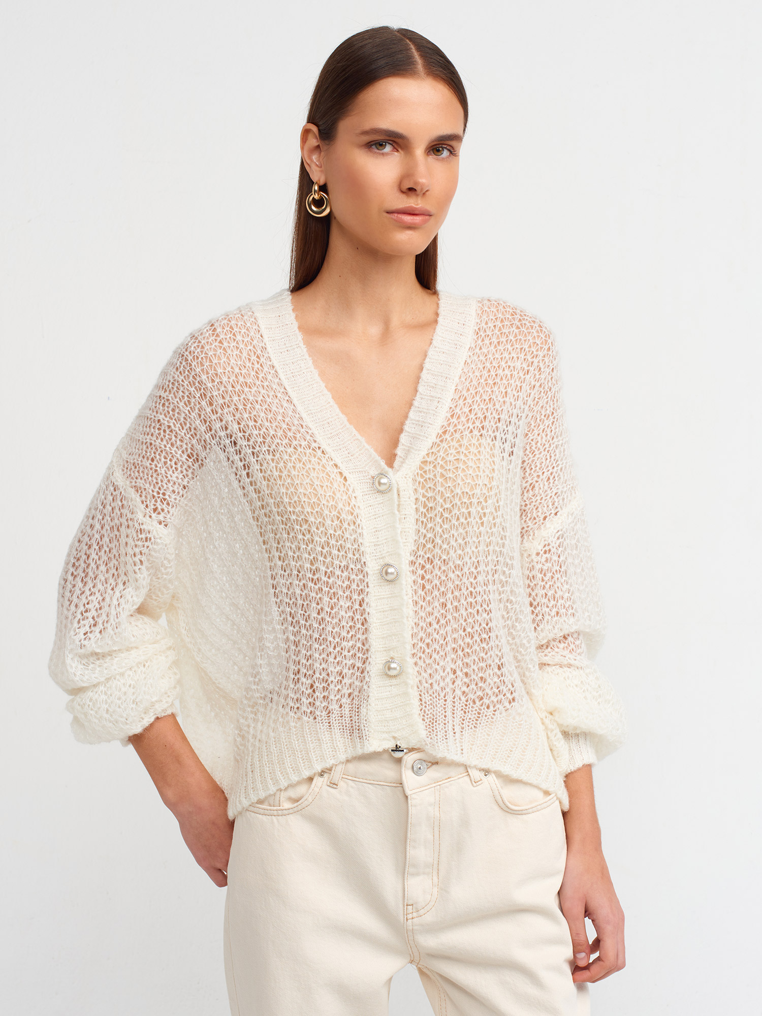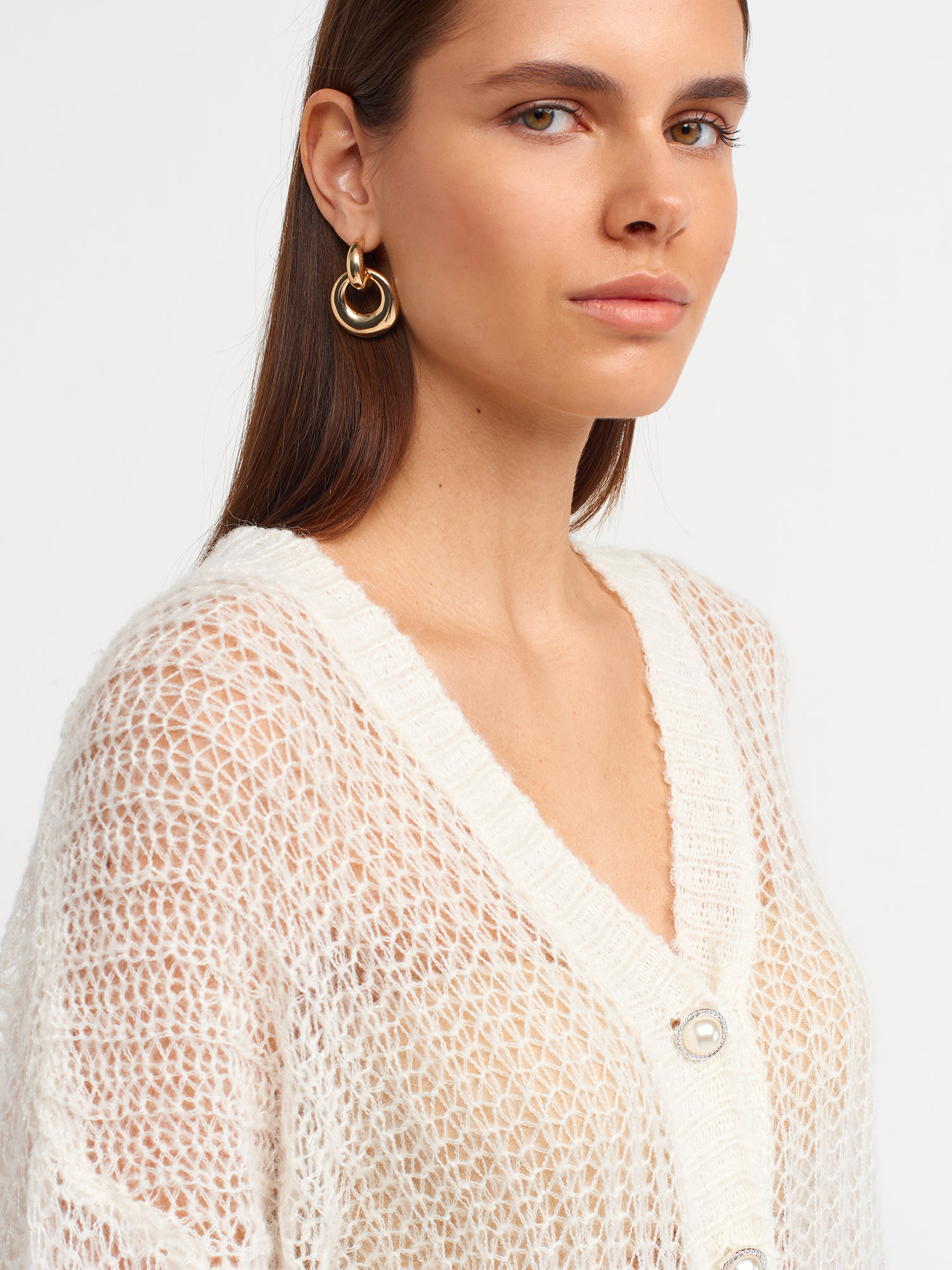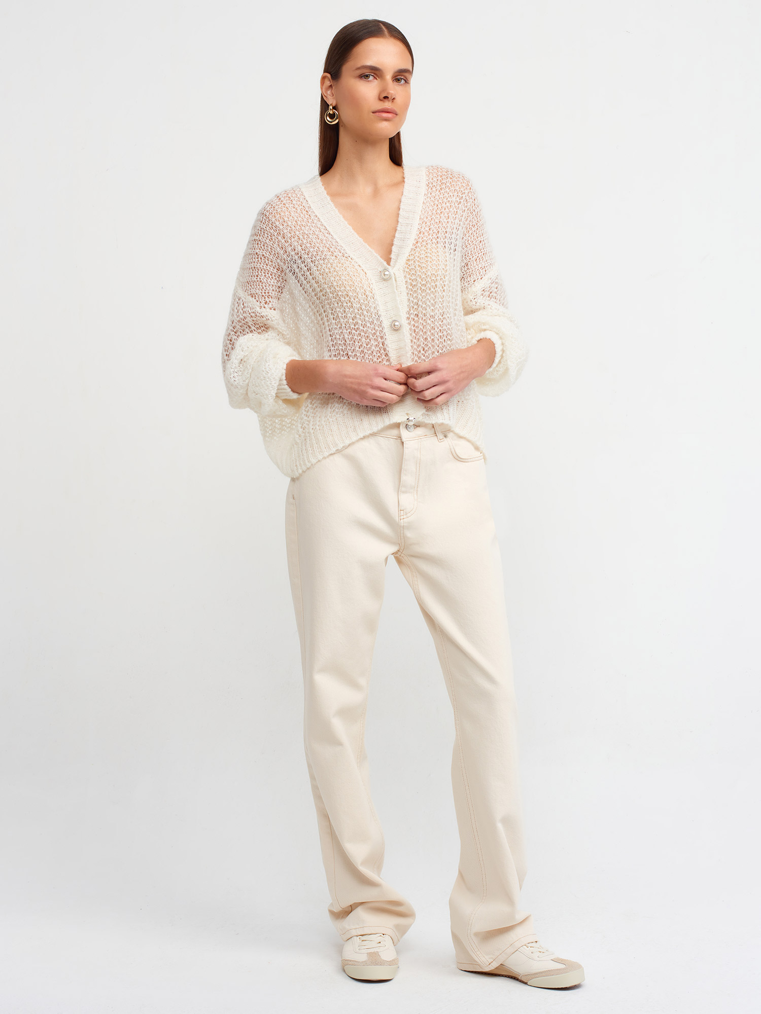 60223 V Yaka Ajurlu Düğmeli Triko Hırka-Ekru