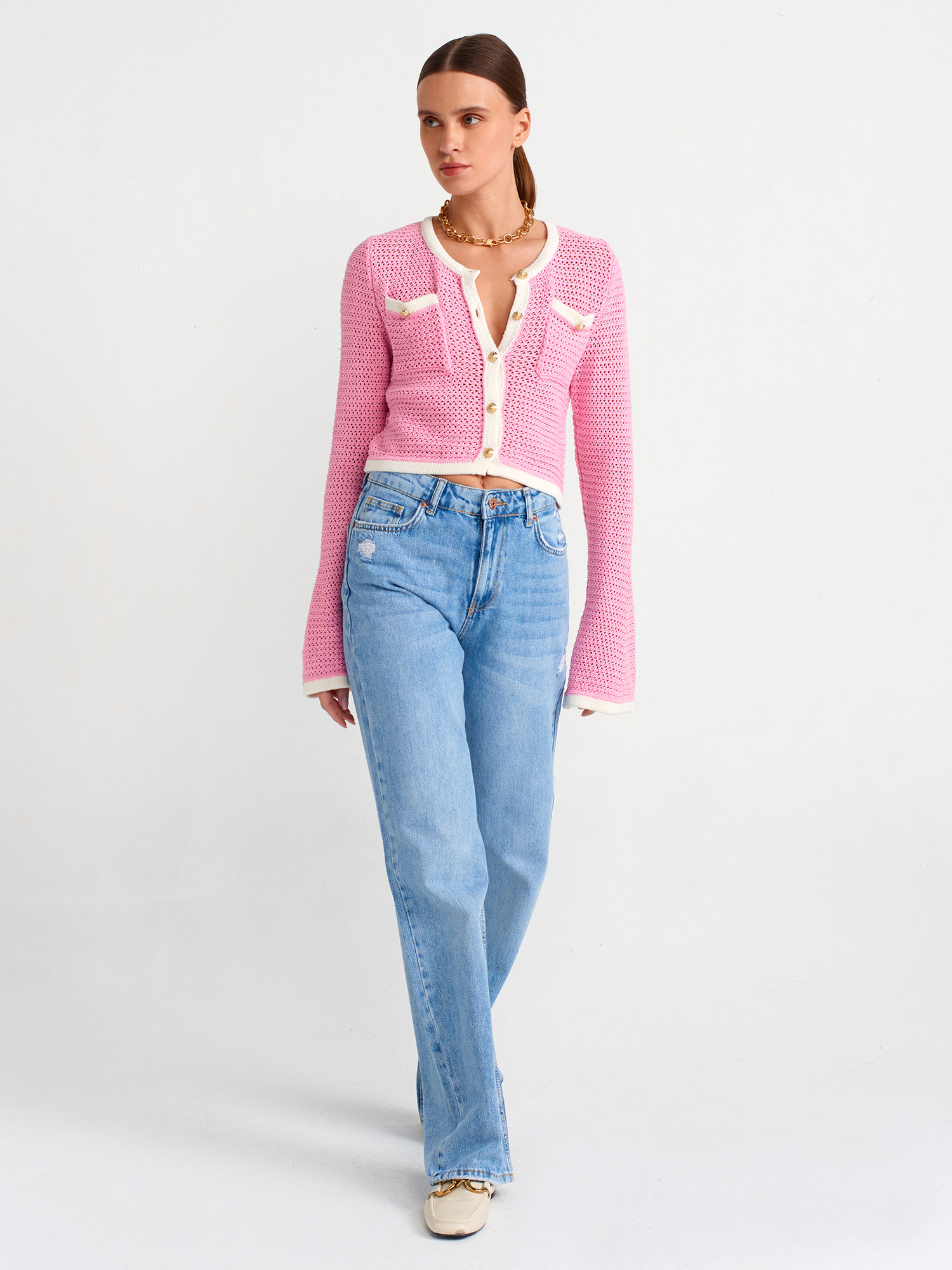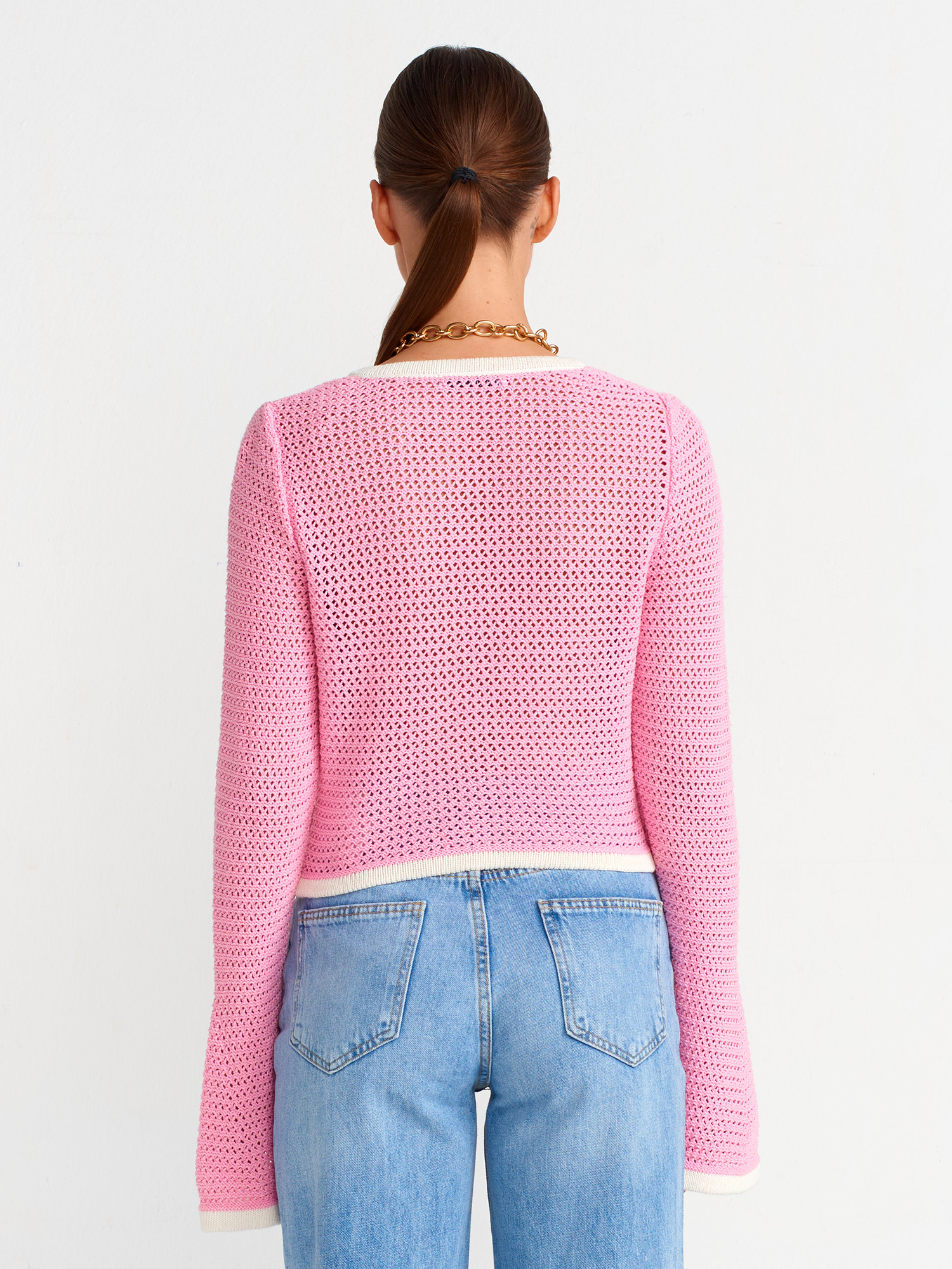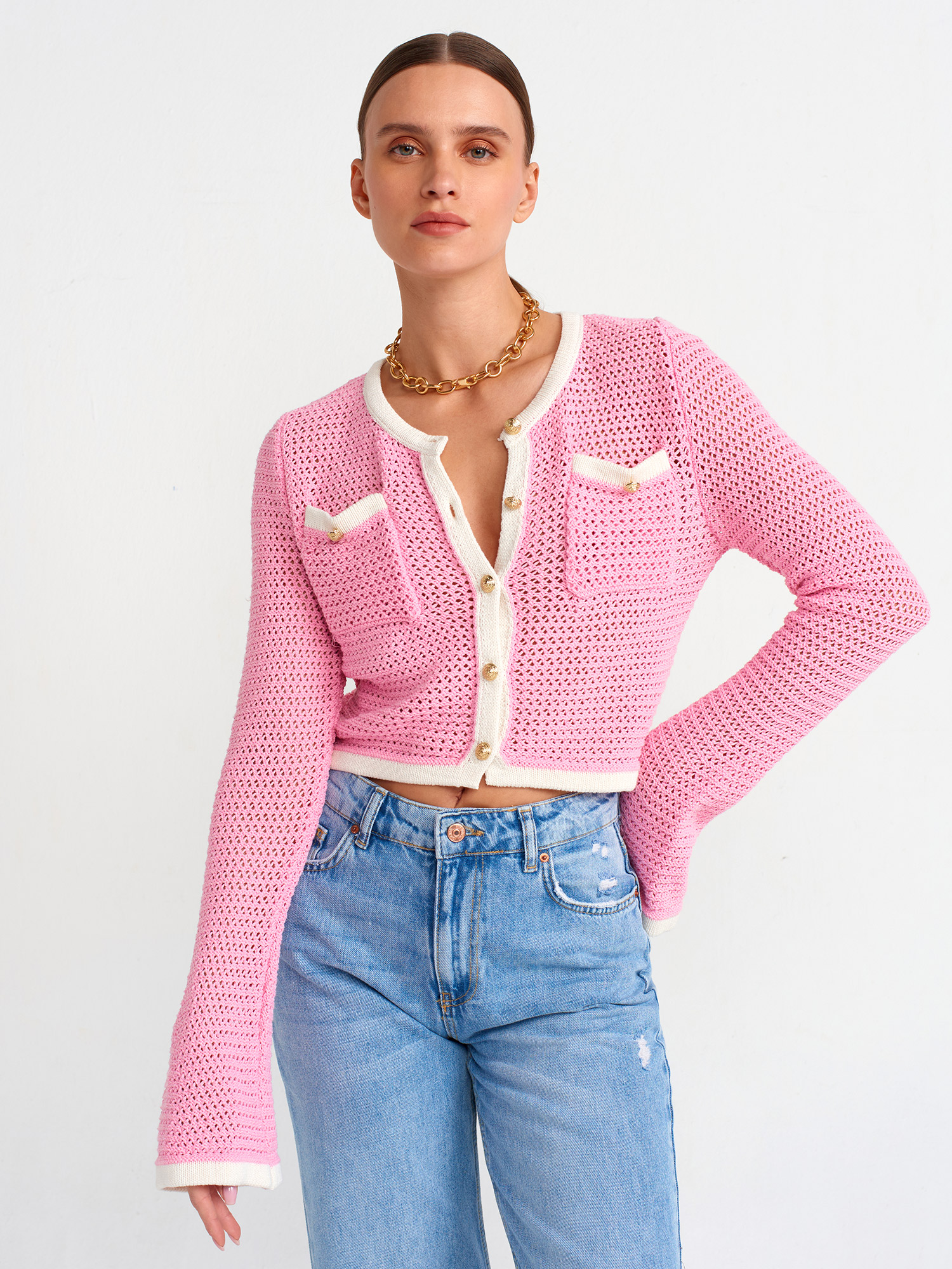 60225 Bisiklet Yaka Cepli Triko Hırka-Pembe-Ekru