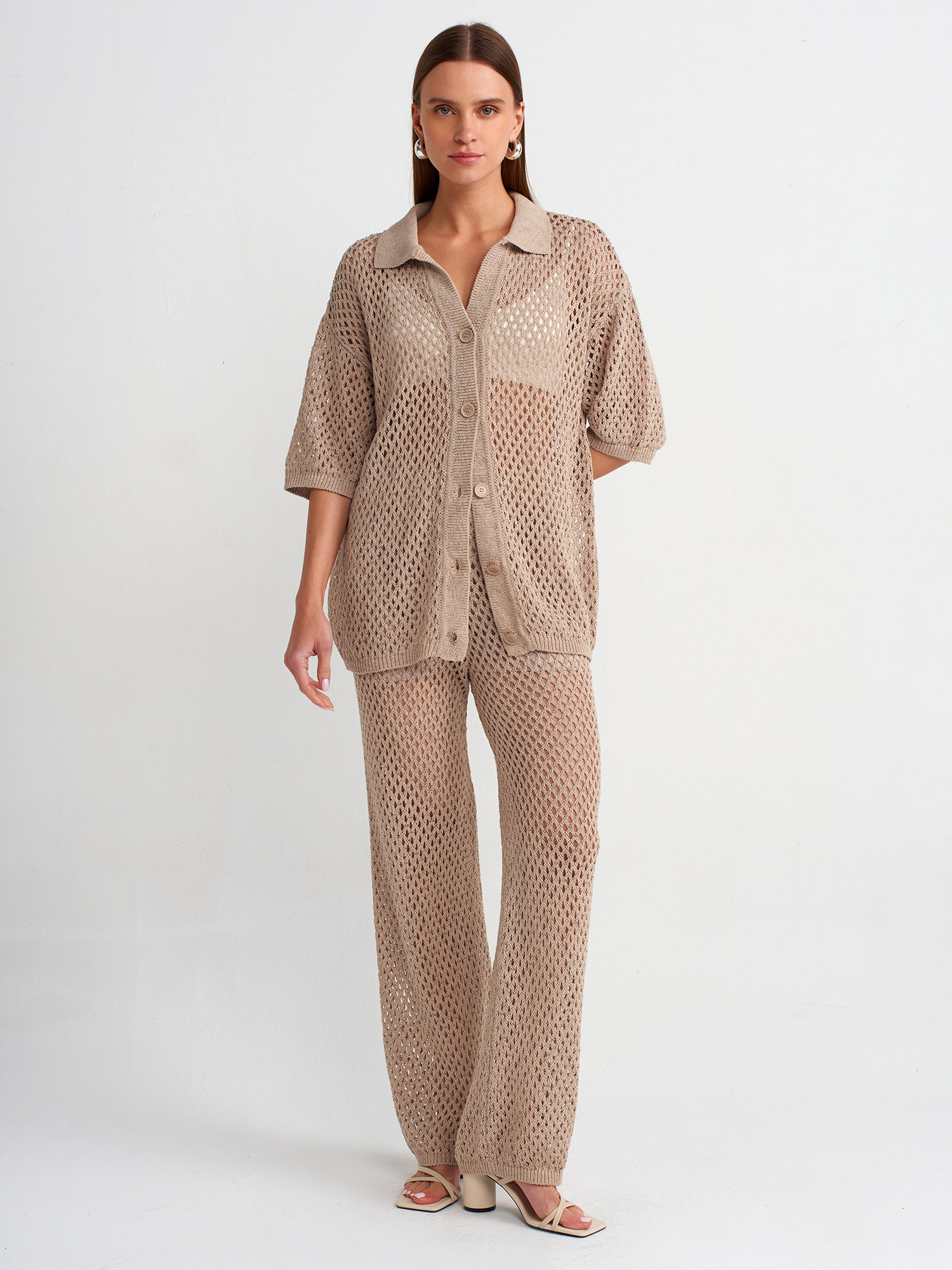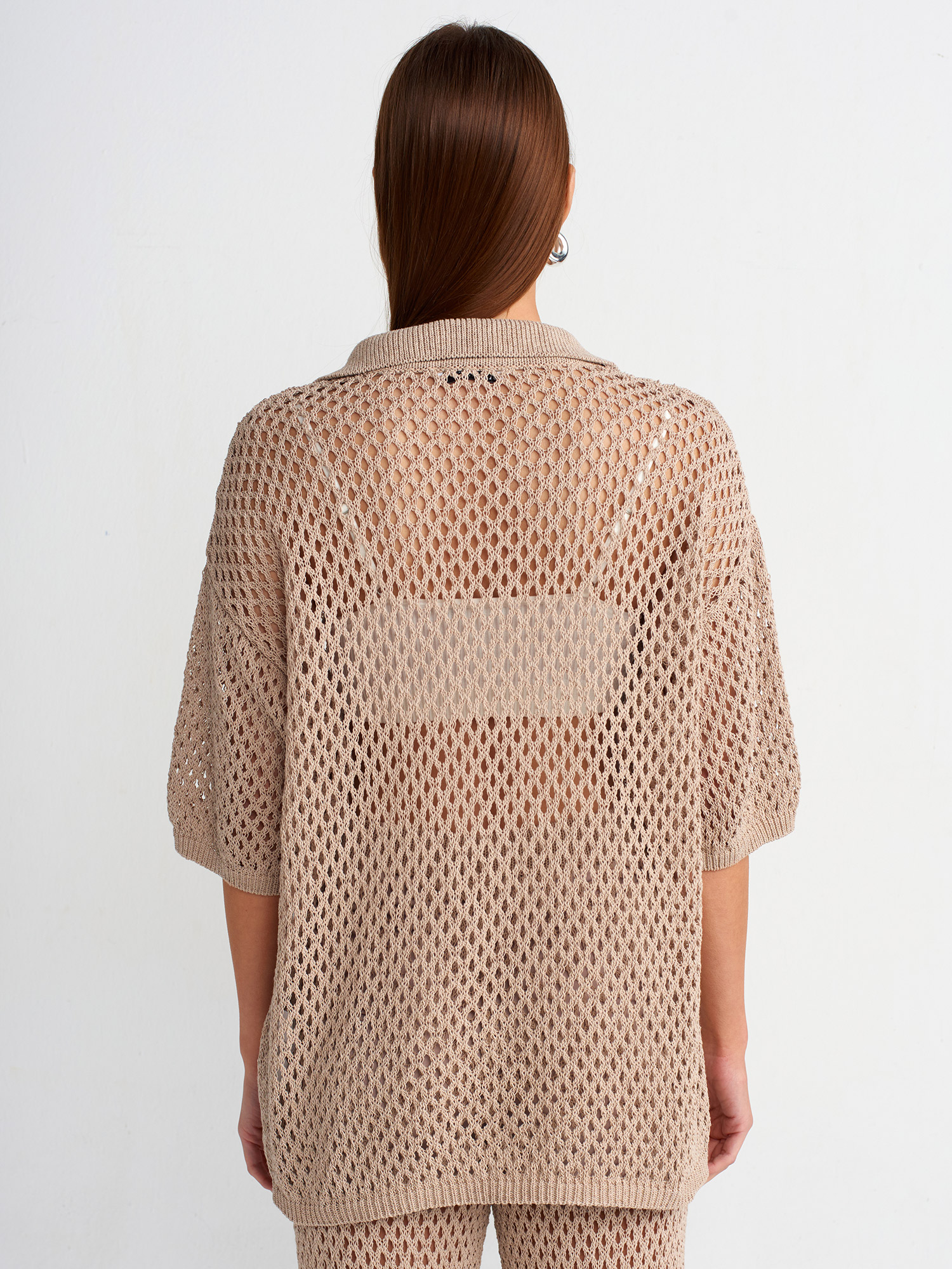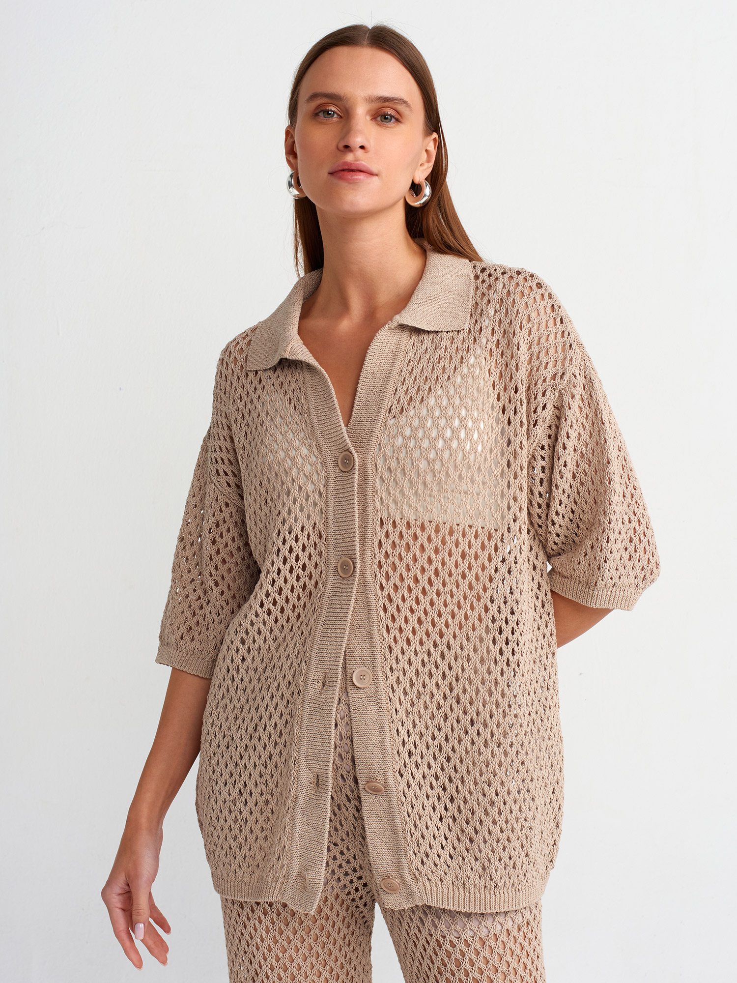 60231 Polo Yaka Ajurlu Triko Hırka-Bej
