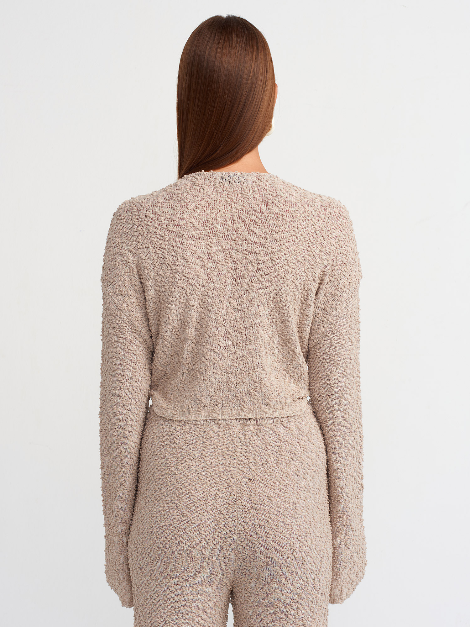 60235 V Yaka Önden Bağlamalı Triko Hırka-Bej