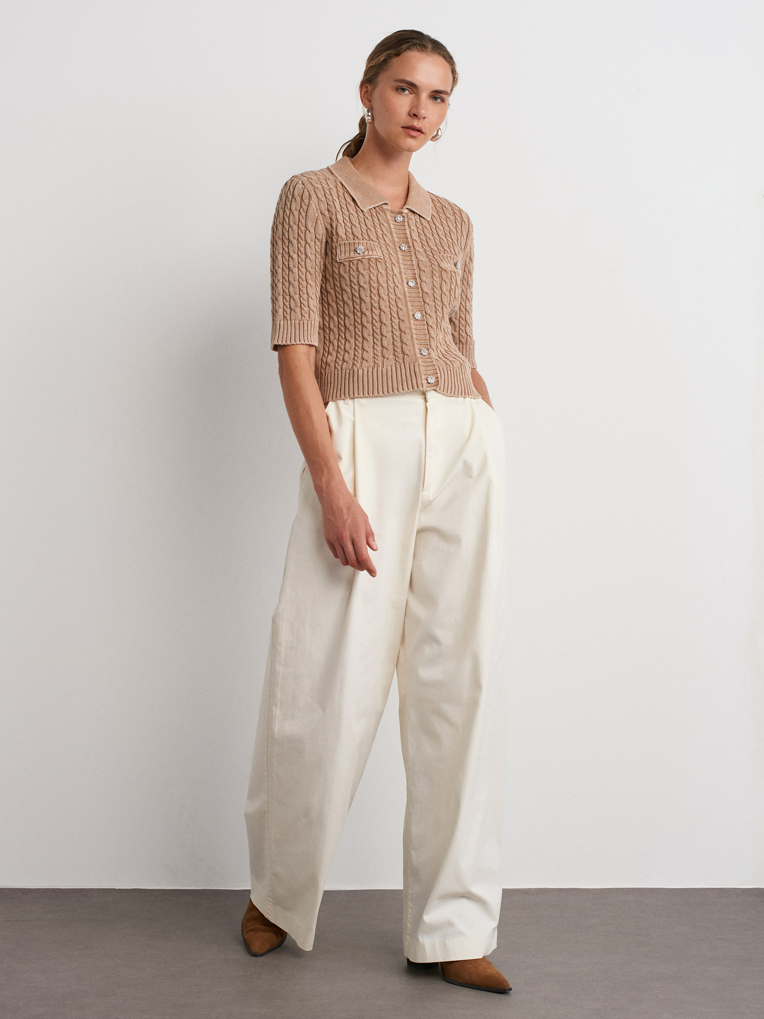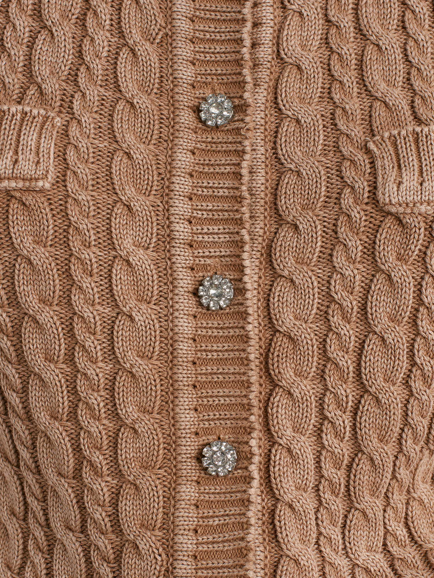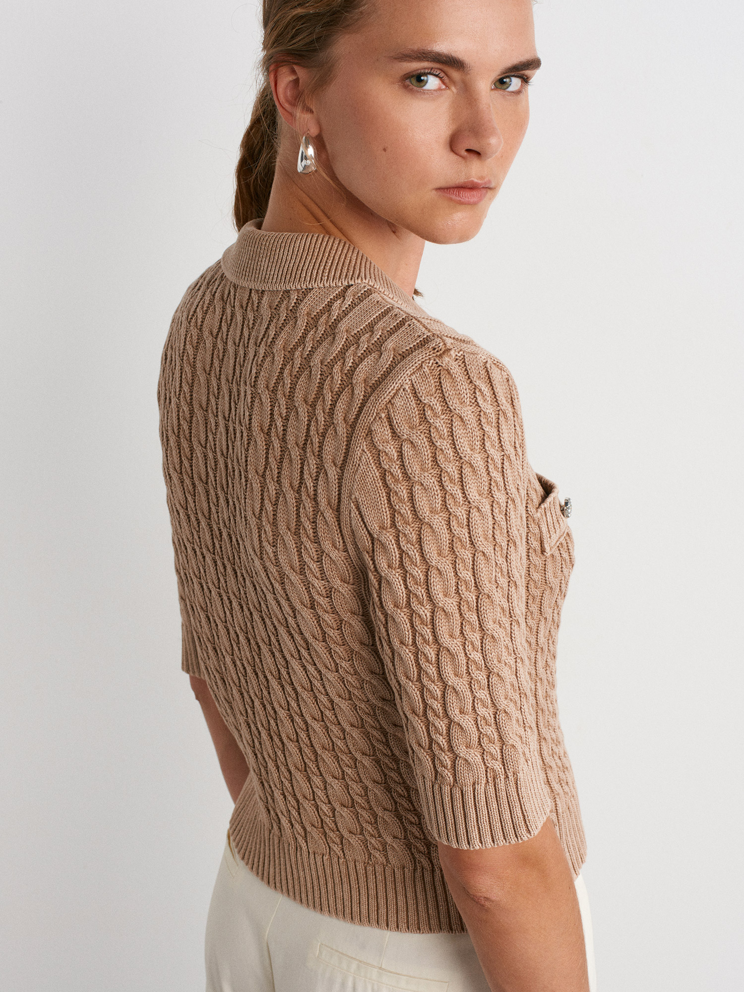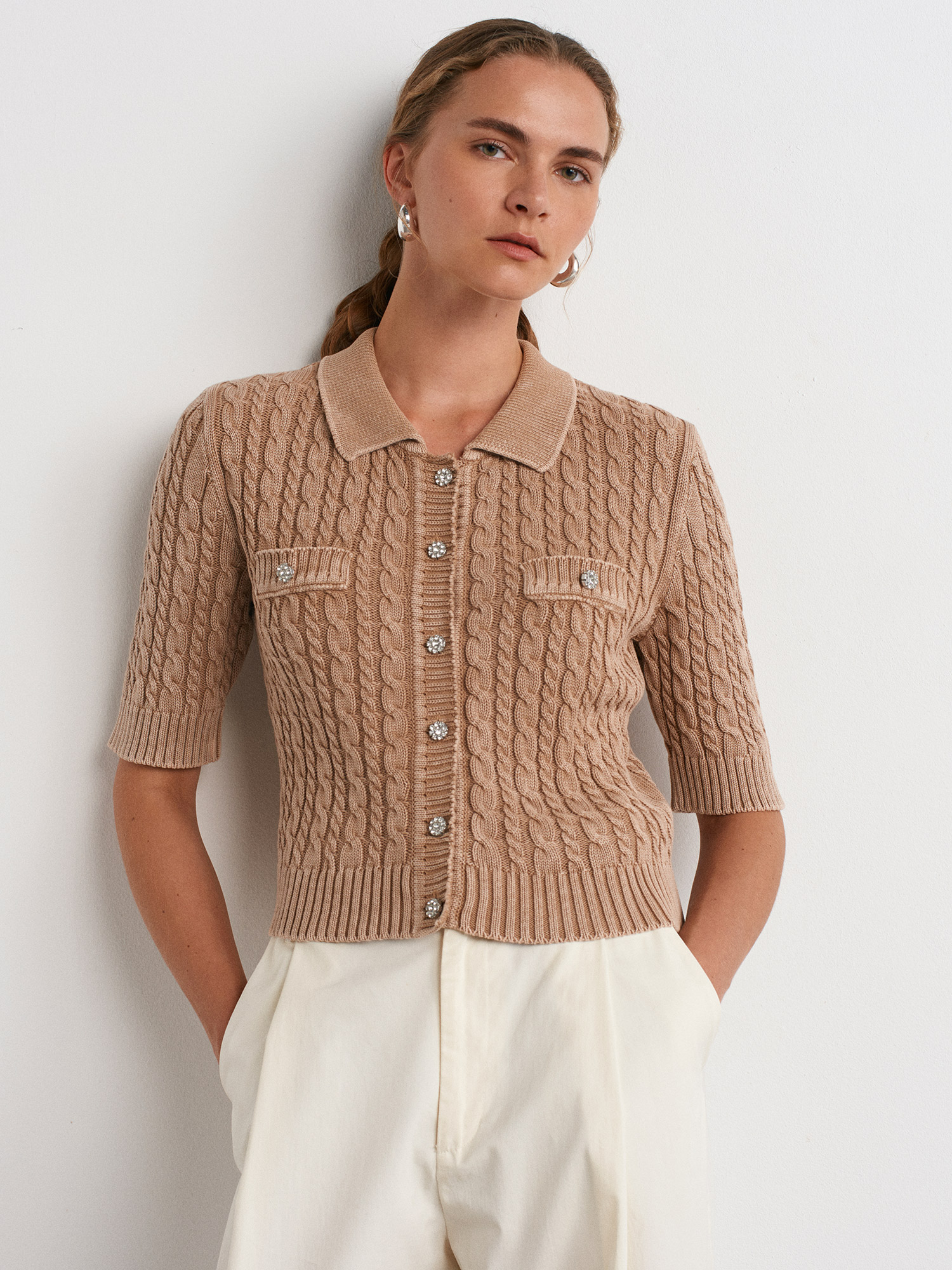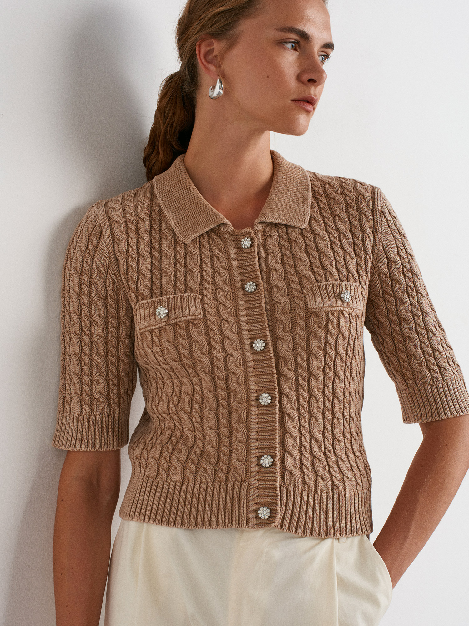 60244 Polo Yaka Taş Düğmeli Soluk Efektli Triko Hırka-Vizon