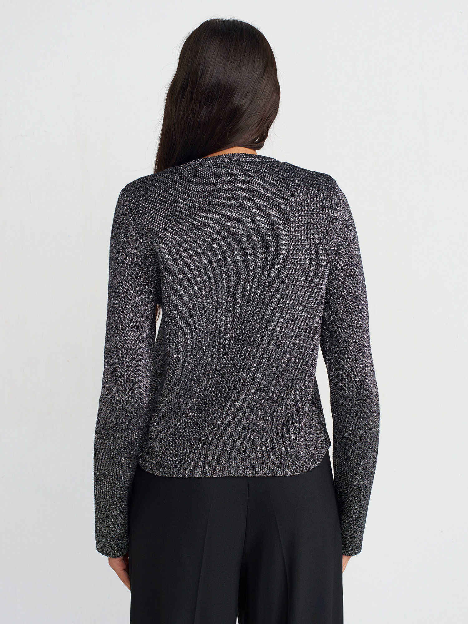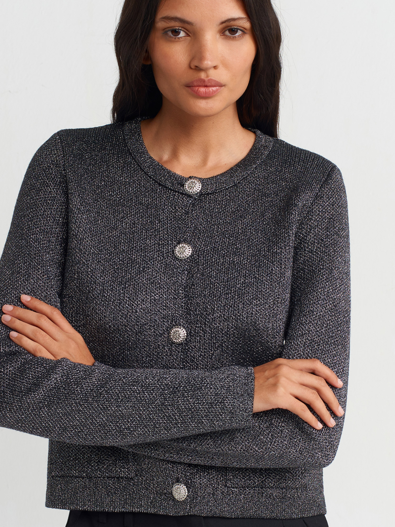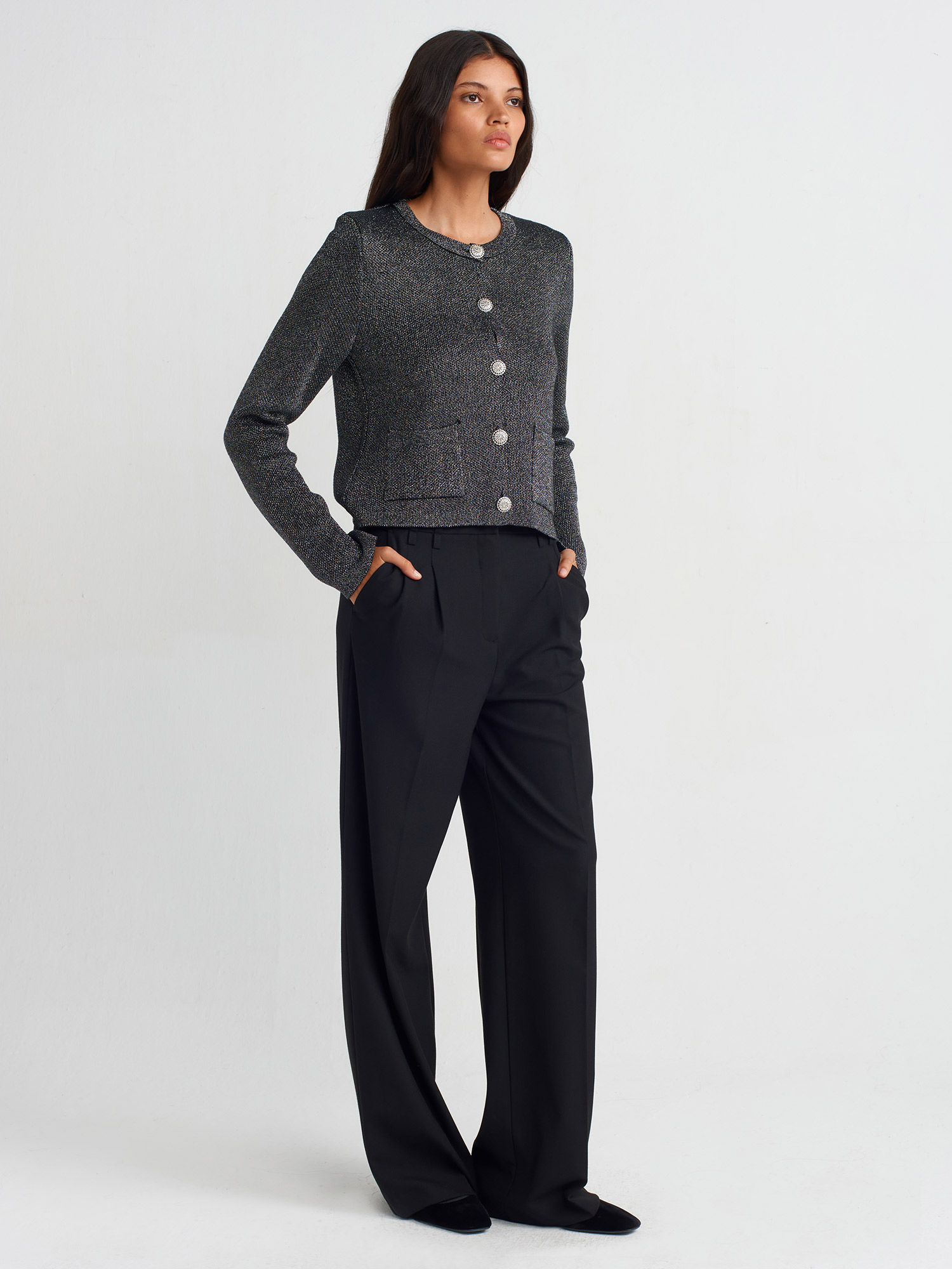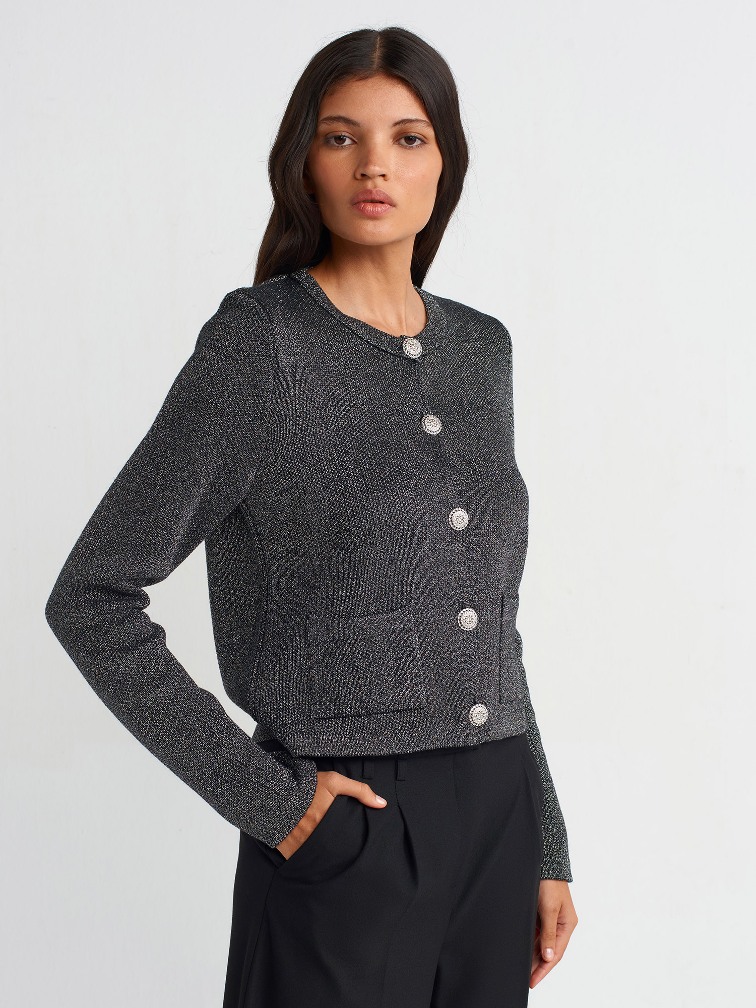 60245 Bisiklet Yaka Parlak Taş Düğmeli Cepli Triko Hırka-Siyah-G.
