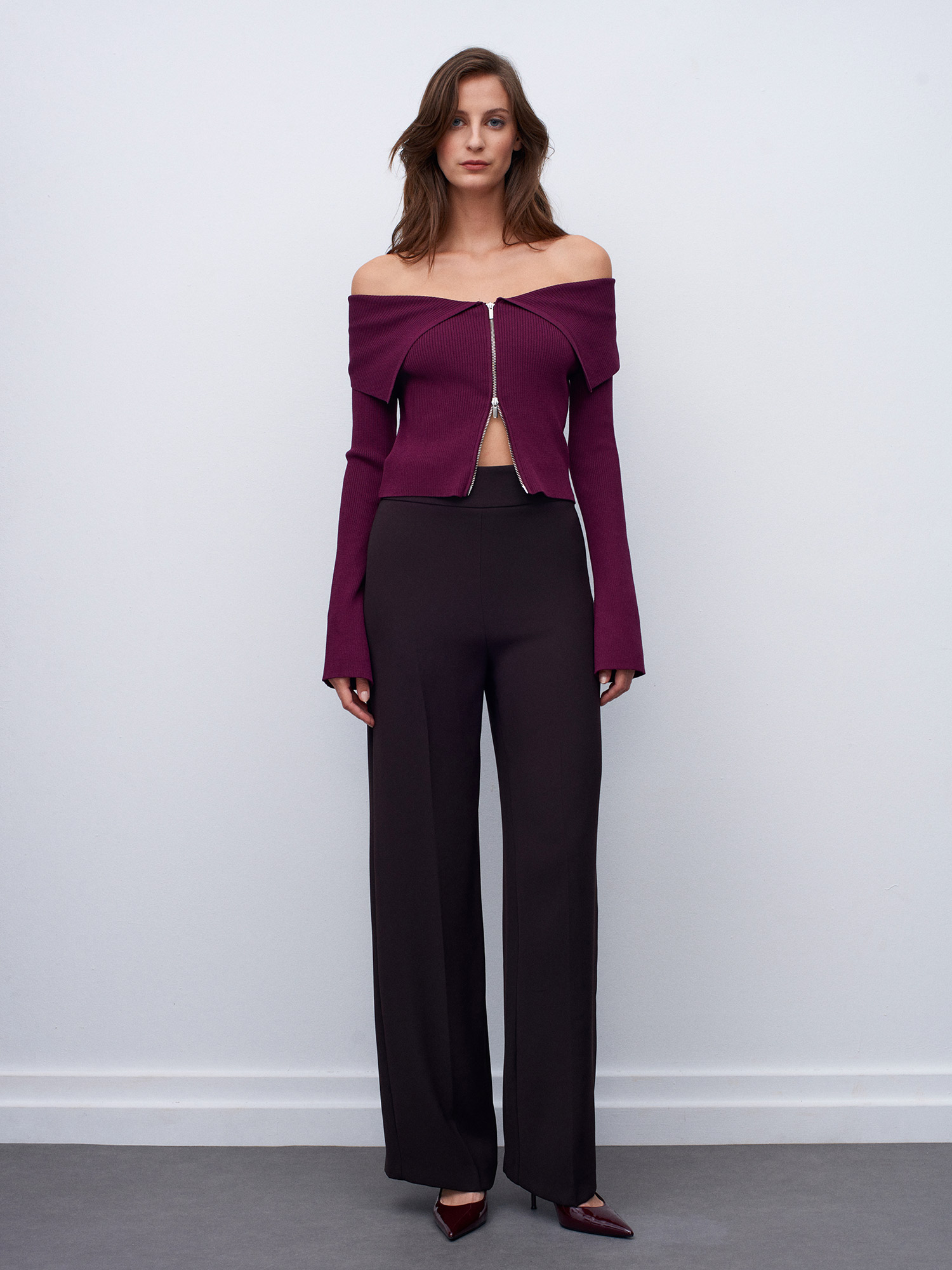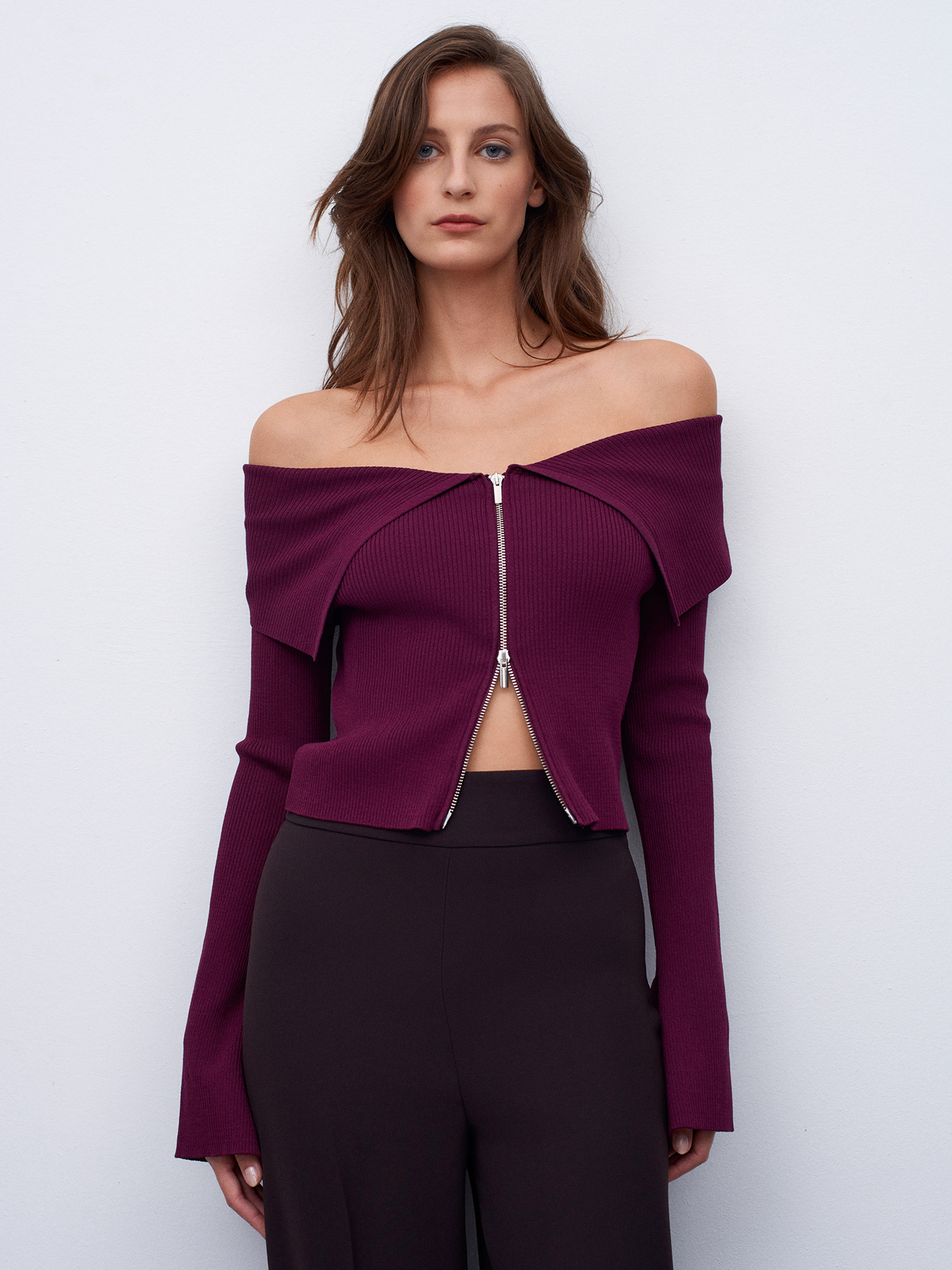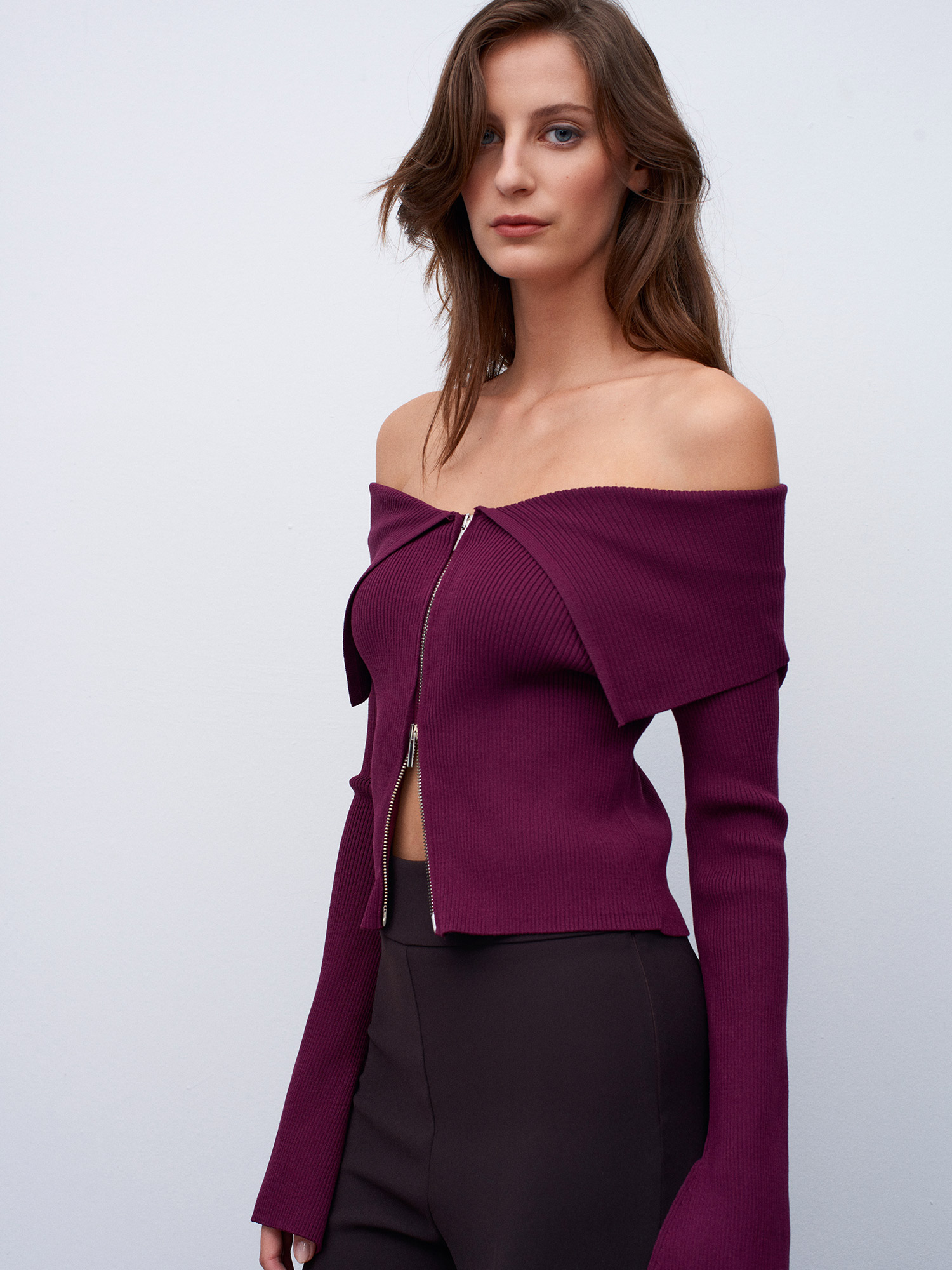 60252 Fermuarlı Fitilli Triko Top-Bordo