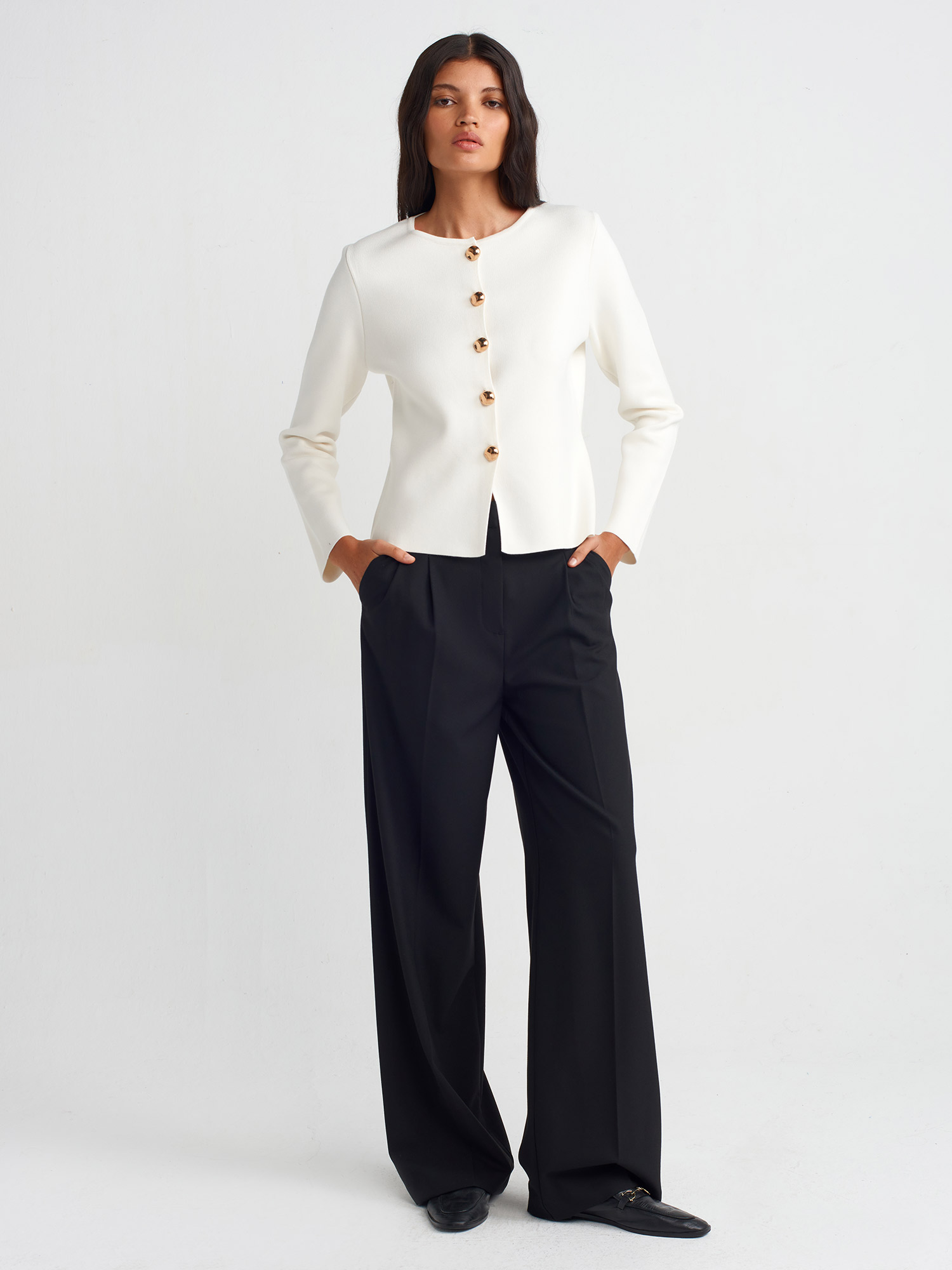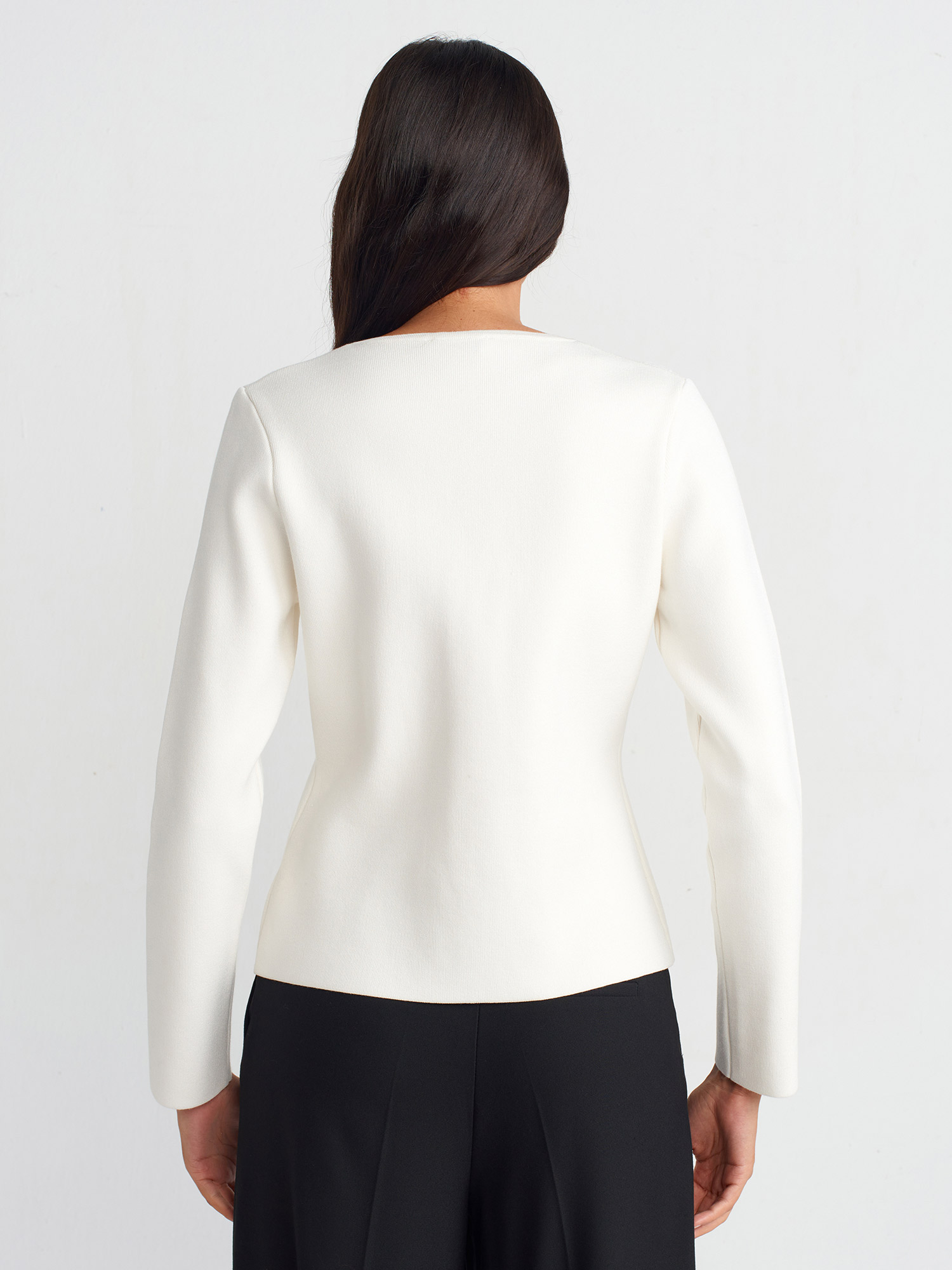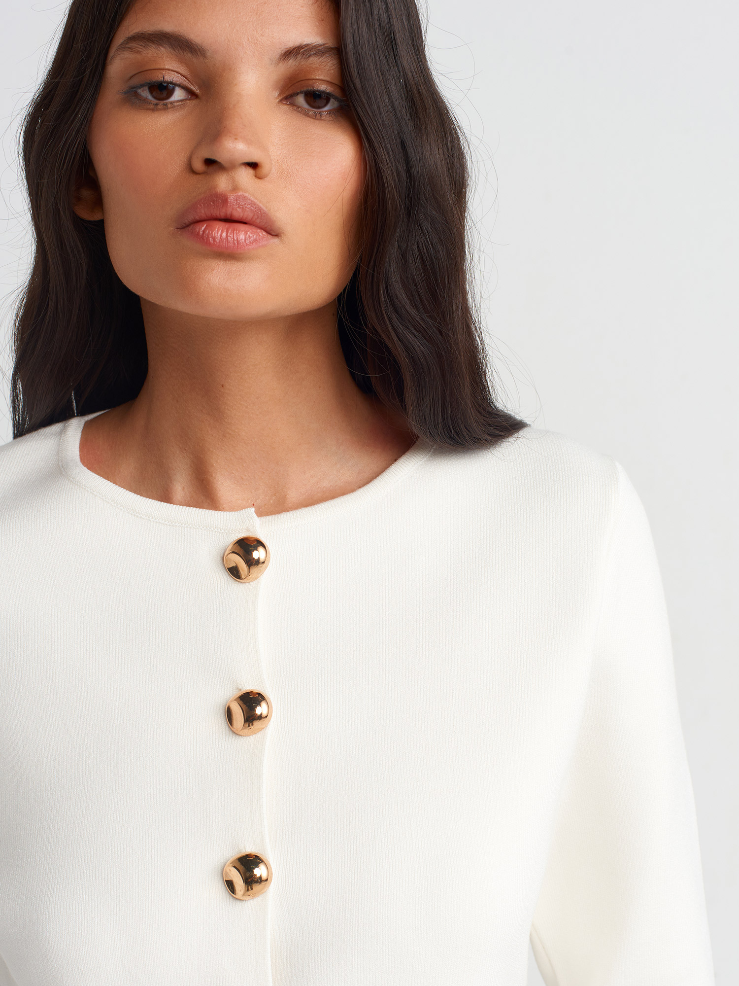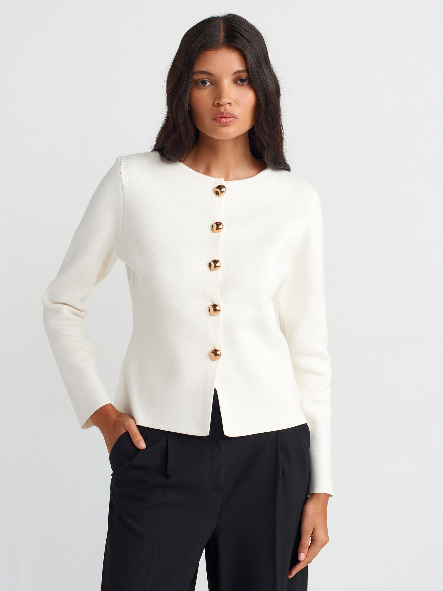 60255 Bisiklet Yaka Düğmeli Triko Hırka-Ekru