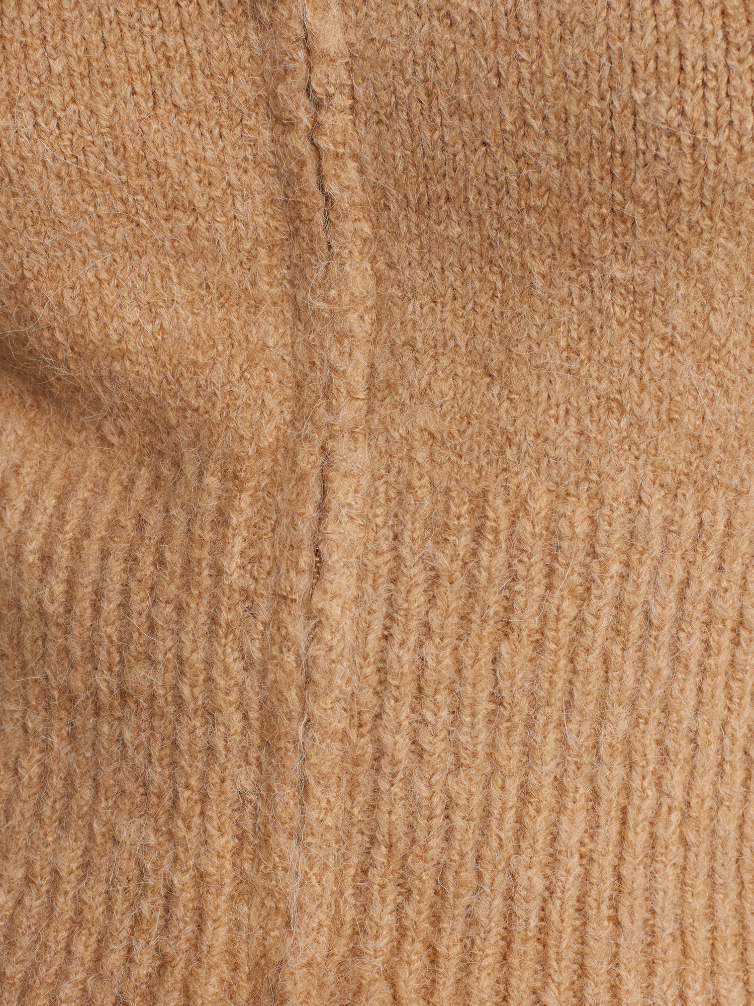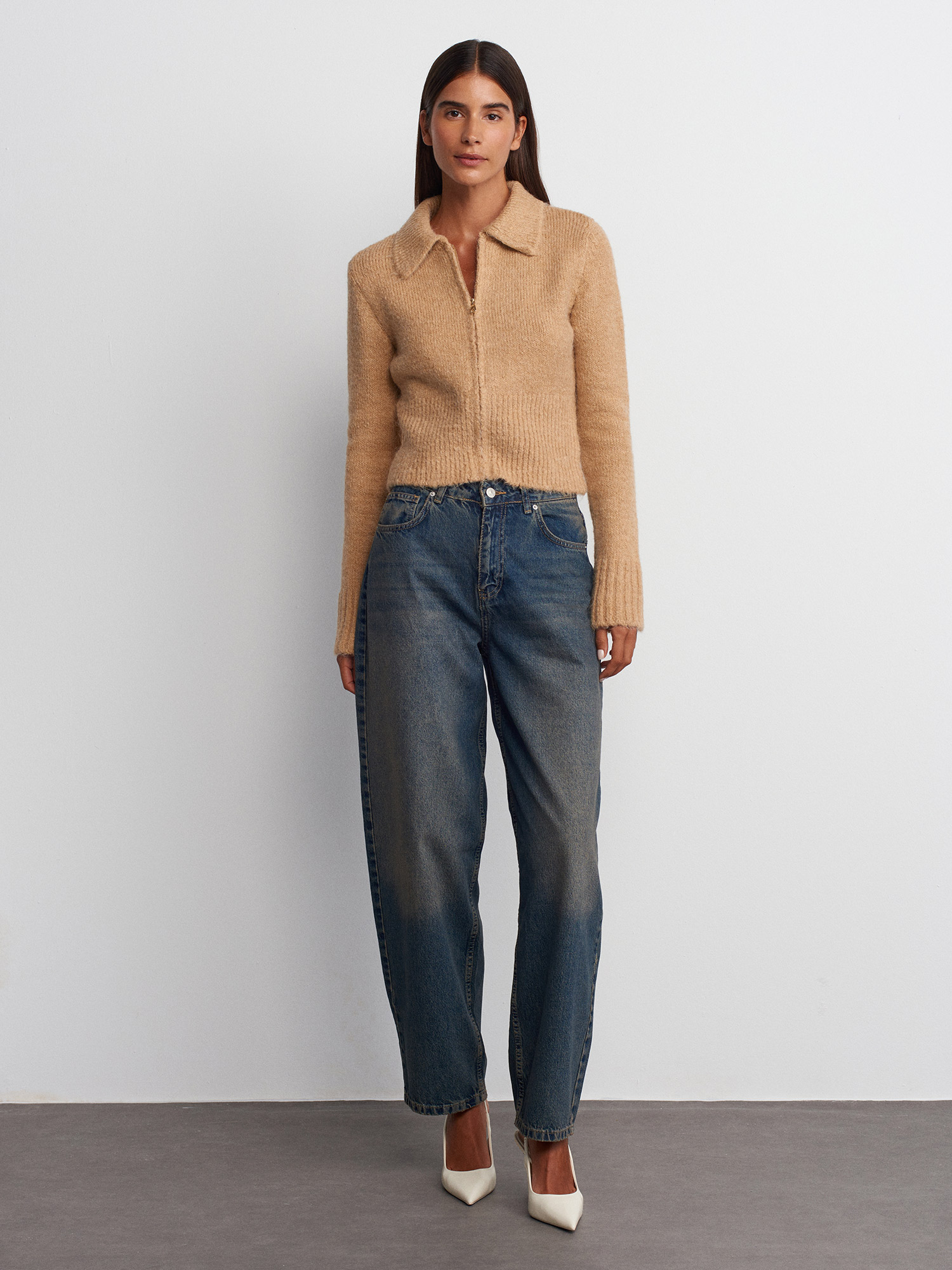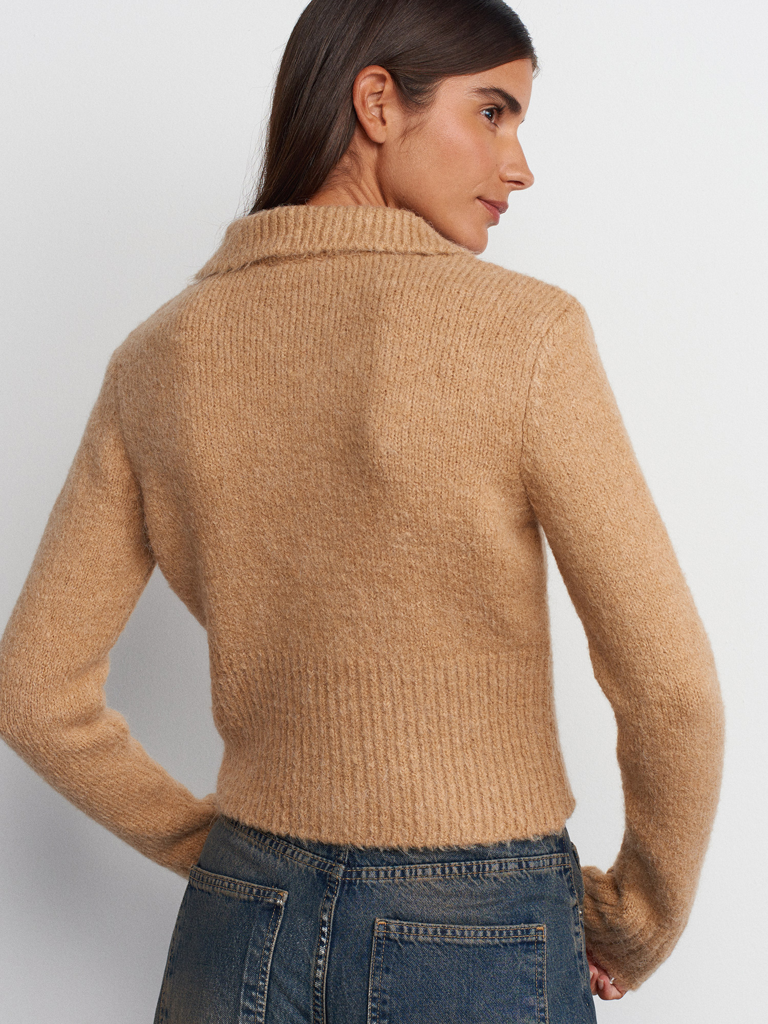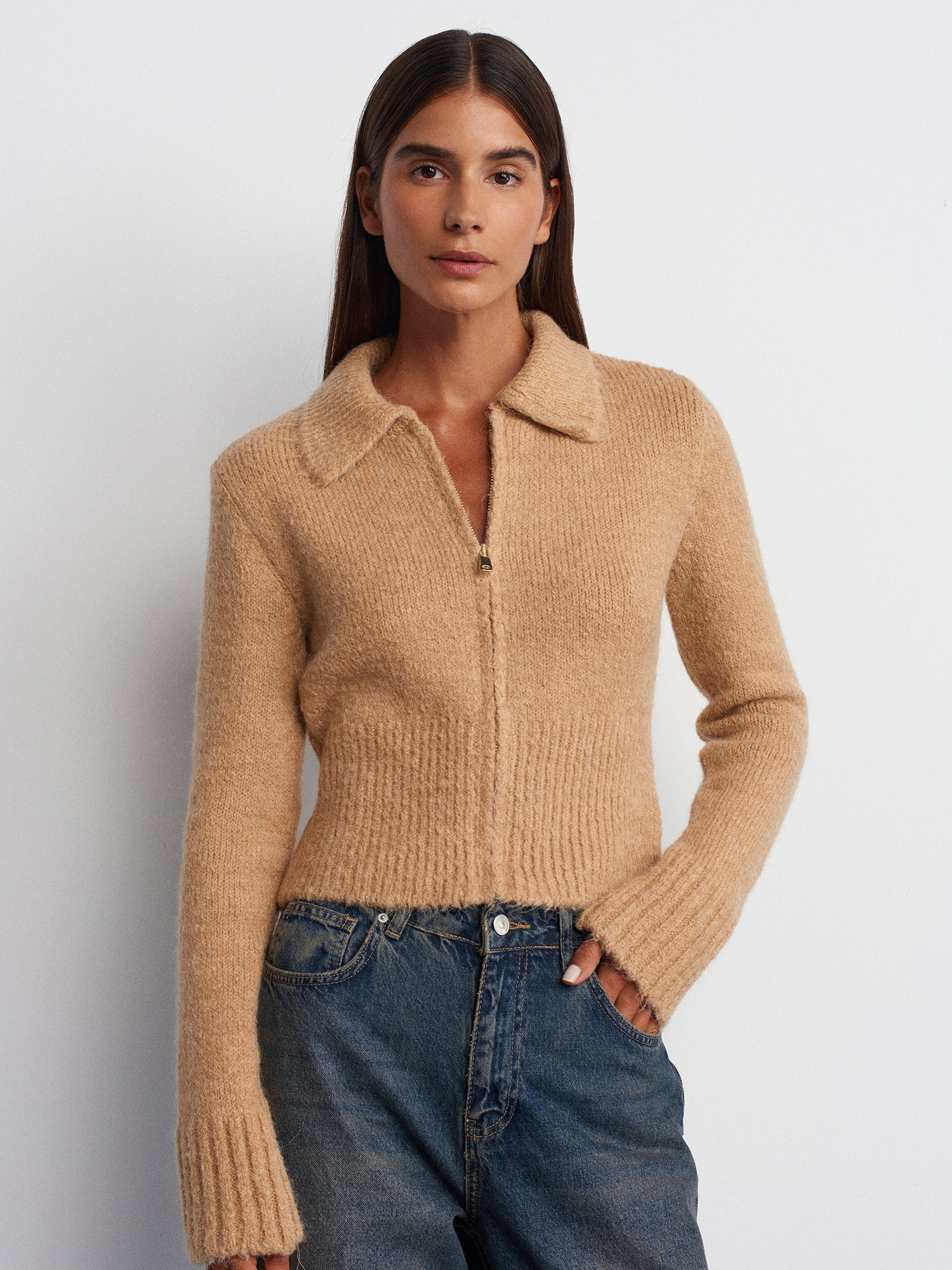 60257 Polo Yaka Fermuarlı Triko Hırka-Koyu Bej