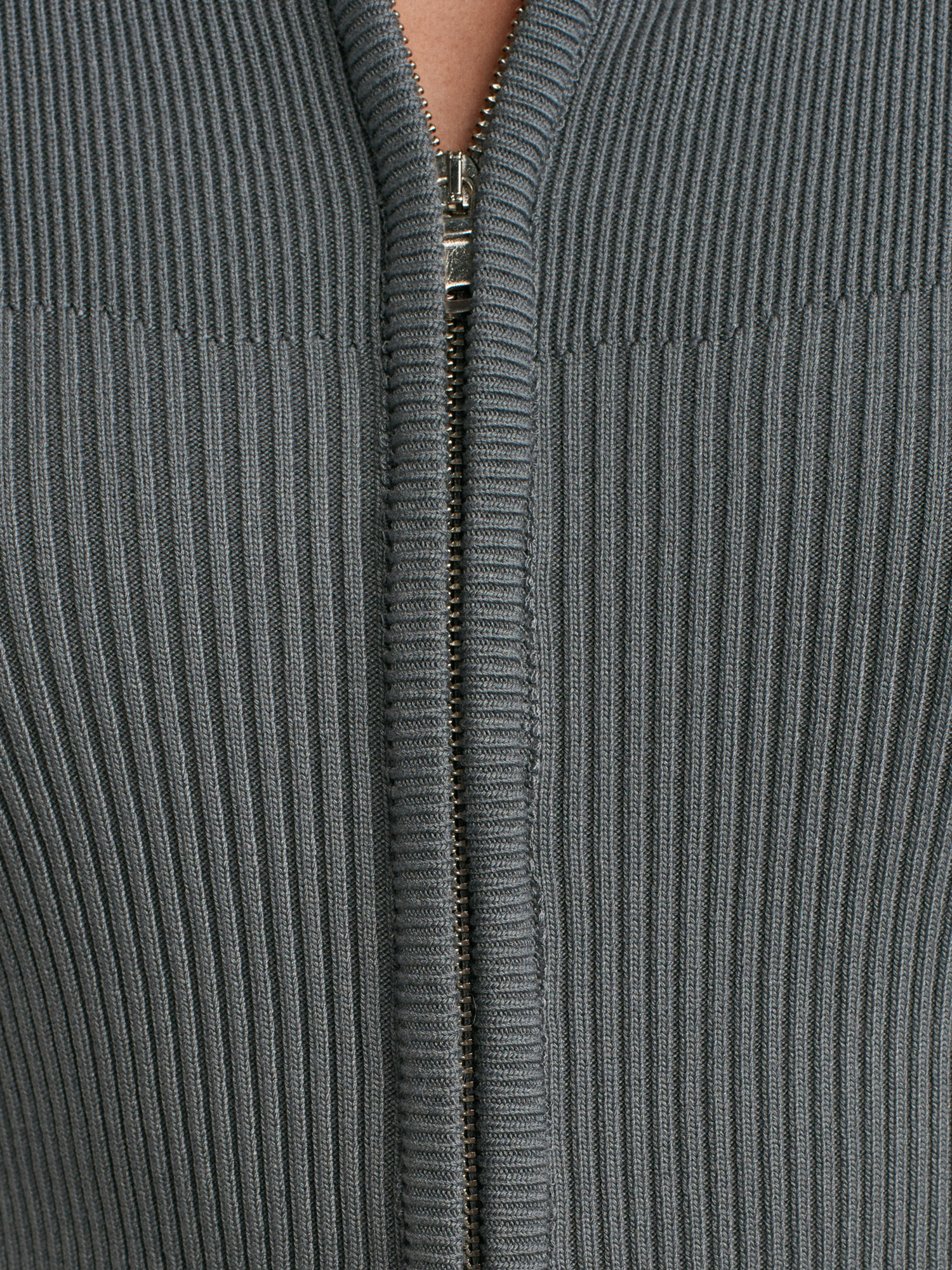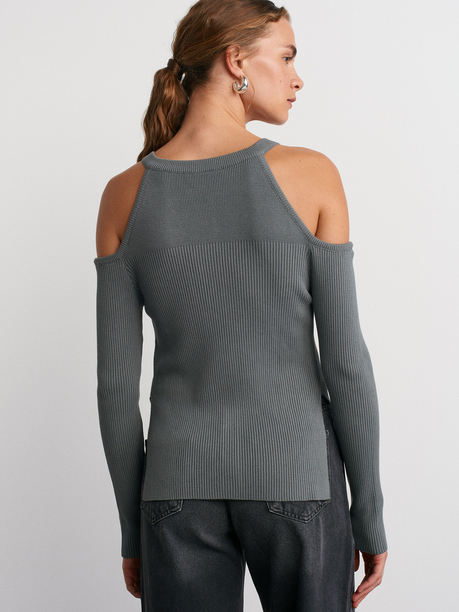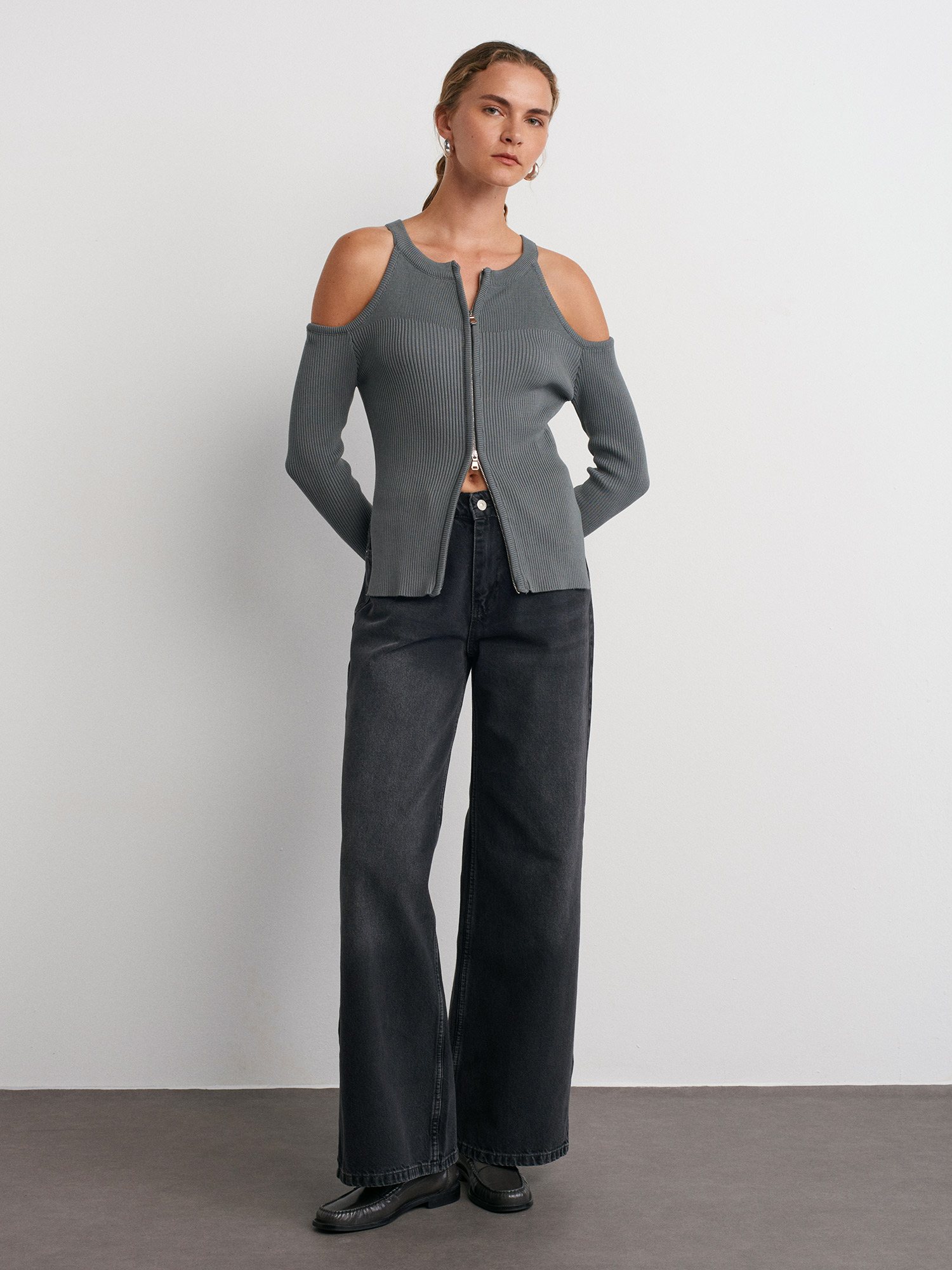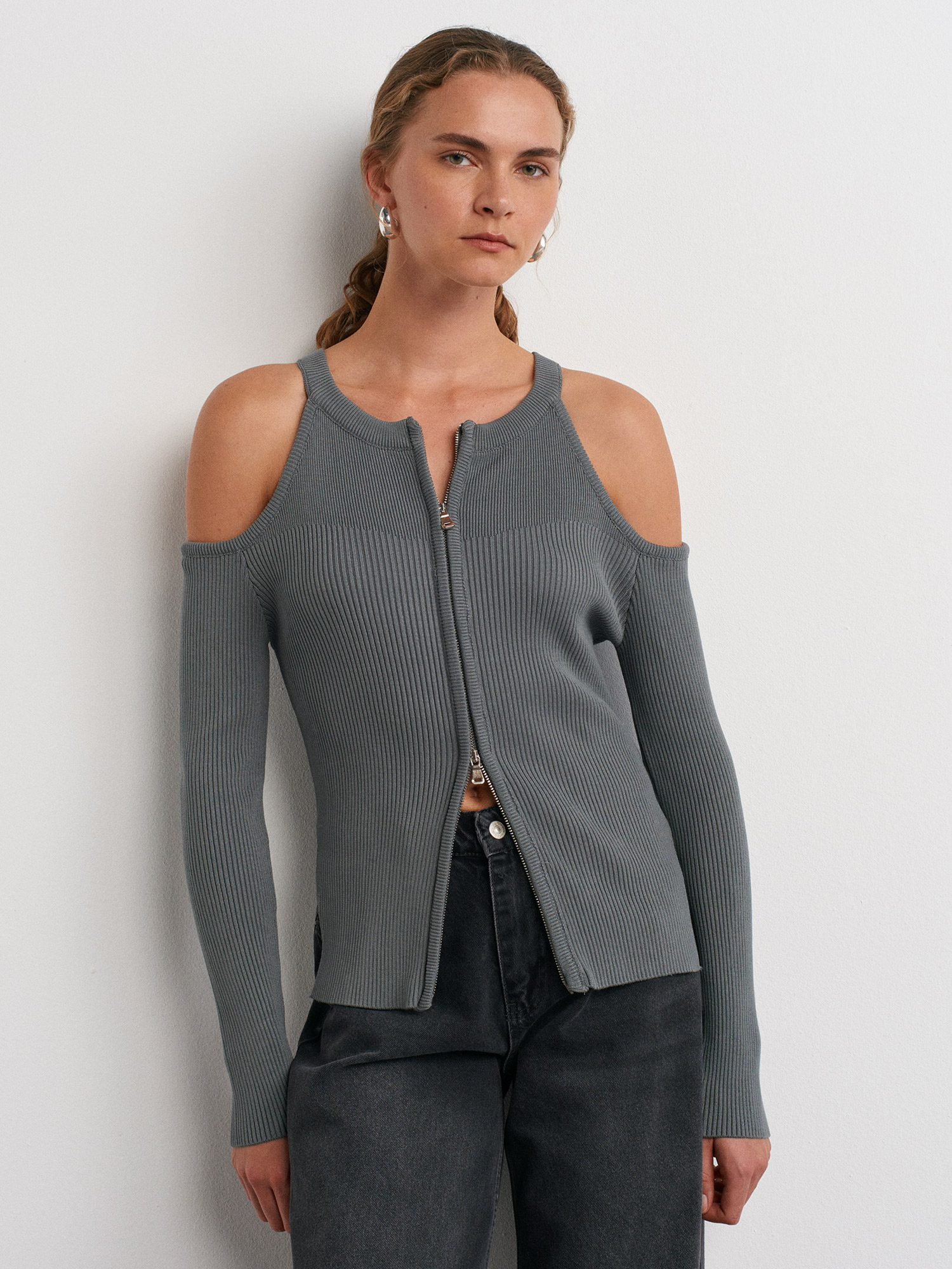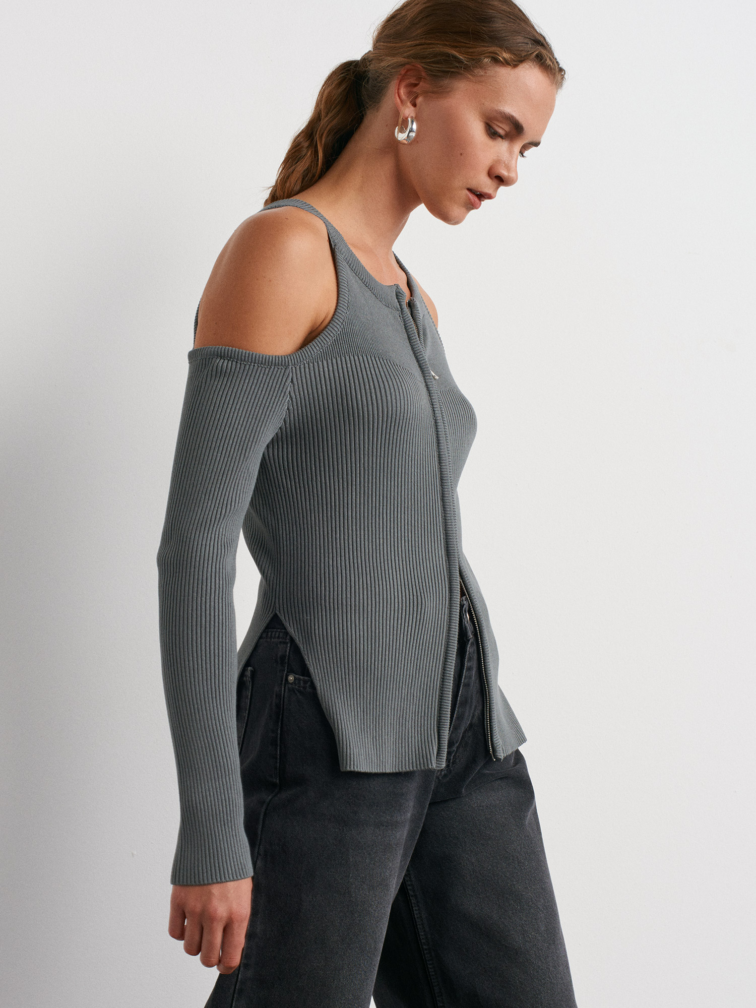 60259 Fermuarlı Yırtmaç Ve Açık Omuz Detaylı Triko Hırka-Füme