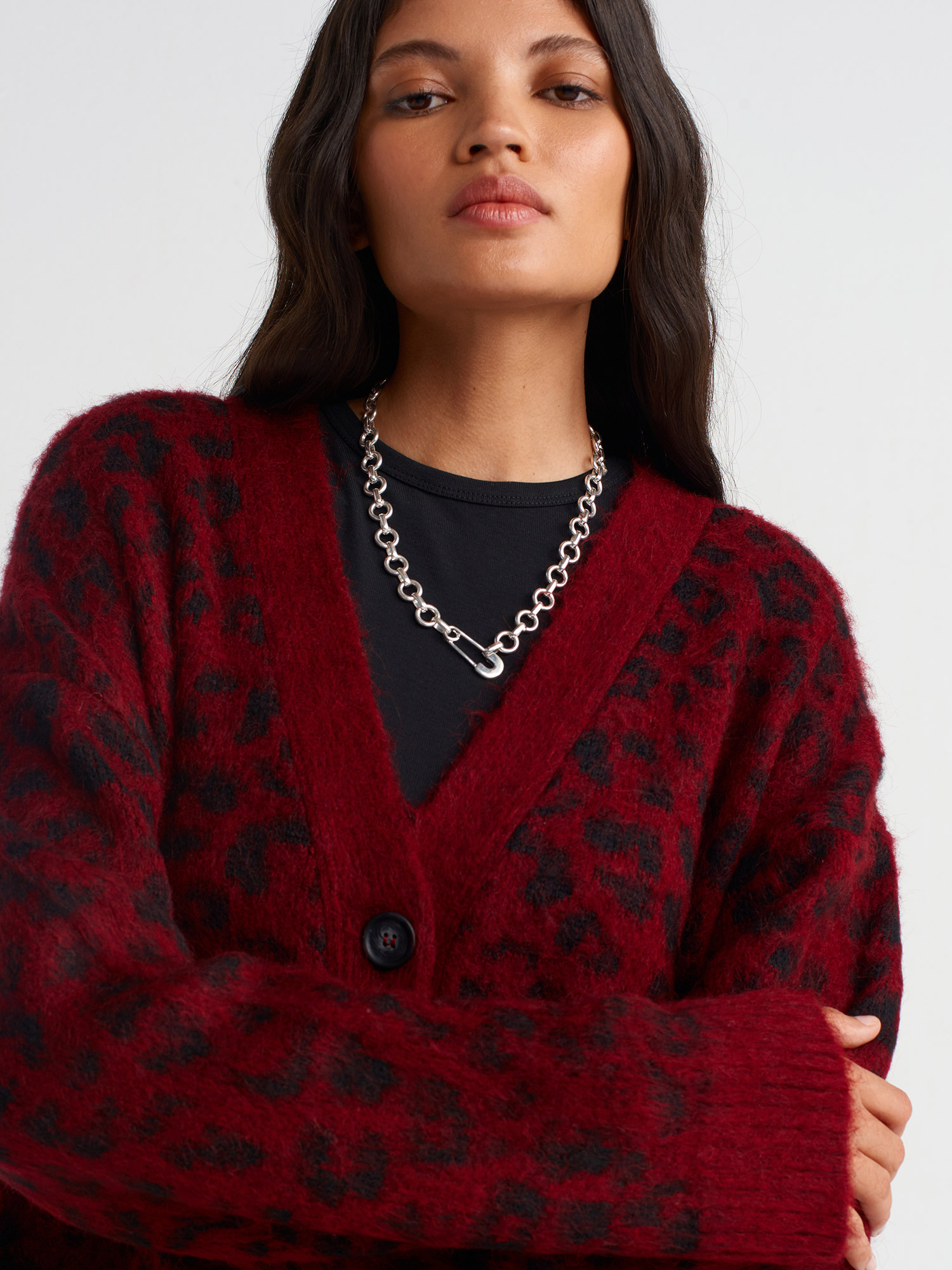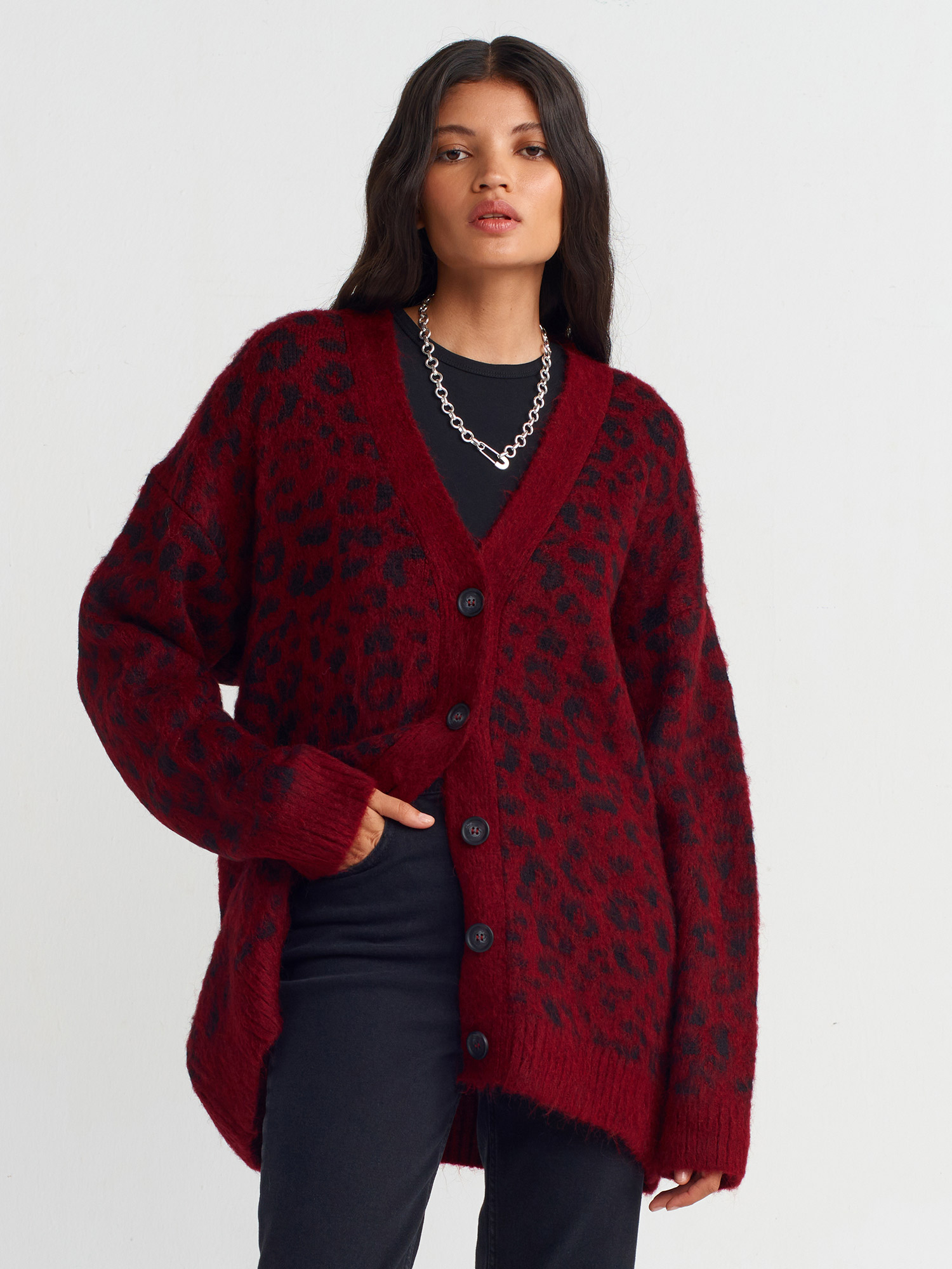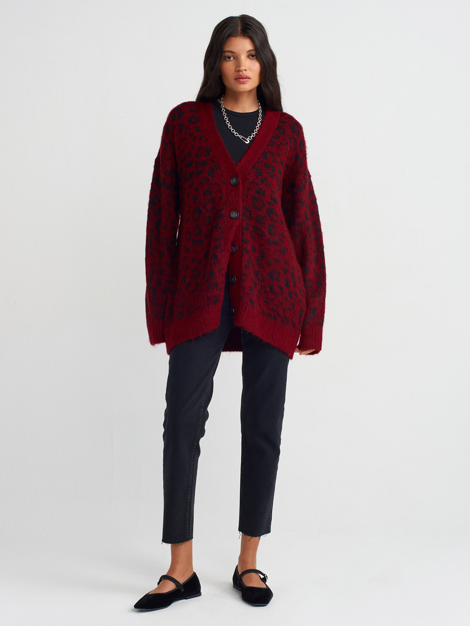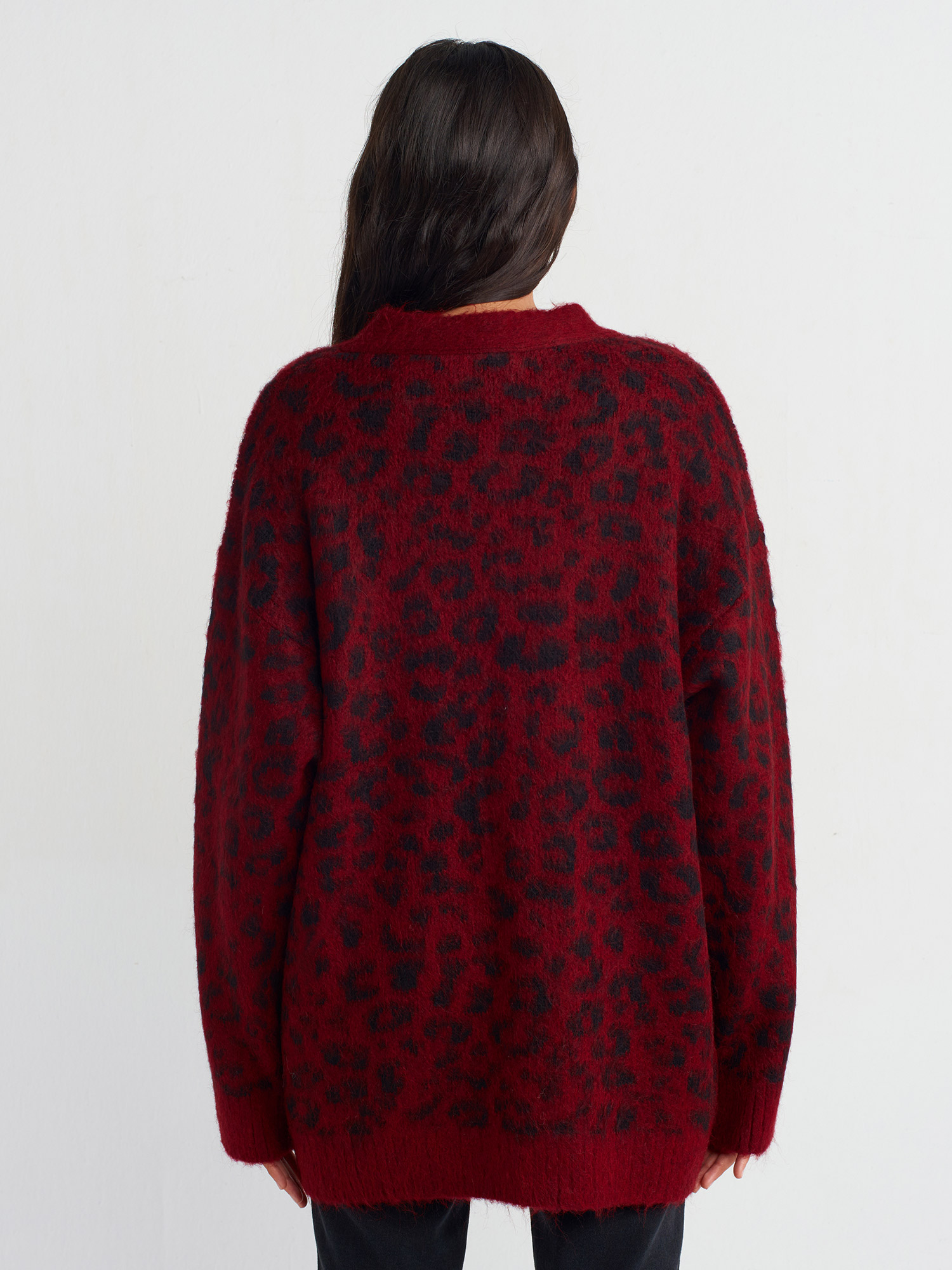 60260 V Yaka Leopar Şardonlu Düğmeli Triko Hırka-Bordo