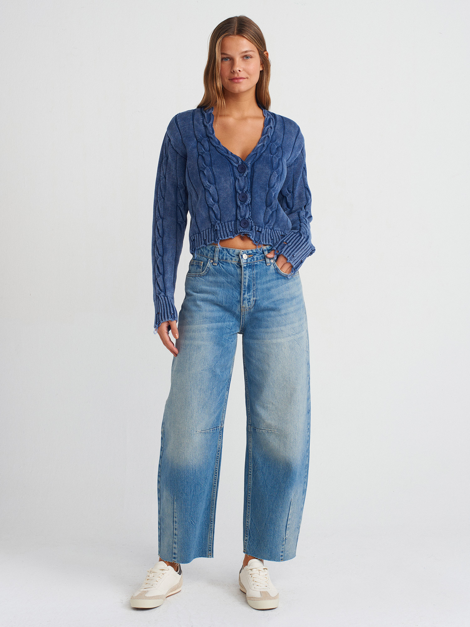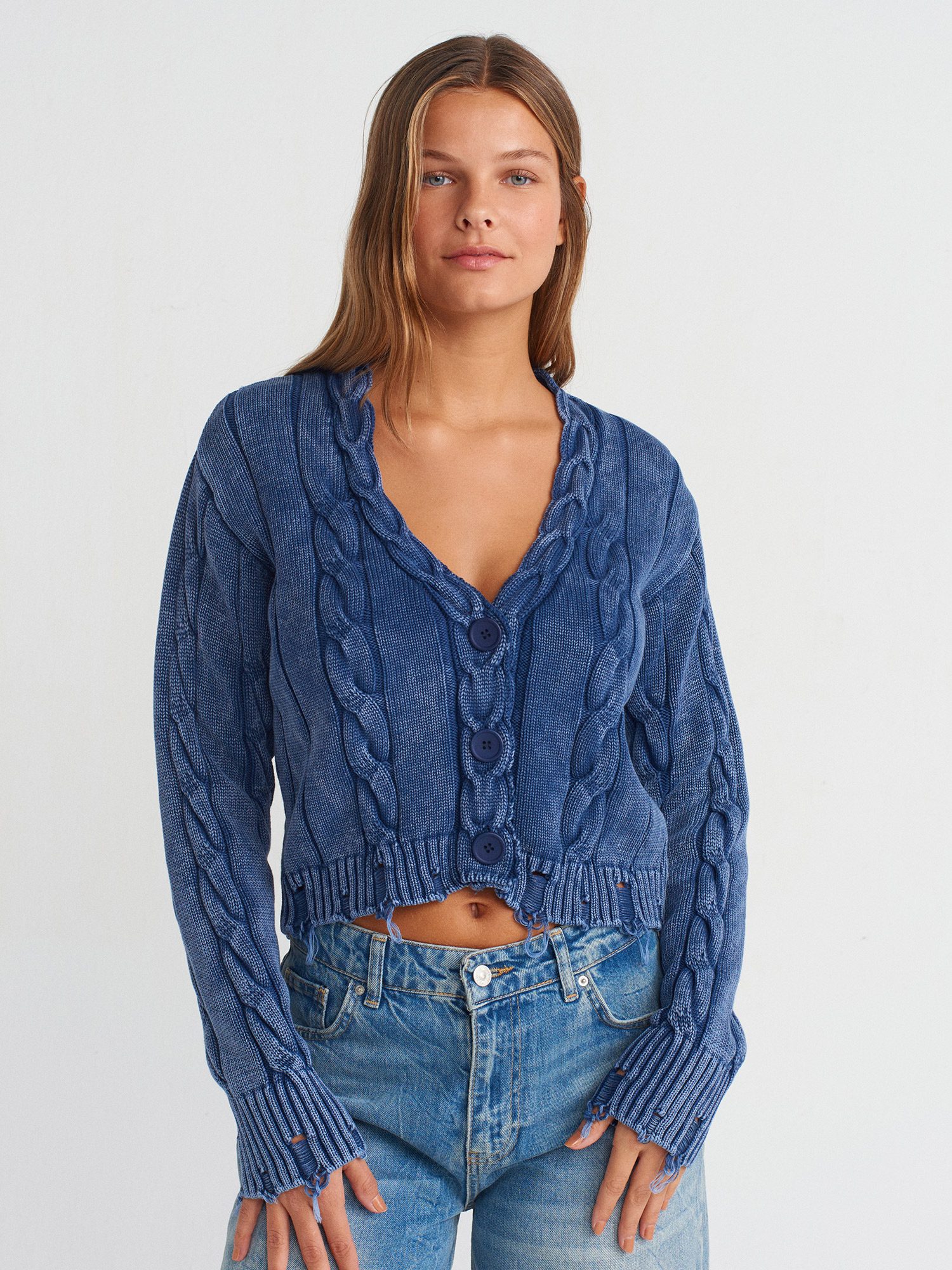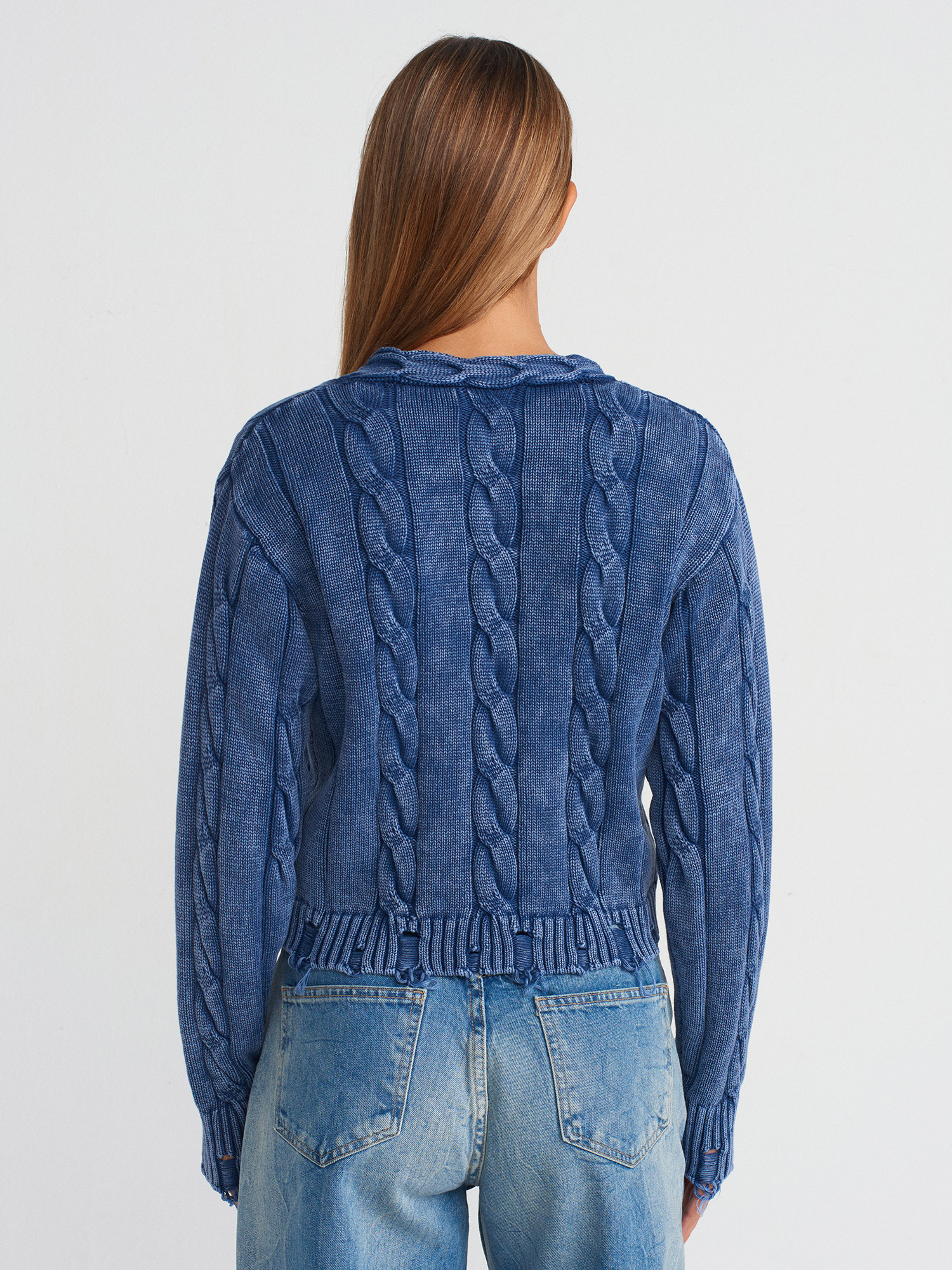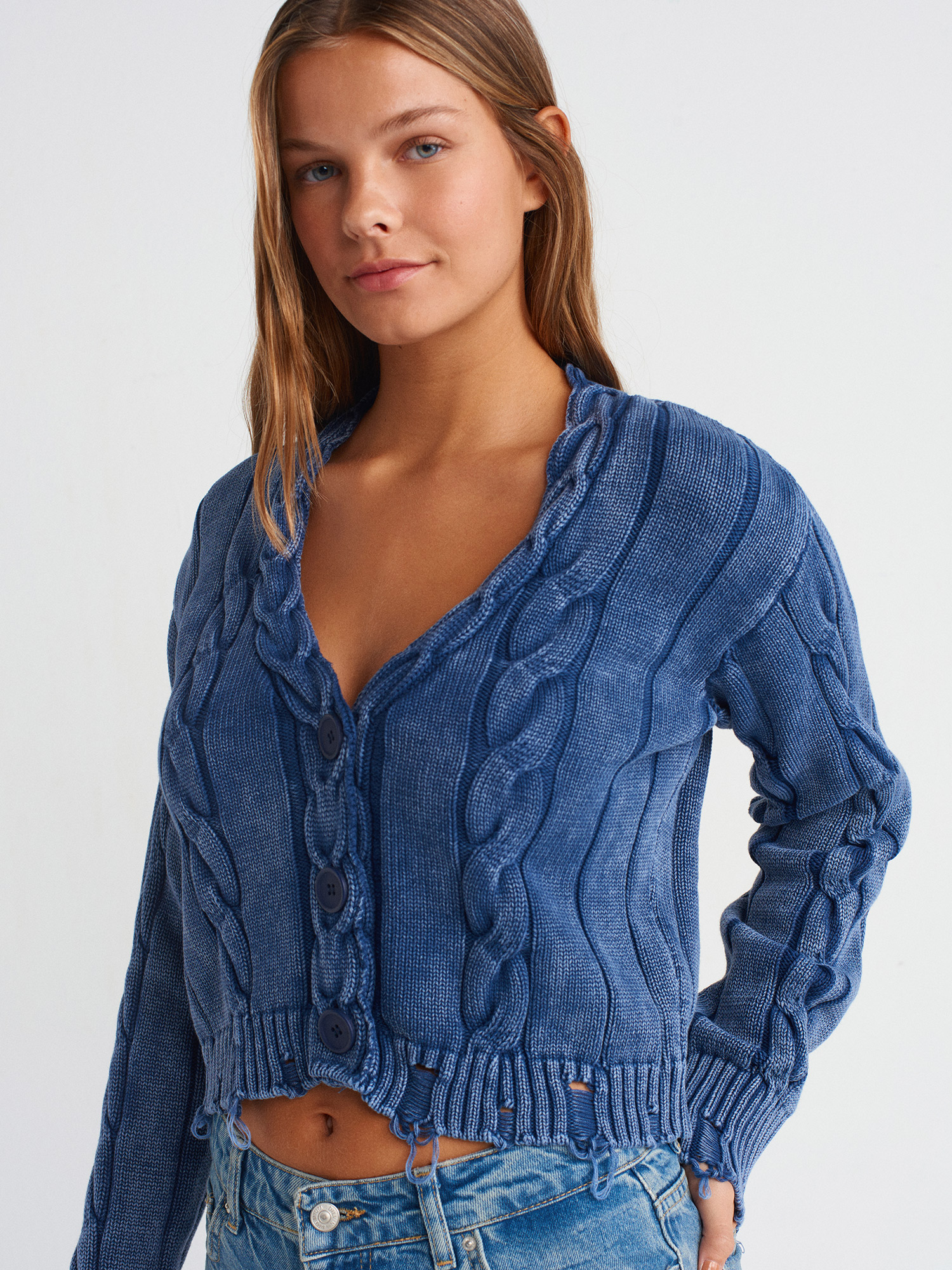 60263 Soluk Efektli Düğmeli Yırtık Detaylı Triko Hırka-İndigo