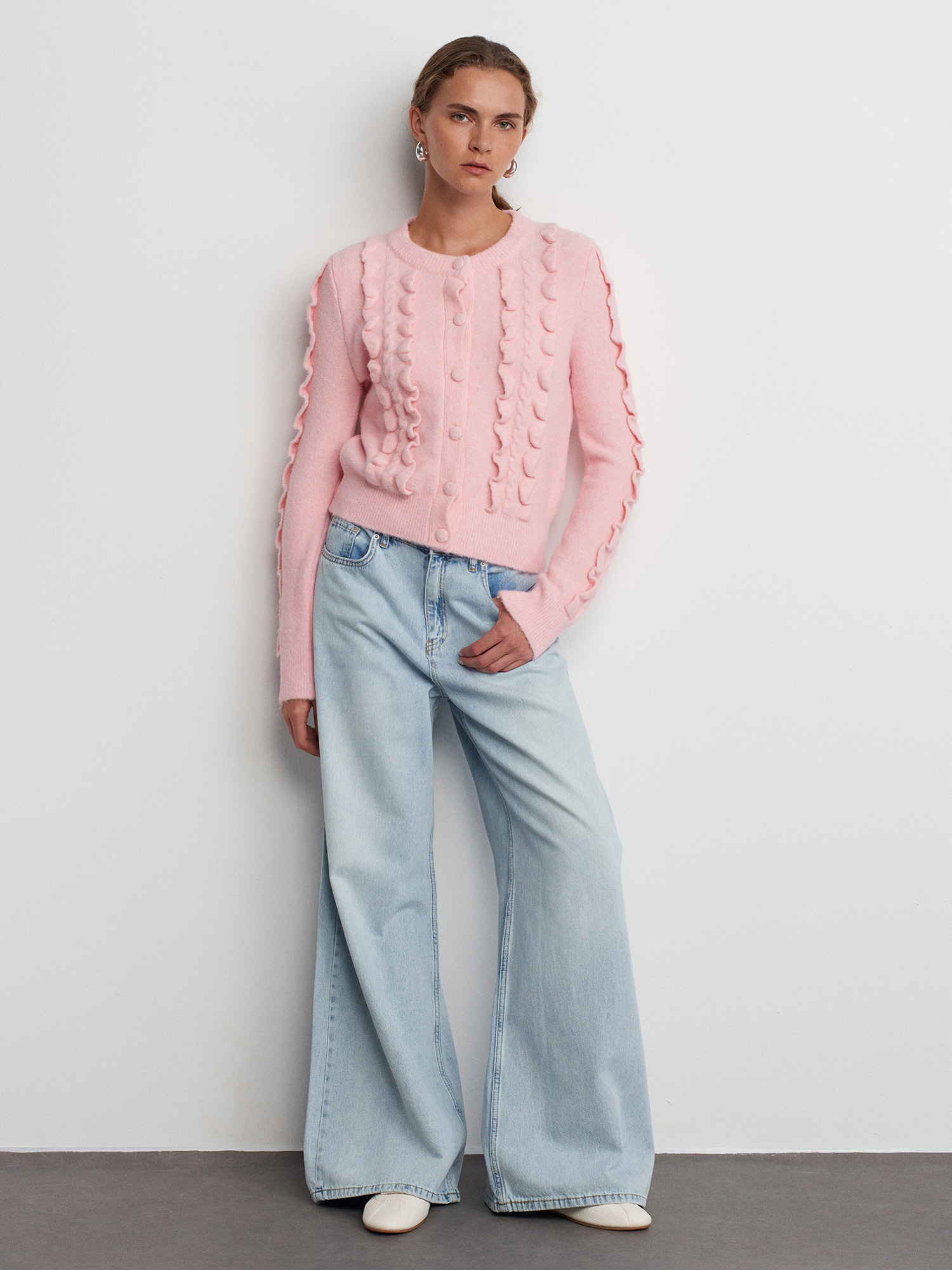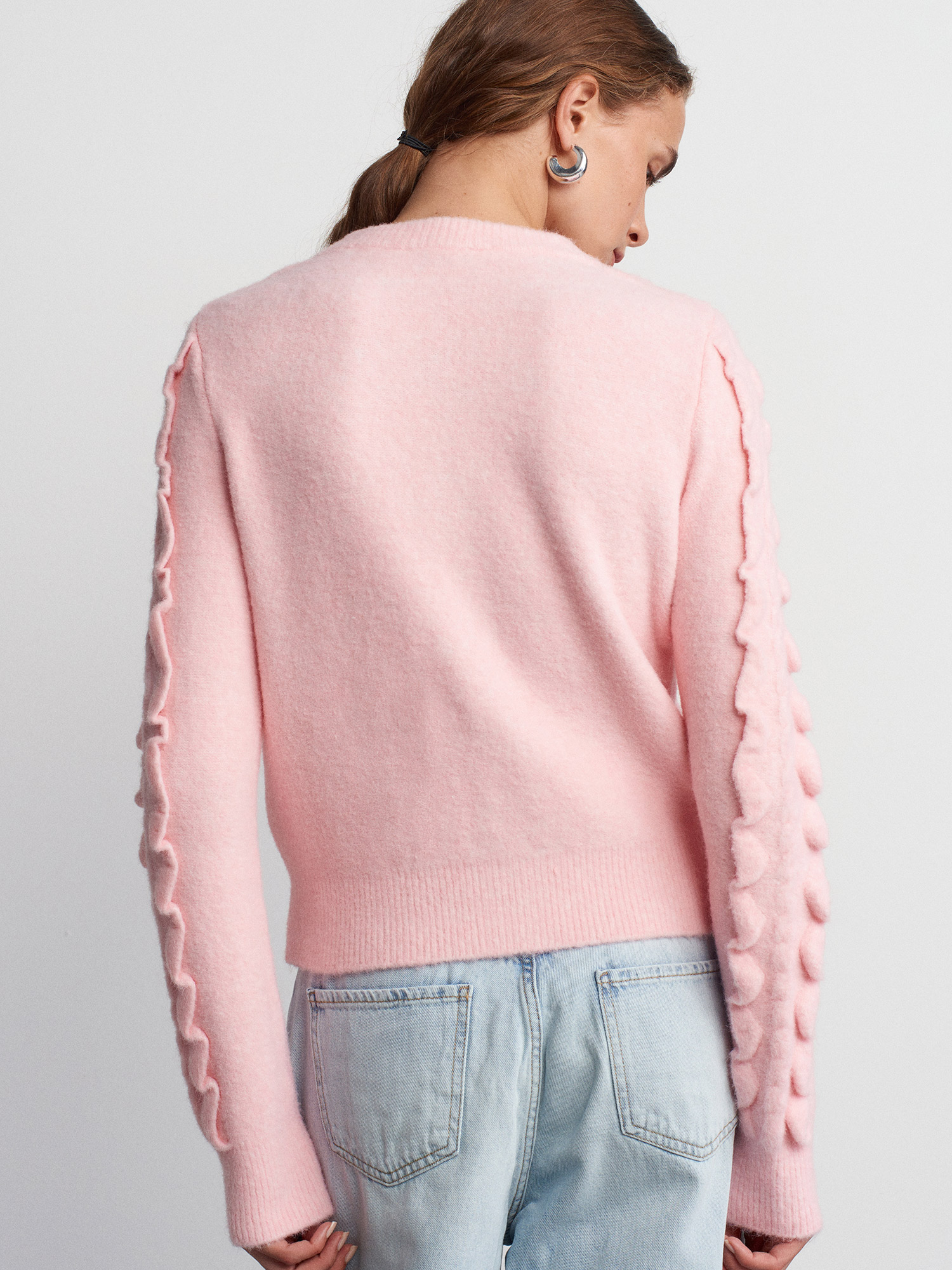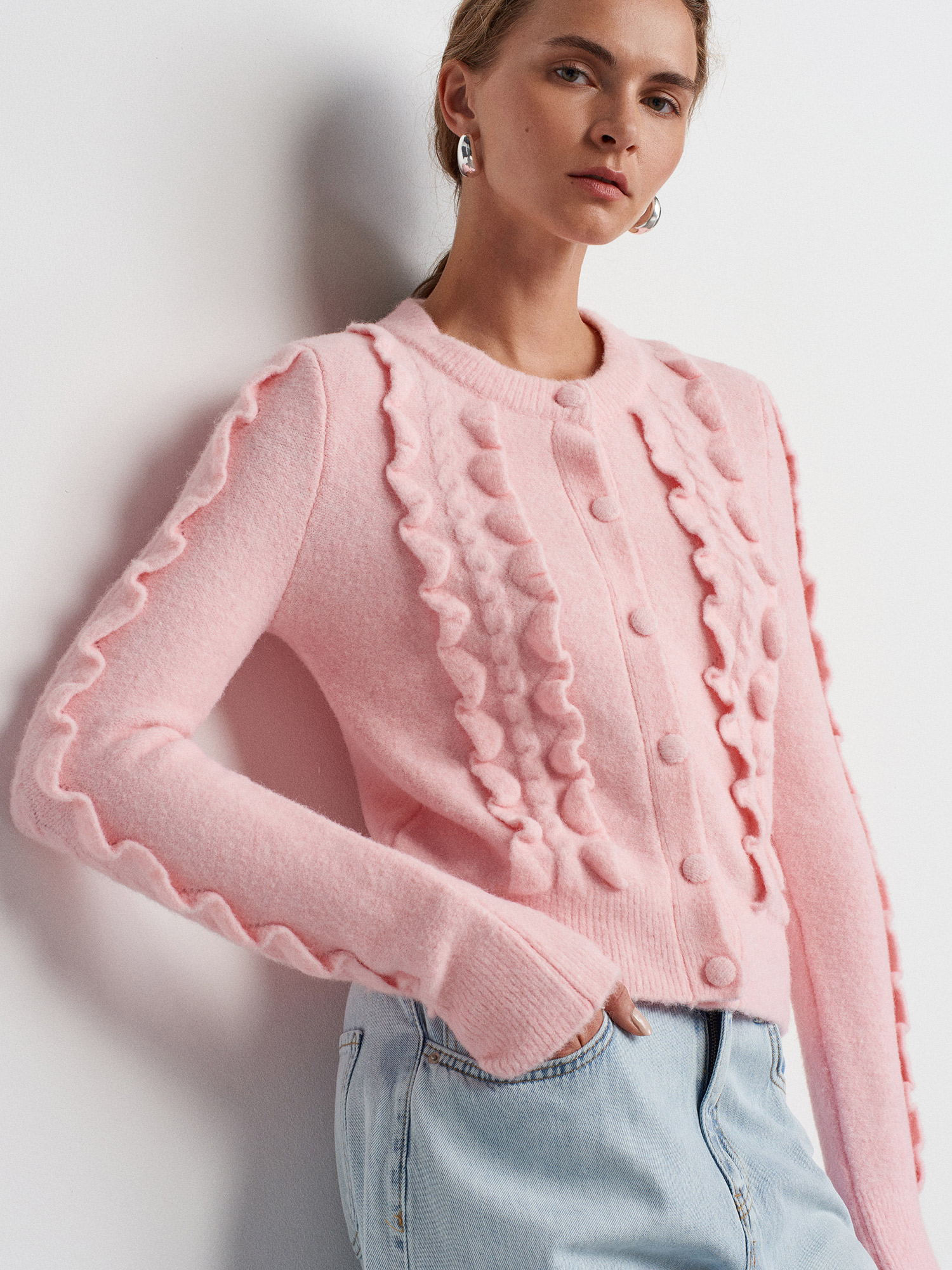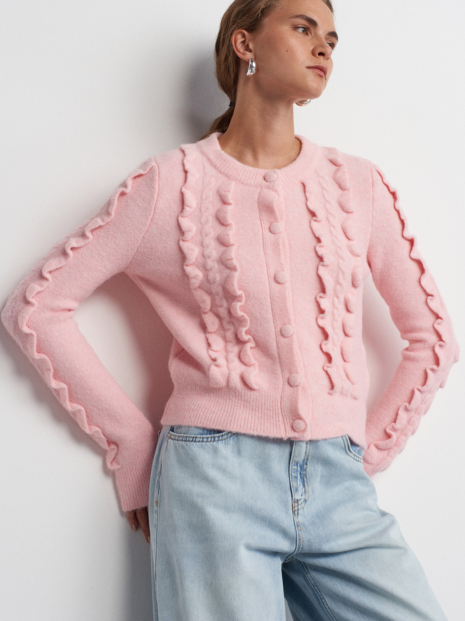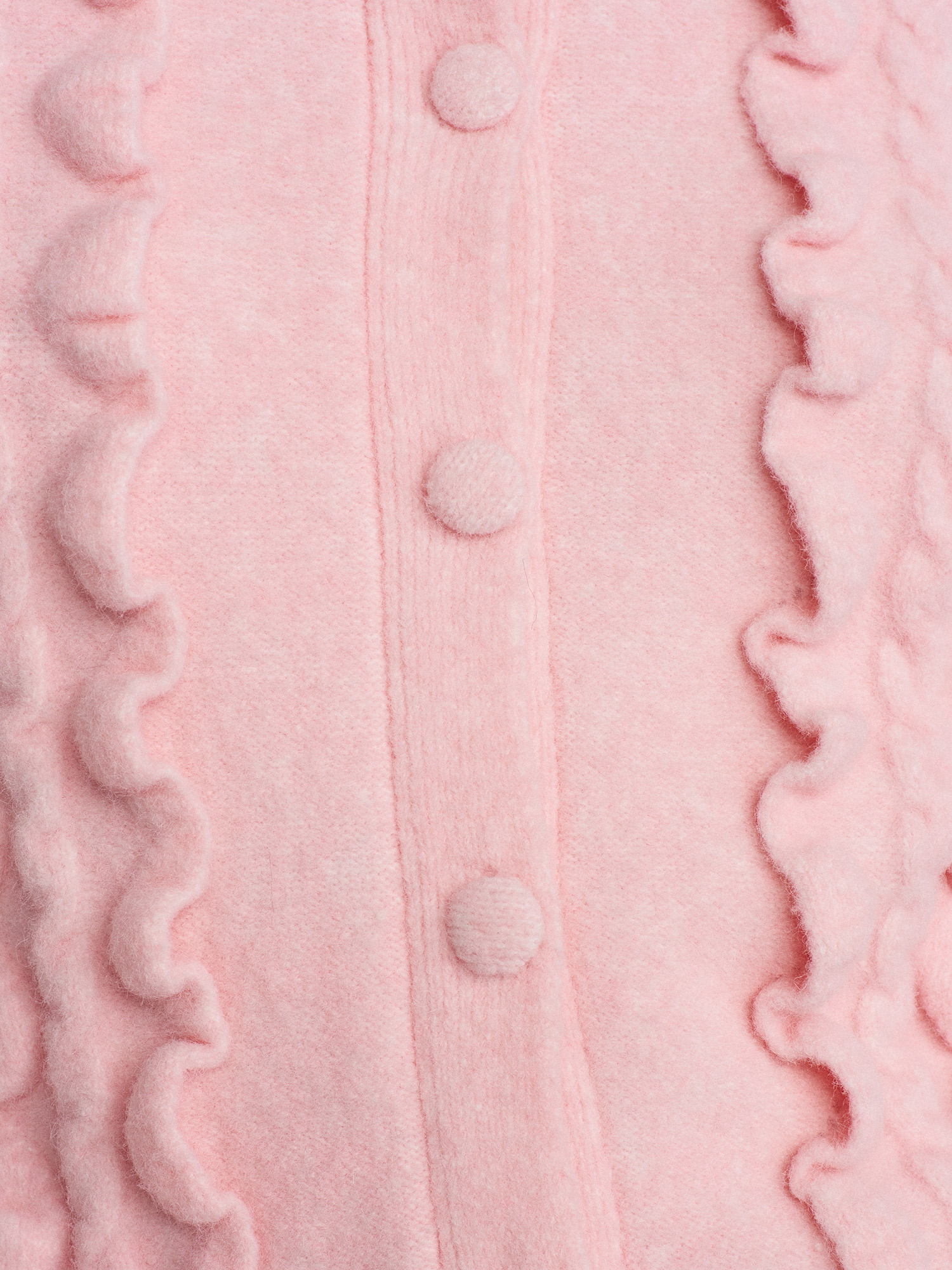60267 Bisiklet Yaka Fırfırlı Düğmeli Triko Hırka-Pembe