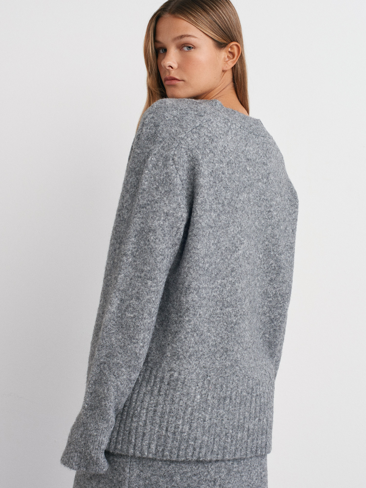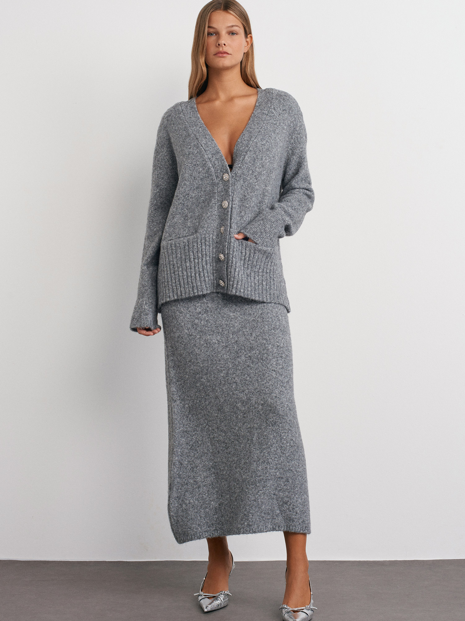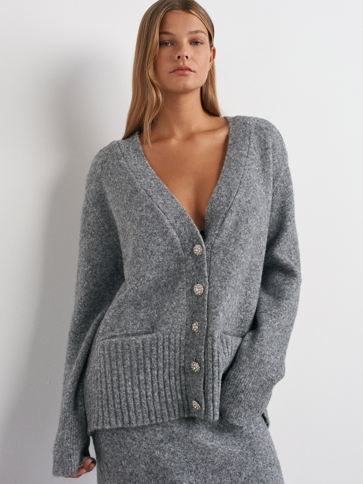 60269 V Yaka Taş Düğmeli Cepli Yumuşak Dokulu Triko Hırka-Füme M.