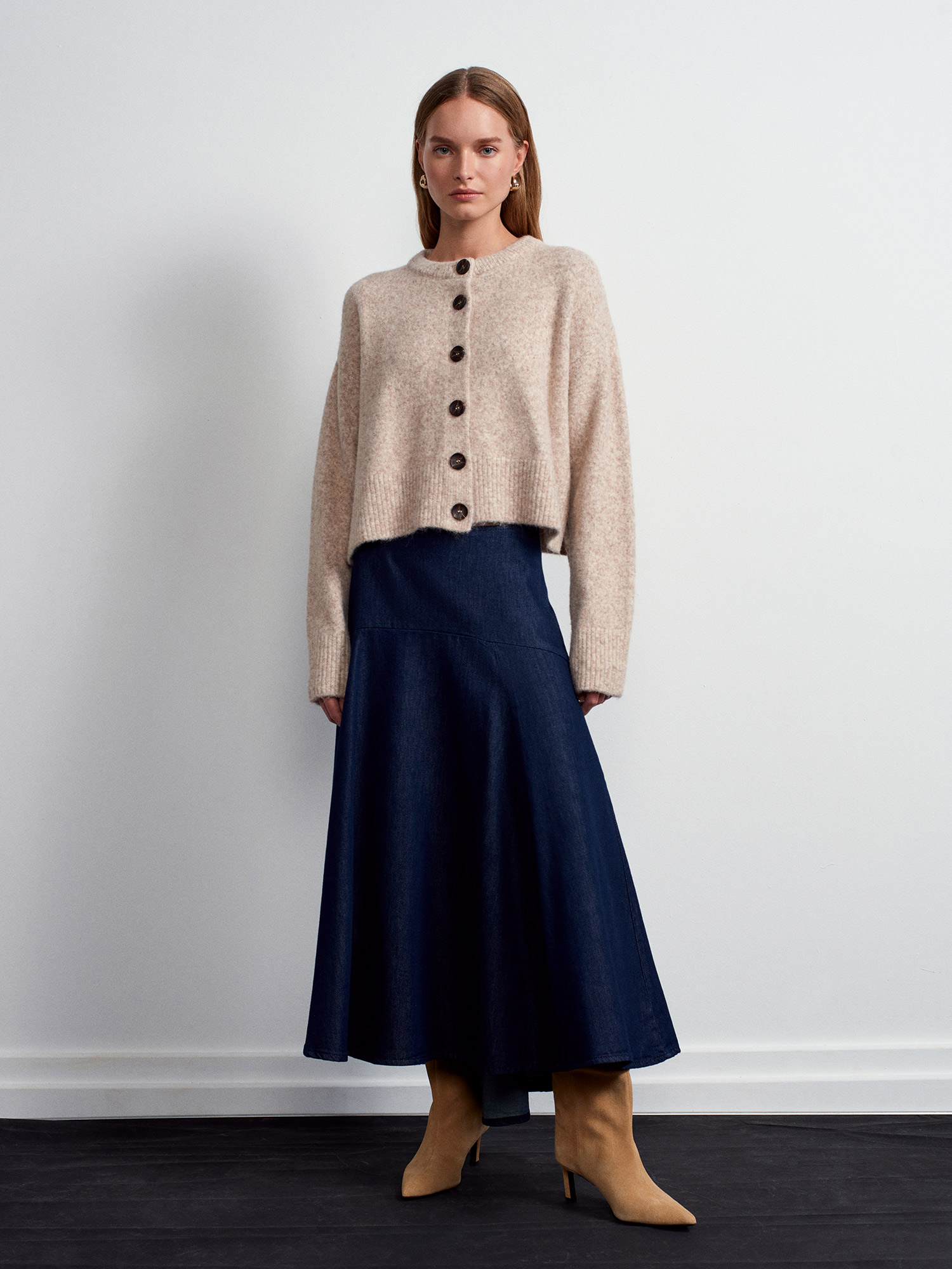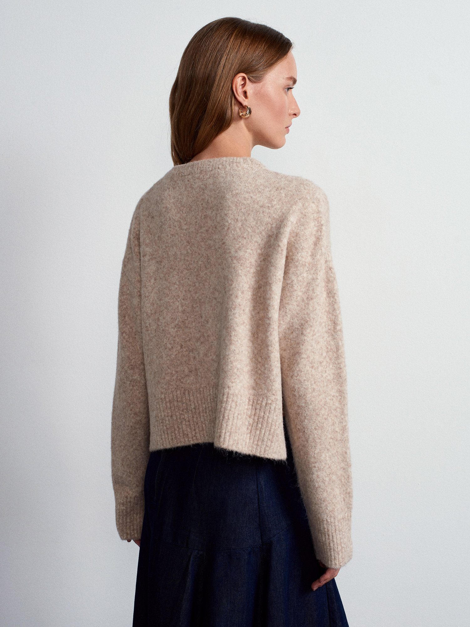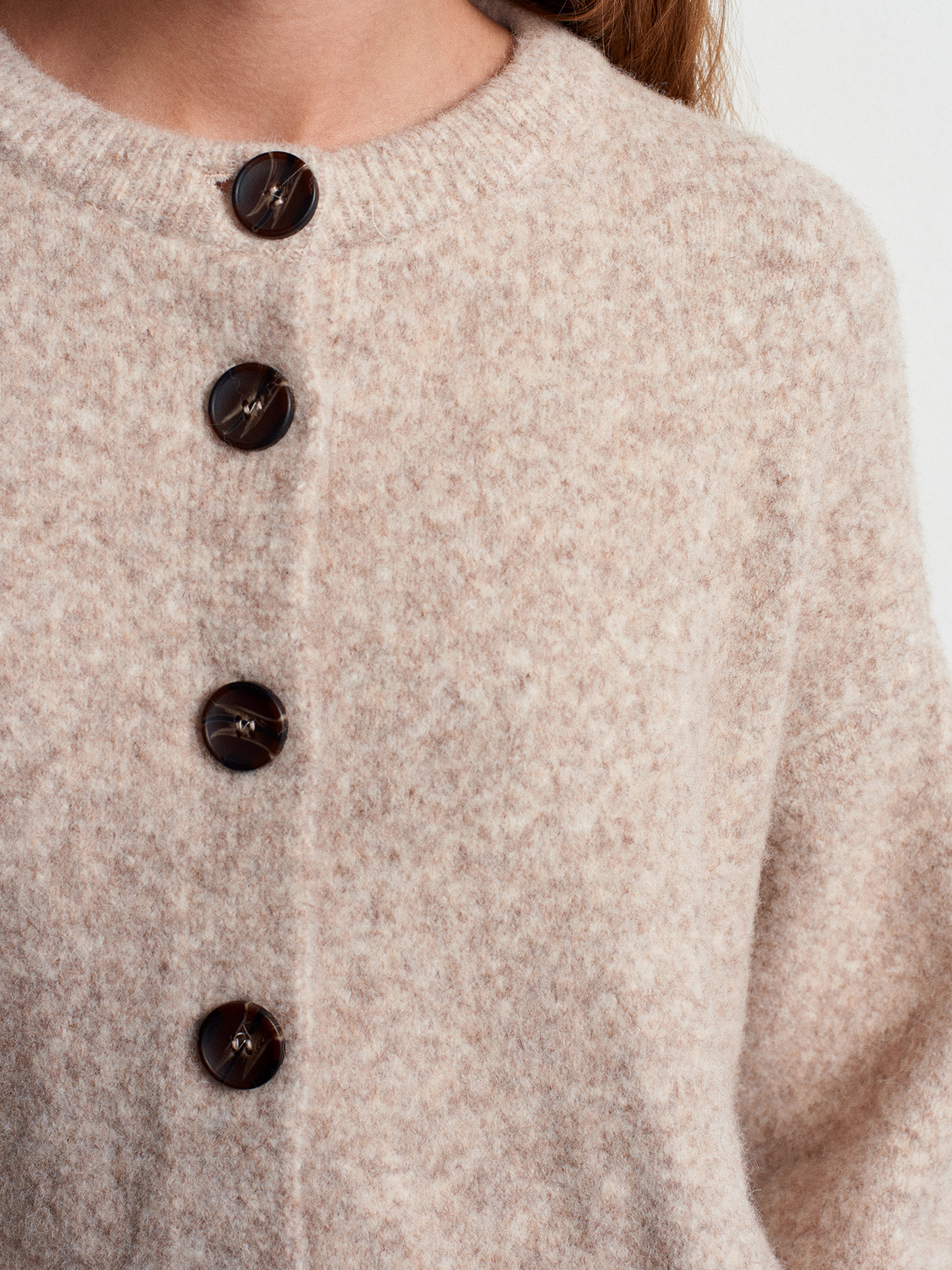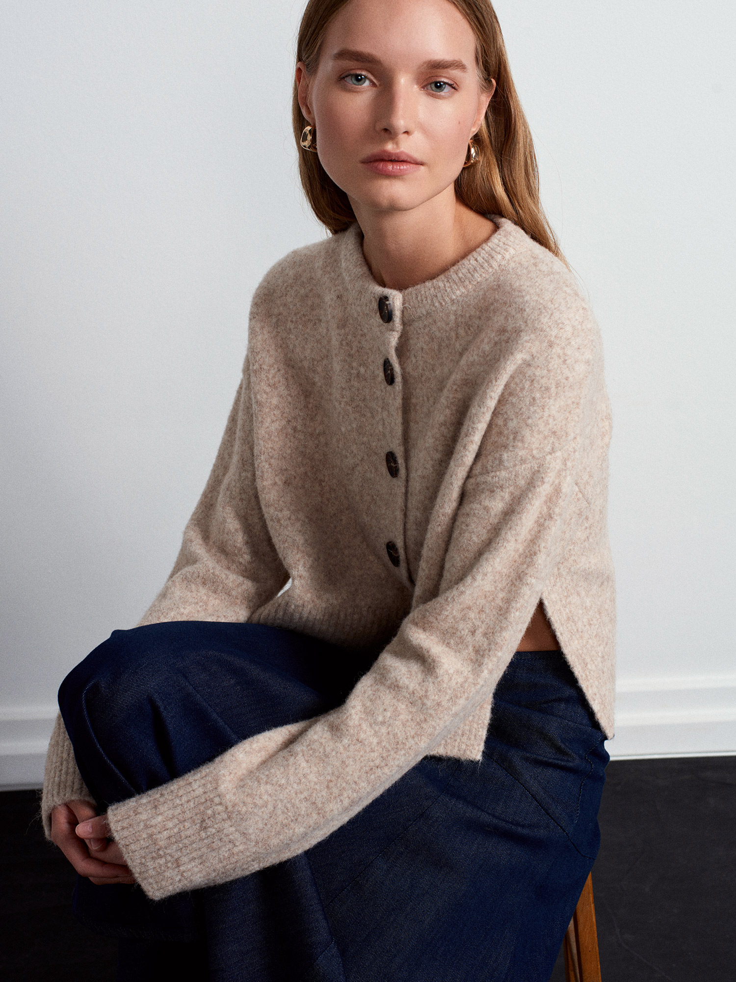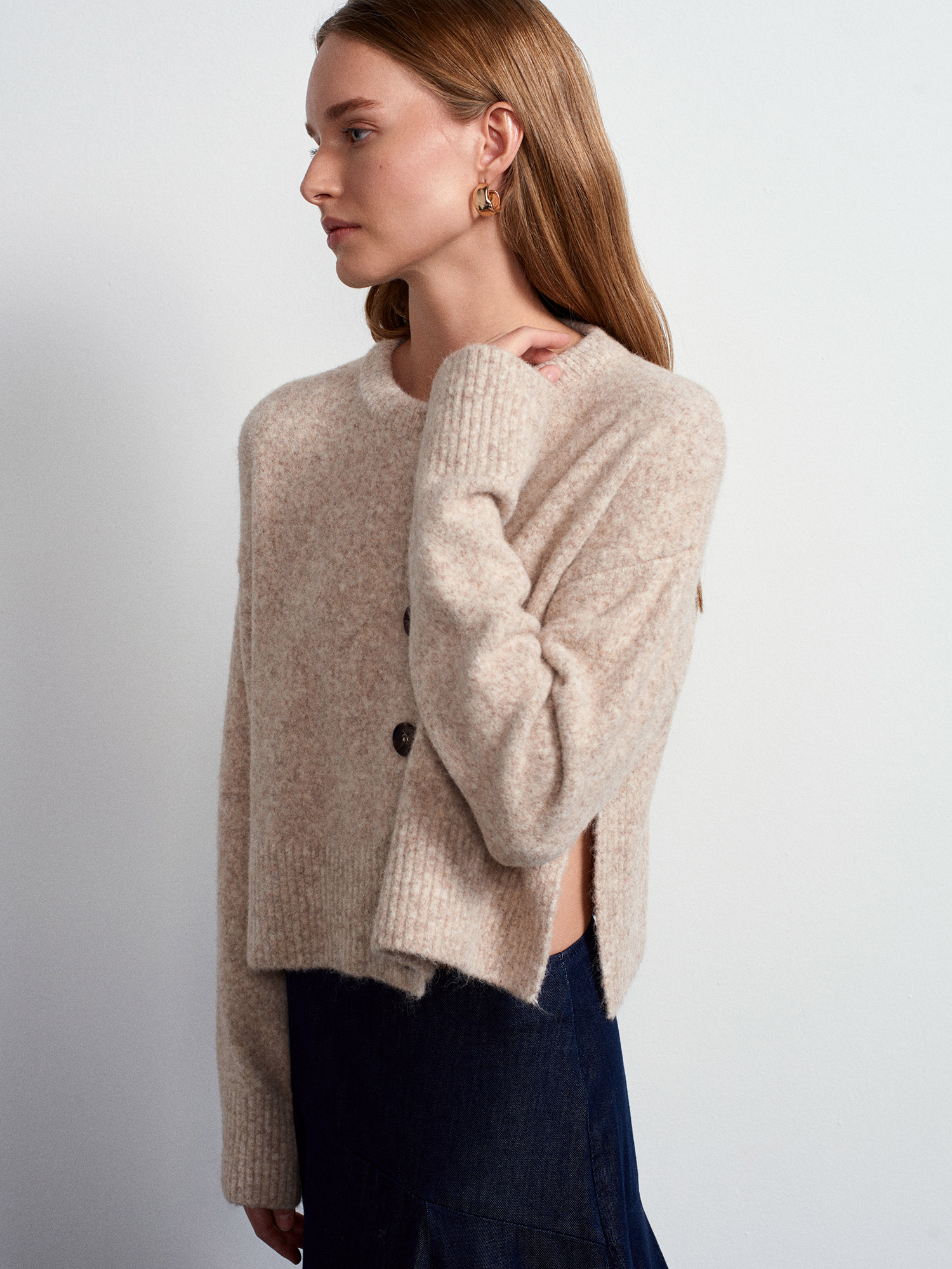 60280 Yanları Yırtmaçlı Yün Karışımlı Triko Hırka-Bej Melanj