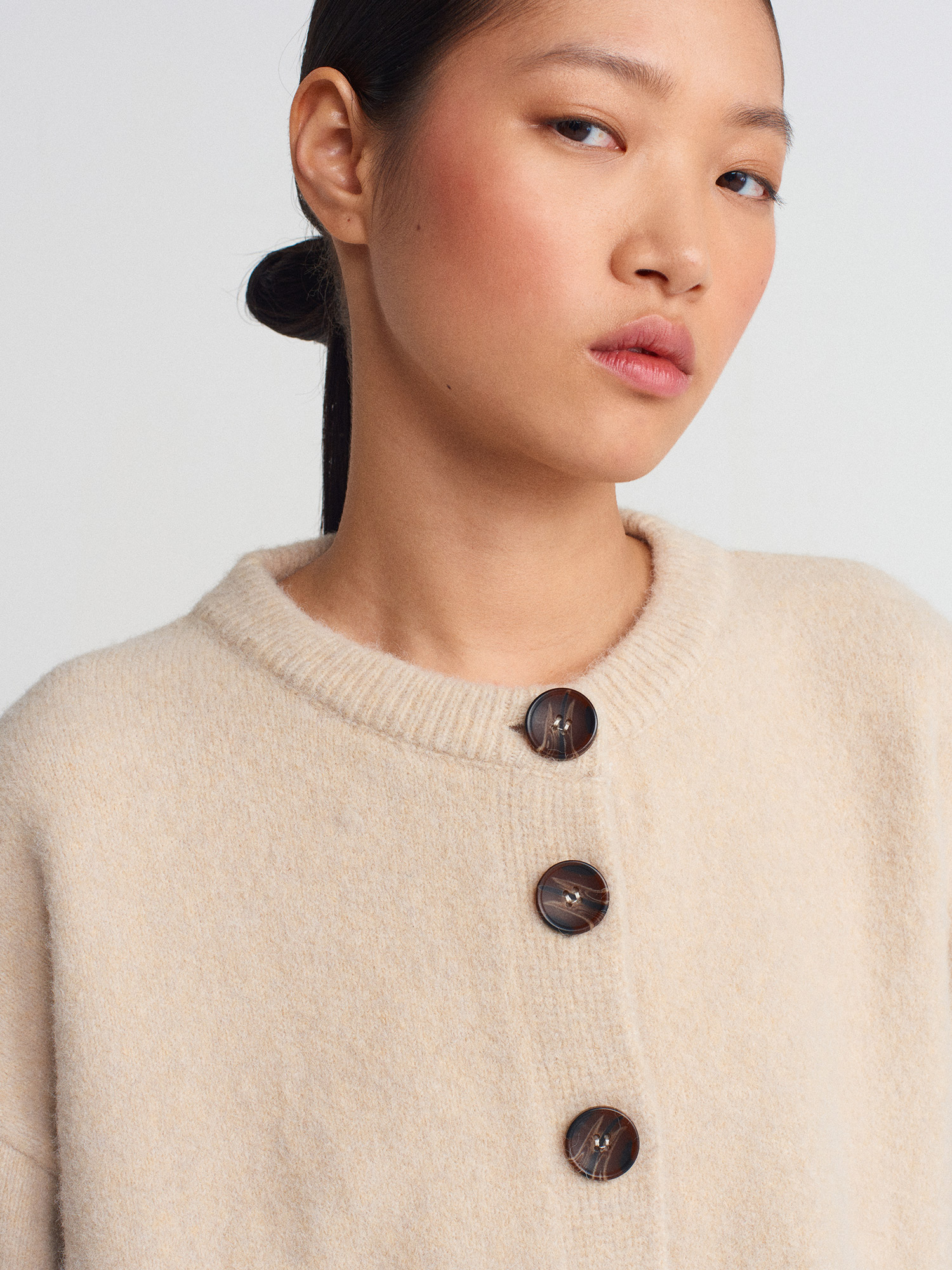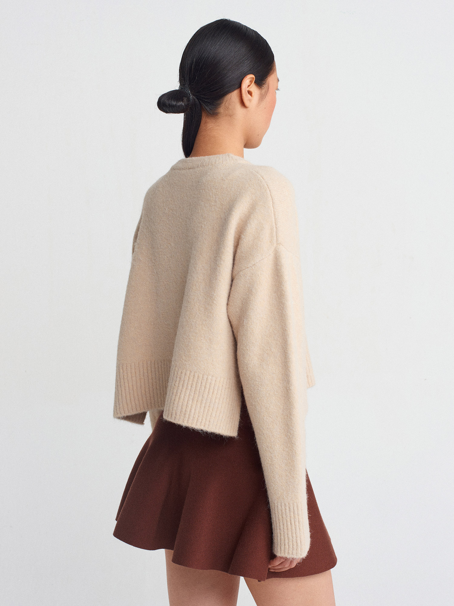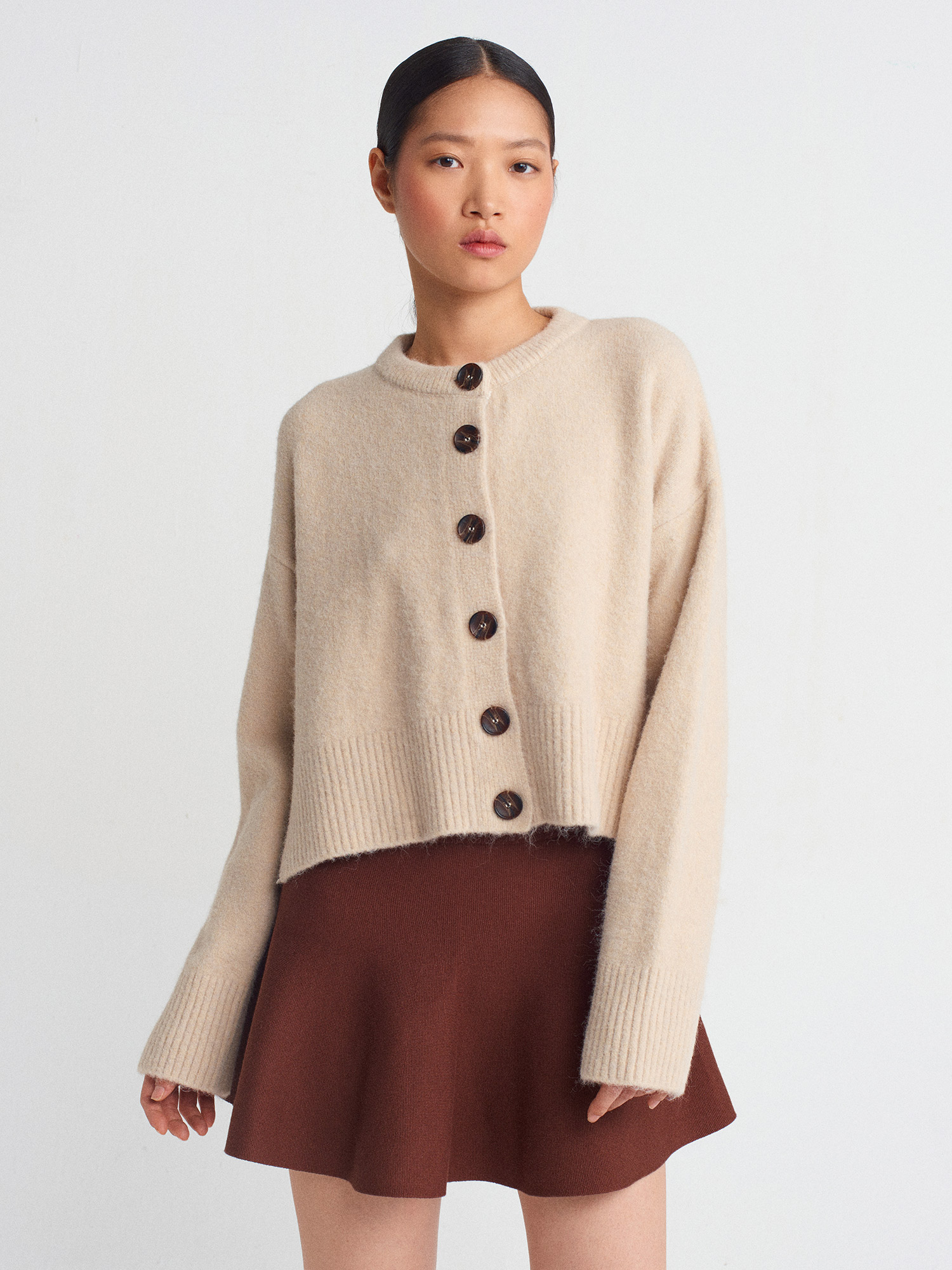 60280 Yanları Yırtmaçlı Yün Karışımlı Triko Hırka-Koyu Bej