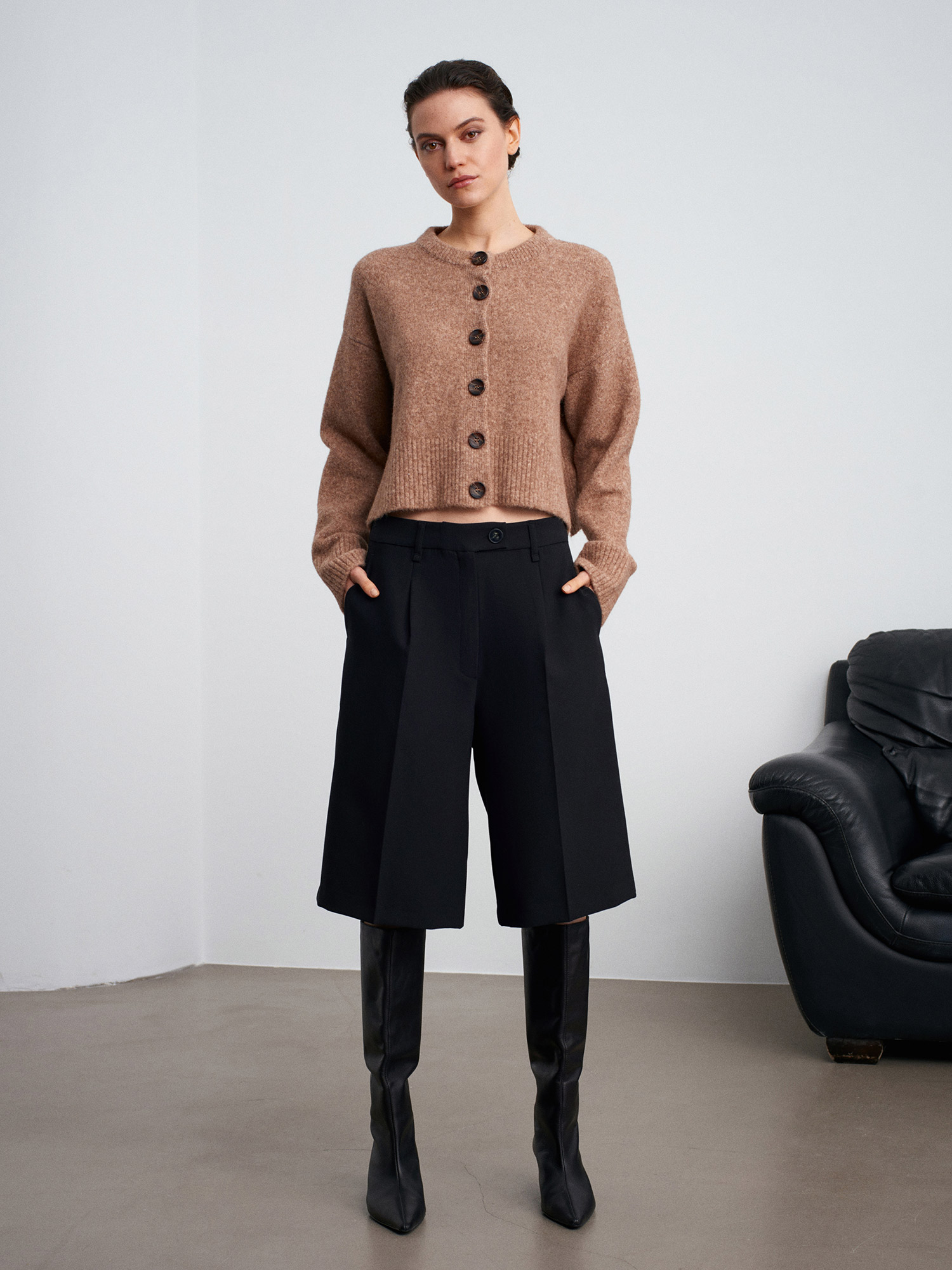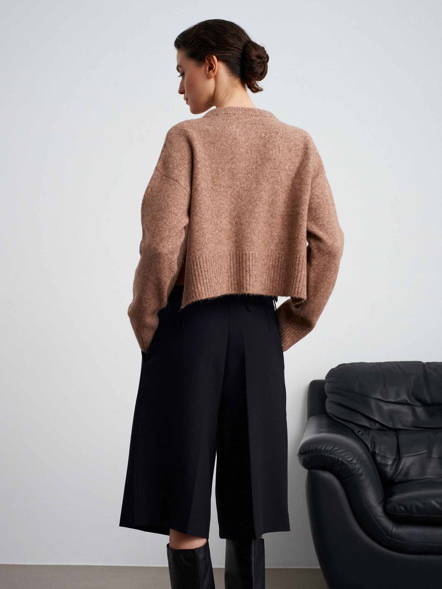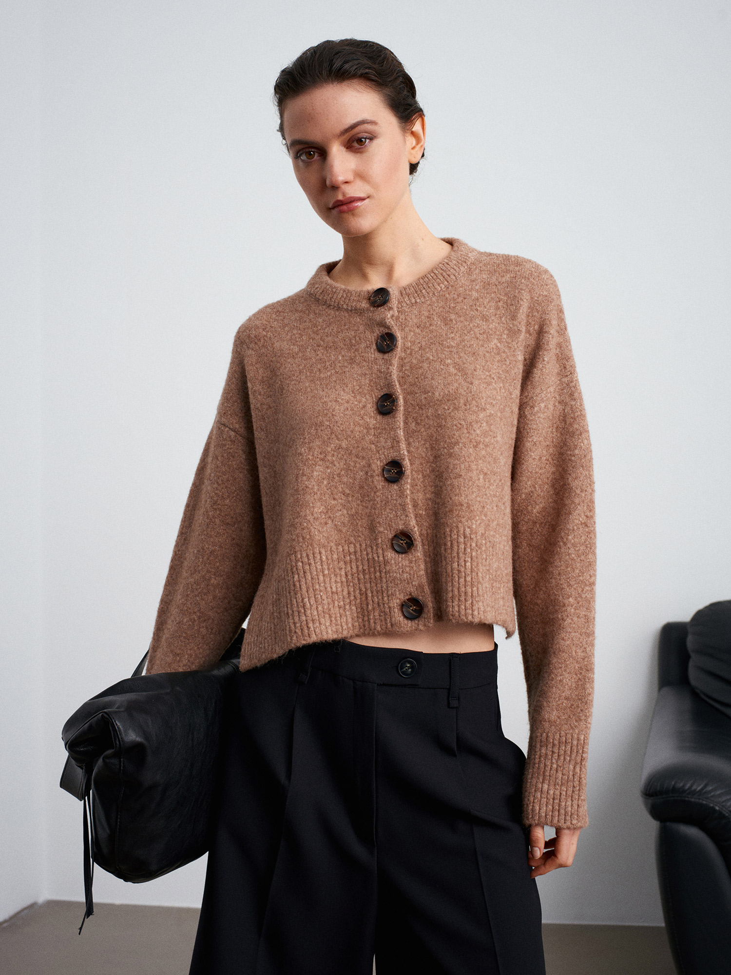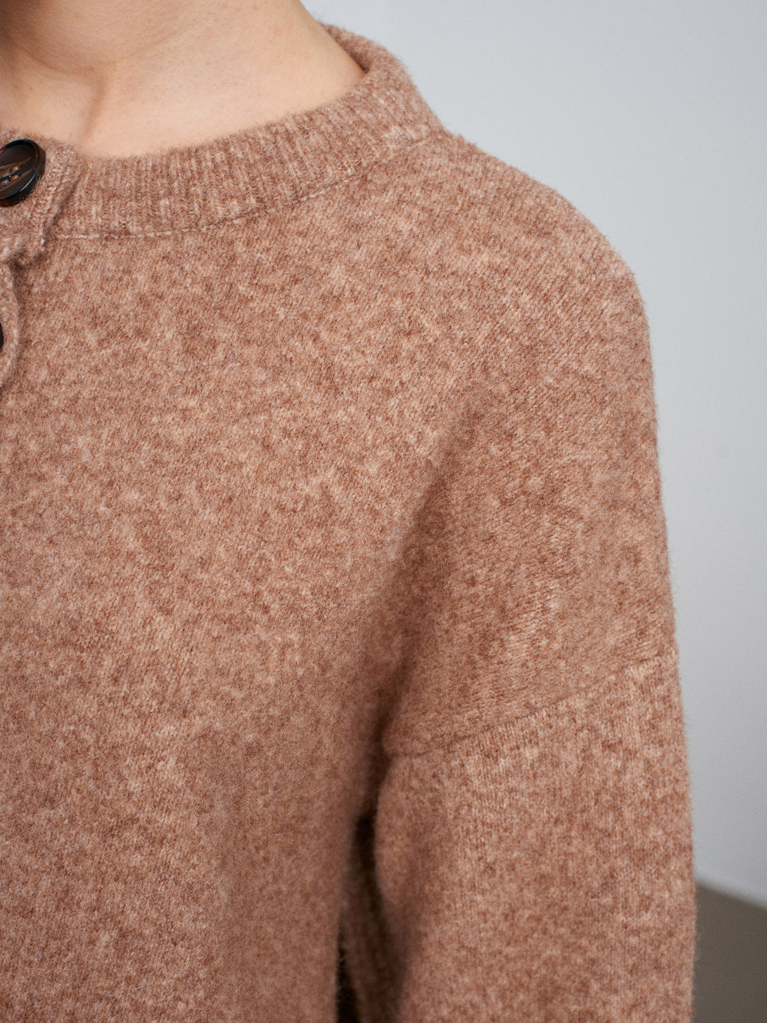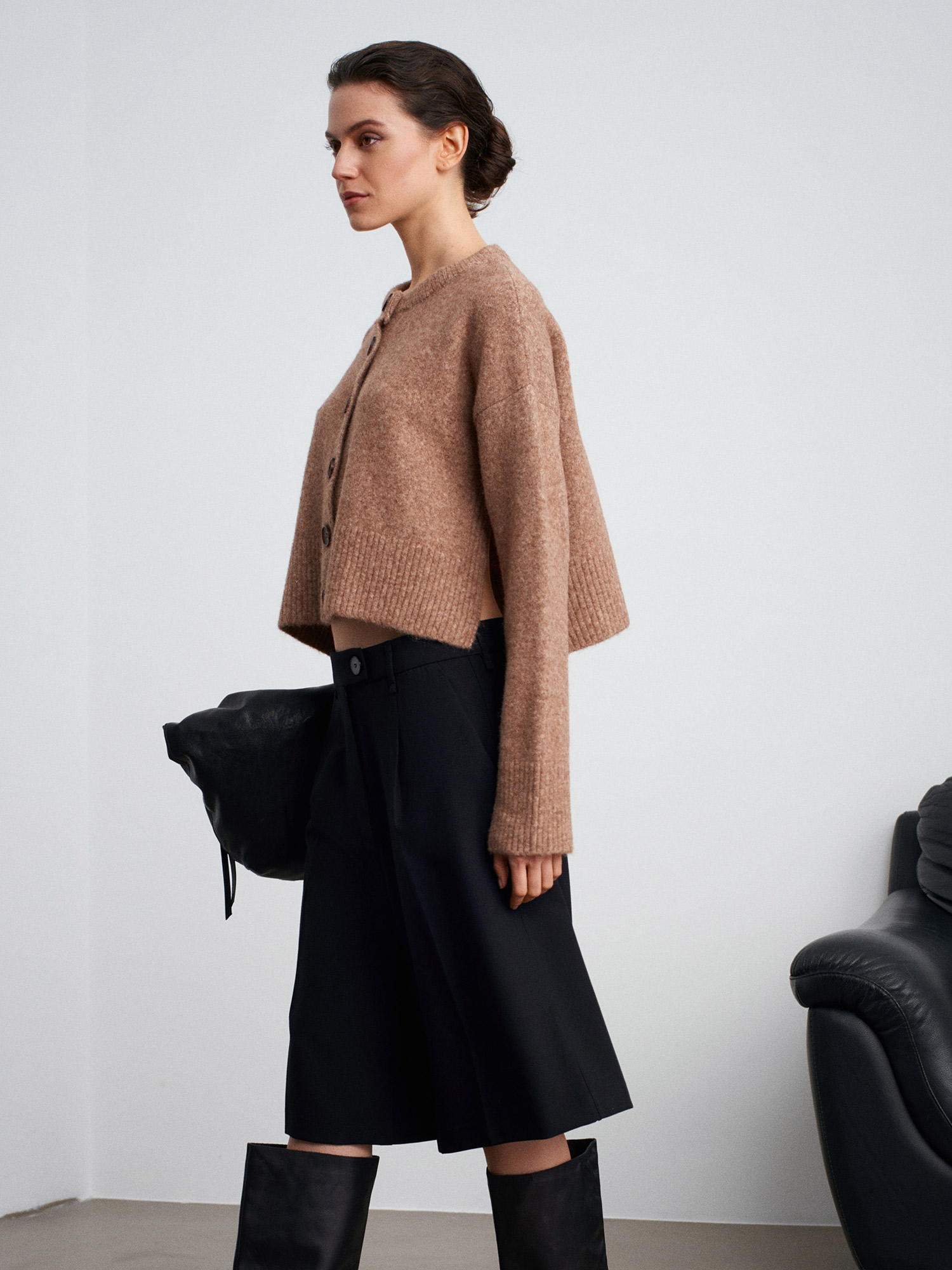 60280 Yanları Yırtmaçlı Yün Karışımlı Triko Hırka-K.Bej Mel.