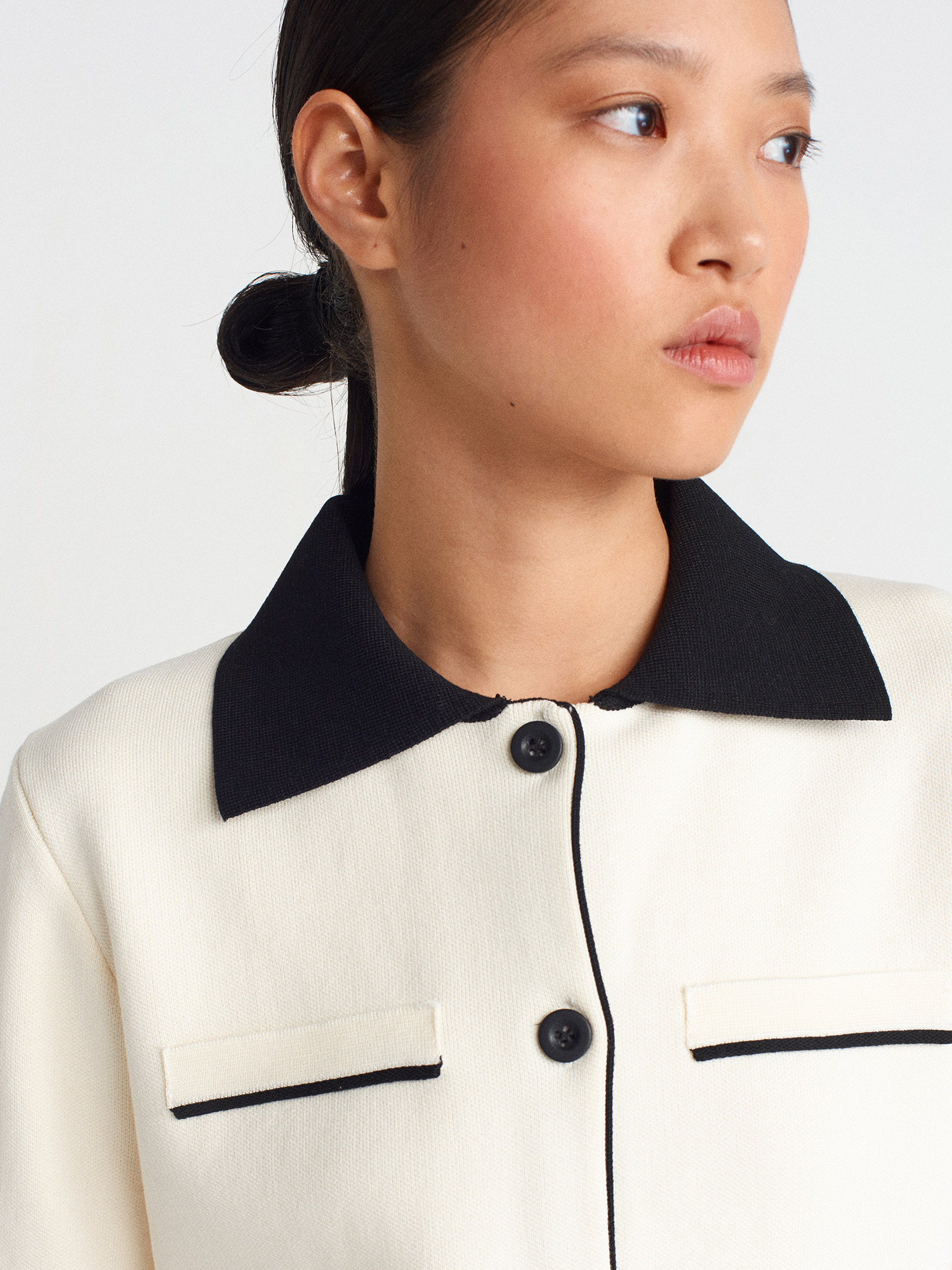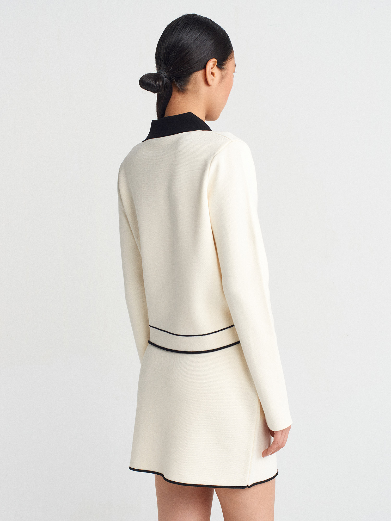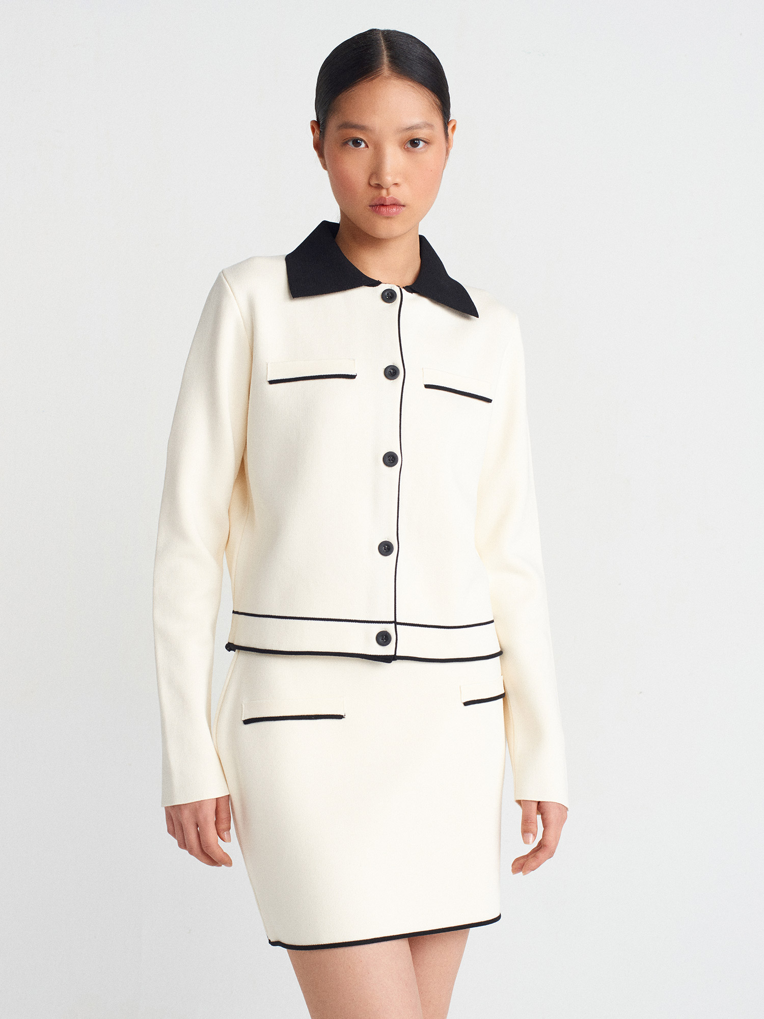 60297 Polo Yaka Düğmeli Triko Hırka-Ekru-Siyah