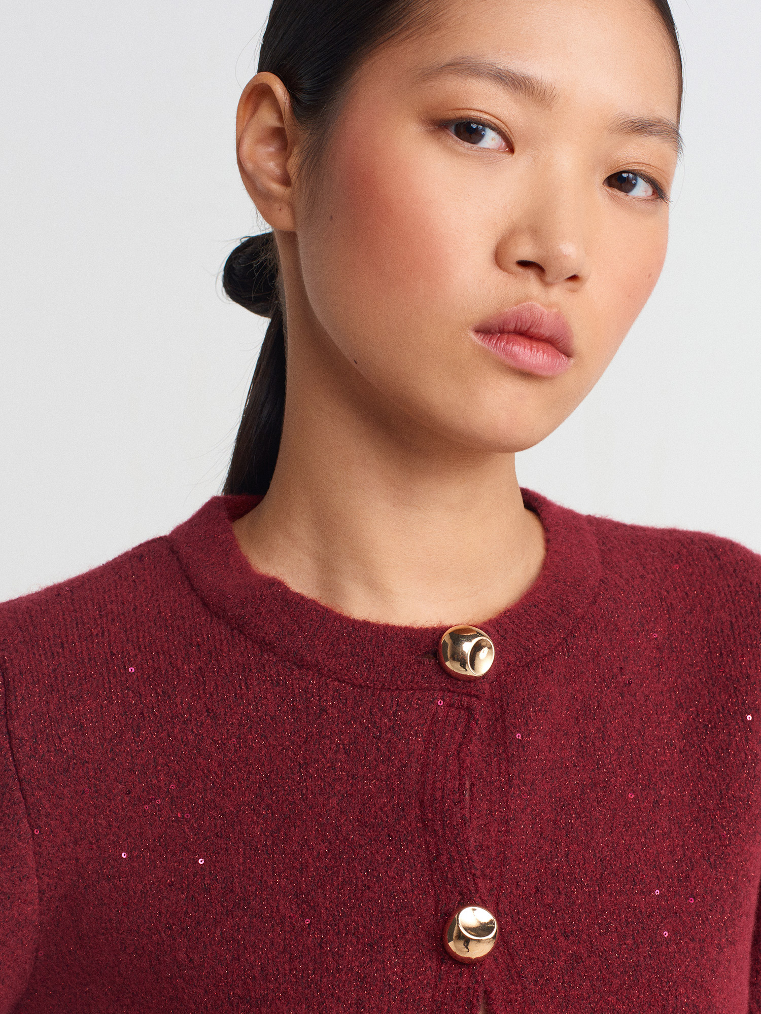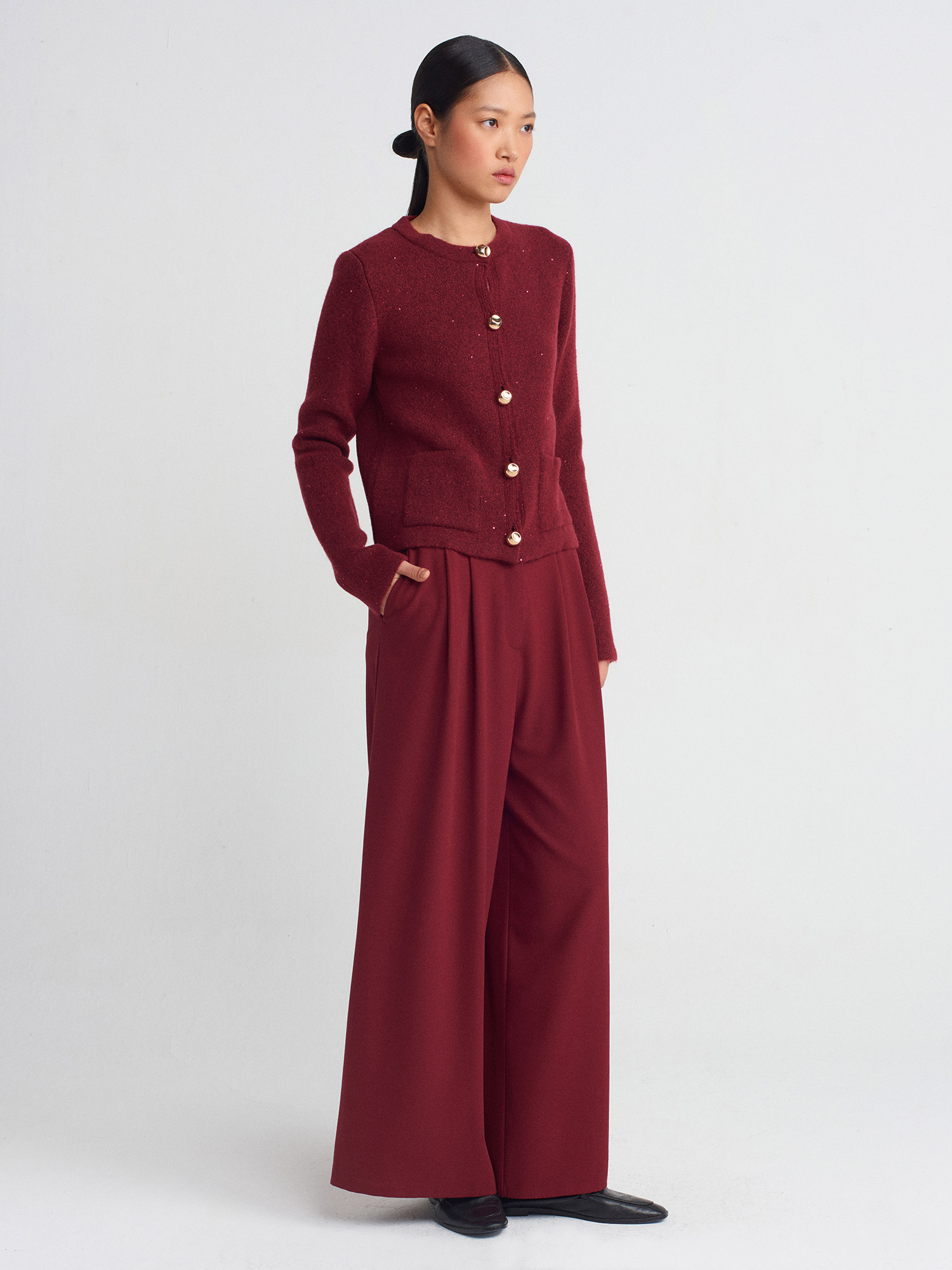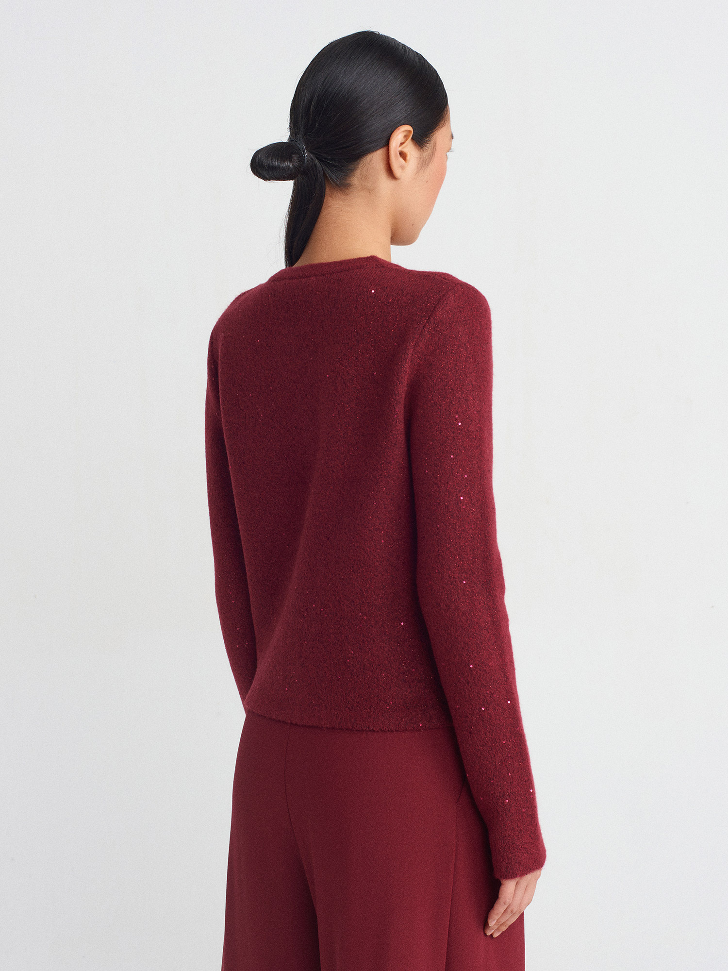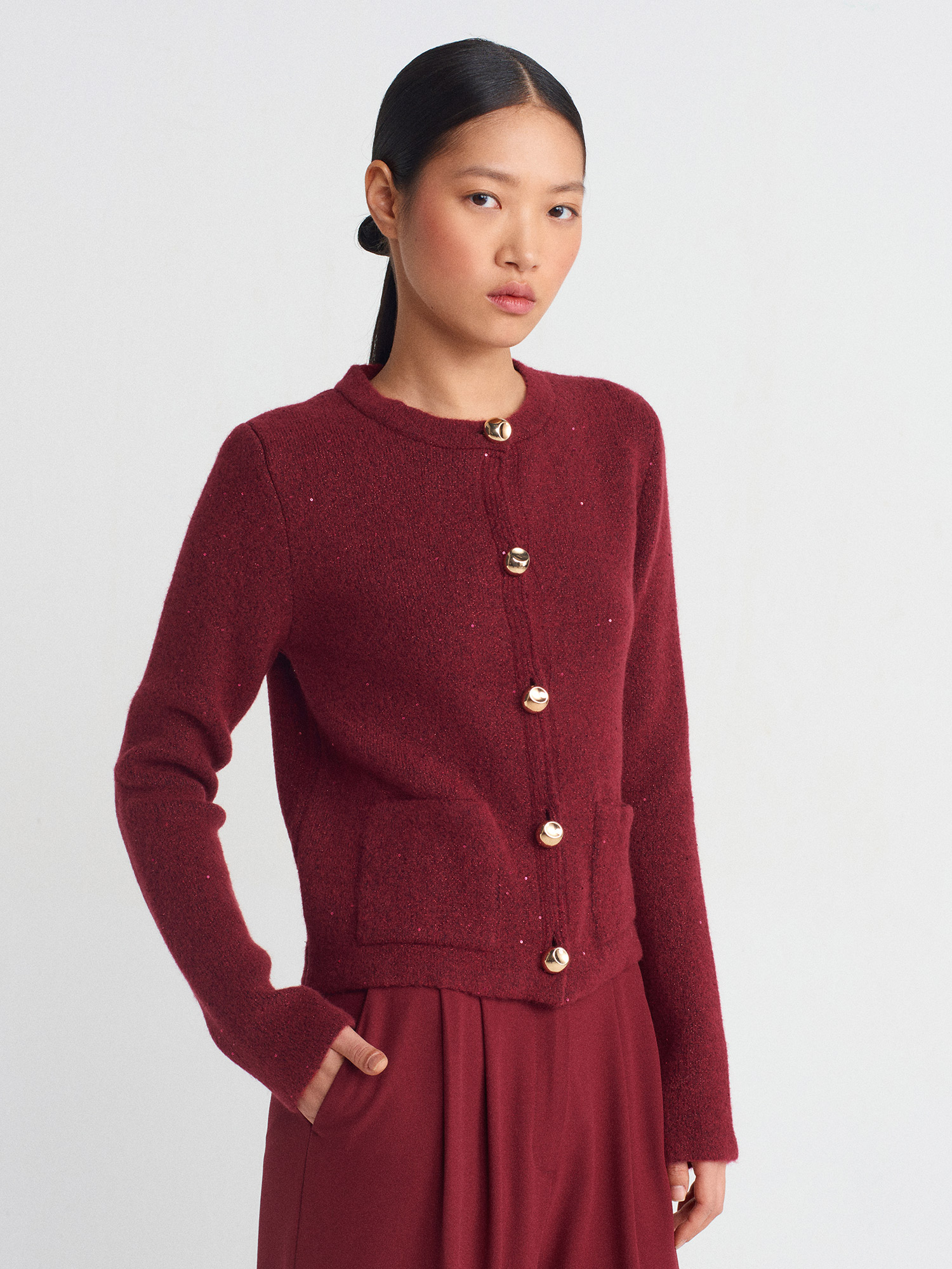 60935 Bisiklet Yaka Pullu Simli Düğmeli Triko Hırka-Bordo