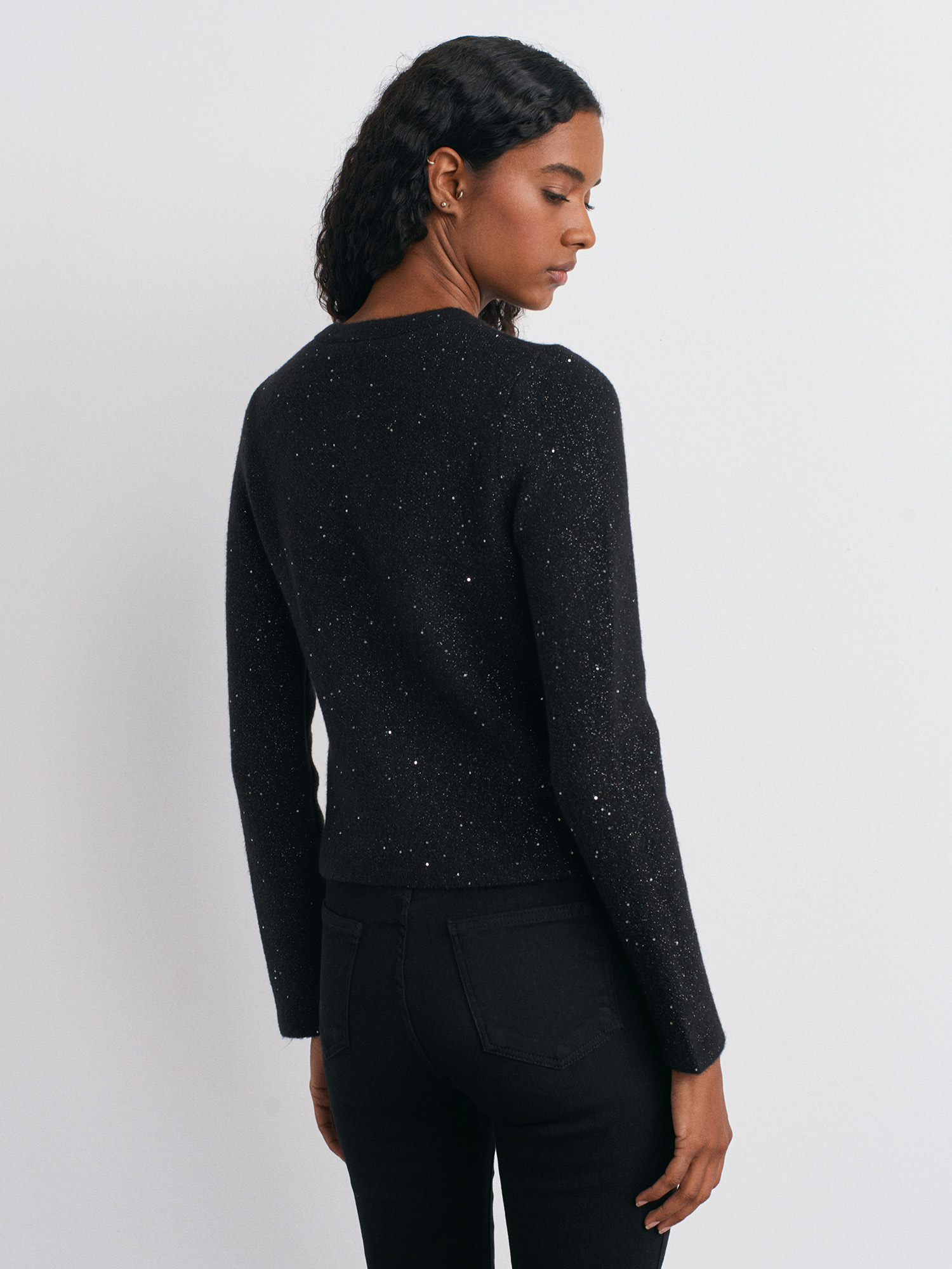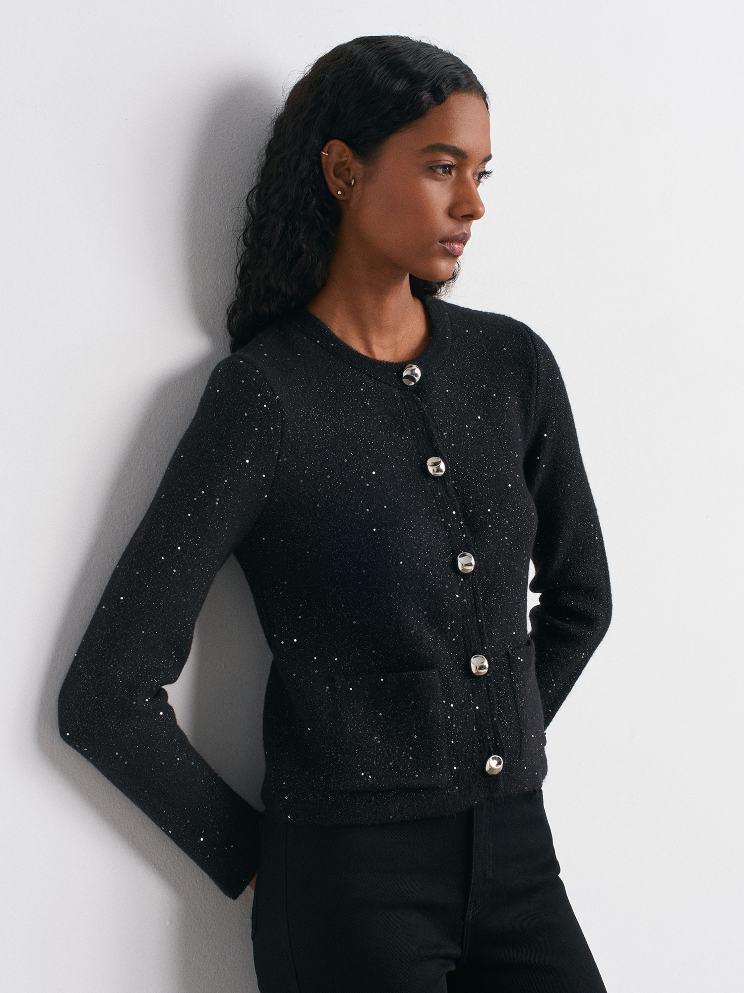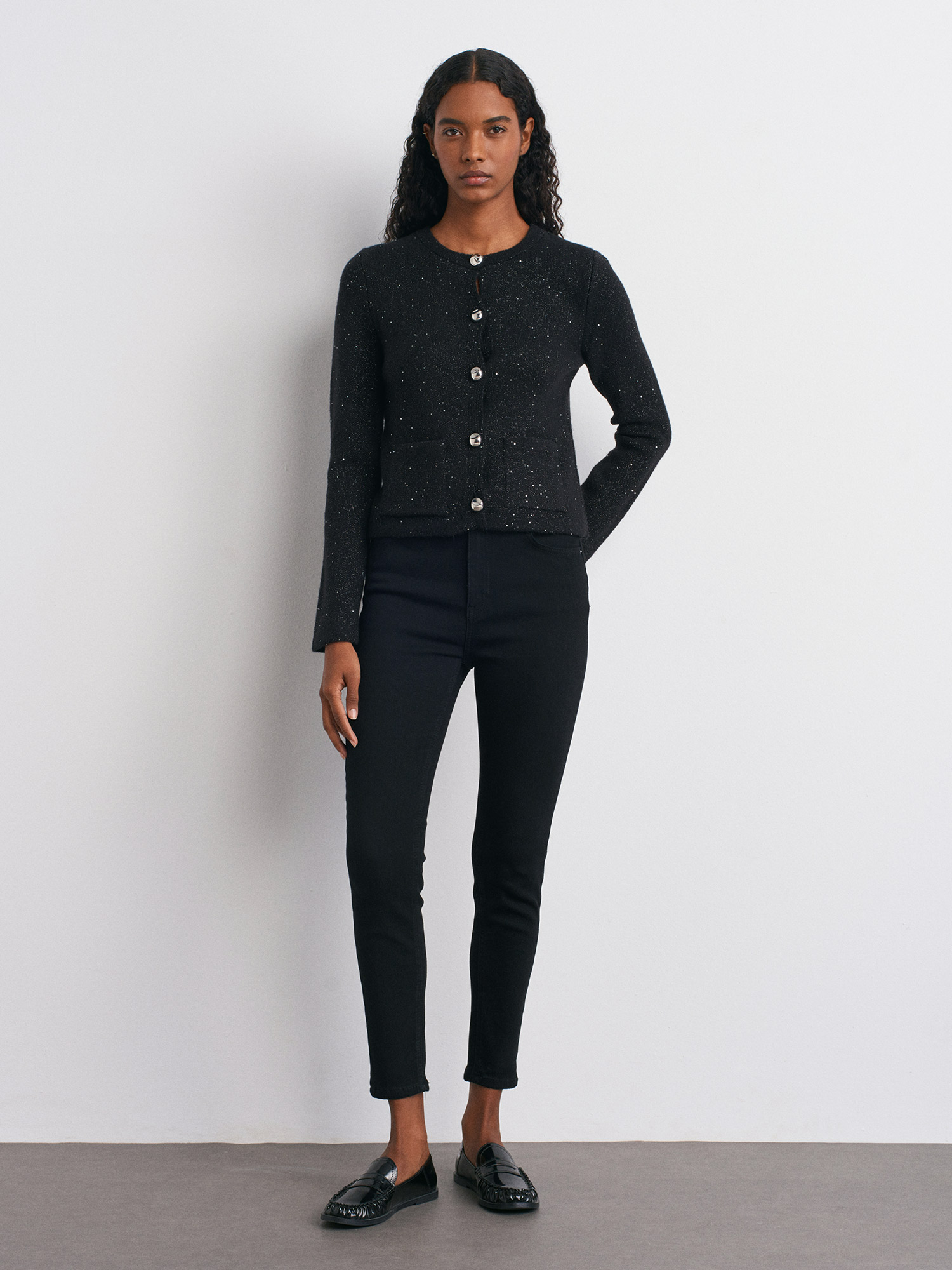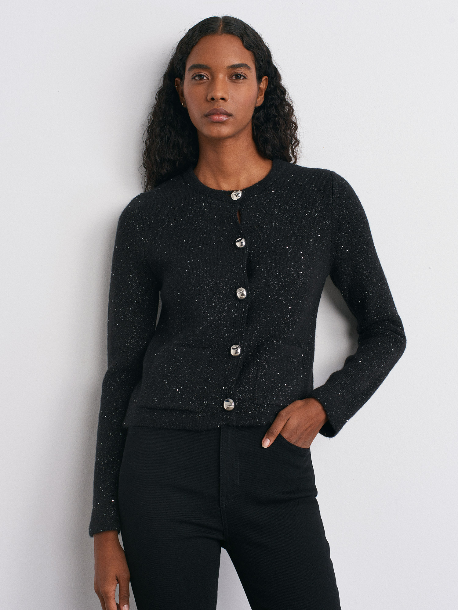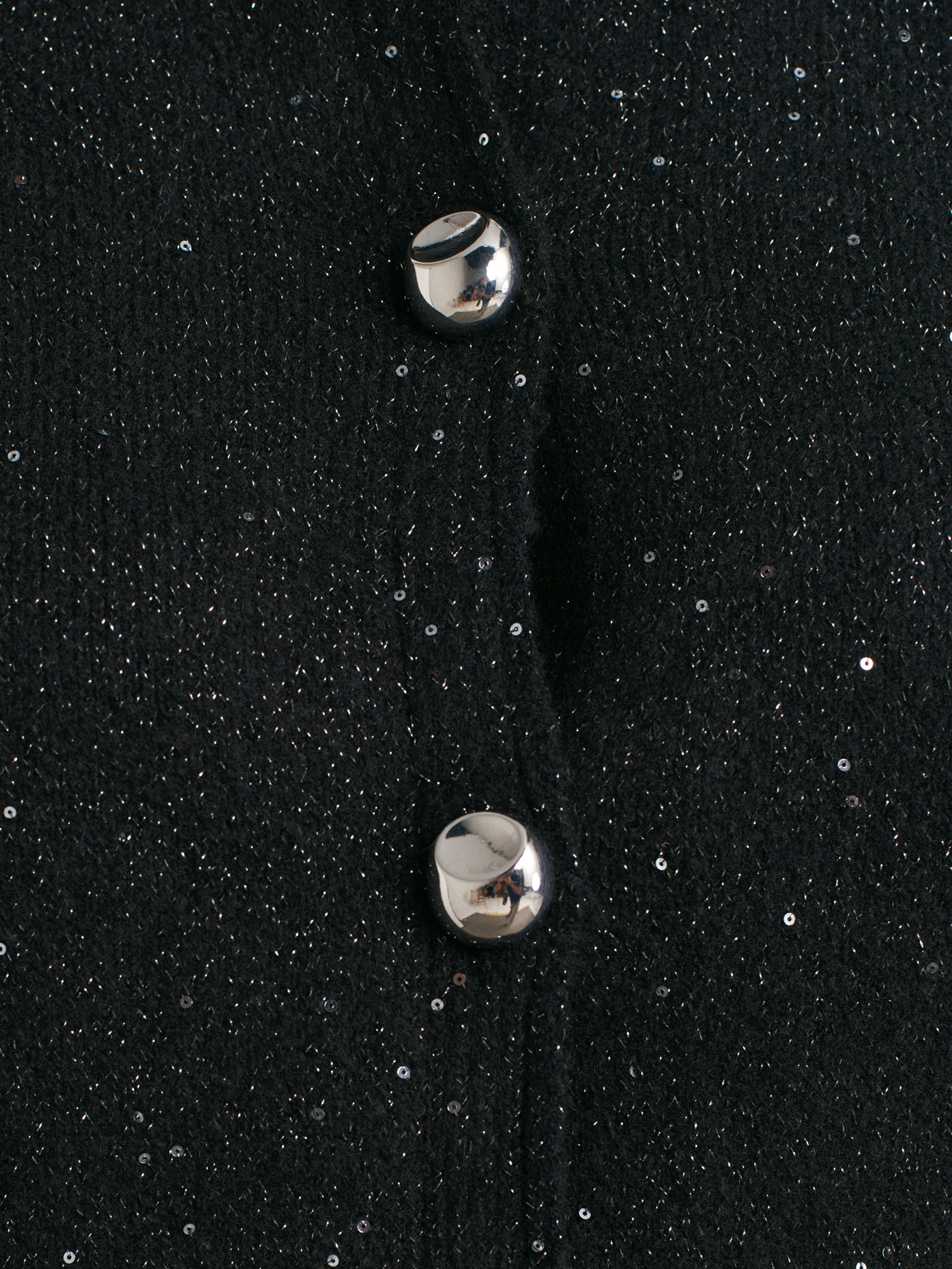 60935 Bisiklet Yaka Pullu Simli Düğmeli Triko Hırka-Siyah