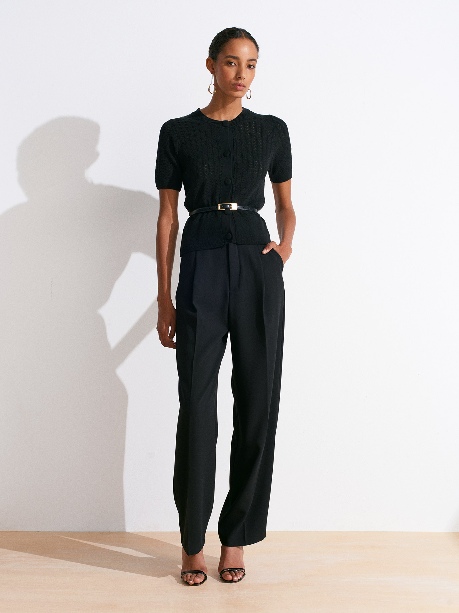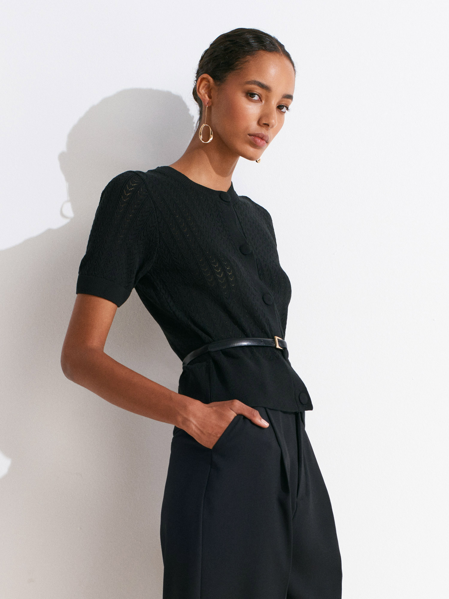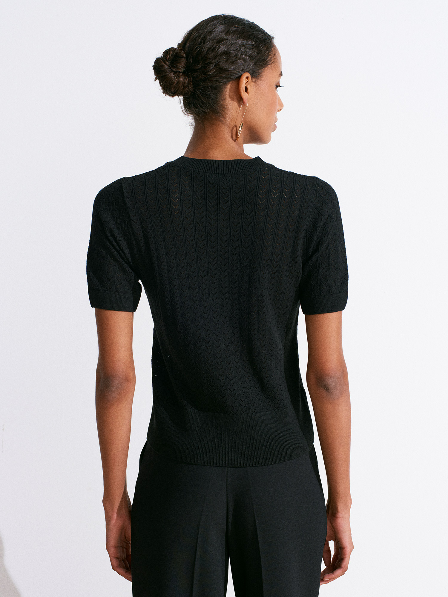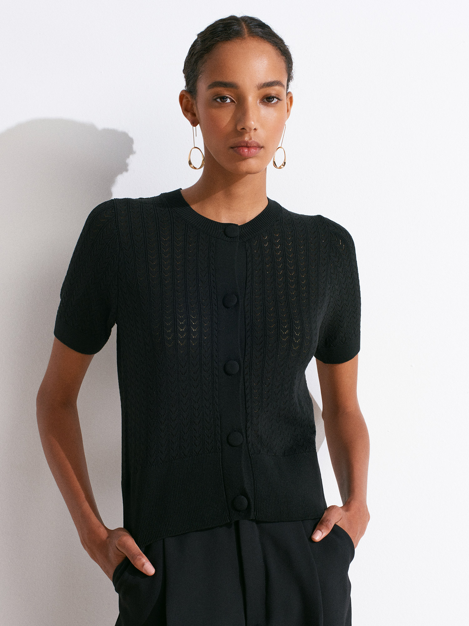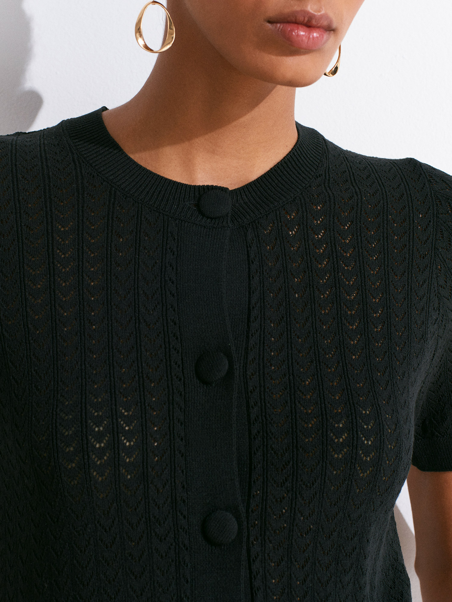60974 Bisiklet Yaka Ajurlu Düğmeli Triko Hırka-Siyah