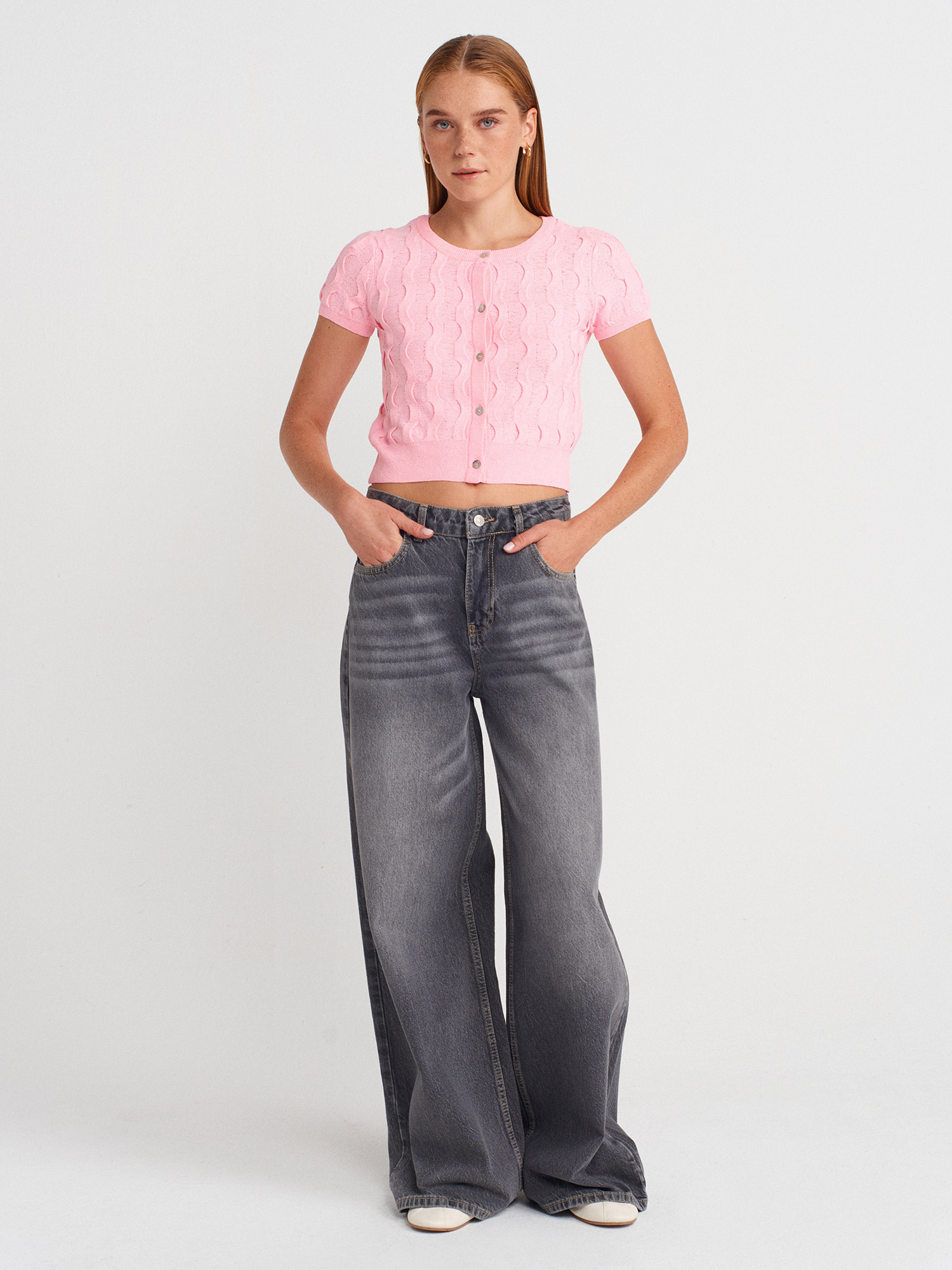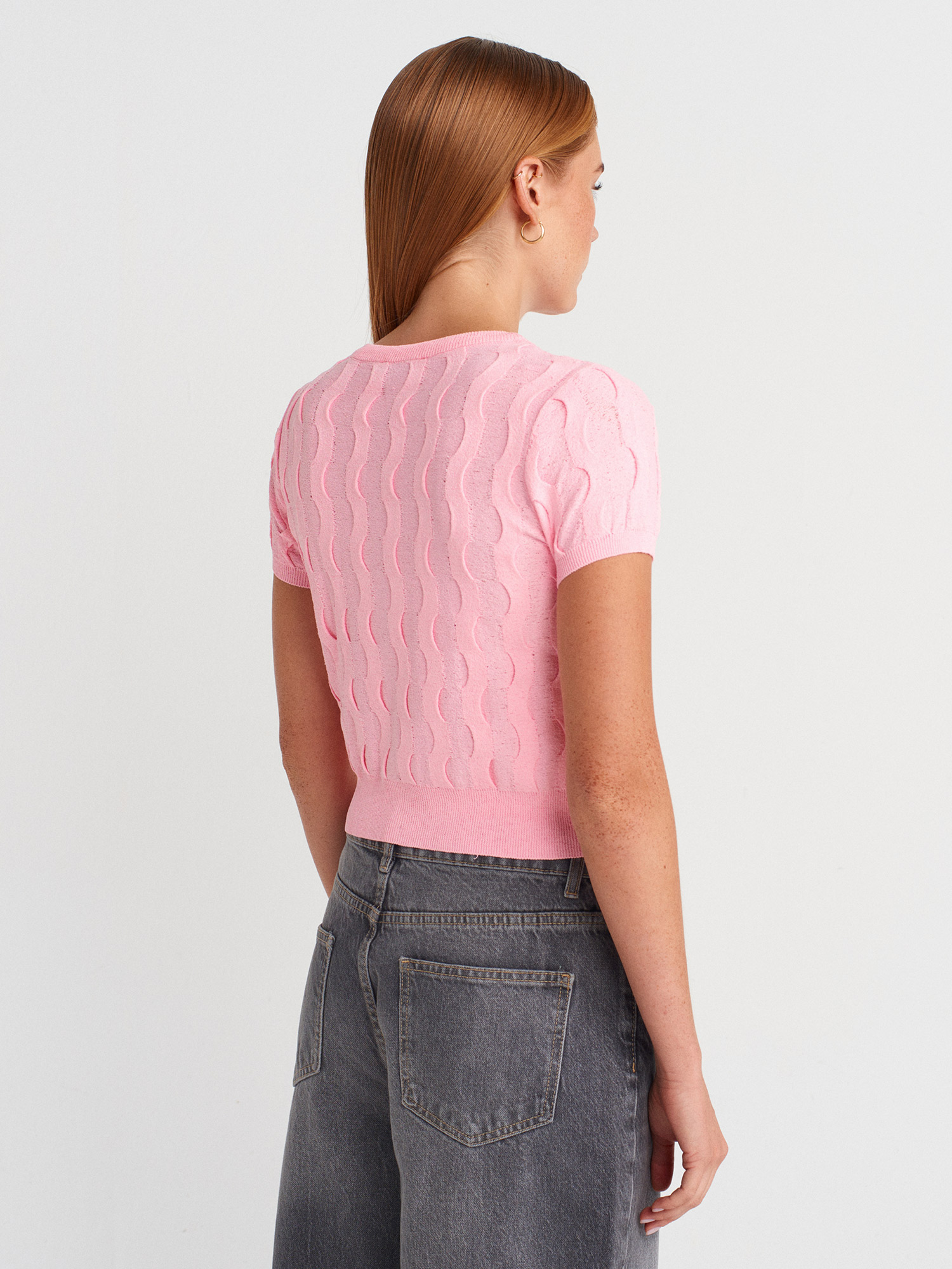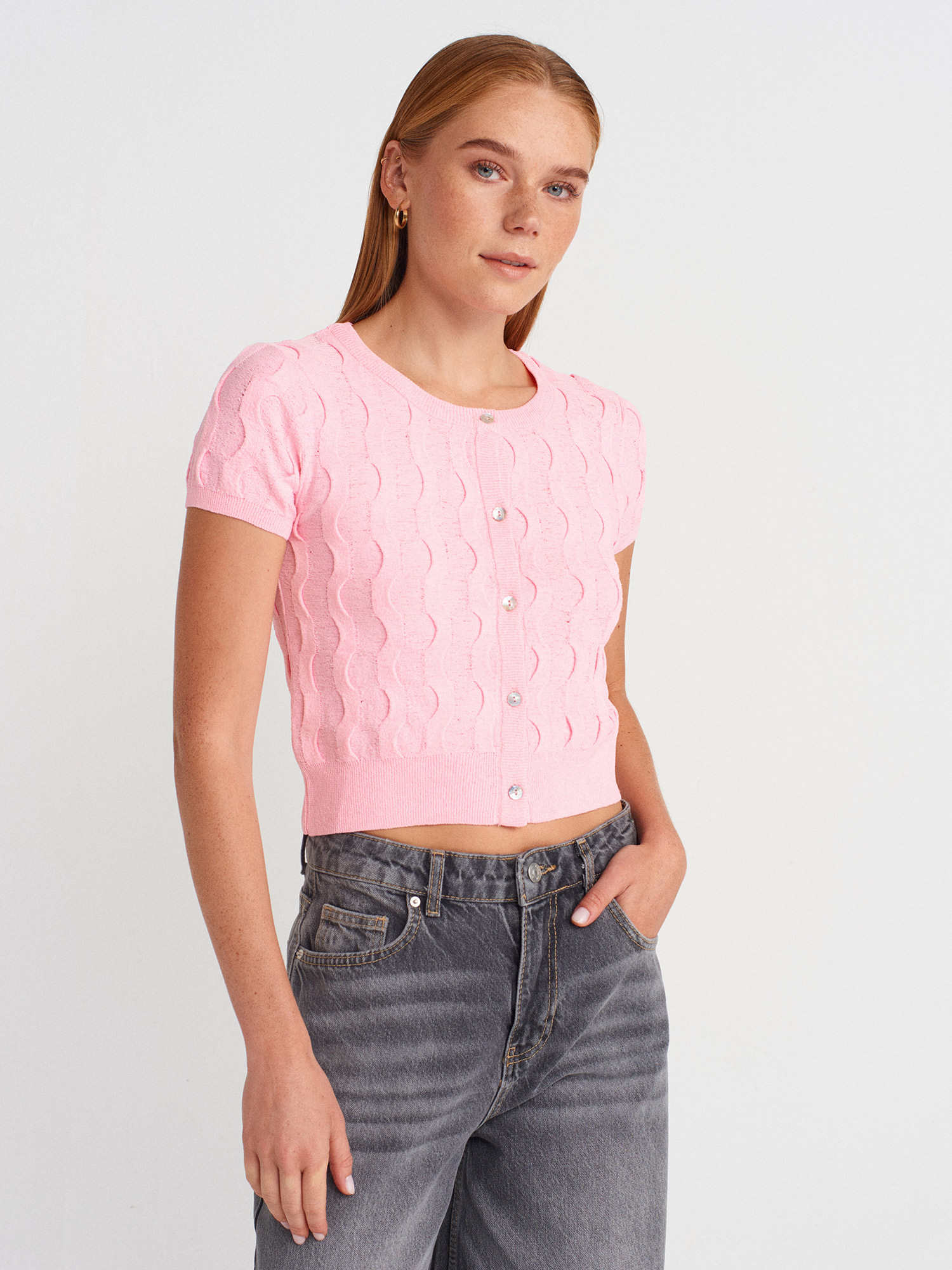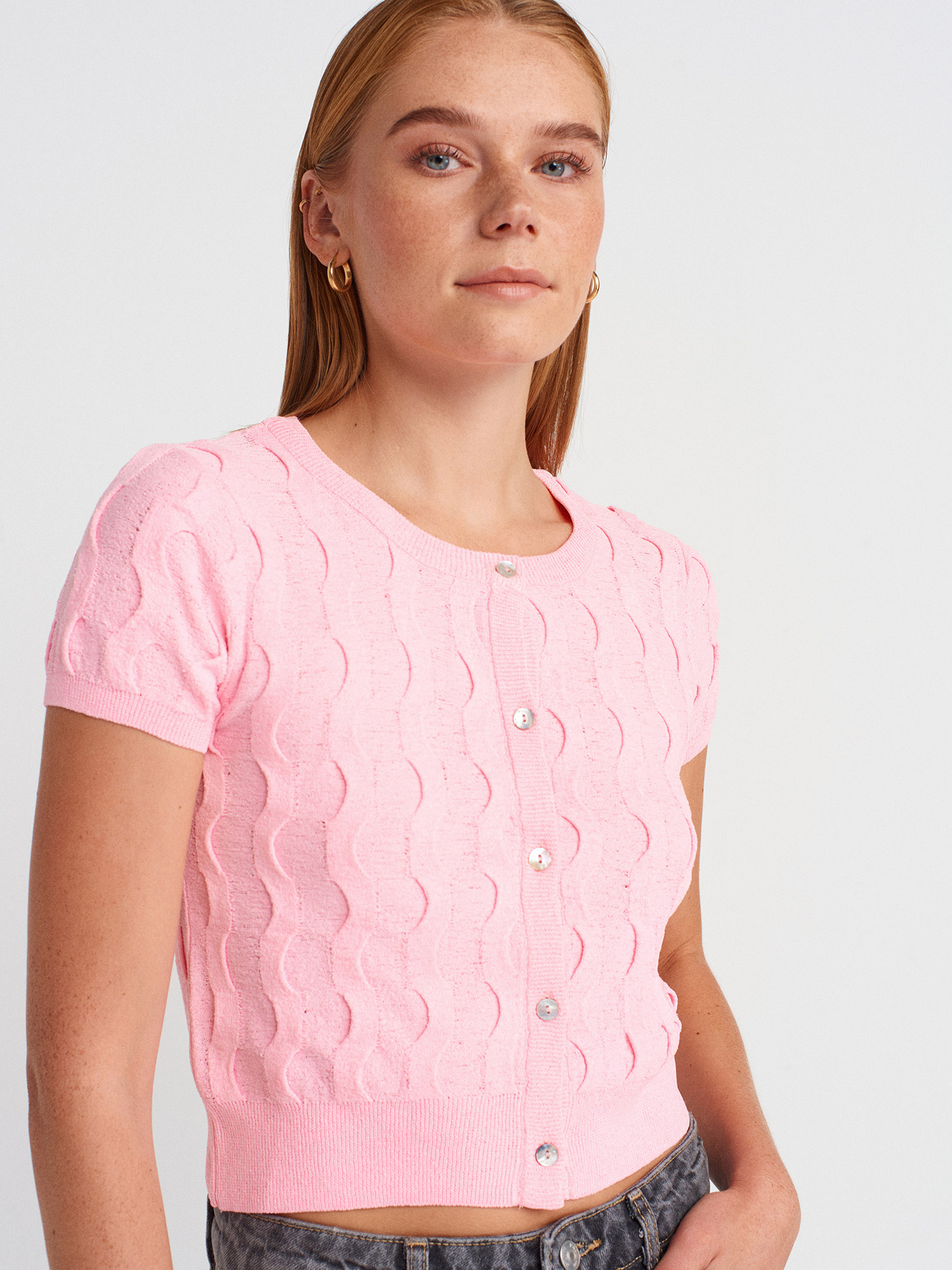 60980 Bisiklet Yaka Dokulu Düğmeli Triko Hırka-Pembe