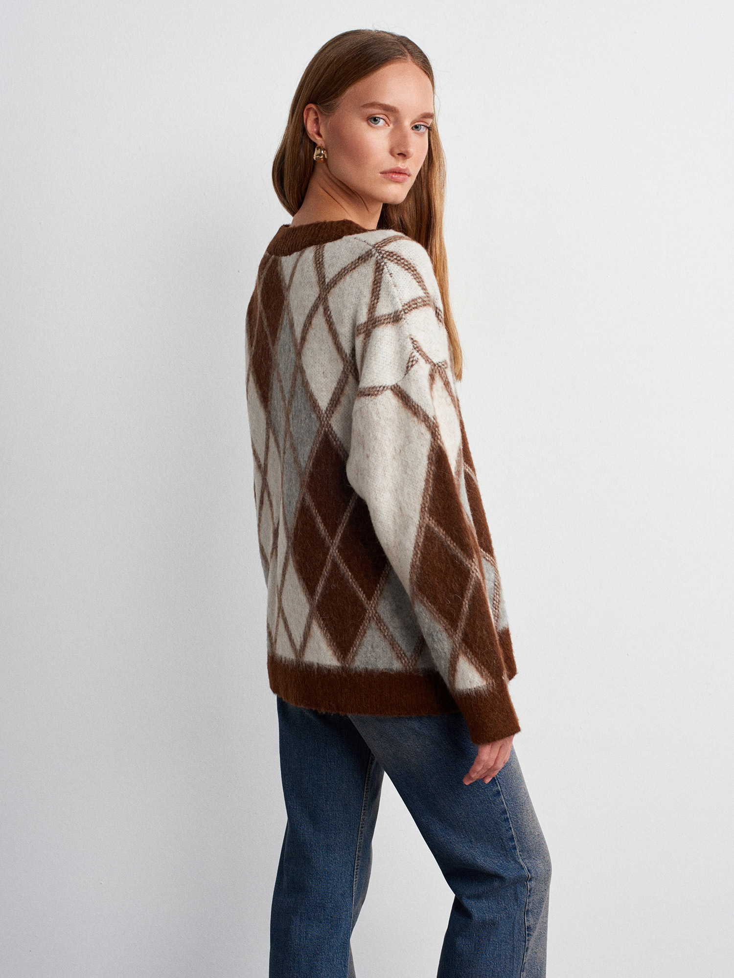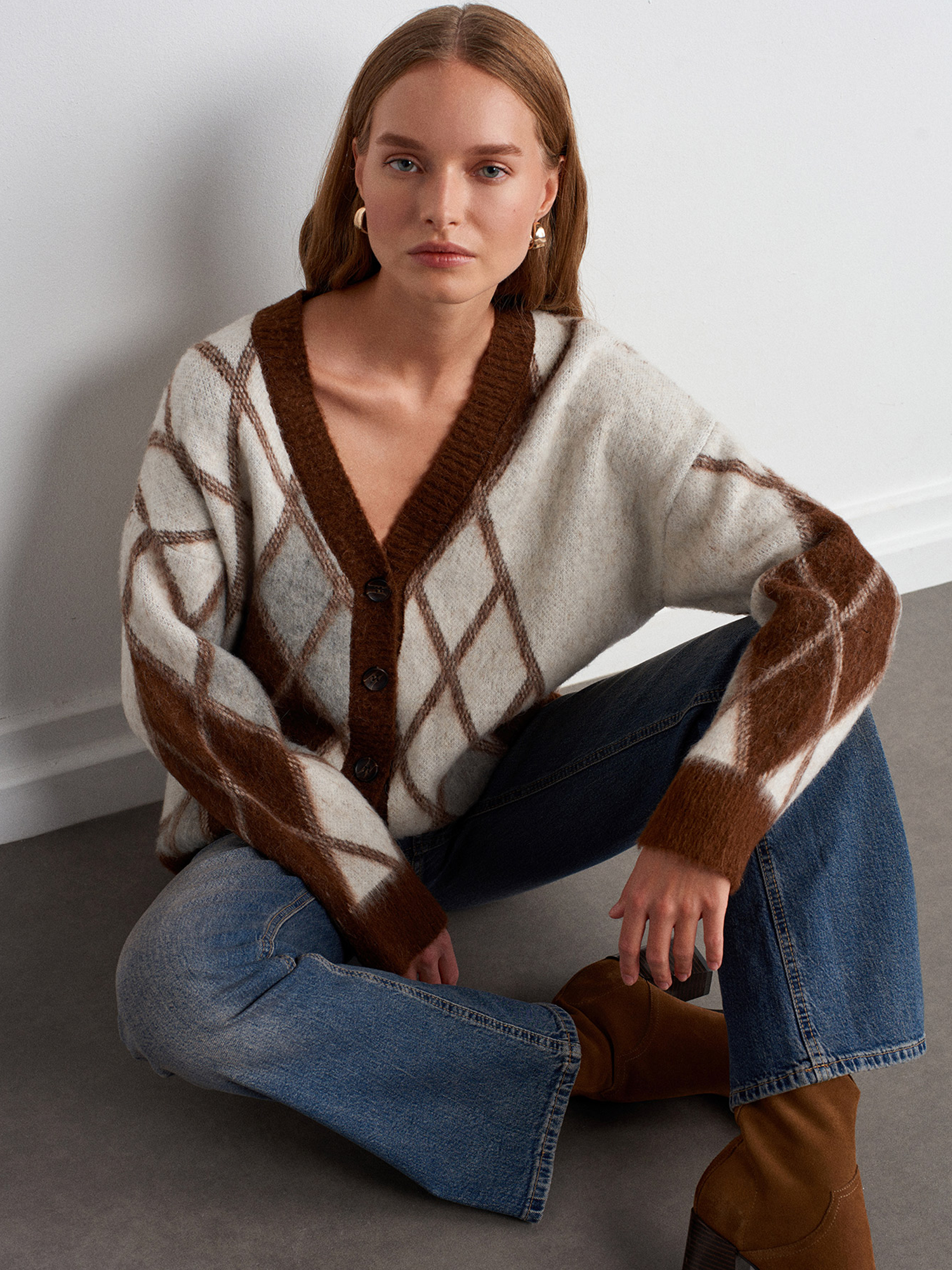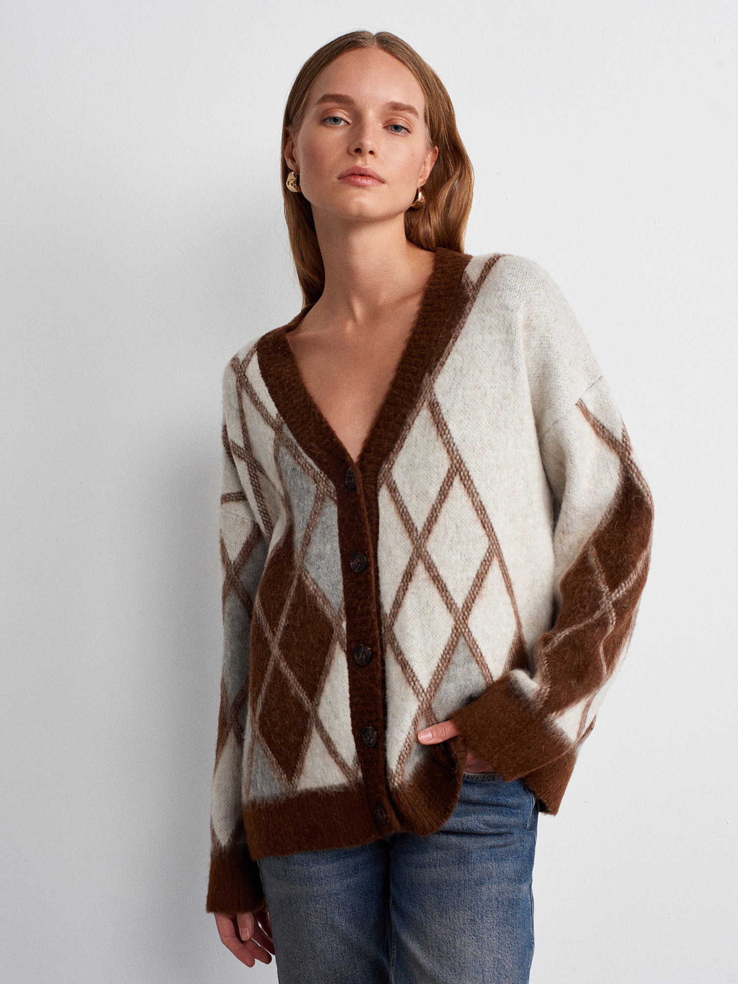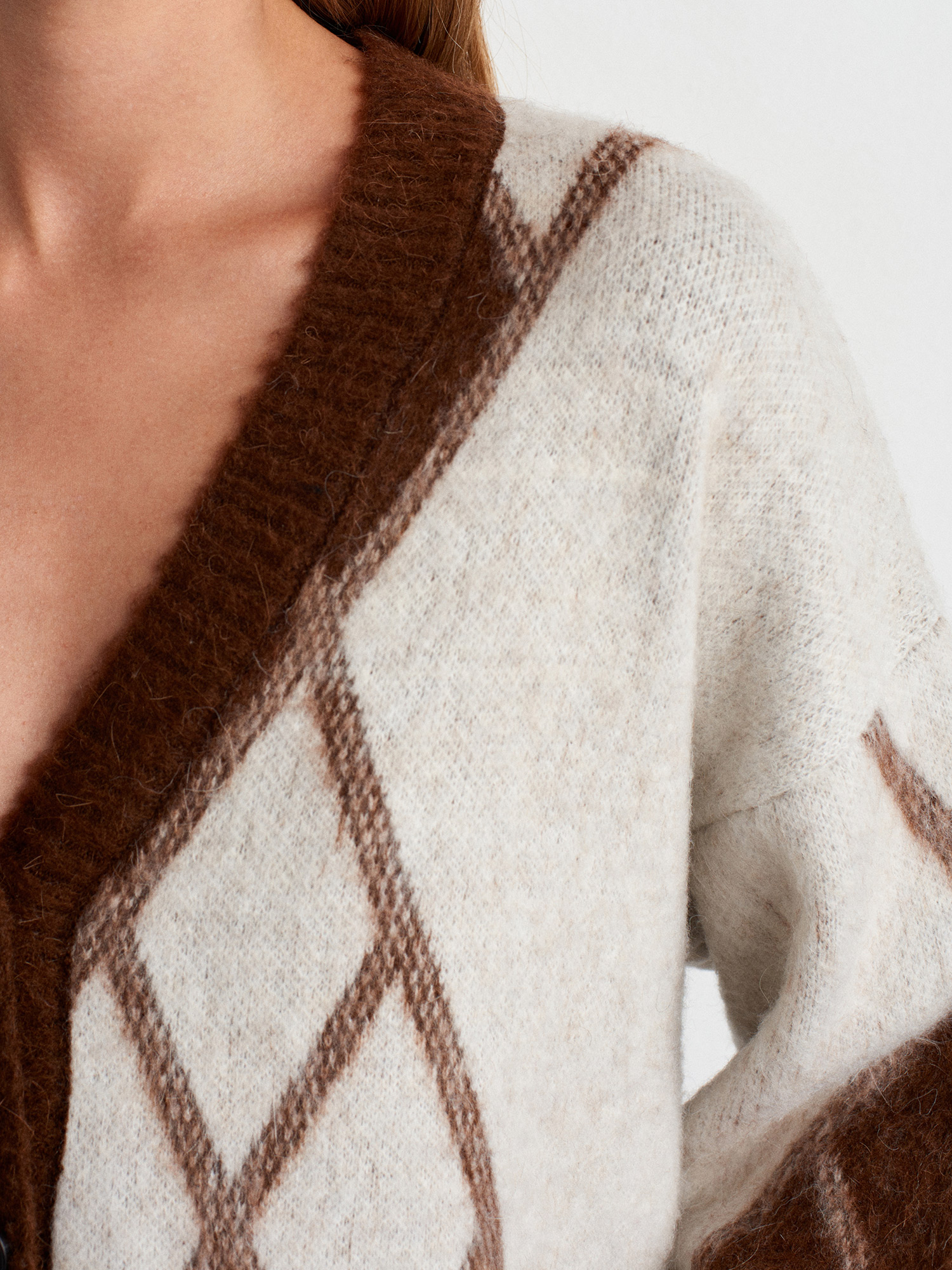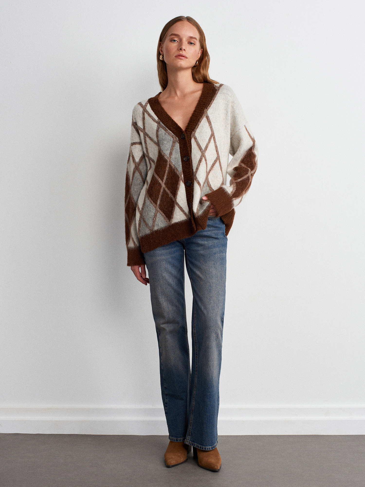60989 Baklava Desenli Alpaka Karışımlı Triko Hırka-Kahve