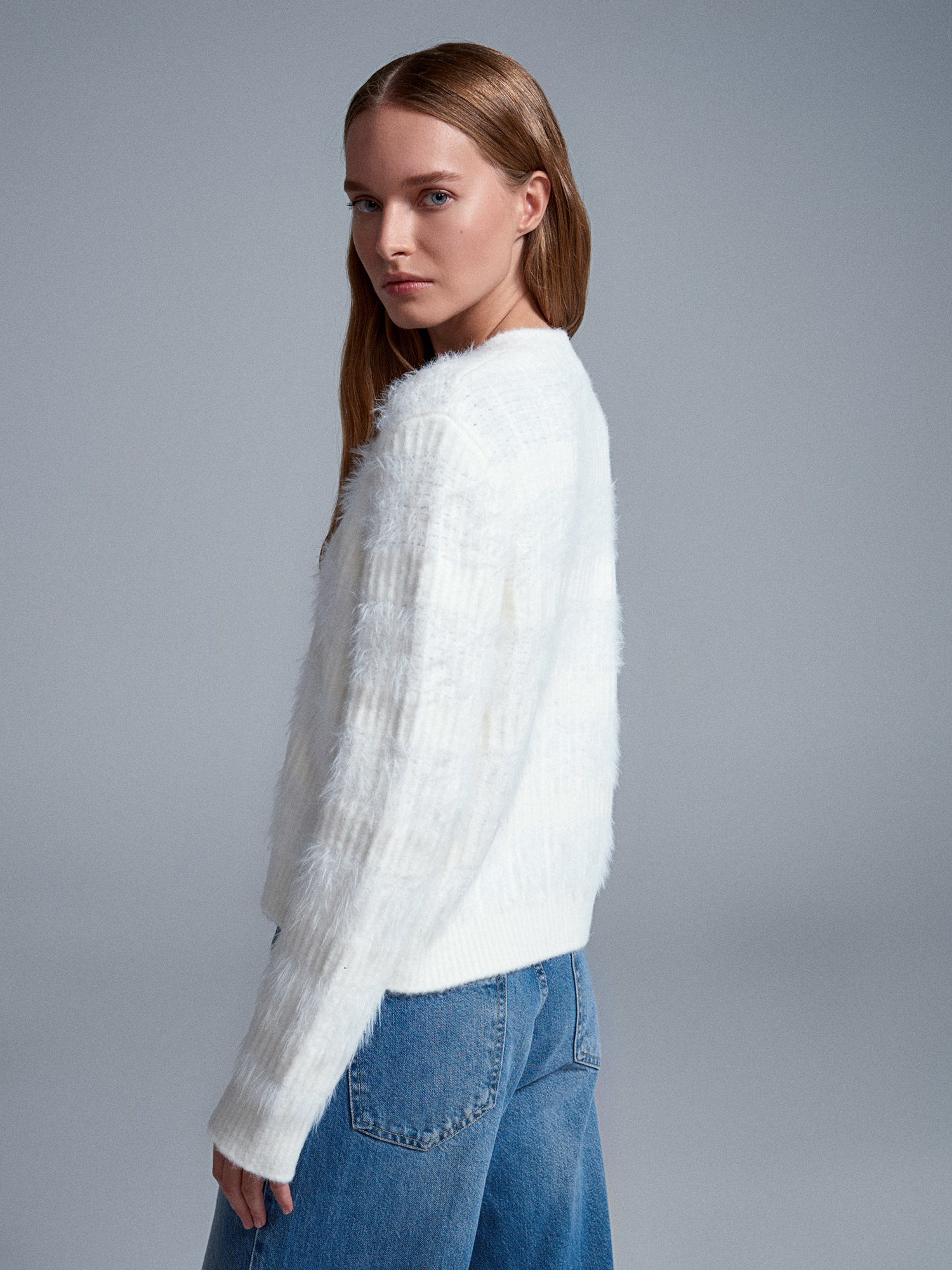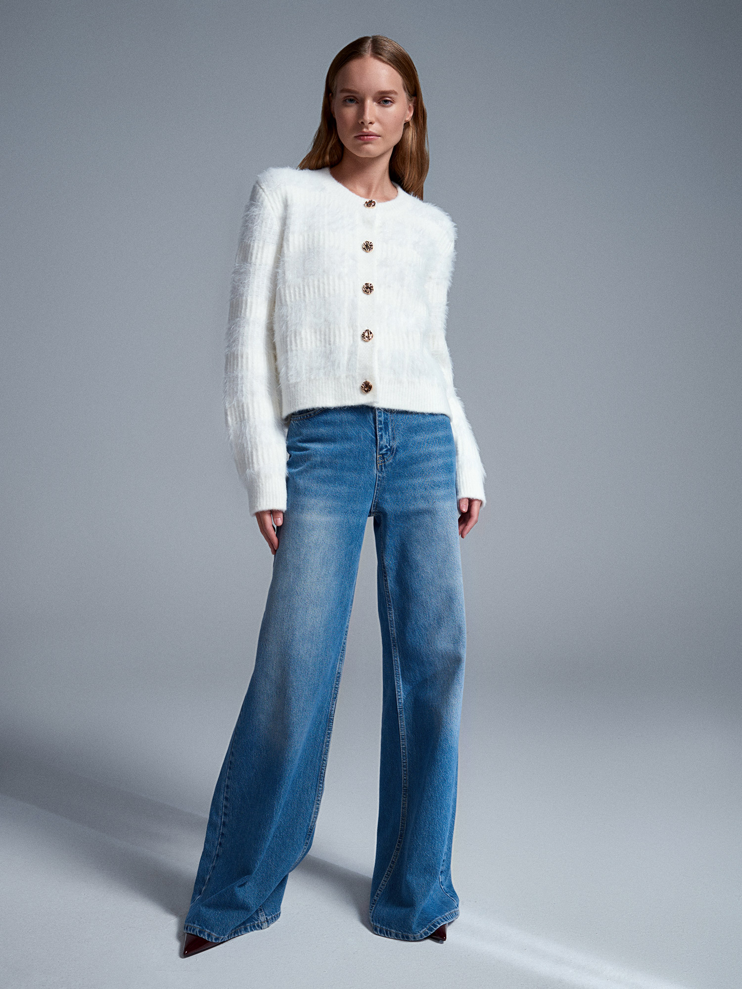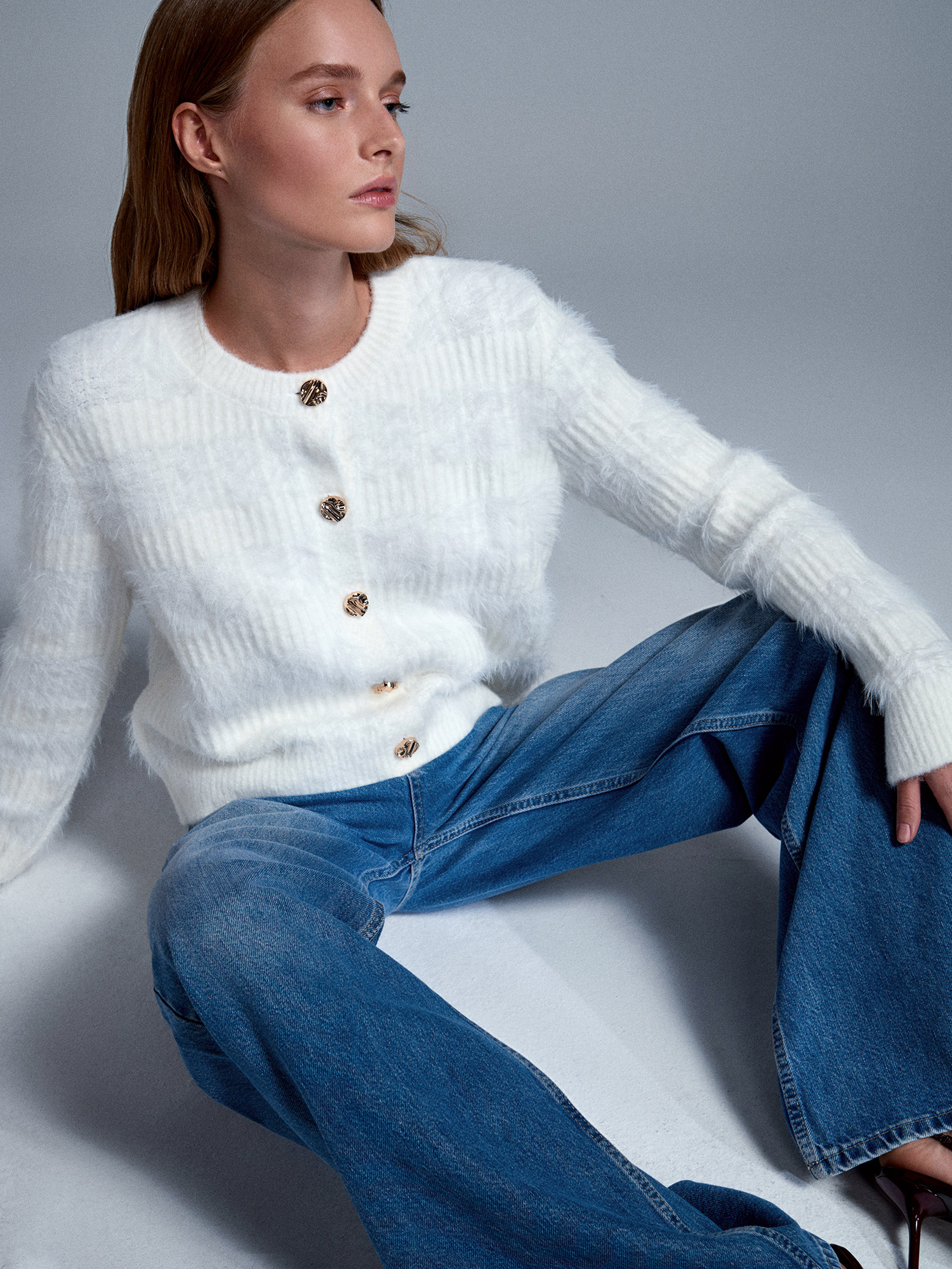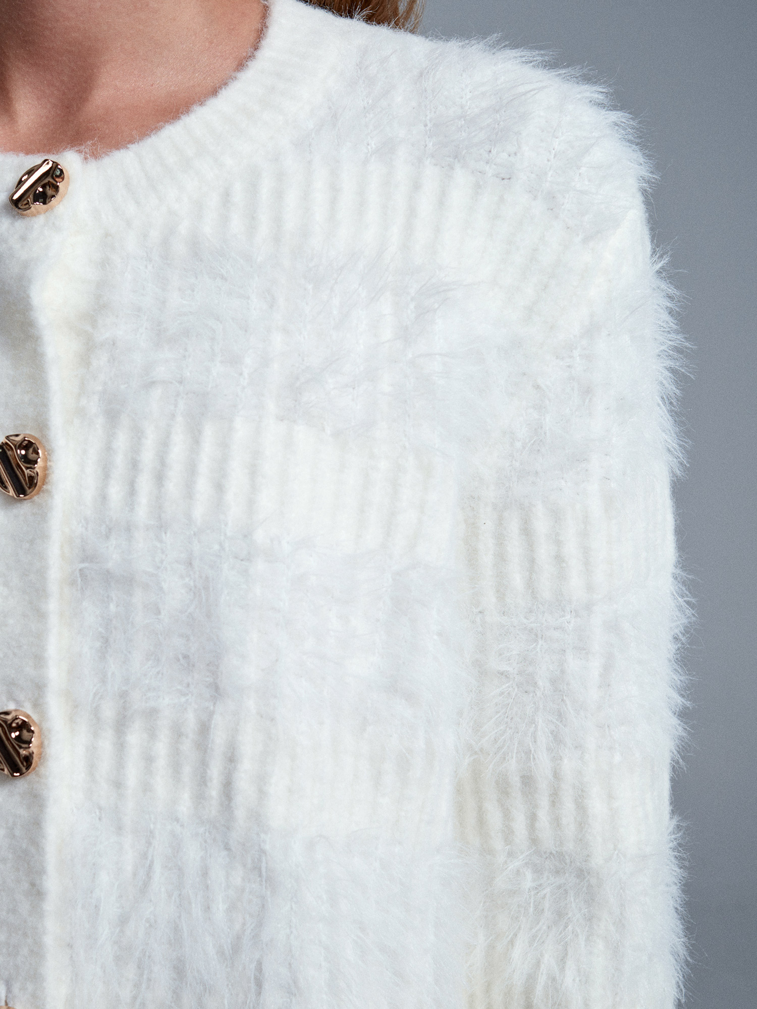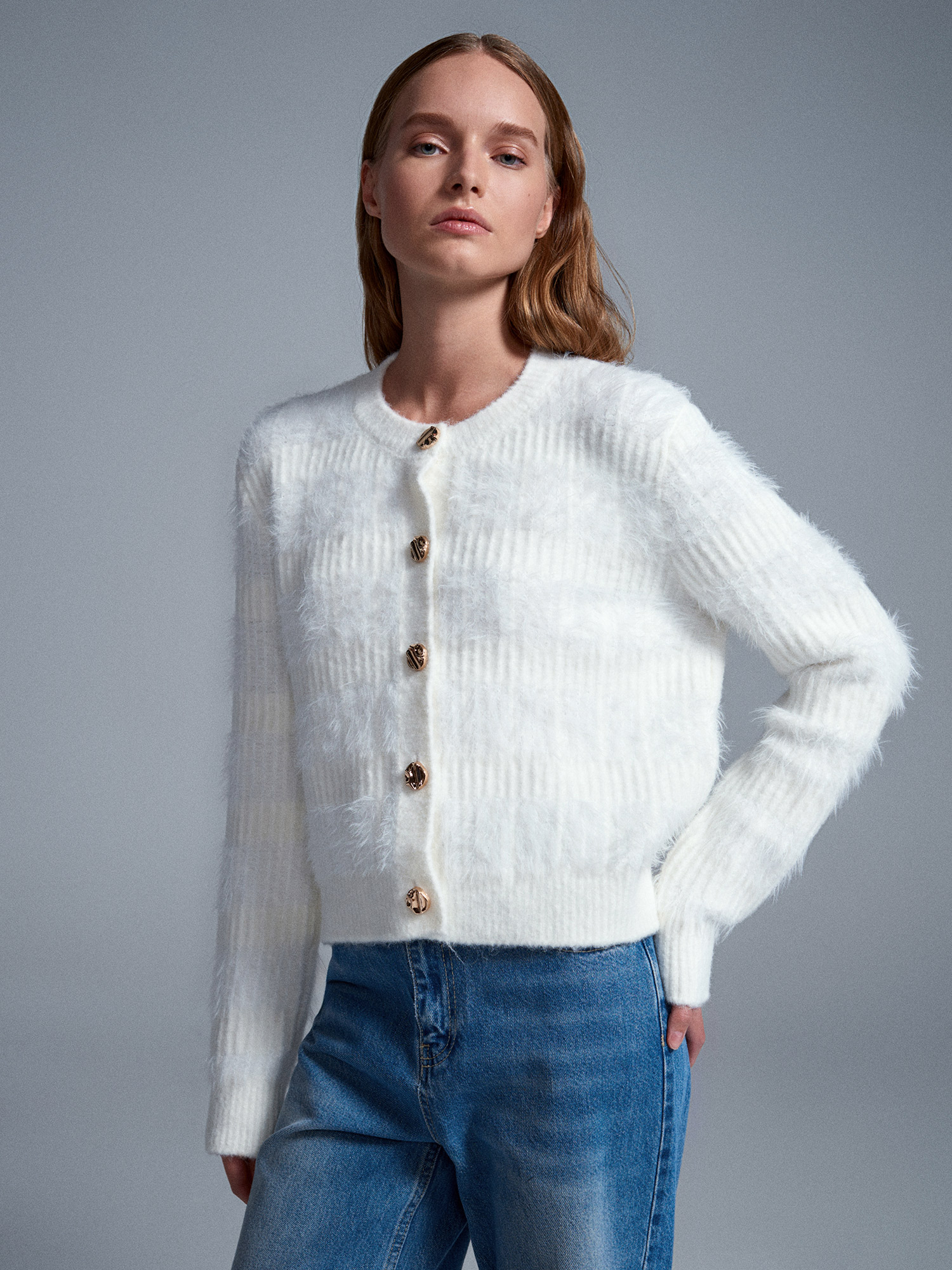 60990 Yün Karışımlı Düğmeli Triko Hırka-Ekru
