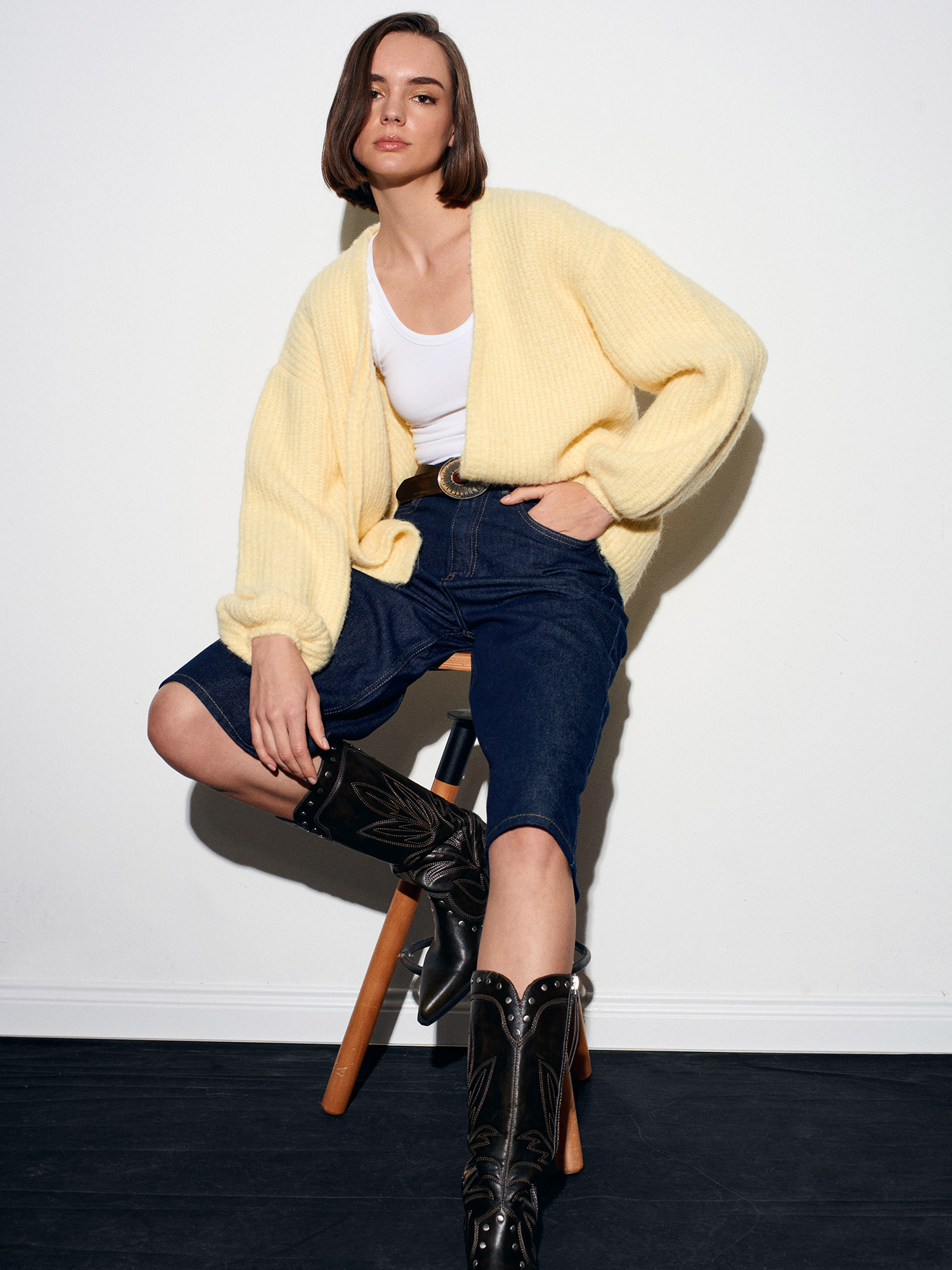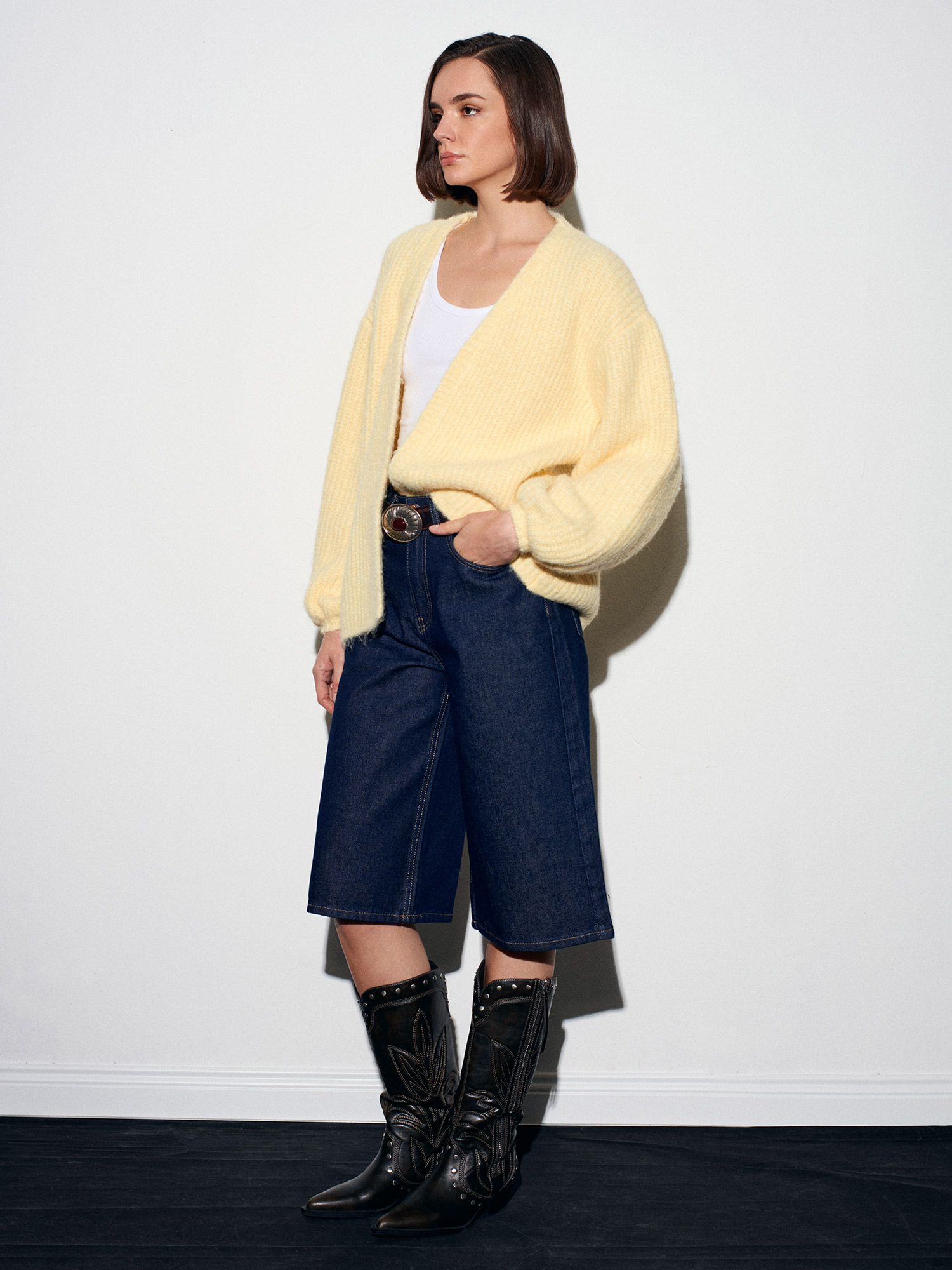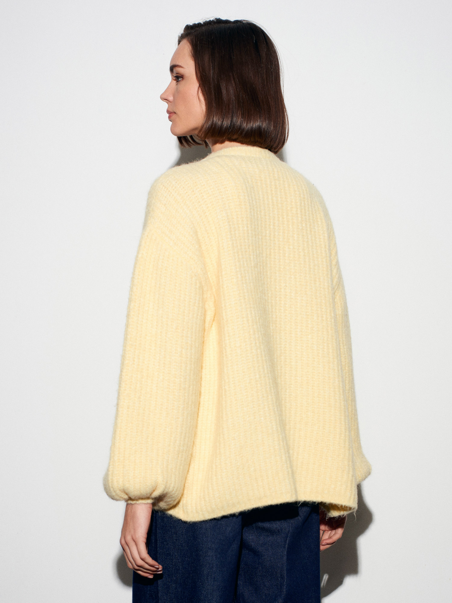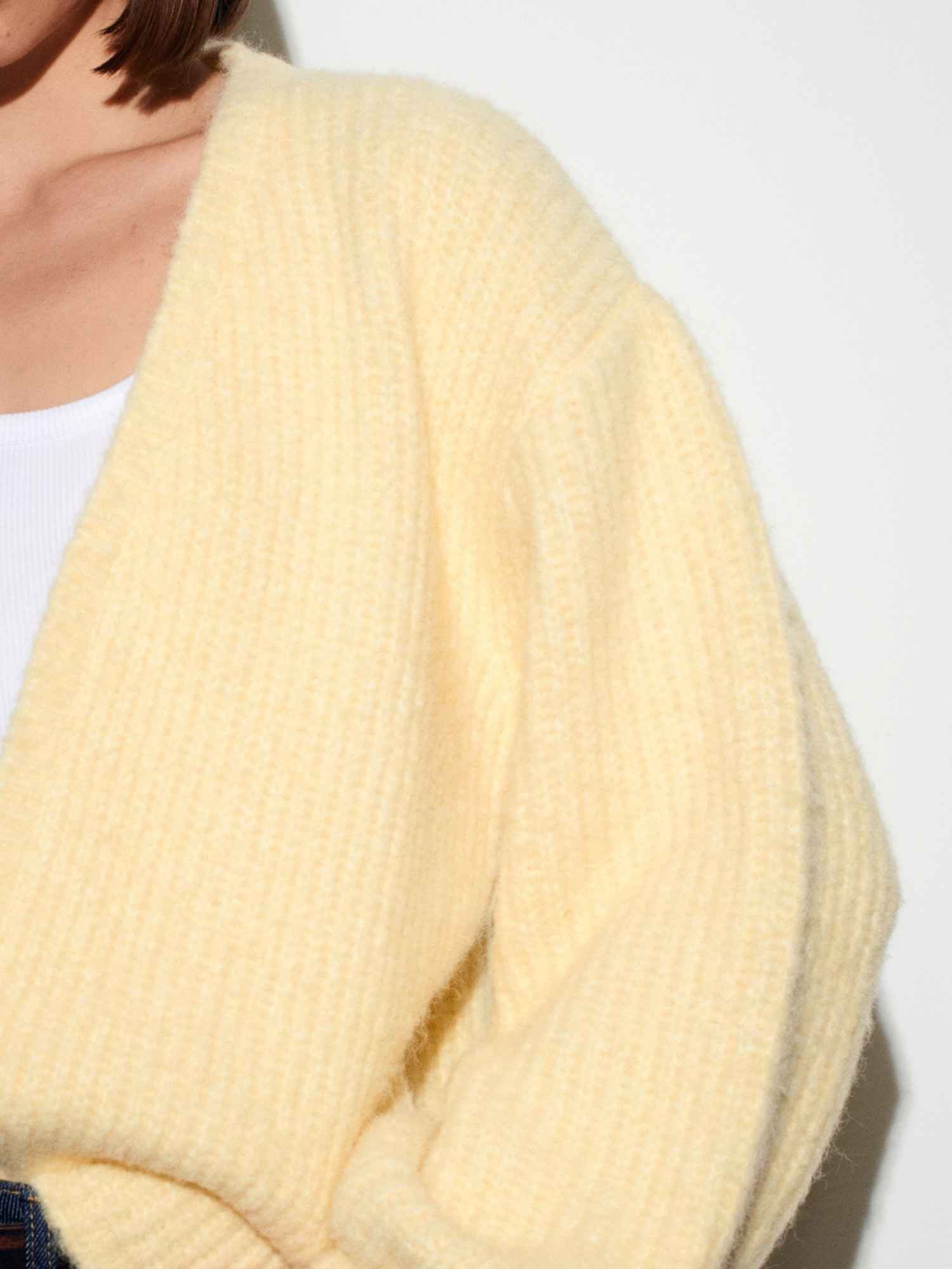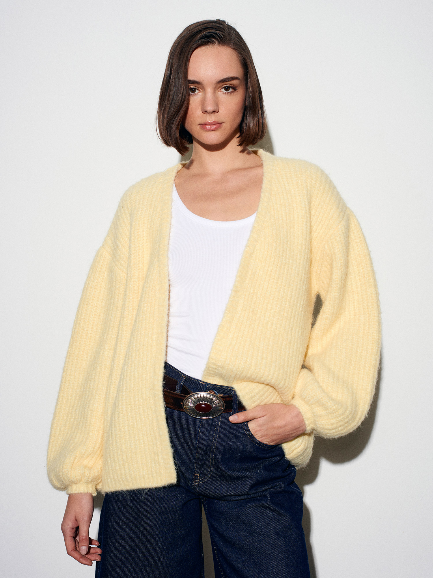 60991 Yumuşak Dokulu Dökümlü Triko Hırka-Açık Sarı